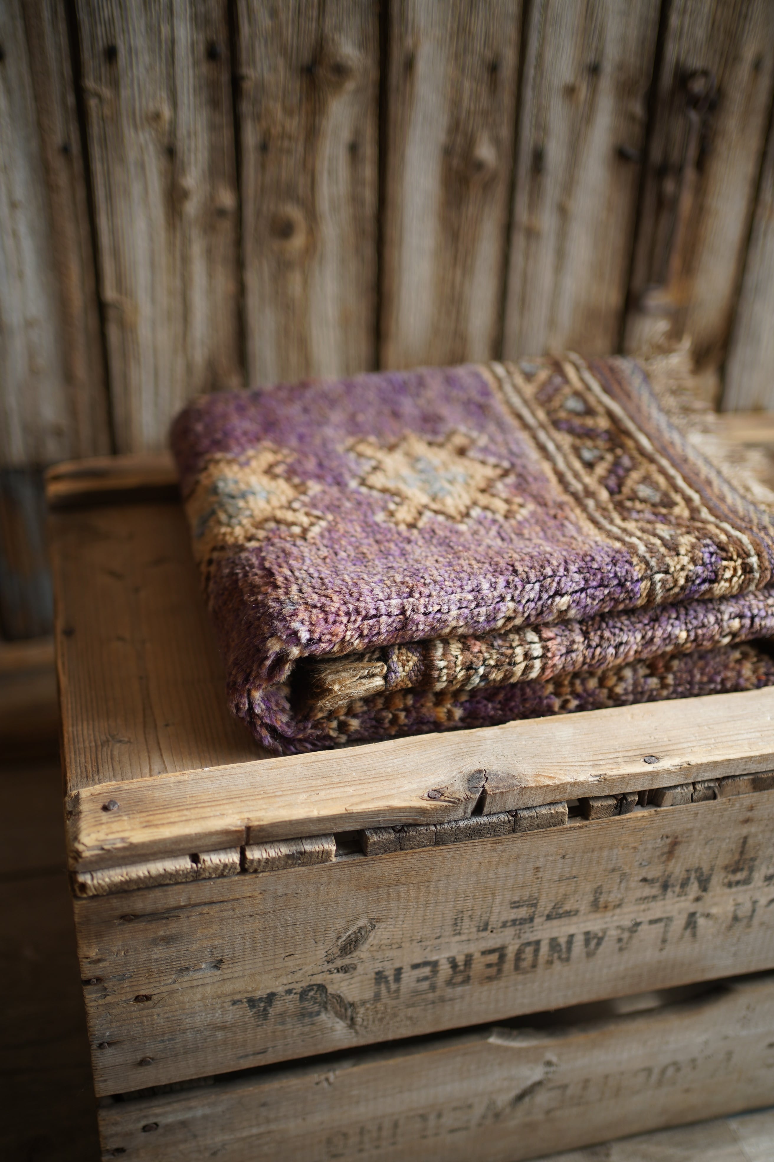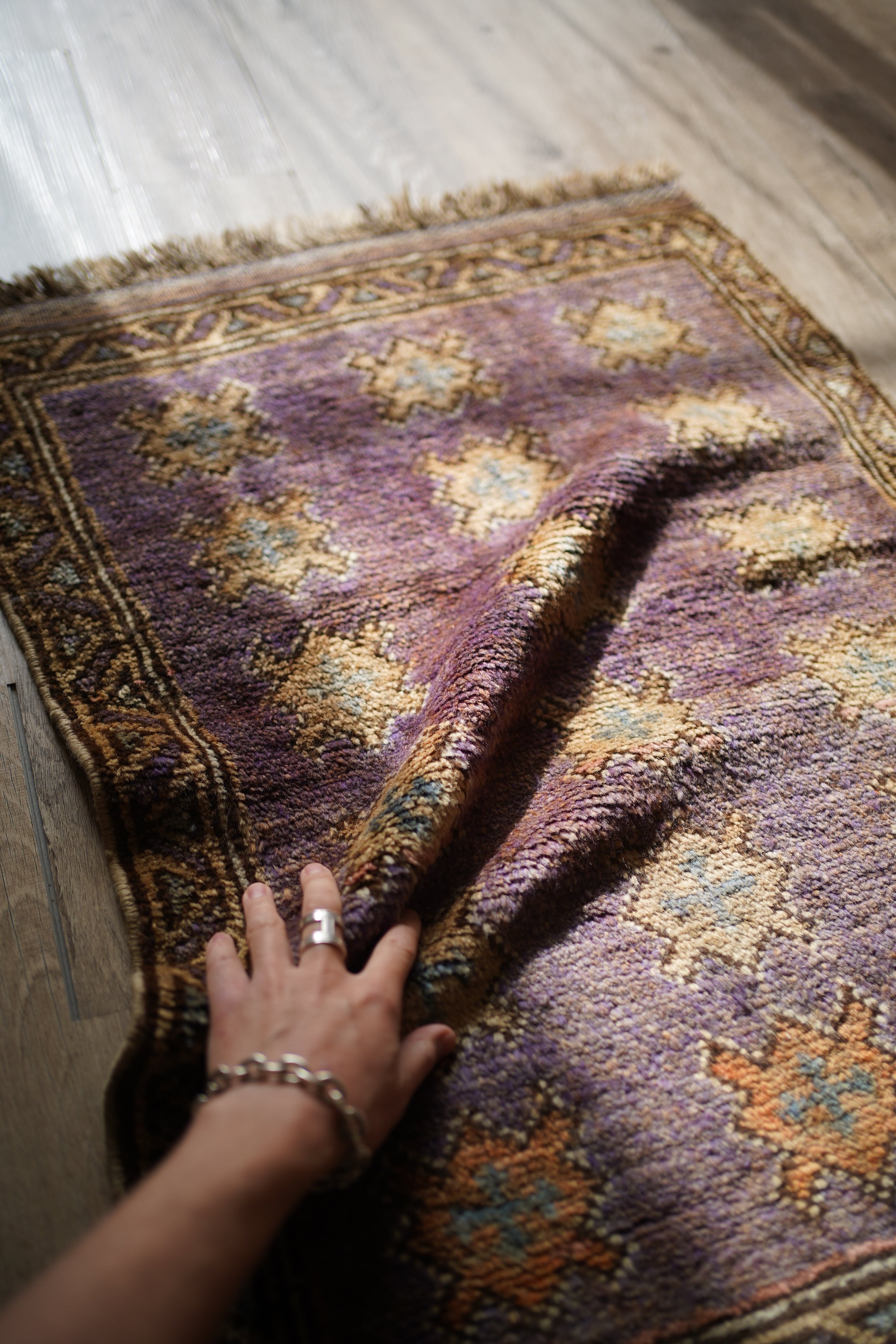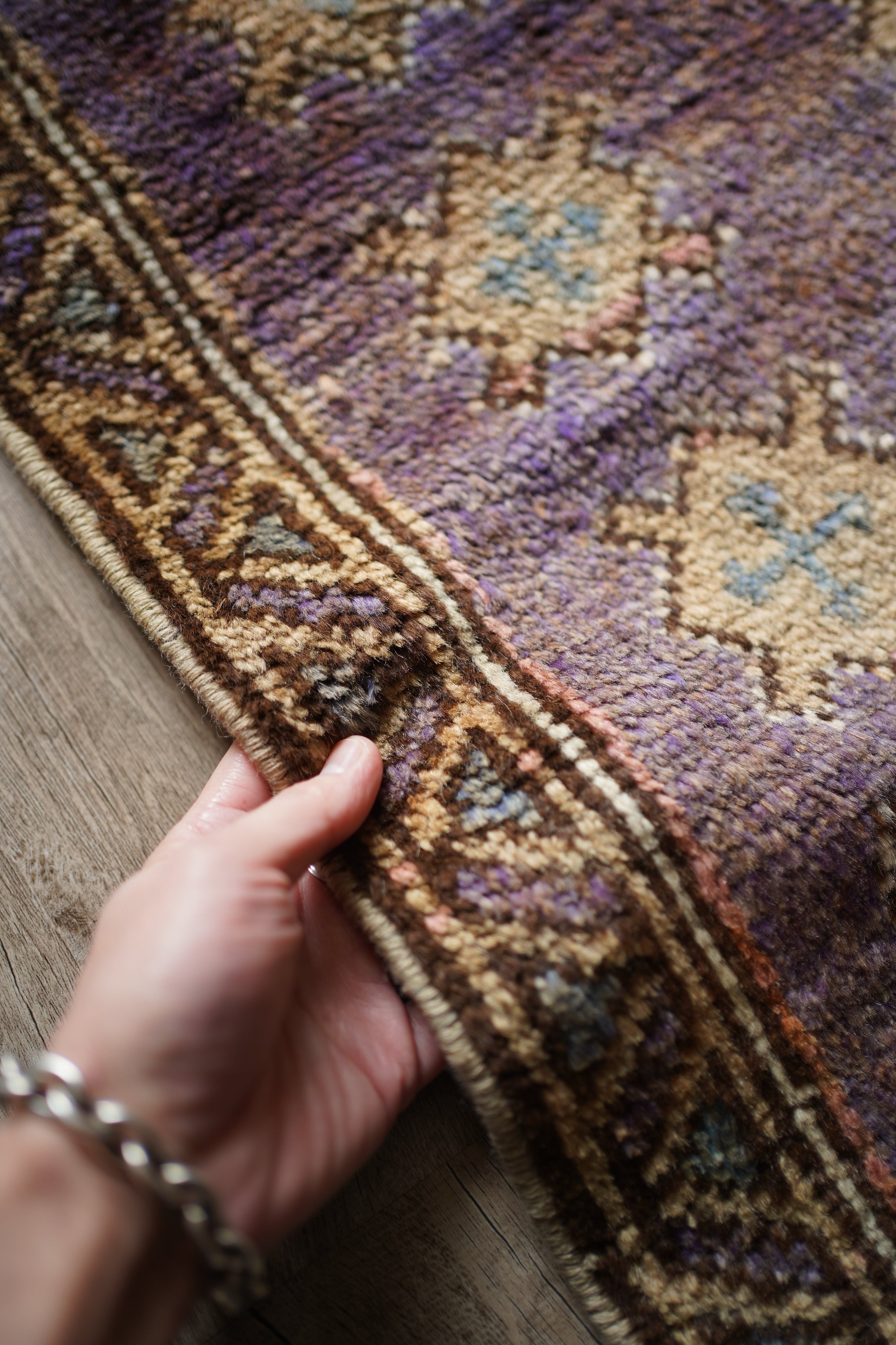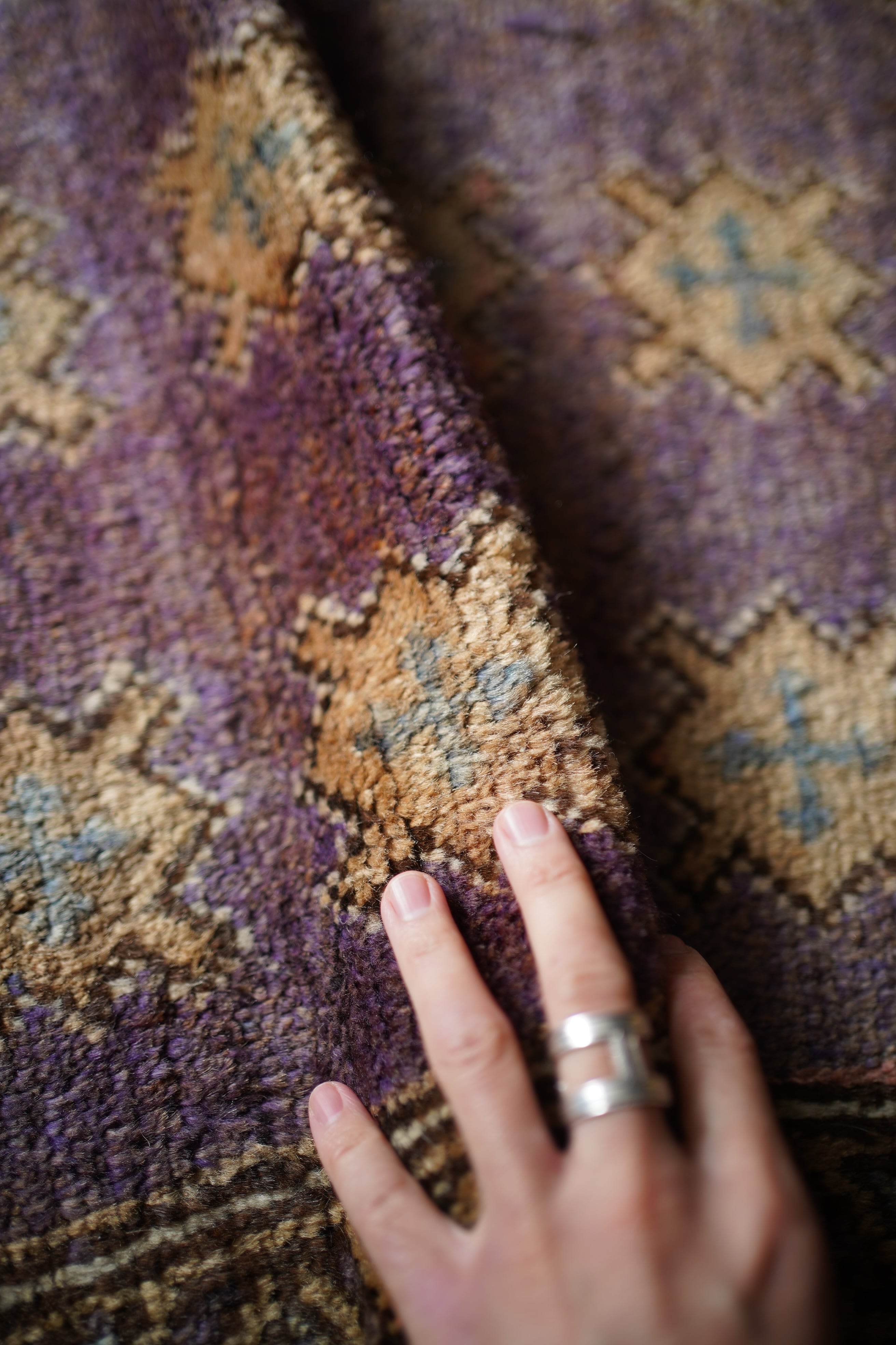 アフガニスタン西部を拠点とするタイマニ族によって、今から約50年前に織られたヴィンテージラグです。とても珍しい藤色(ライラック)のような柔らかな色合いが目を惹き、そこに淡いオレンジ、ベージュ、ブラウンがほどよく調和した雰囲気のある一枚。フリンジ部分はキリムエンドの作りとなっています。表面はふわっとした優しいタッチで、踏んだときの柔らかい質感が心地よいです。厚みはおよそ8mm程度。目立つダメージもなく大変良好なコンディションです。玄関はもちろん、洗面スペース、ラック前、ワークスペースなど、さまざまな場所で取り入れやすい万能サイズ。お部屋にそっと彩りと温もりを添えてくれる上品な配色の一枚です。