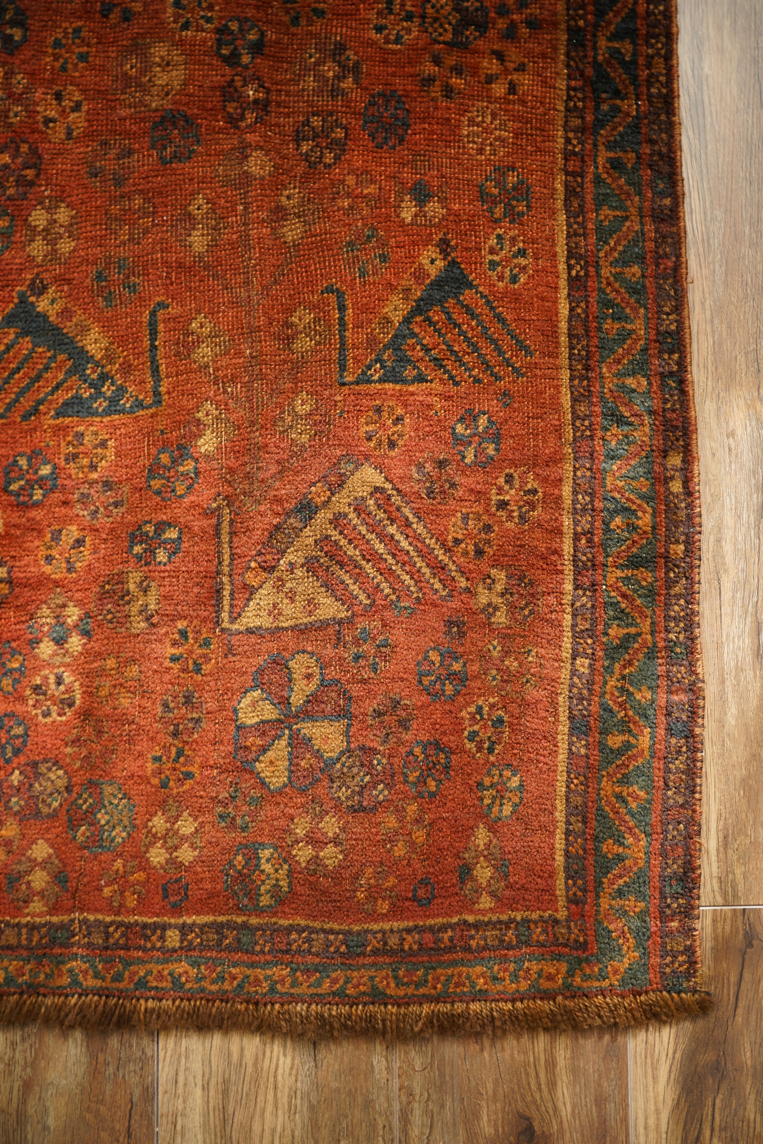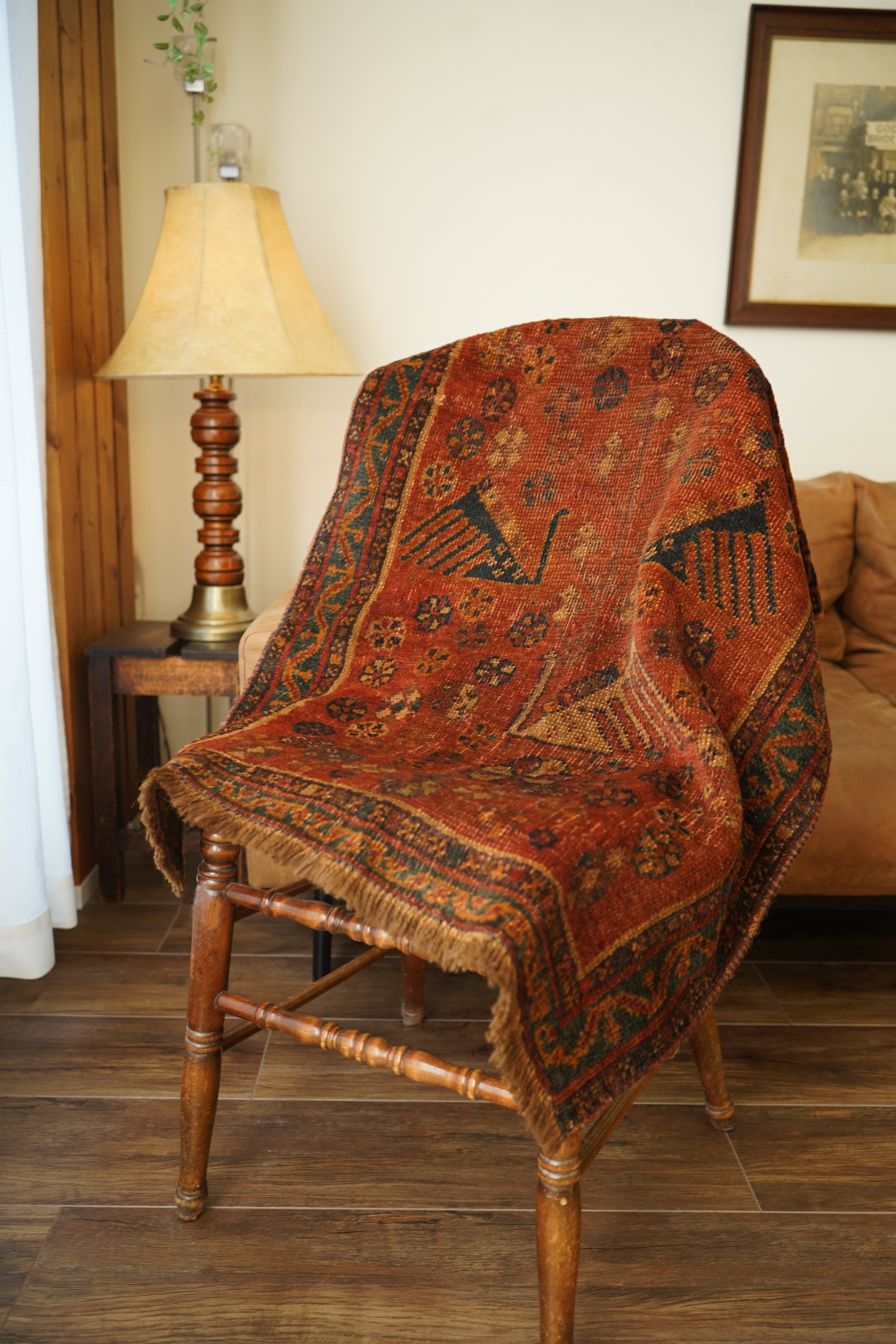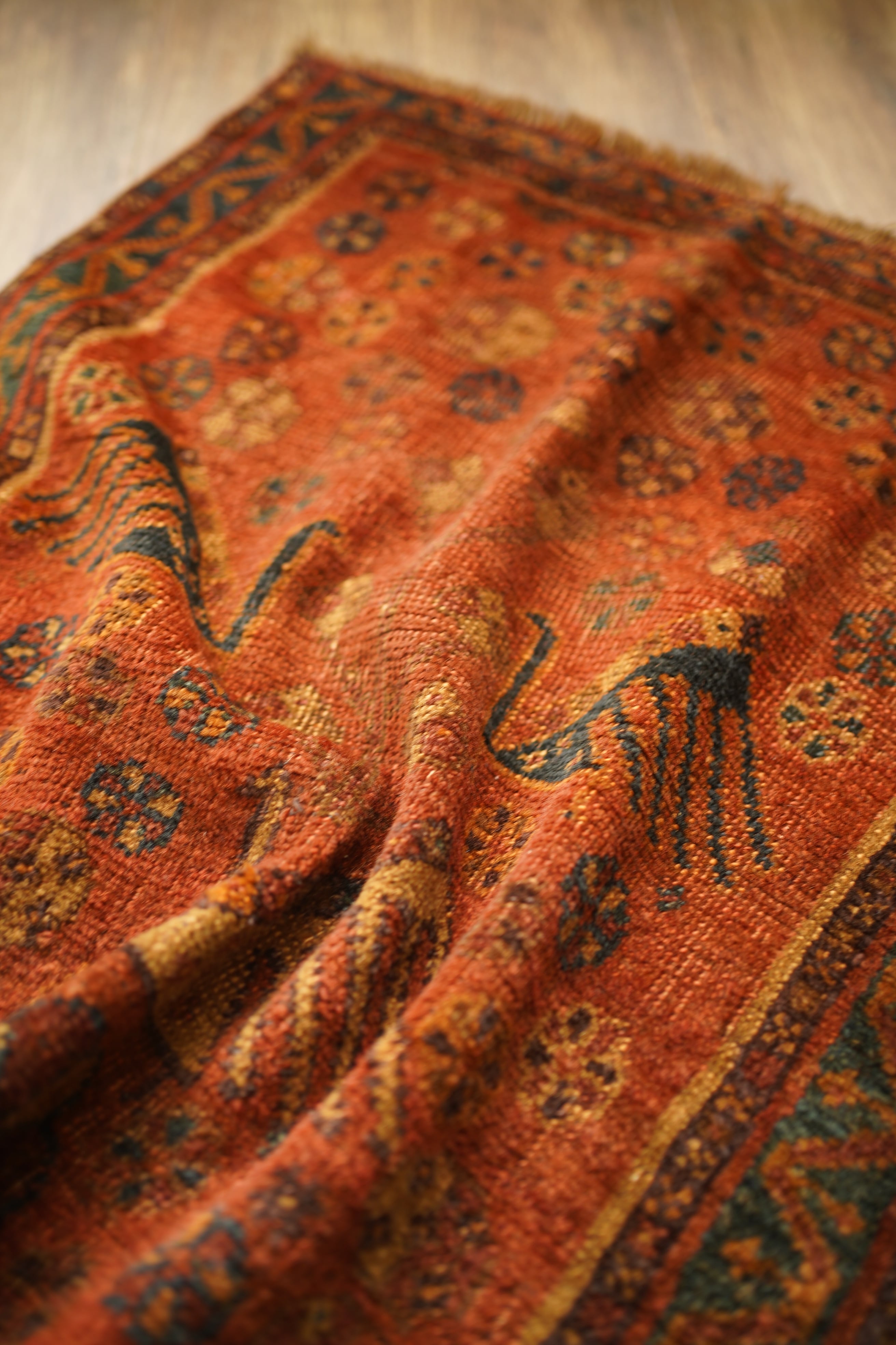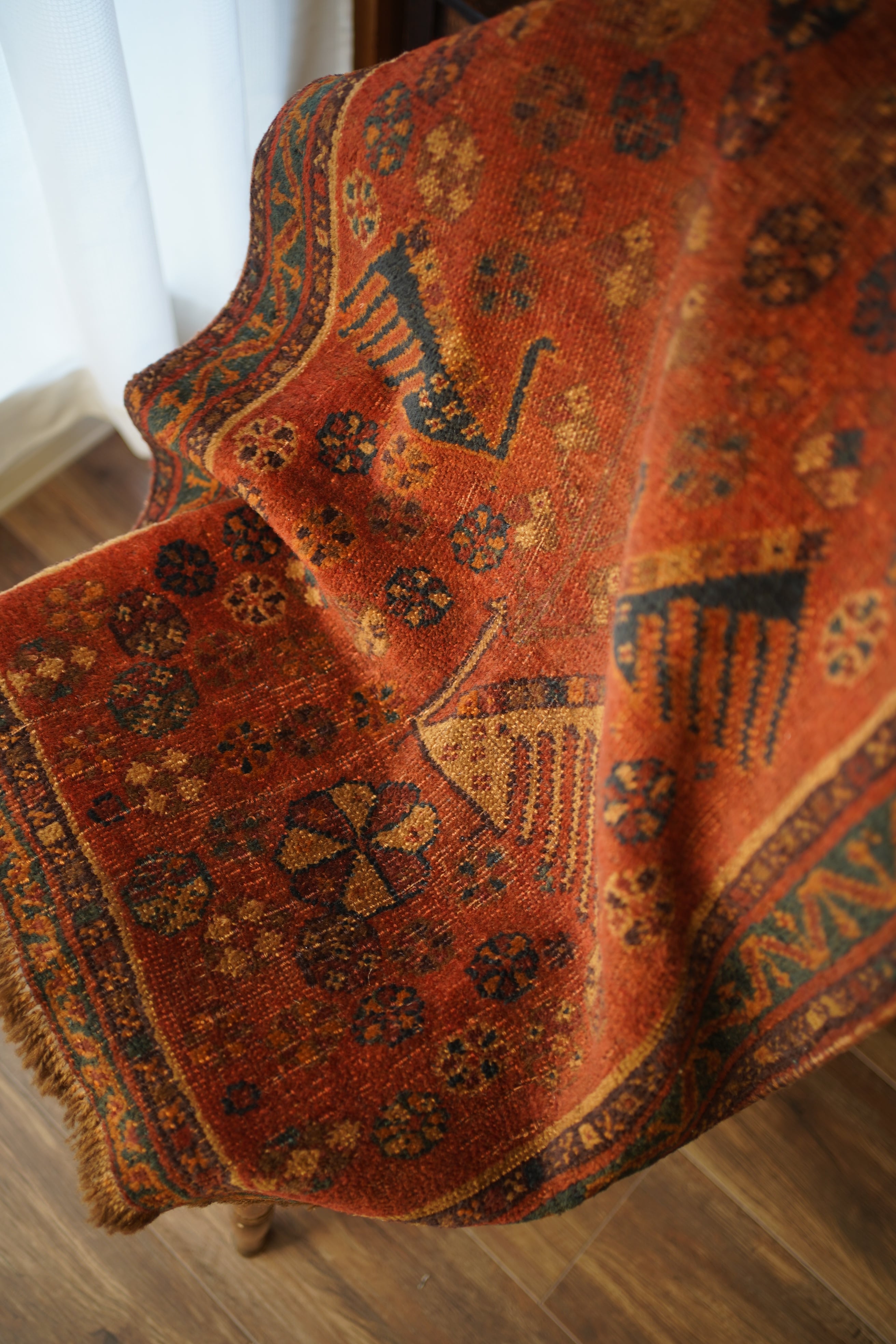 約70年前、イラン南西部ファールス州に居住する5つの部族からなる「ハムセ連合」によって織られたヴィンテージラグです。三羽の孔雀を中心に、狼の足跡など細かな部族文様が散りばめられた、非常に個性的で希少性の高い一枚。全体は渋みのある落ち着いた色調で、くすんだ赤、ダークグリーン、ベージュ、焦茶といった色合いが美しく調和しています。フィールド部分は長い年月の使用によりパイルが薄くすり減っていますが、ボーダーは比較的パイルが残っており、ヴィンテージらしい味わい深さをしっかりと感じられます。一部のみ極端に減っている箇所はなく、全体が均一に馴染んでいるため、とても自然で雰囲気の良い風合いです。表面はサラッと軽やかなタッチで、厚みは約6mm。目立ったダメージもなく、年代を考えると大変良好なコンディションです。サイズはやや大きめですが、床に敷くだけでなくタペストリーとして壁に飾っても存在感があり、お部屋の雰囲気づくりに一役買ってくれる魅力的な一枚です。