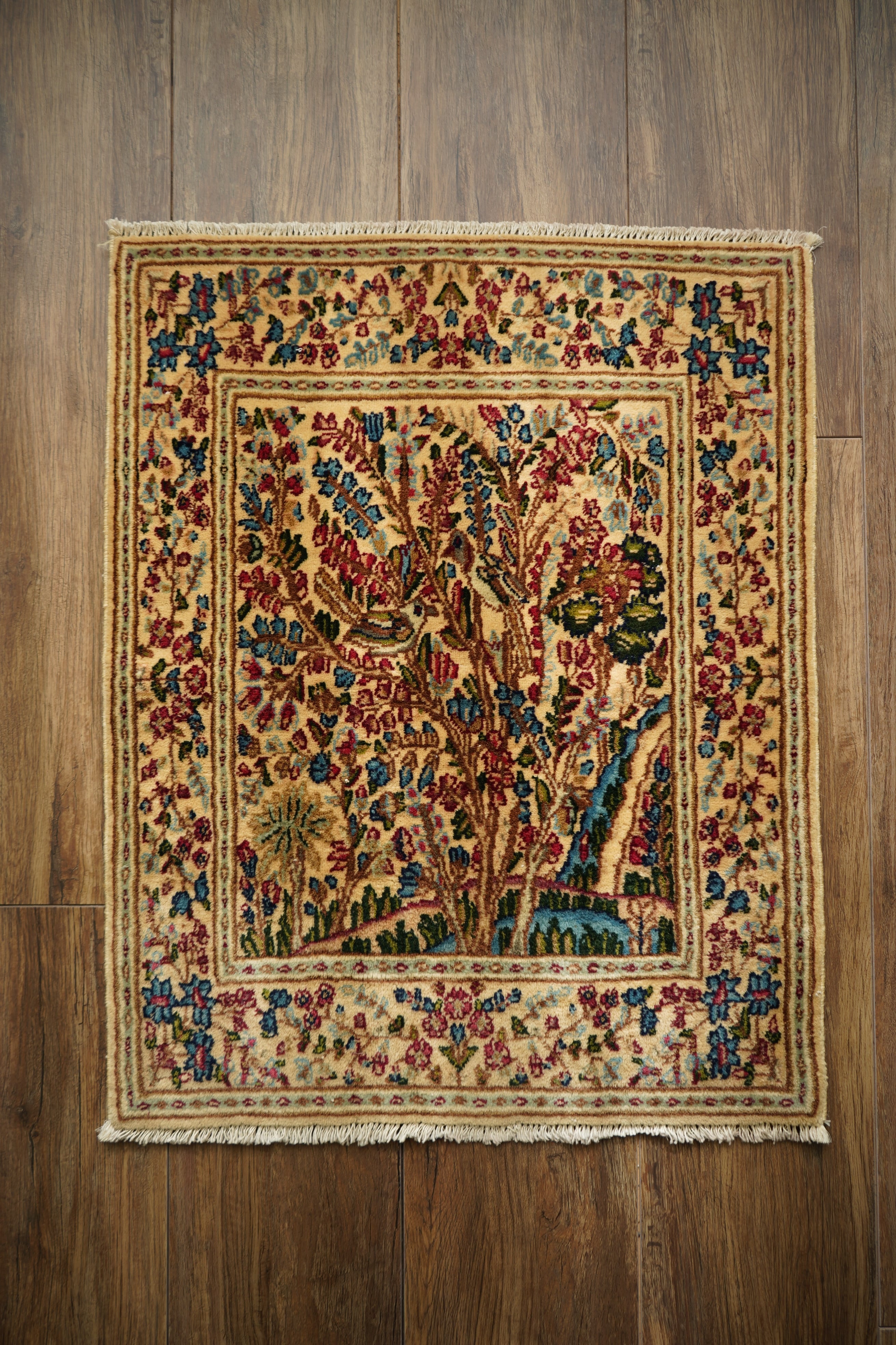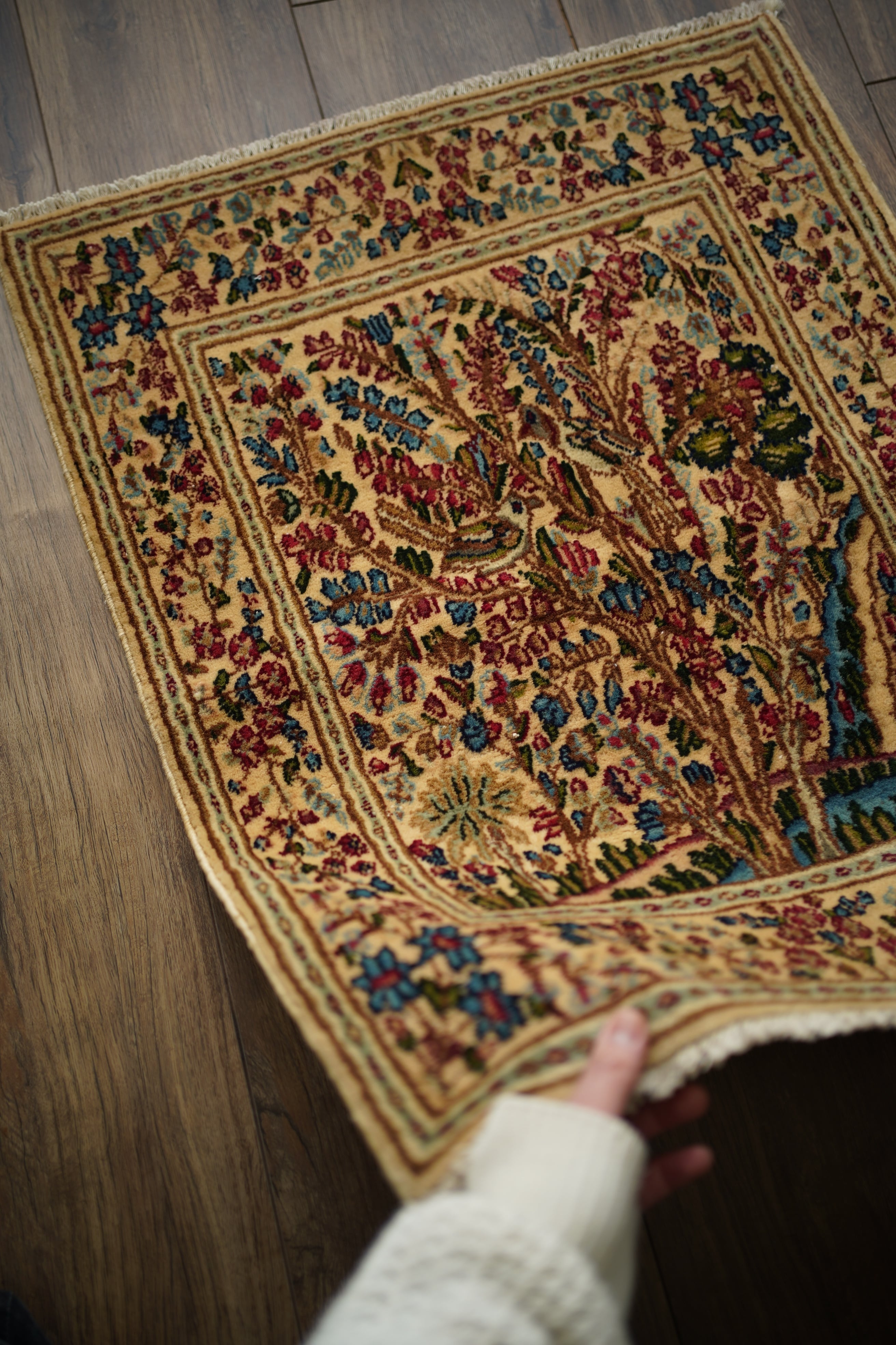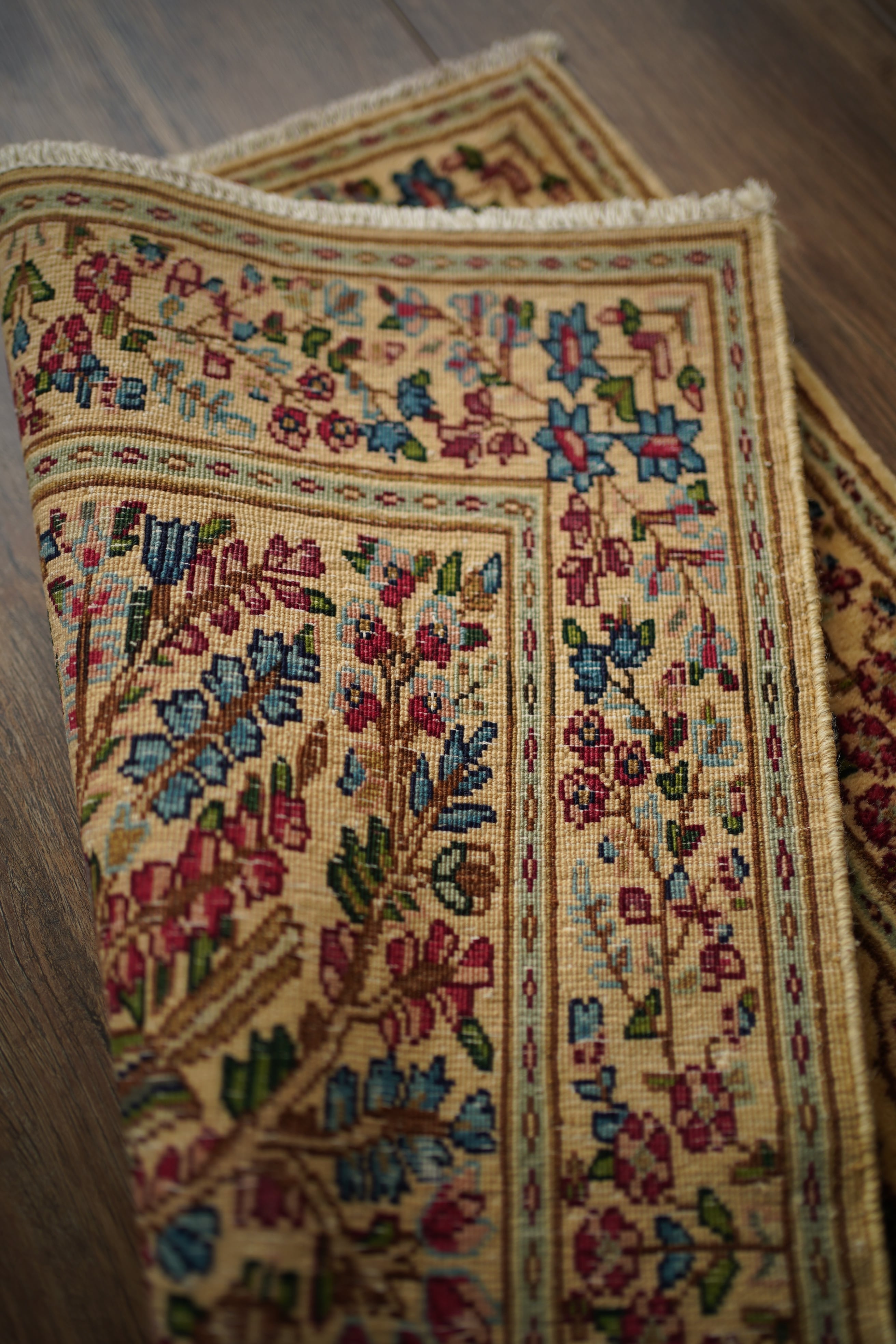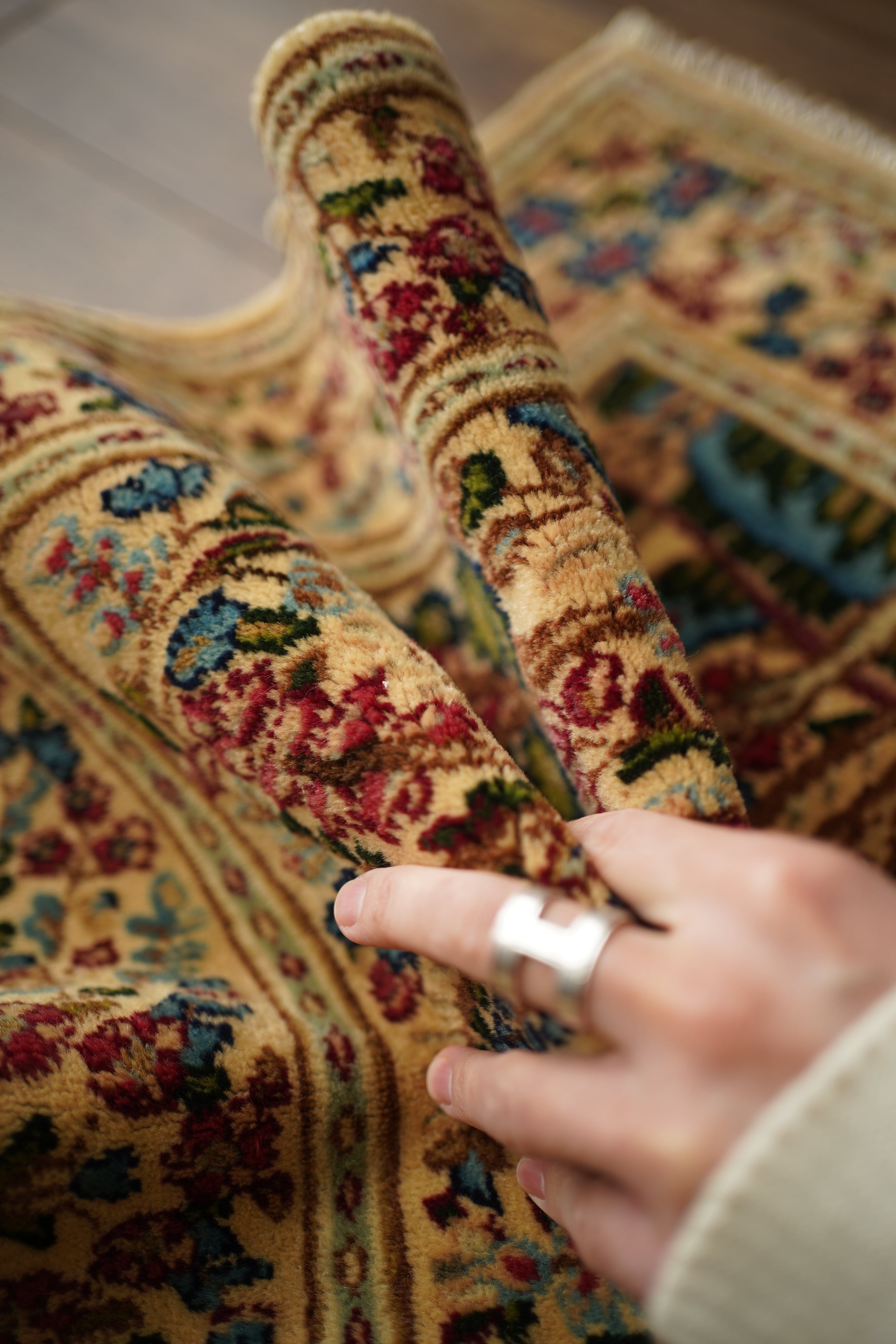 イラン南東部に位置するケルマンで、今から約30年前に織られたヴィンテージラグです。繊細で優雅な植物文様が全面に散りばめられ、よく見ると中央の植物の枝には可愛らしい小鳥が2羽織り込まれており、自然の風景を切り取ったような美しい一枚です。ベースは柔らかなクリーム色。そこに暗い紫、マゼンタ、ブラウン、水色、コバルトブルーなどの色彩が重なり、華やかさの中にも気品を感じる雰囲気。パイルはふわサラッとした、柔らかな肌触りをしています。1cmほどの厚みがあり扱いやすい質感です。ダメージなども見受けられずパーフェクトなコンディション。小ぶりなサイズのため、玄関やベッドサイドをはじめ、タペストリーとしても大変素敵かと思います。