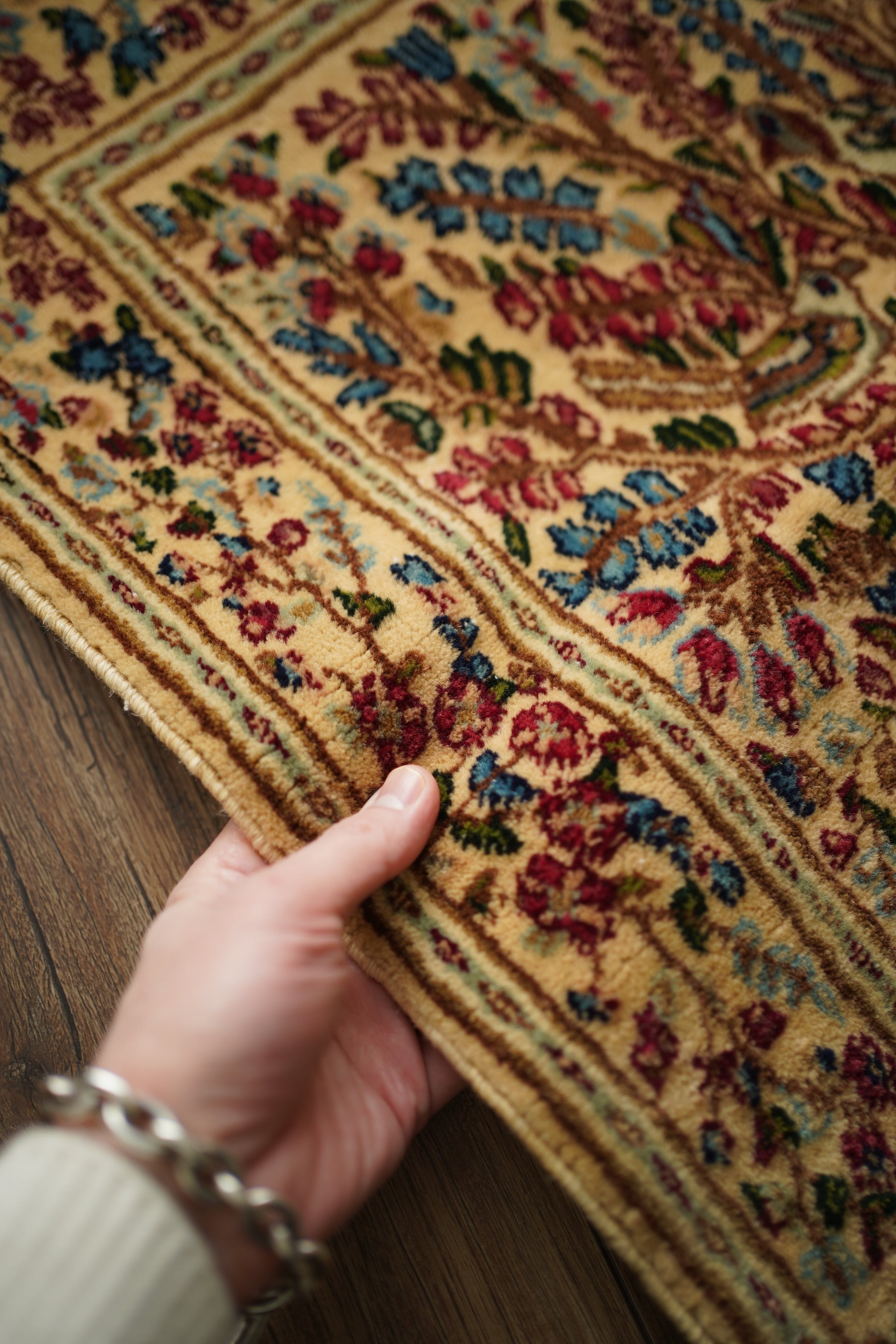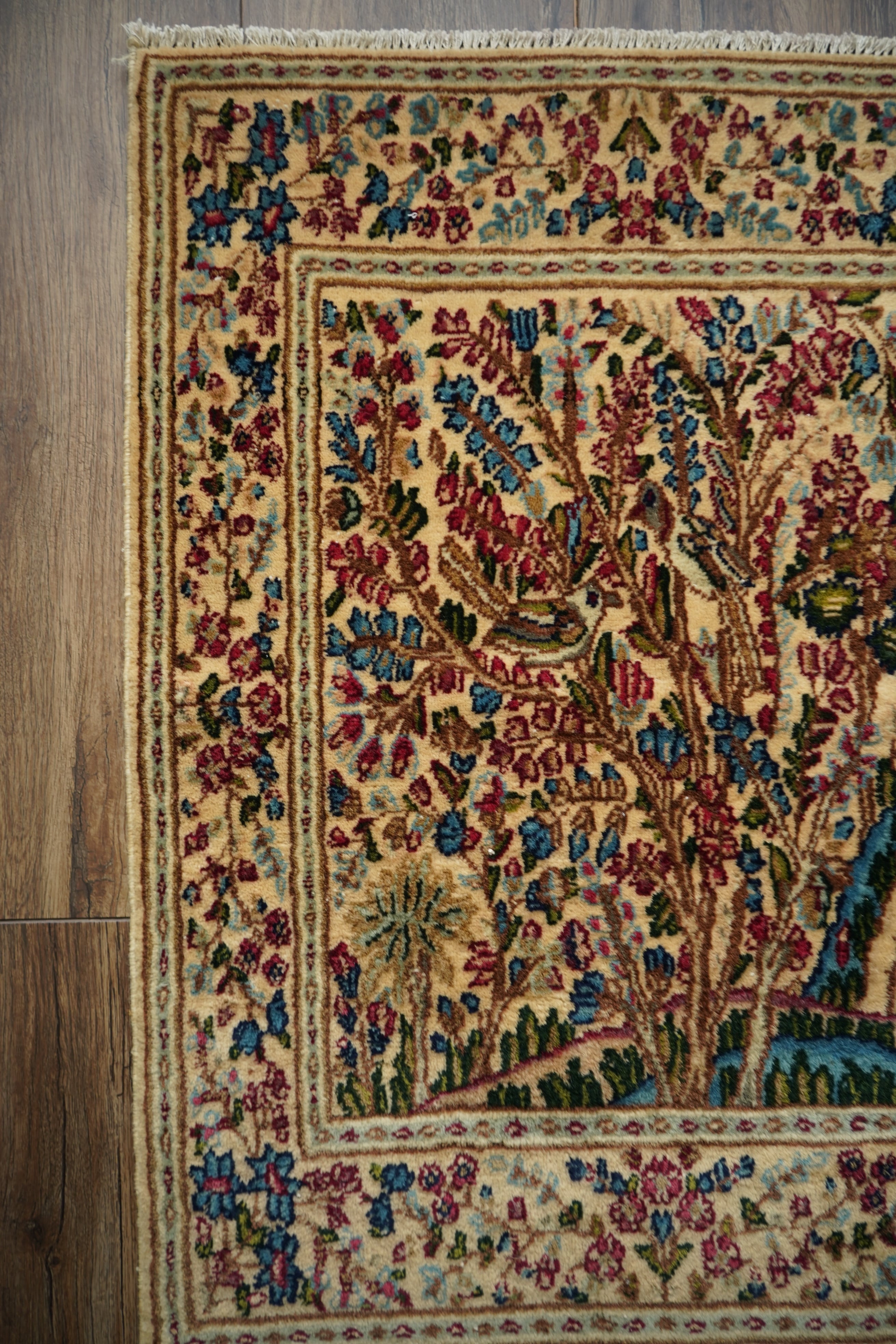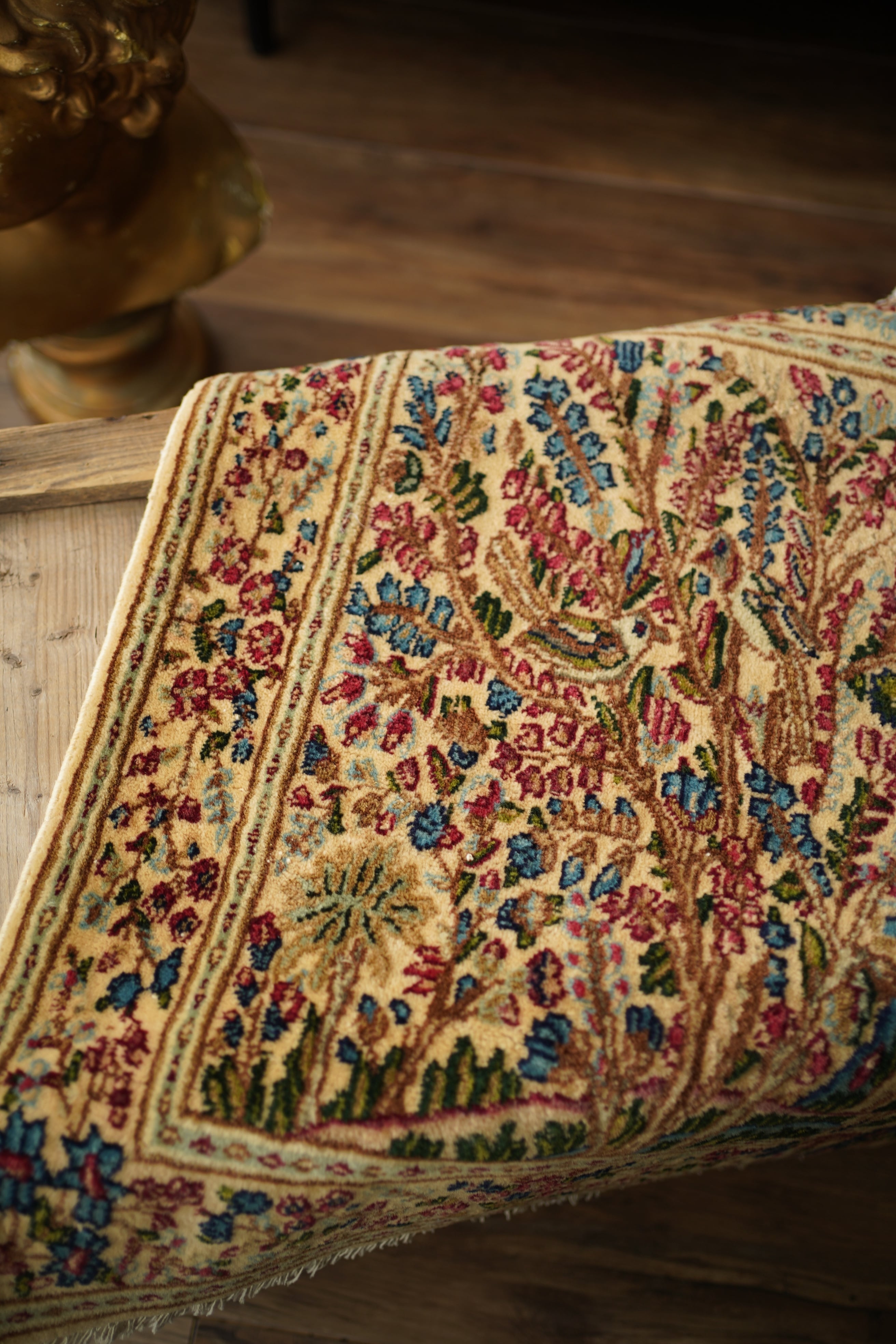 イラン南東部に位置するケルマンで、今から約30年前に織られたヴィンテージラグです。繊細で優雅な植物文様が全面に散りばめられ、よく見ると中央の植物の枝には可愛らしい小鳥が2羽織り込まれており、自然の風景を切り取ったような美しい一枚です。ベースは柔らかなクリーム色。そこに暗い紫、マゼンタ、ブラウン、水色、コバルトブルーなどの色彩が重なり、華やかさの中にも気品を感じる雰囲気。パイルはふわサラッとした、柔らかな肌触りをしています。1cmほどの厚みがあり扱いやすい質感です。ダメージなども見受けられずパーフェクトなコンディション。小ぶりなサイズのため、玄関やベッドサイドをはじめ、タペストリーとしても大変素敵かと思います。
