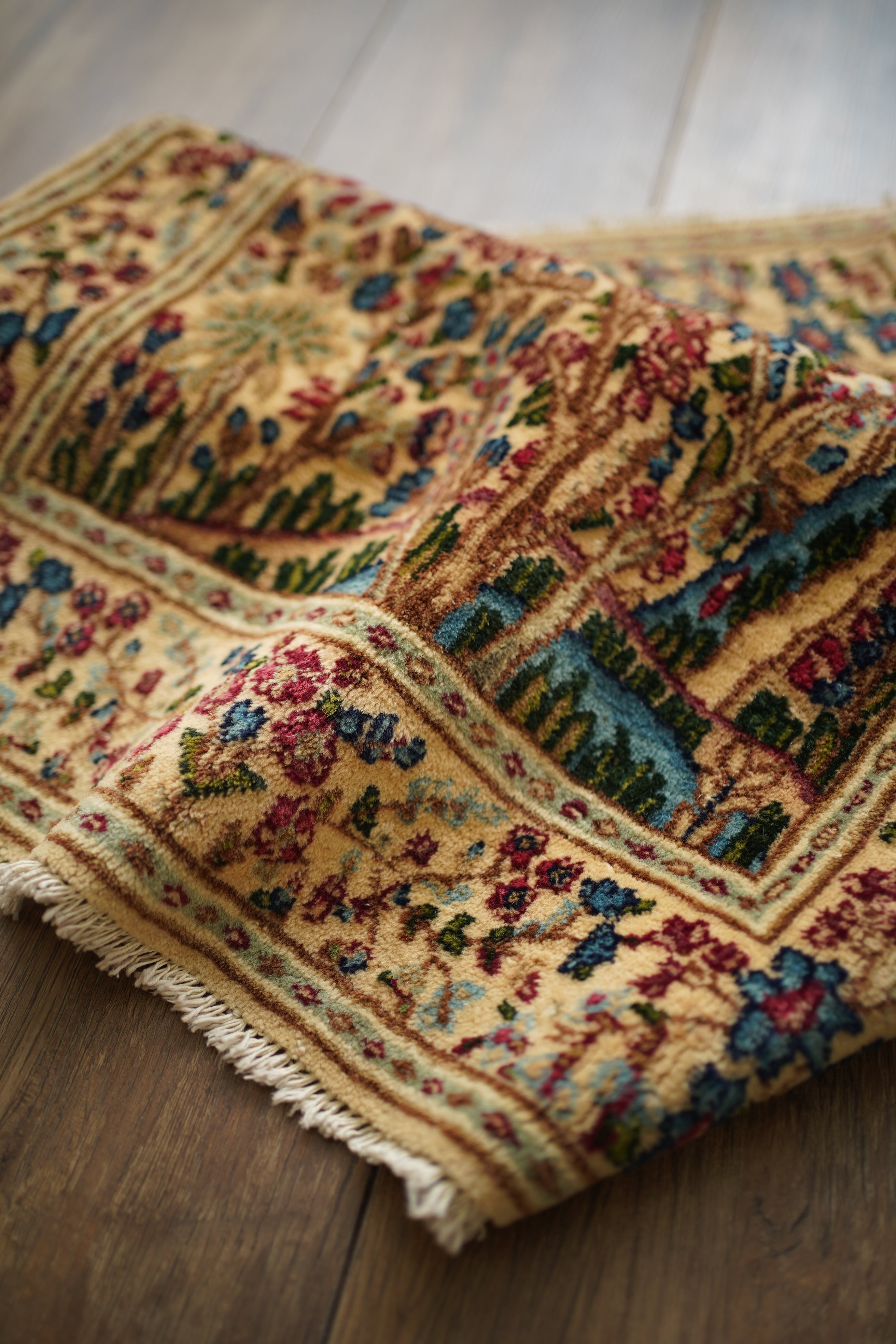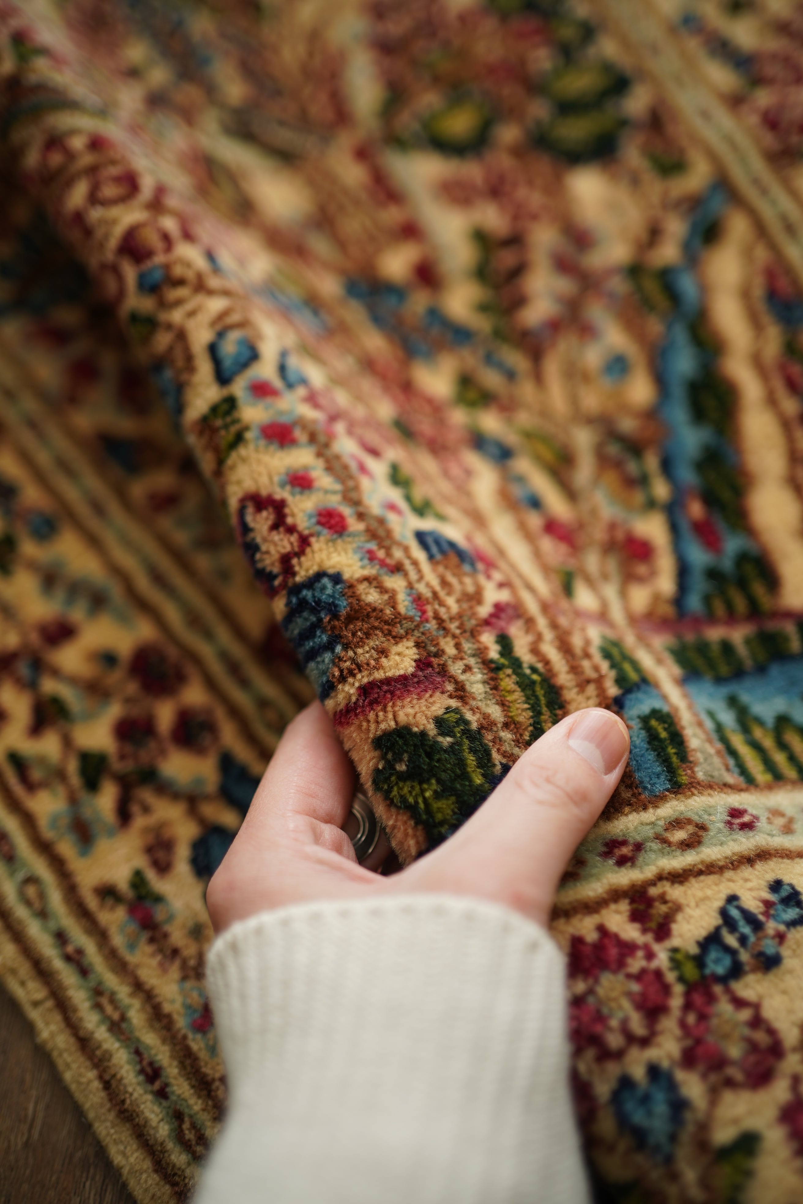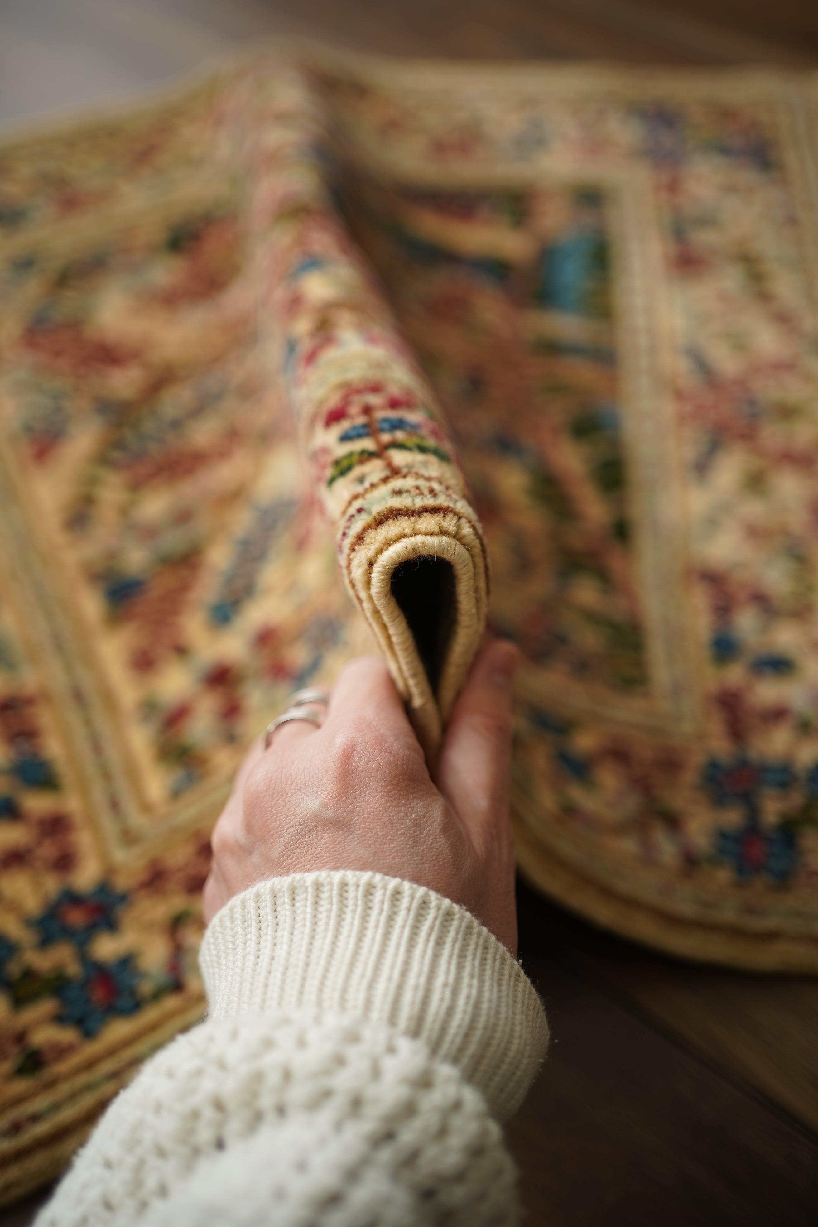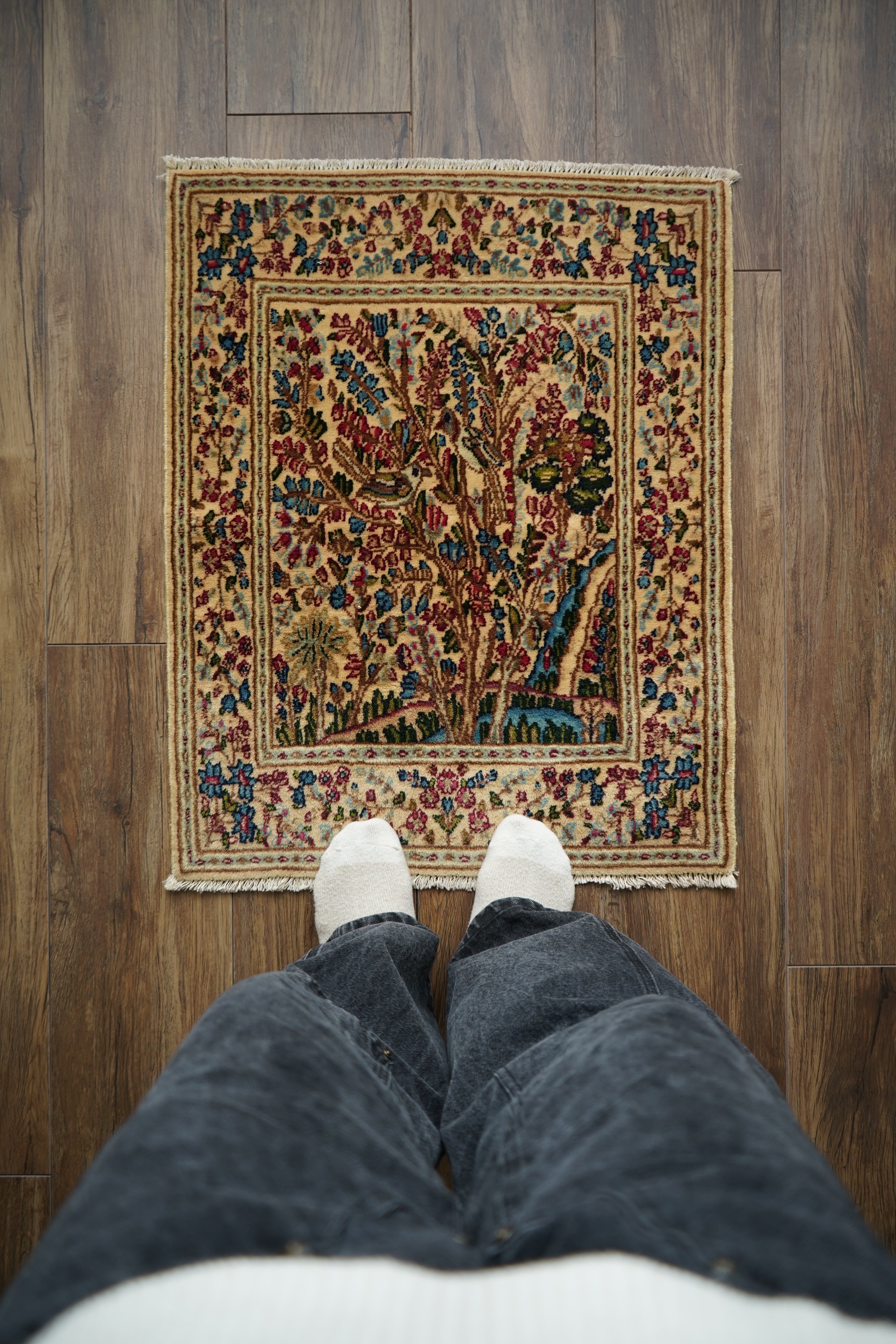 イラン南東部に位置するケルマンで、今から約30年前に織られたヴィンテージラグです。繊細で優雅な植物文様が全面に散りばめられ、よく見ると中央の植物の枝には可愛らしい小鳥が2羽織り込まれており、自然の風景を切り取ったような美しい一枚です。ベースは柔らかなクリーム色。そこに暗い紫、マゼンタ、ブラウン、水色、コバルトブルーなどの色彩が重なり、華やかさの中にも気品を感じる雰囲気。パイルはふわサラッとした、柔らかな肌触りをしています。1cmほどの厚みがあり扱いやすい質感です。ダメージなども見受けられずパーフェクトなコンディション。小ぶりなサイズのため、玄関やベッドサイドをはじめ、タペストリーとしても大変素敵かと思います。