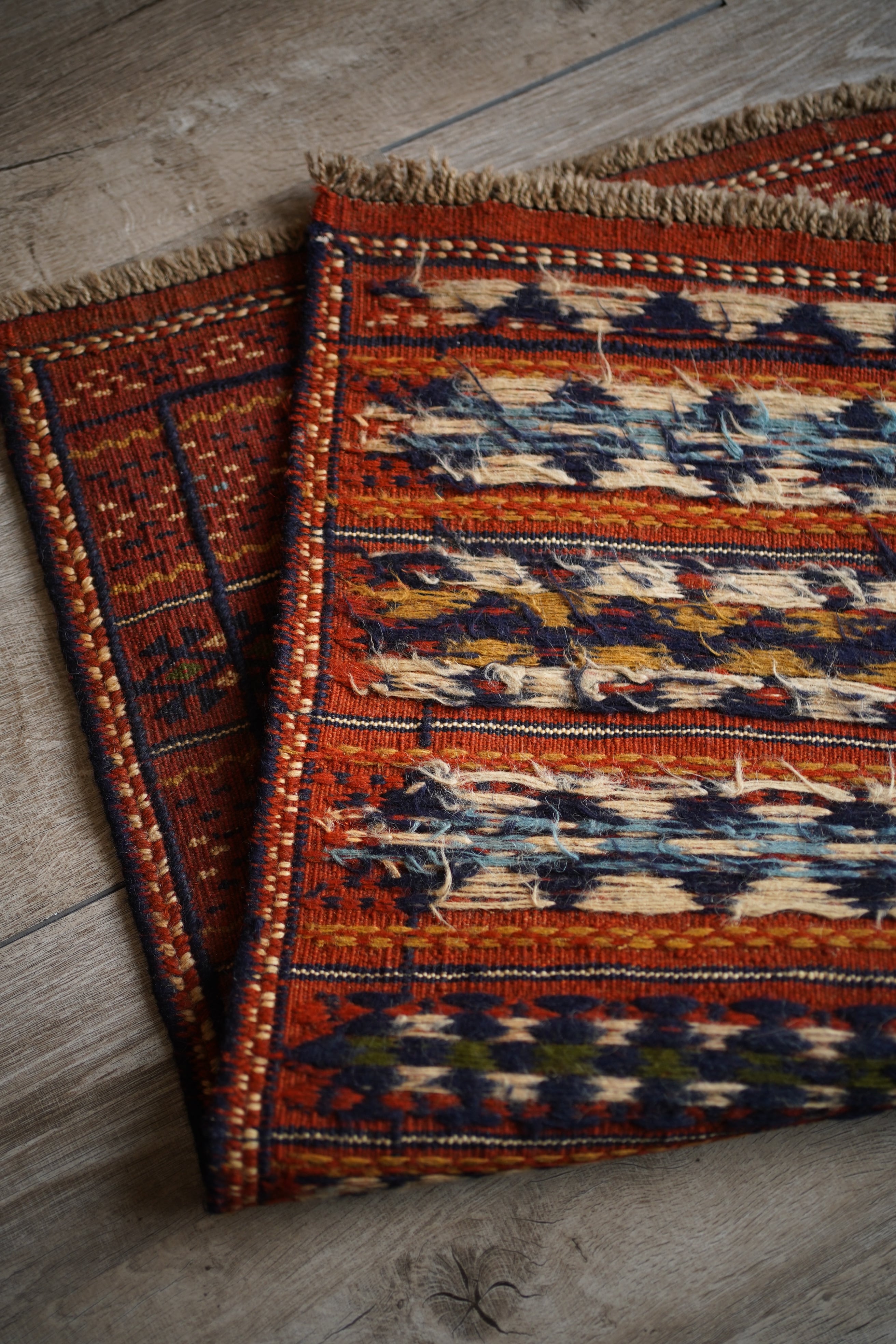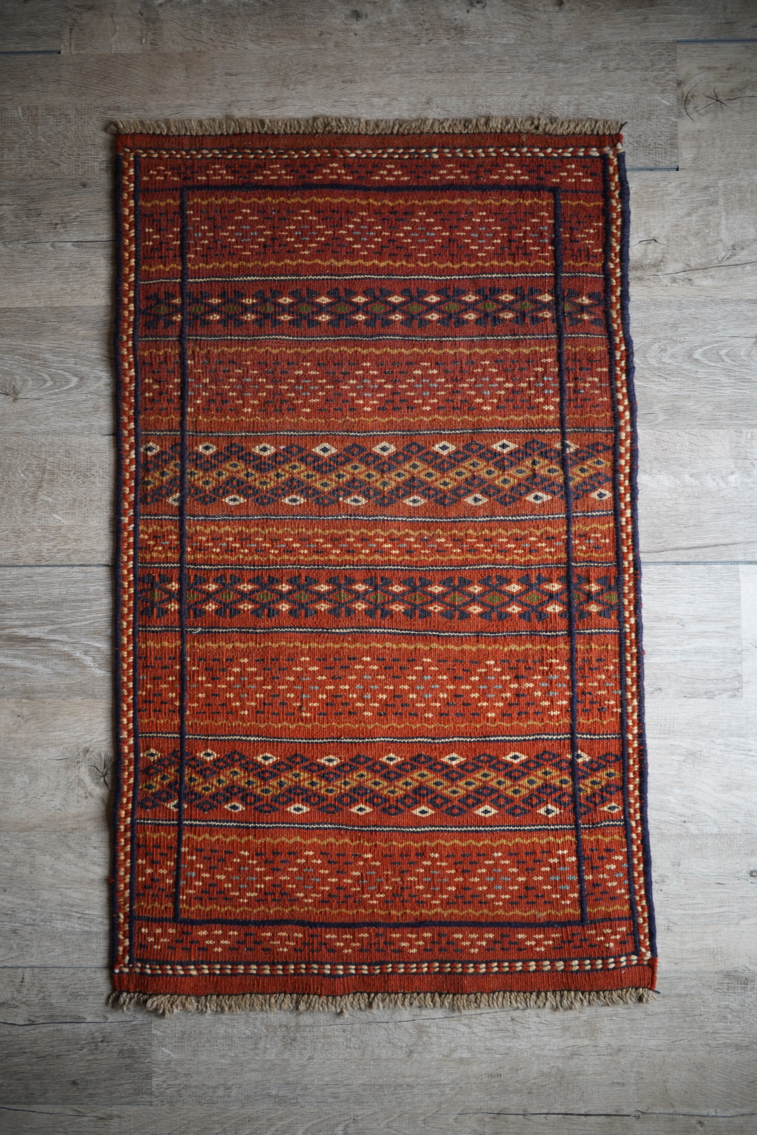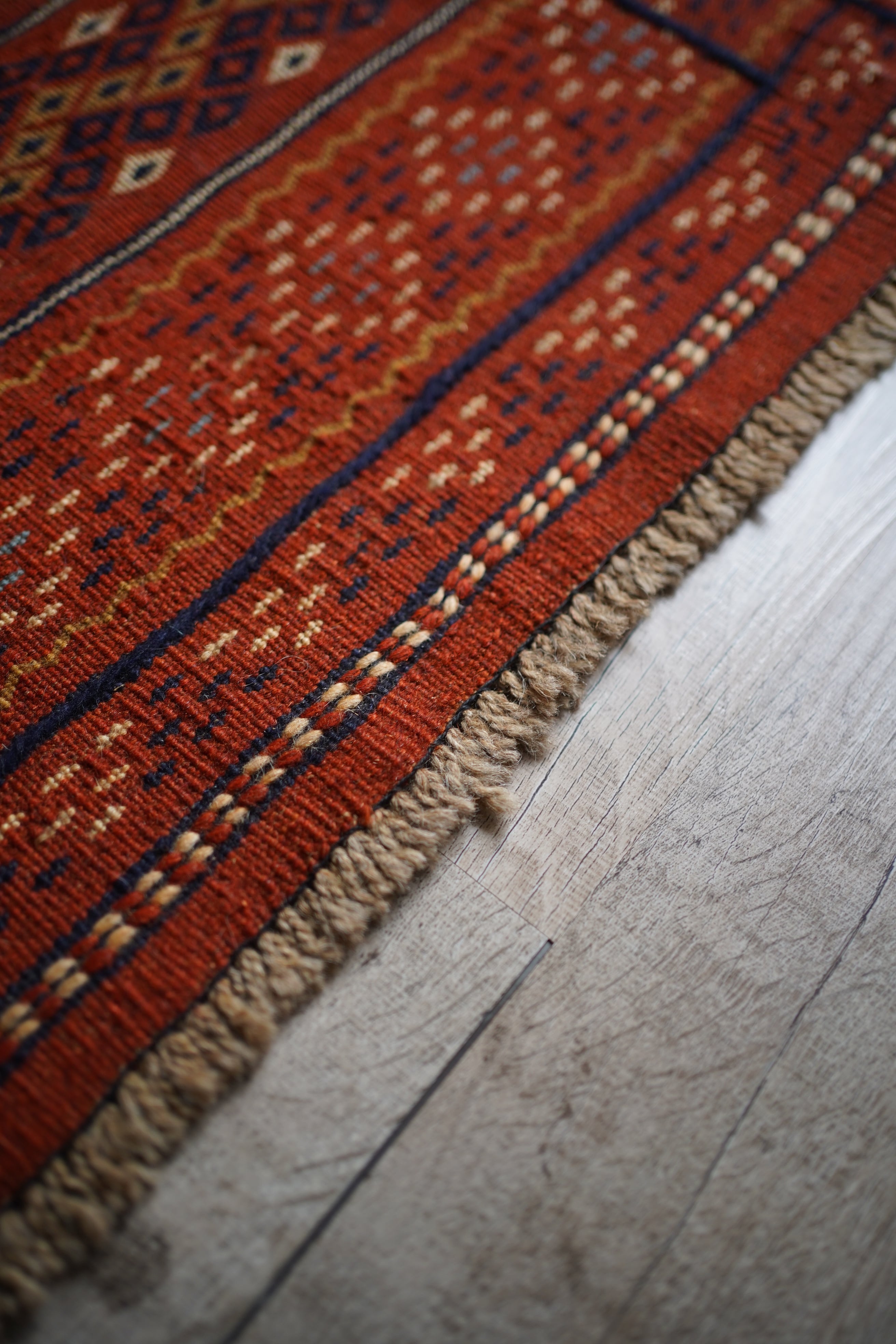 イラン北西部・クルディスタン州に点在する、小さな村「Kalati(カラティ)」で織られた約40年前のキリムです。赤茶色を基調に、いくつもの幾何学文様が連なる美しいデザインが特徴で、落ち着いた色味ながらも単調にならず、一枚さっと敷くだけで空間に程よい民族感が生まれます。表面はキリム特有のサラッとした軽やかな肌触りで、厚みは約6mmほど。目の詰まった質感で、堅牢なつくりの一枚です。大きなダメージも見受けられず、コンディションも非常に良好。冷暖房器具の下に敷いたり、全身鏡やラック前など様々なシチュエーションでご使用いただけます。