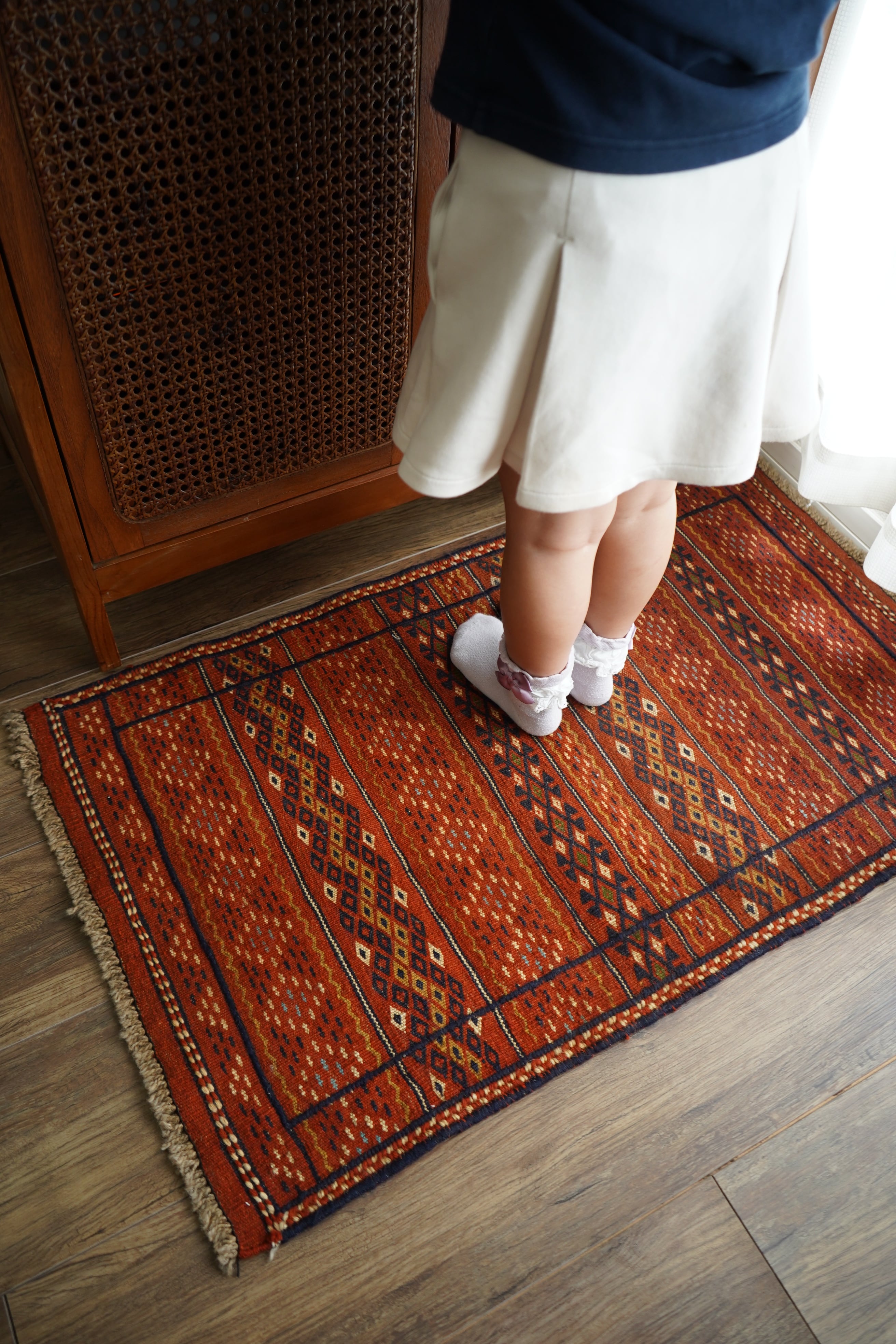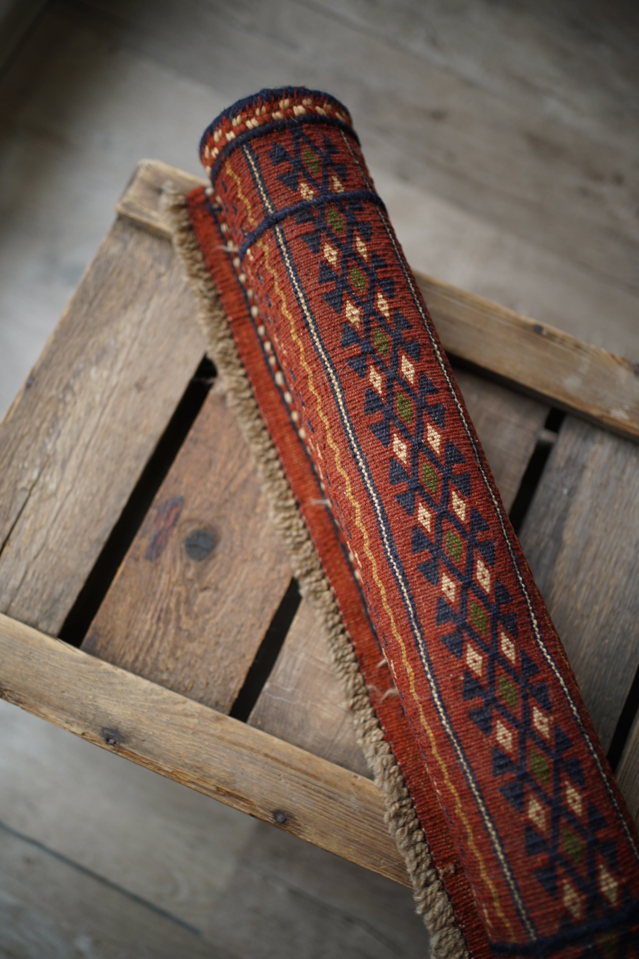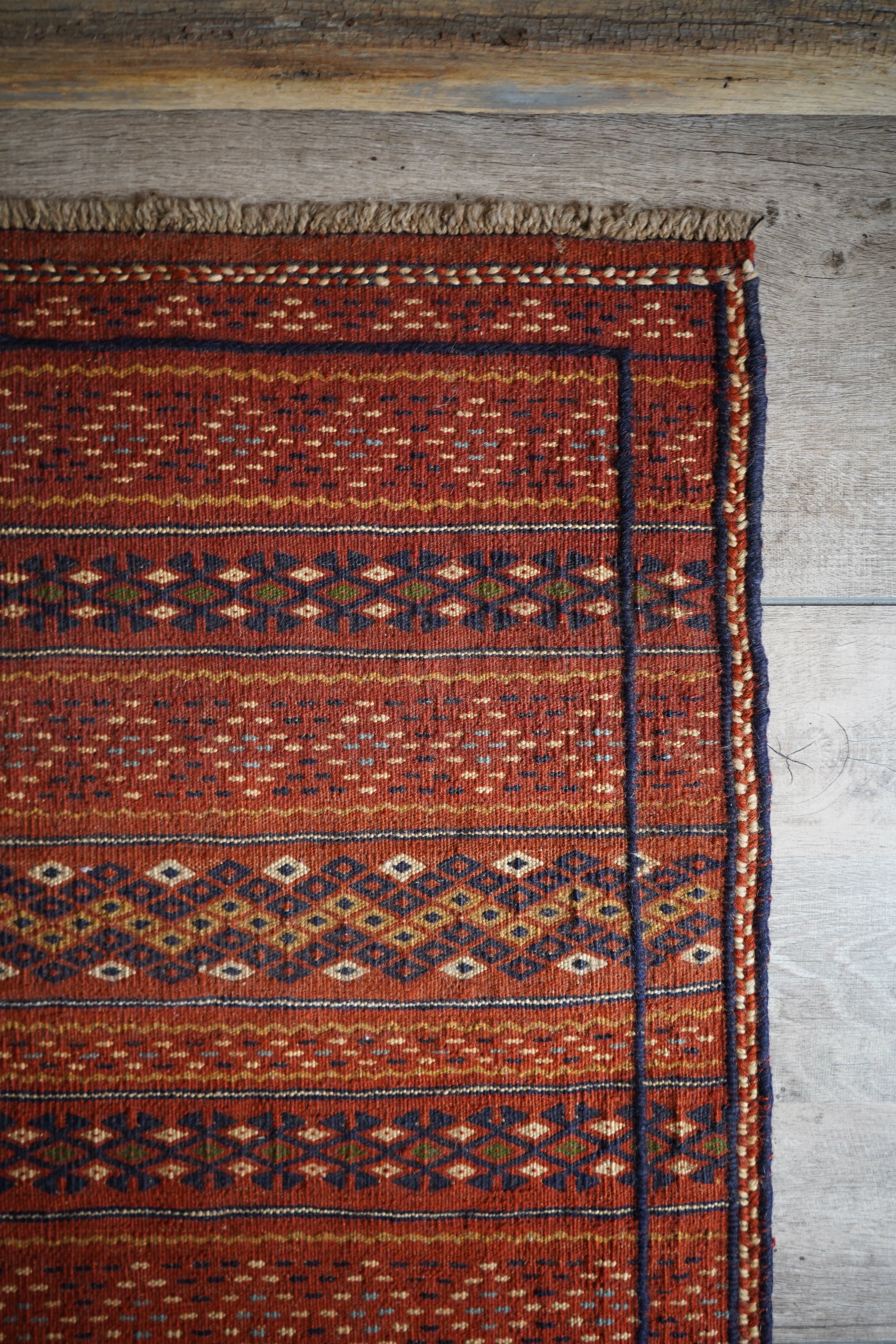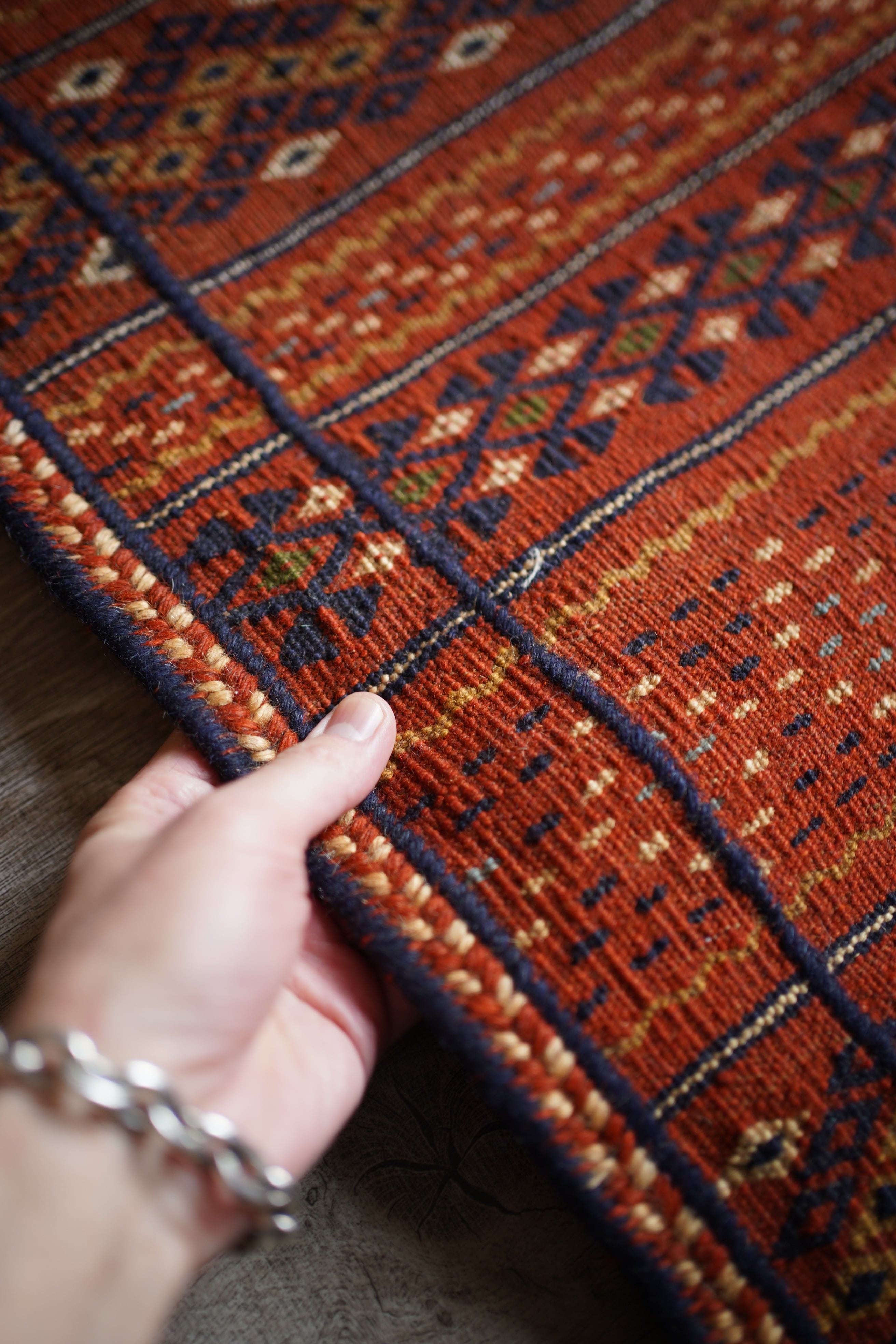 イラン北西部・クルディスタン州に点在する、小さな村「Kalati(カラティ)」で織られた約40年前のキリムです。赤茶色を基調に、いくつもの幾何学文様が連なる美しいデザインが特徴で、落ち着いた色味ながらも単調にならず、一枚さっと敷くだけで空間に程よい民族感が生まれます。表面はキリム特有のサラッとした軽やかな肌触りで、厚みは約6mmほど。目の詰まった質感で、堅牢なつくりの一枚です。大きなダメージも見受けられず、コンディションも非常に良好。冷暖房器具の下に敷いたり、全身鏡やラック前など様々なシチュエーションでご使用いただけます。