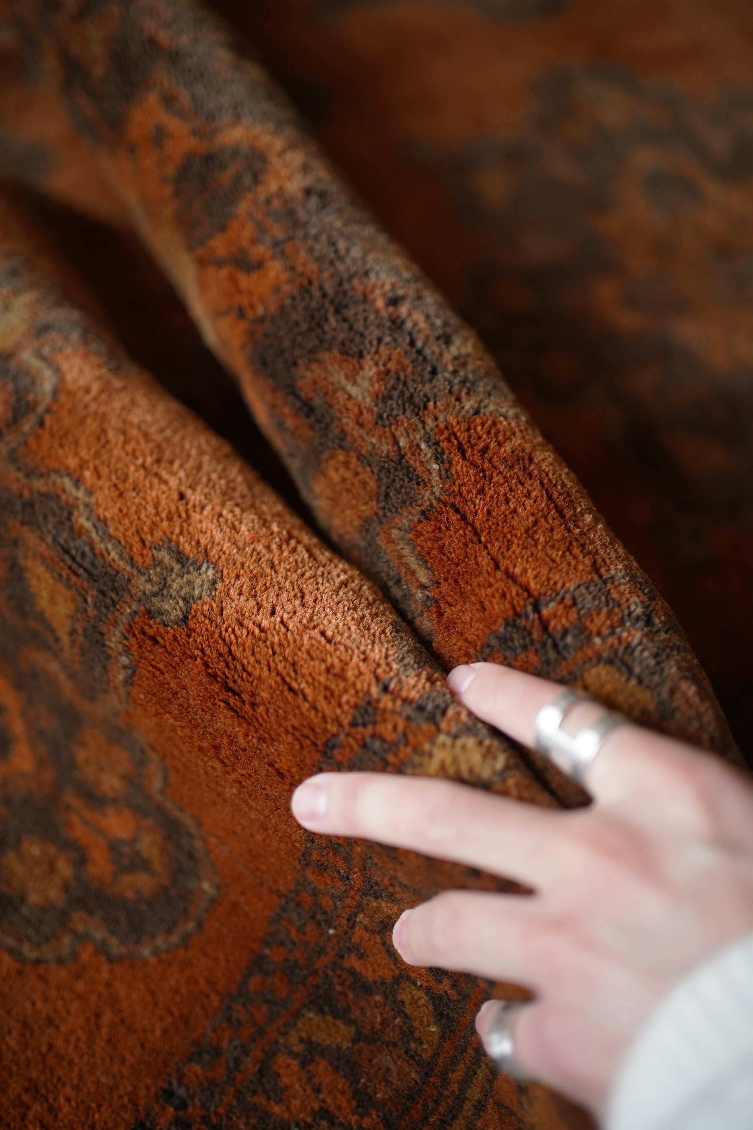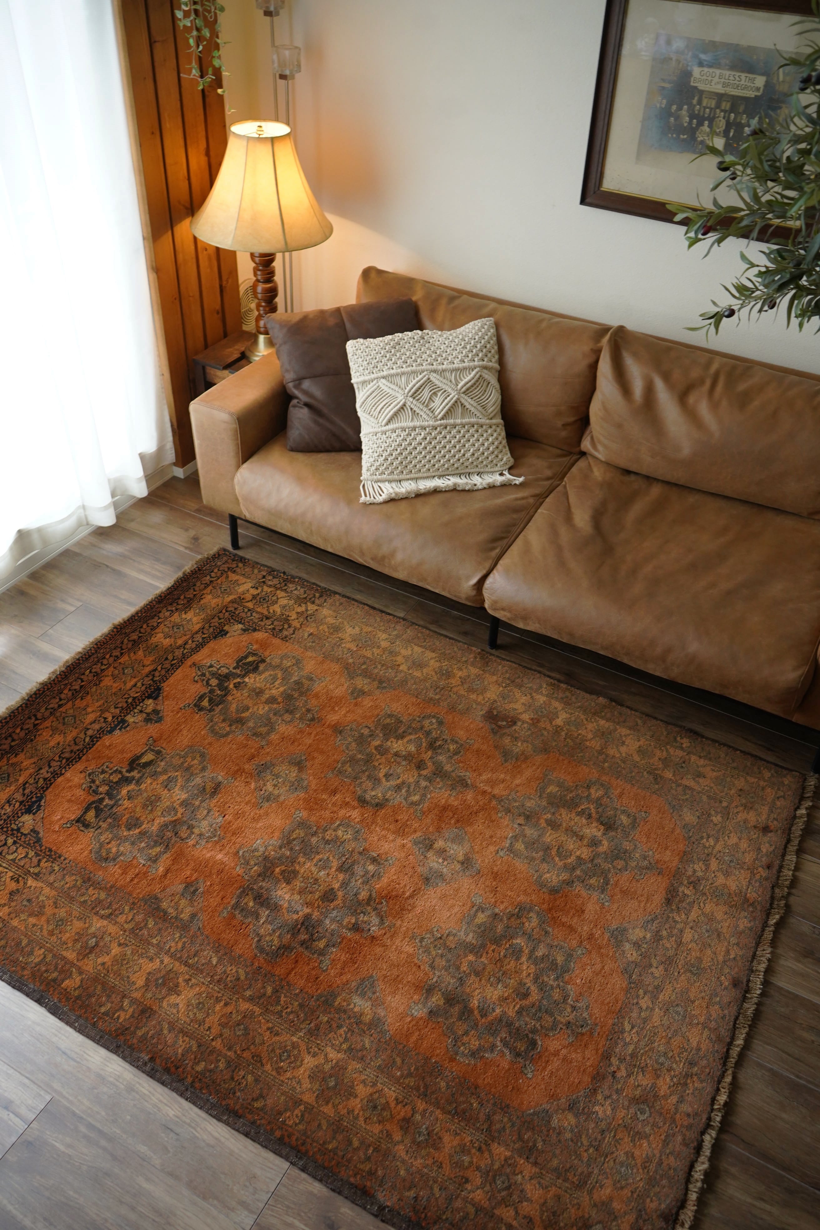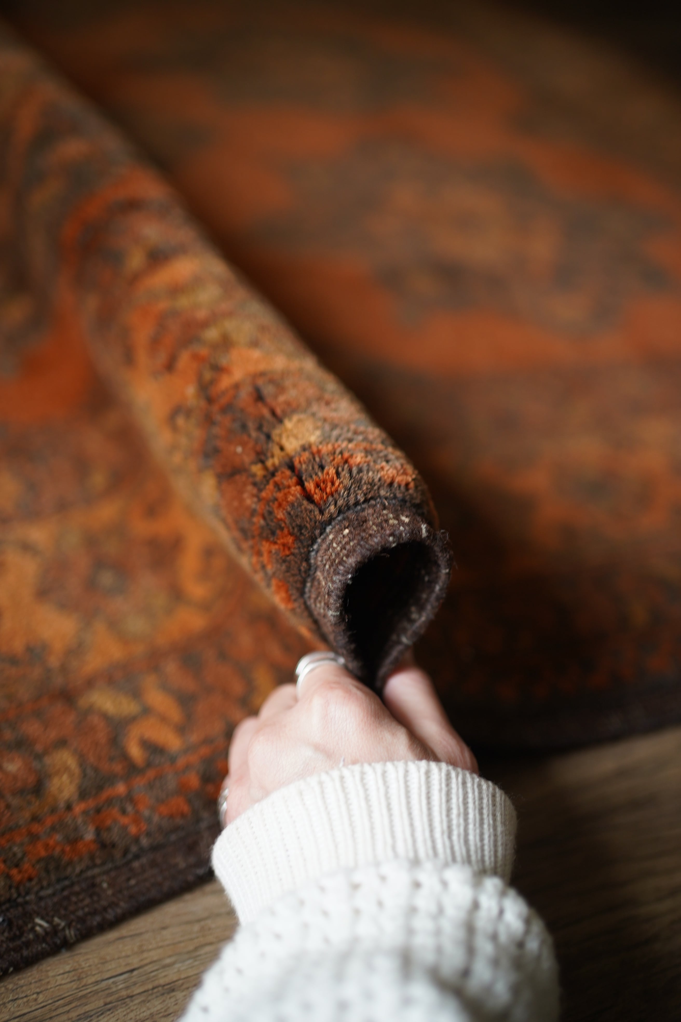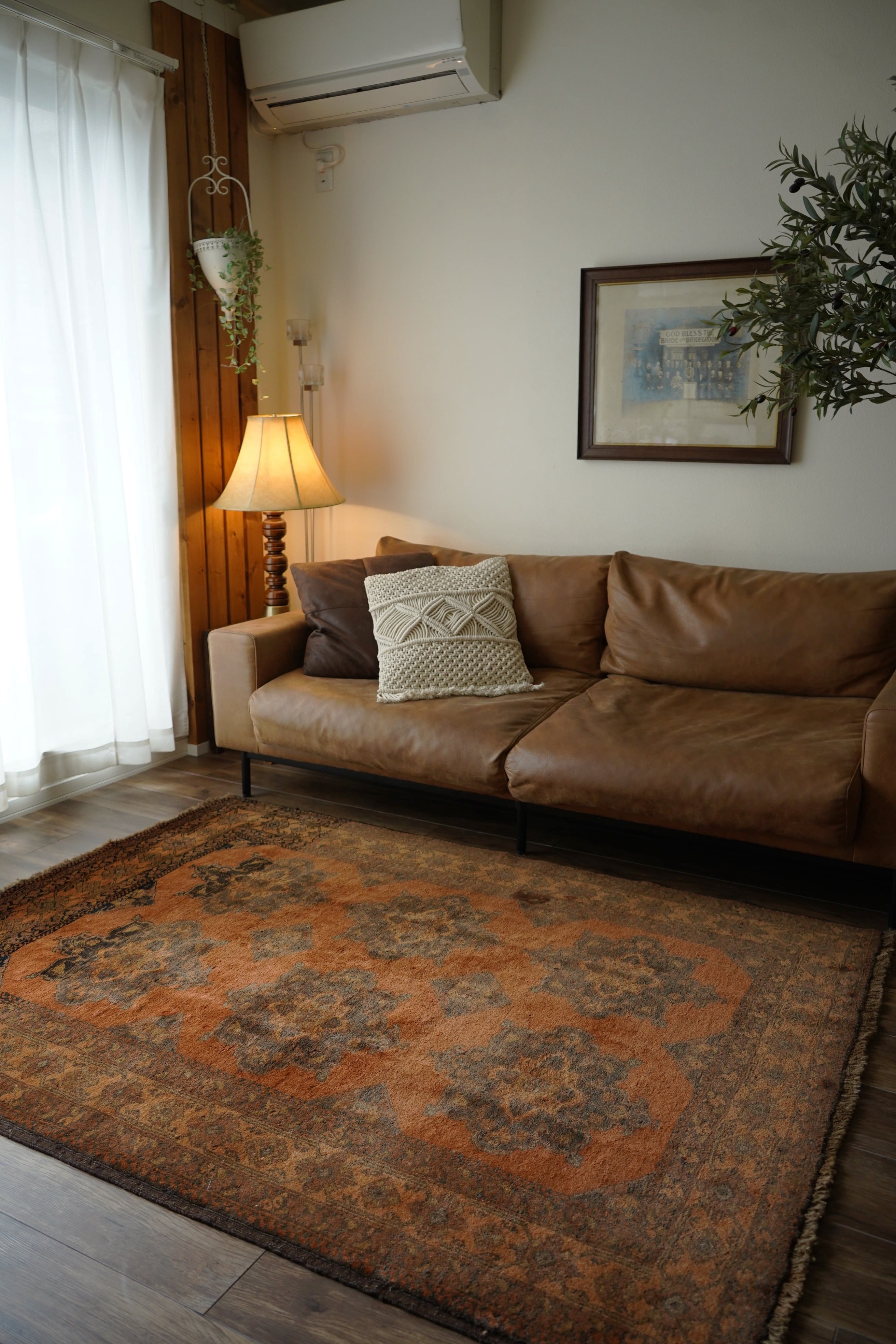 アフガニスタンで約40年前にトルクメン族によって手織りされたヴィンテージラグです。象徴的なメダリオンが6つ並ぶデザインで、配色は温かみのあるテラコッタカラーを基調とし、チャコールグレーやブラウン、くすんだオレンジが重なり合う落ち着いた雰囲気が魅力です。厚みは約1.2cmとしっかりしており、重量感のある堅牢なつくり。パイルはふかふかと柔らかく、思わずラグの上でゴロゴロしたくなるような心地よい質感です。目立ったダメージも見受けられず、大変良好なコンディション。ソファ前など、ゆったり過ごす空間に敷いていただくと、そのぬくもりと存在感を存分に楽しんでいただけると思います。店主オススメの一枚です。
