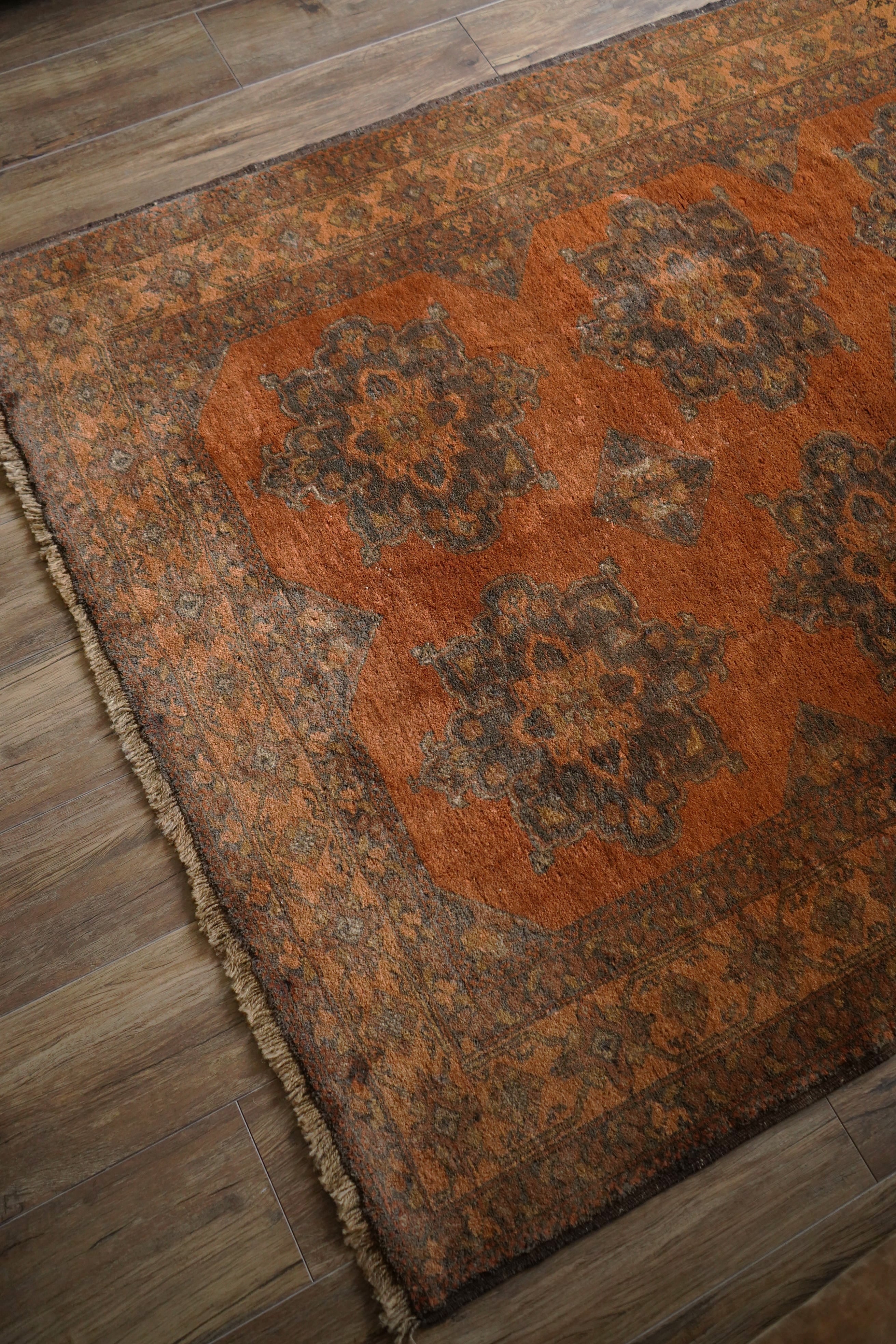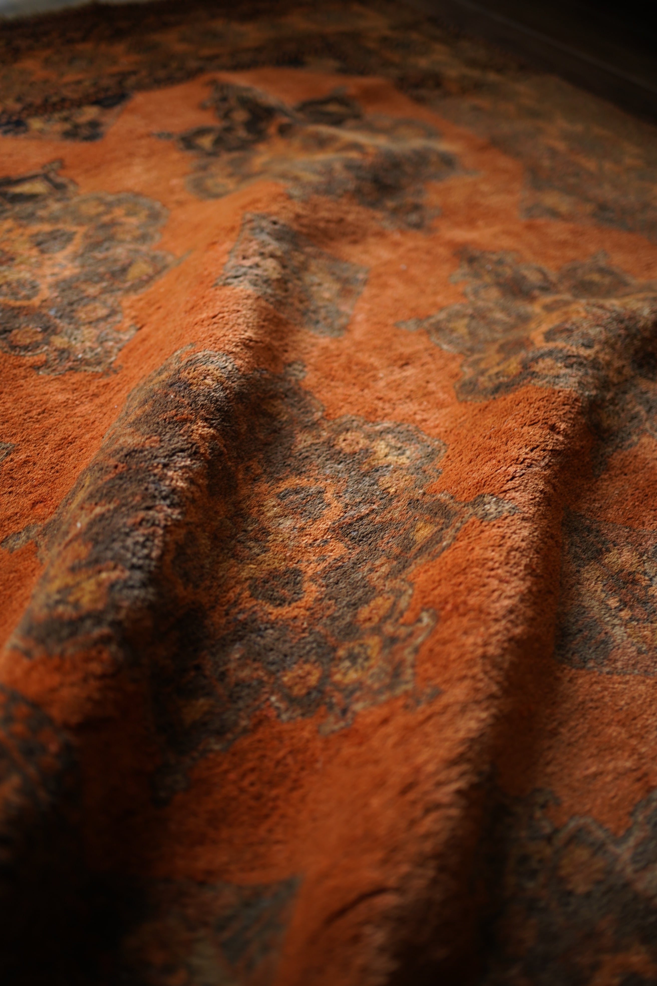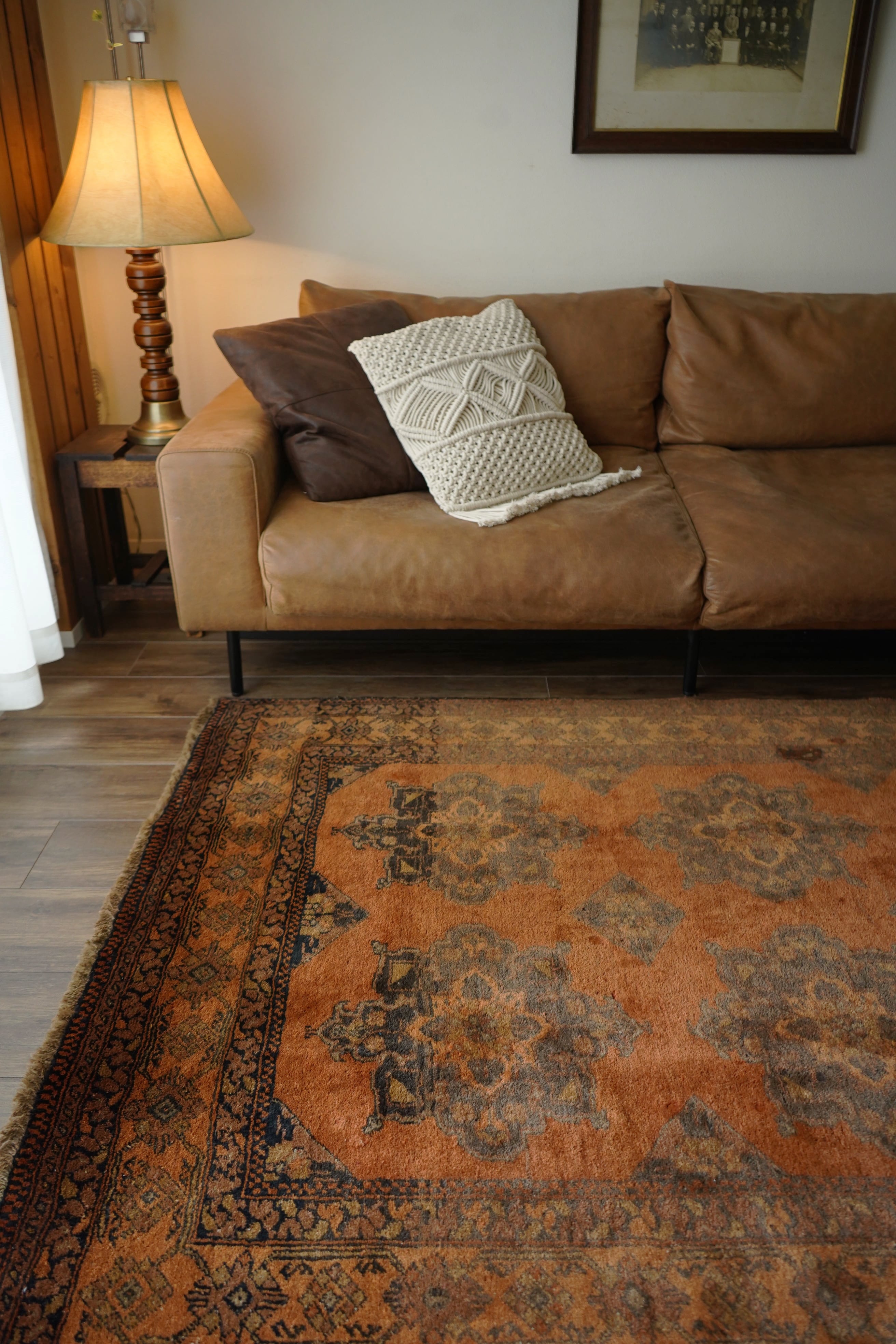 アフガニスタンで約40年前にトルクメン族によって手織りされたヴィンテージラグです。象徴的なメダリオンが6つ並ぶデザインで、配色は温かみのあるテラコッタカラーを基調とし、チャコールグレーやブラウン、くすんだオレンジが重なり合う落ち着いた雰囲気が魅力です。厚みは約1.2cmとしっかりしており、重量感のある堅牢なつくり。パイルはふかふかと柔らかく、思わずラグの上でゴロゴロしたくなるような心地よい質感です。目立ったダメージも見受けられず、大変良好なコンディション。ソファ前など、ゆったり過ごす空間に敷いていただくと、そのぬくもりと存在感を存分に楽しんでいただけると思います。店主オススメの一枚です。