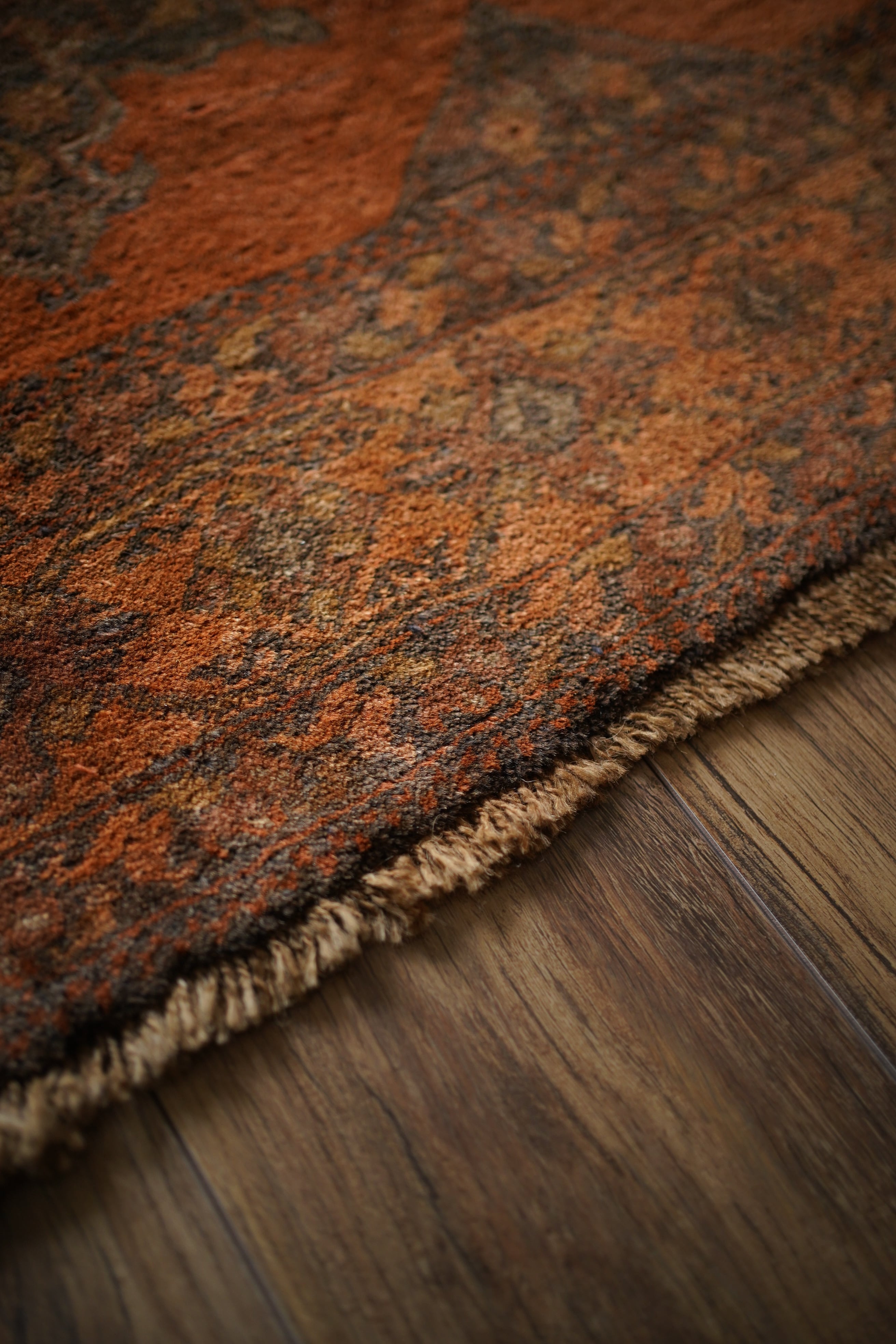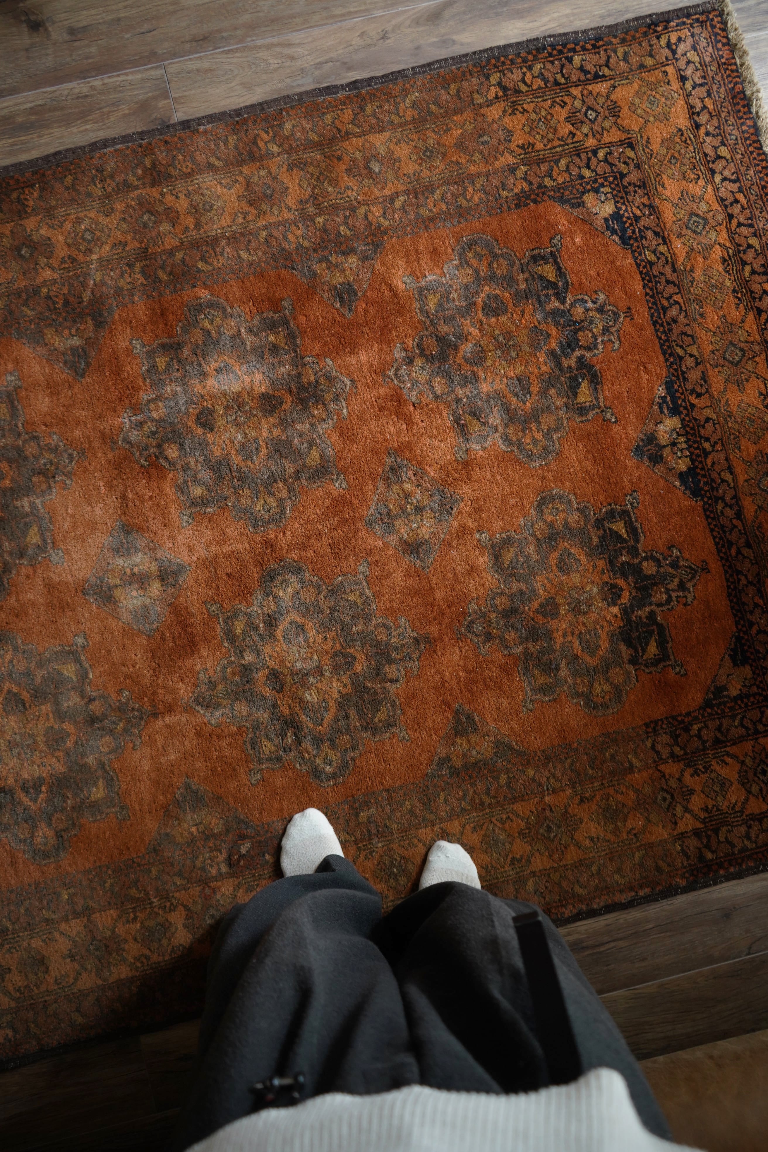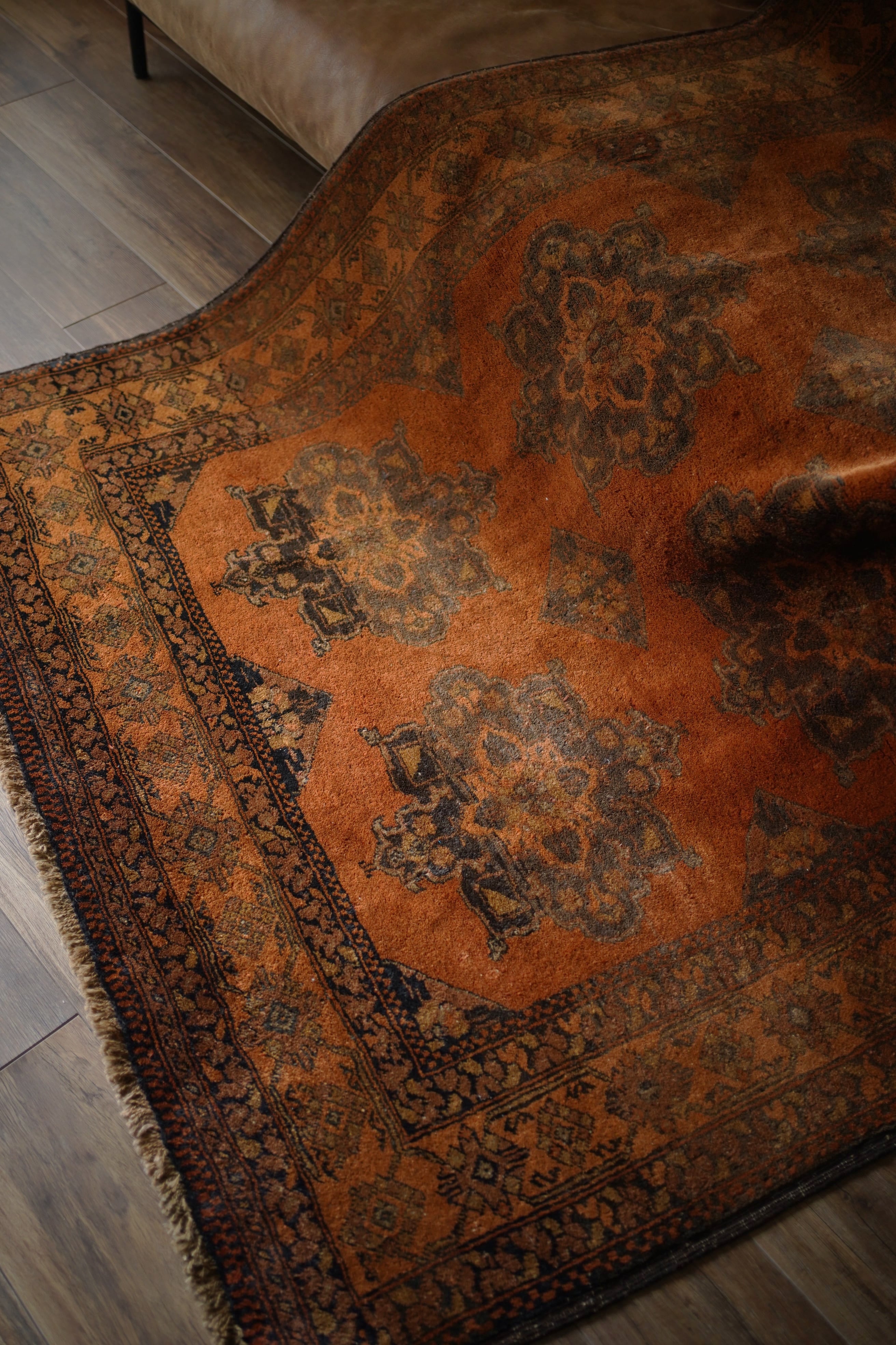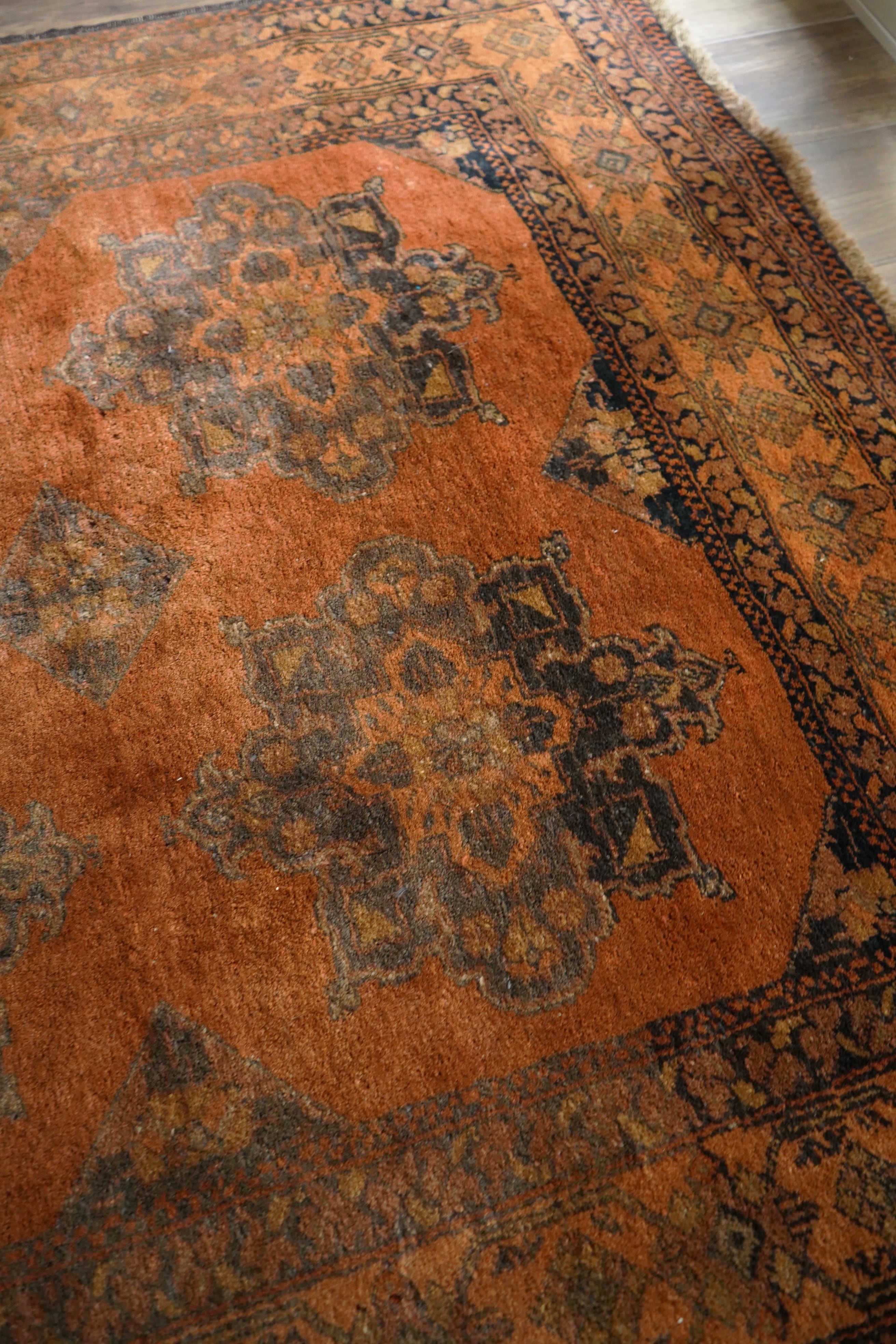 アフガニスタンで約40年前にトルクメン族によって手織りされたヴィンテージラグです。象徴的なメダリオンが6つ並ぶデザインで、配色は温かみのあるテラコッタカラーを基調とし、チャコールグレーやブラウン、くすんだオレンジが重なり合う落ち着いた雰囲気が魅力です。厚みは約1.2cmとしっかりしており、重量感のある堅牢なつくり。パイルはふかふかと柔らかく、思わずラグの上でゴロゴロしたくなるような心地よい質感です。目立ったダメージも見受けられず、大変良好なコンディション。ソファ前など、ゆったり過ごす空間に敷いていただくと、そのぬくもりと存在感を存分に楽しんでいただけると思います。店主オススメの一枚です。
