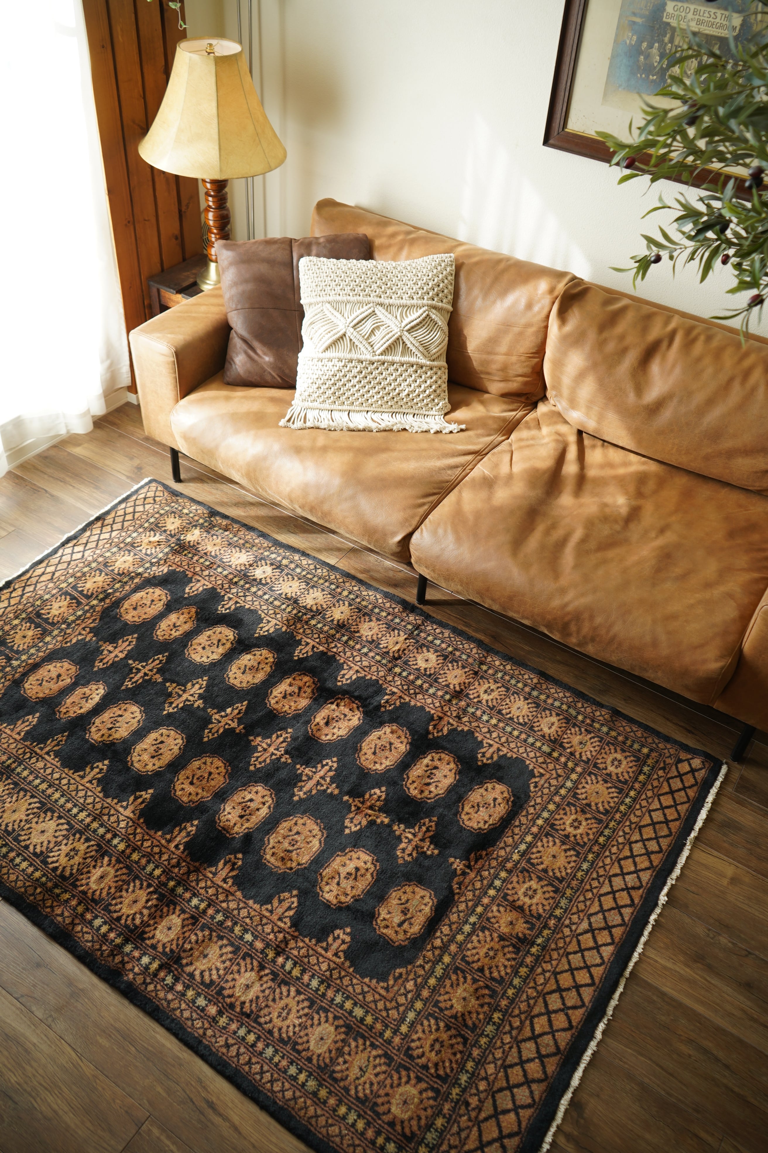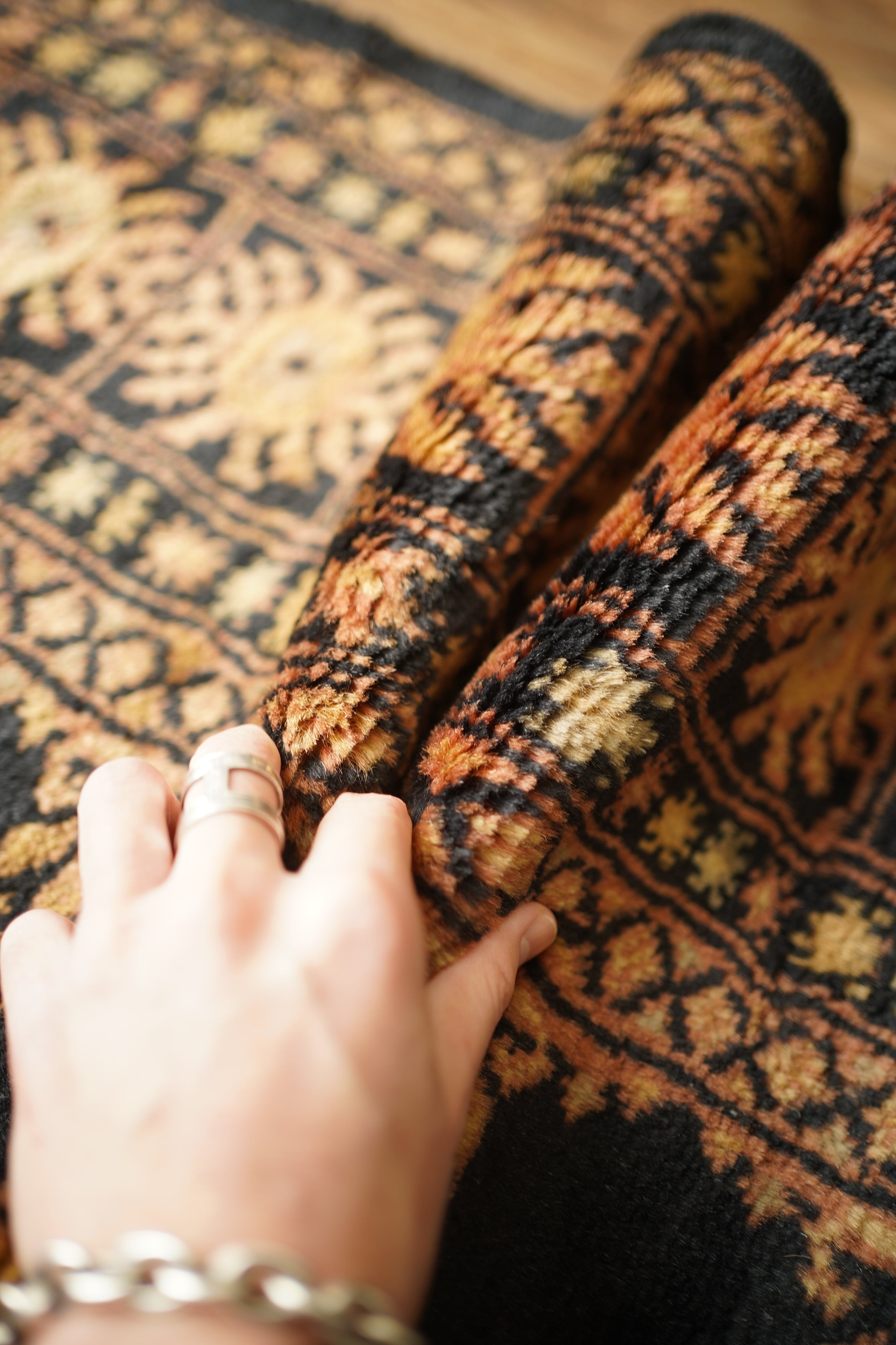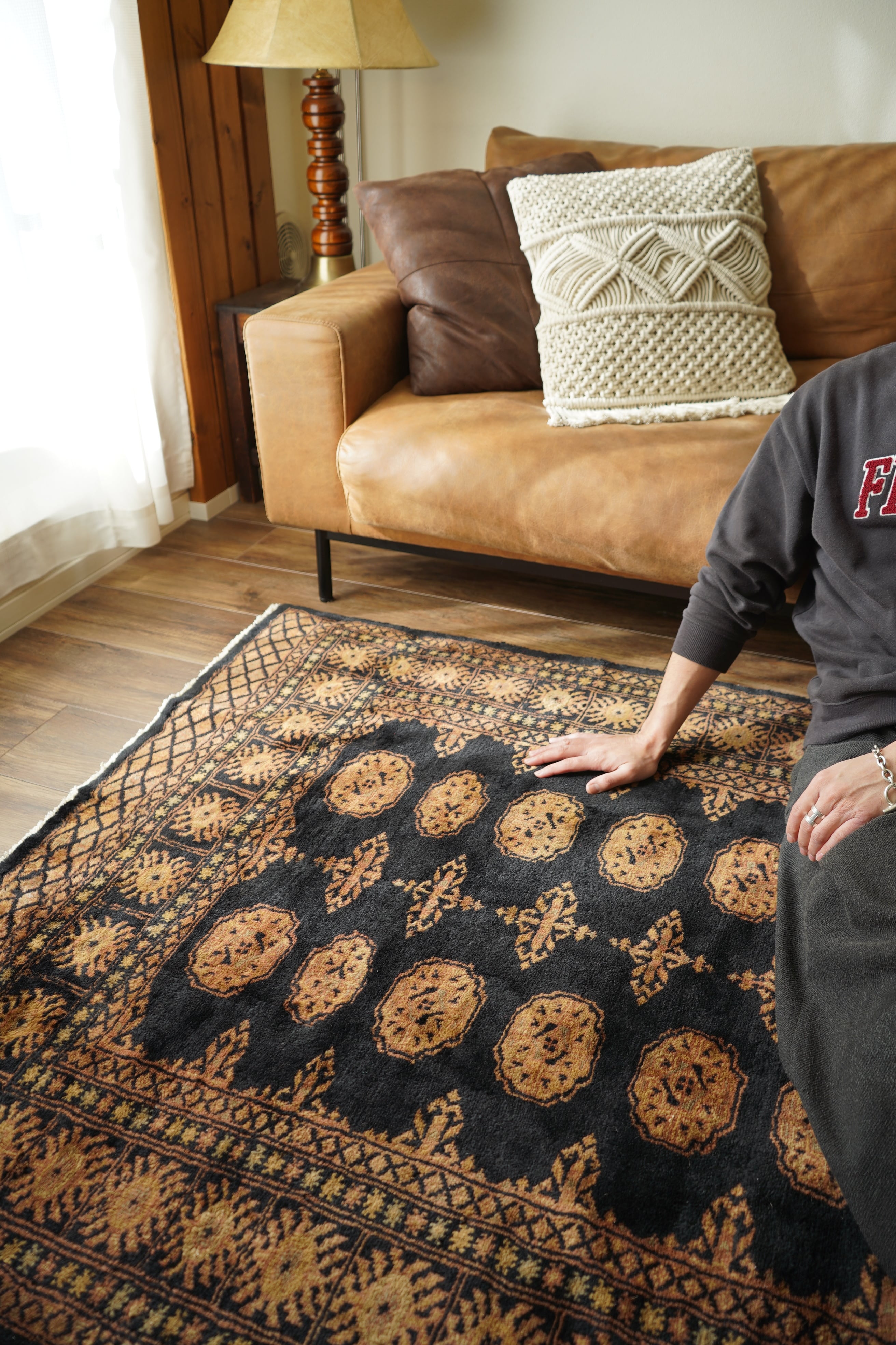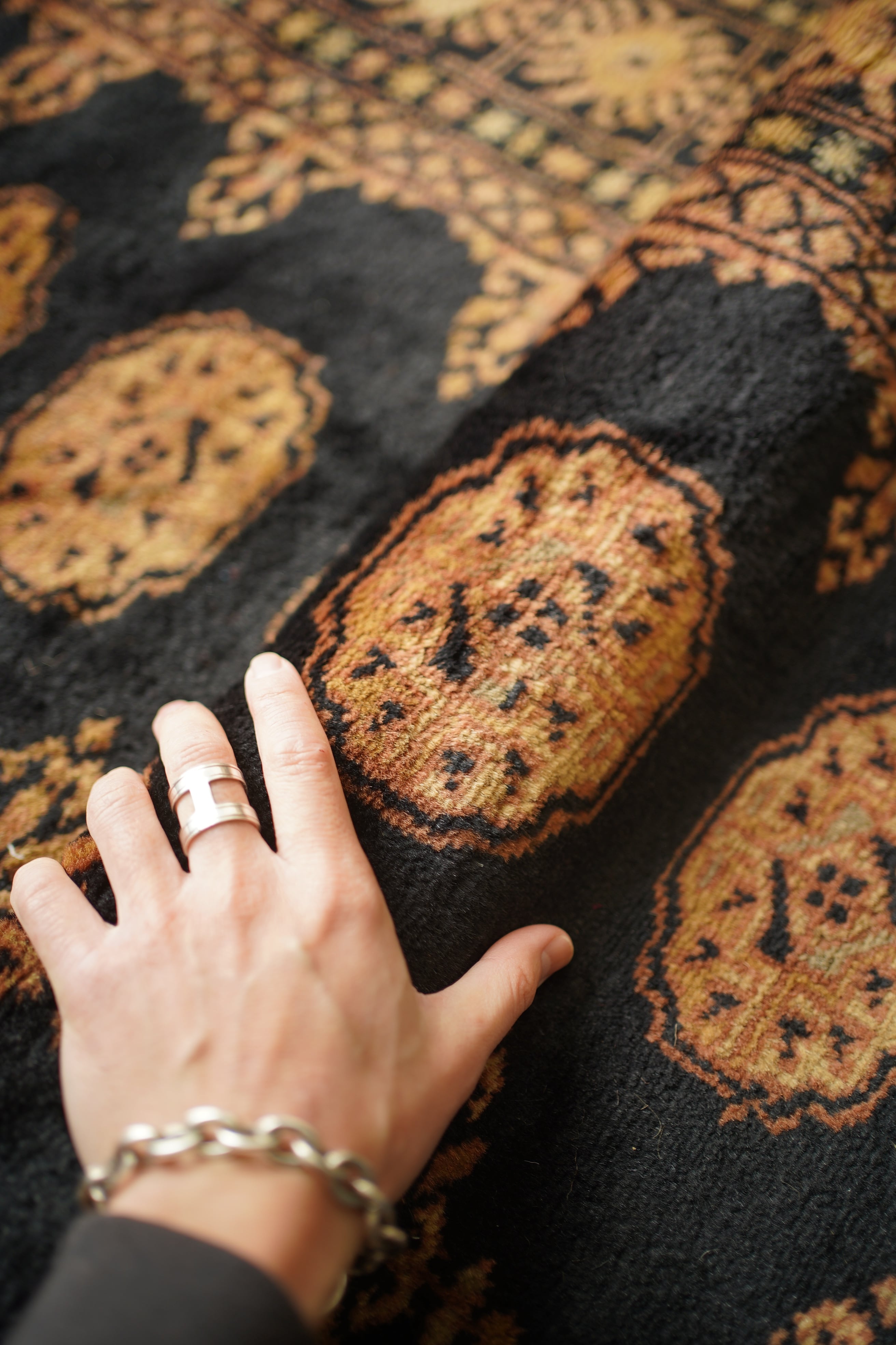 パキスタン北東部の都市・ラホールで織られたヴィンテージラグ。“ボハラ”と呼ばれる象の足跡をモチーフにした伝統的な文様が並ぶデザインです。ブラックをベースに、くすんだコーラル、ベージュを基調とした落ち着いた配色で、パイル全体に広がる艶がより一層上品さを引き立てています。厚みは約1.2cmほどで、表面はふかふかと柔らかく、肌触りの心地よさが魅力です。目立つダメージも見受けられず、大変良好なコンディション。リビングのソファ前や寝室などにどうぞ♫