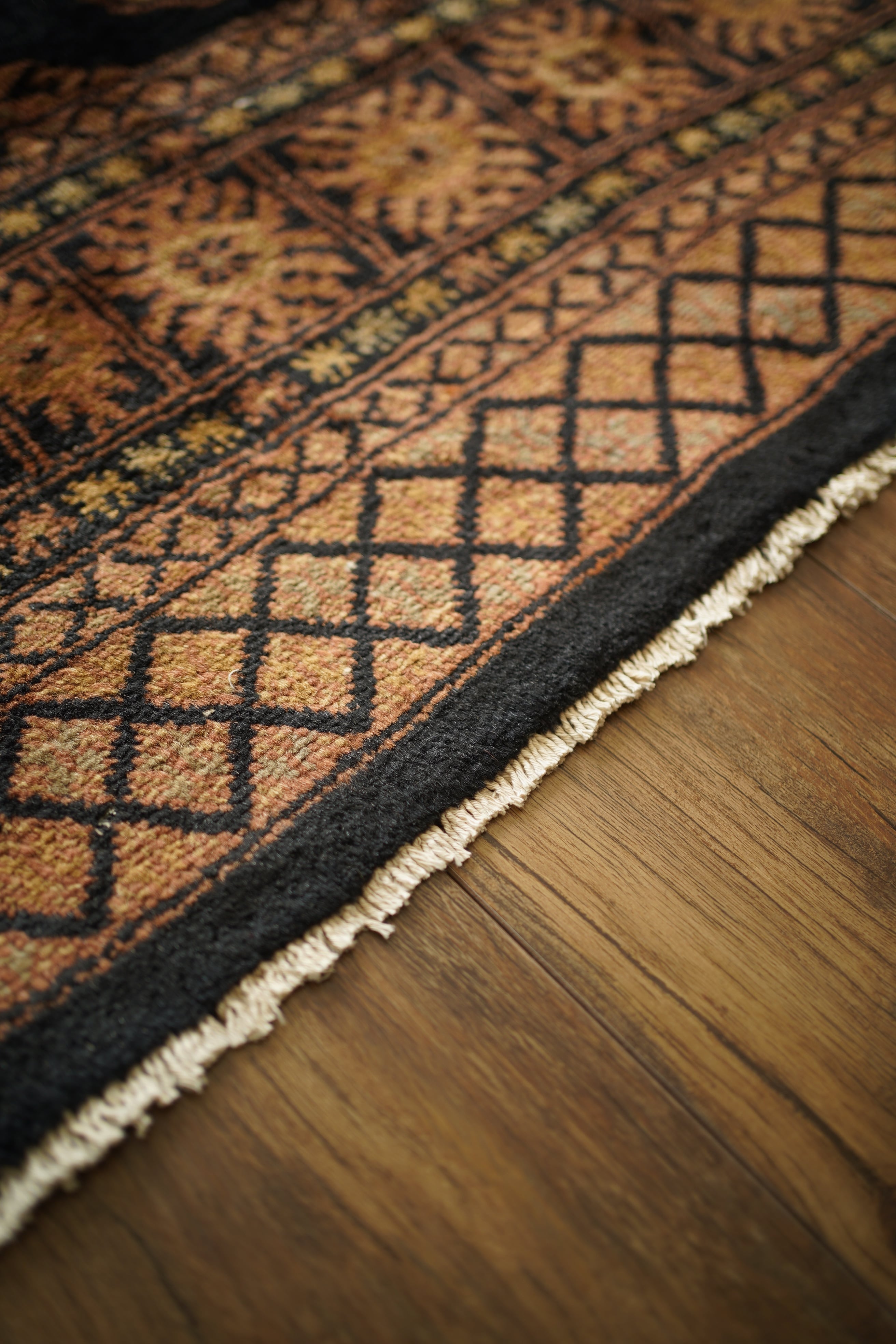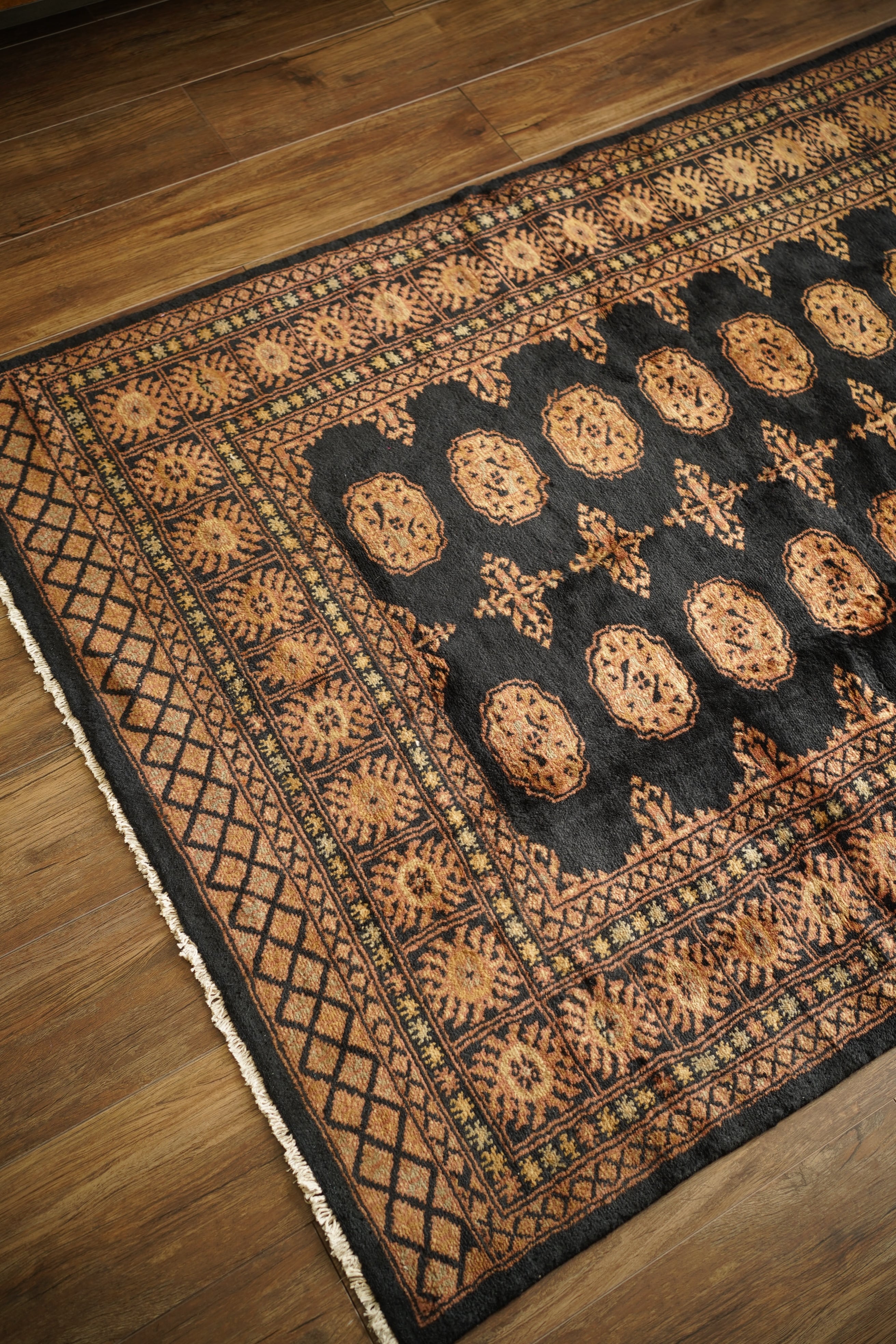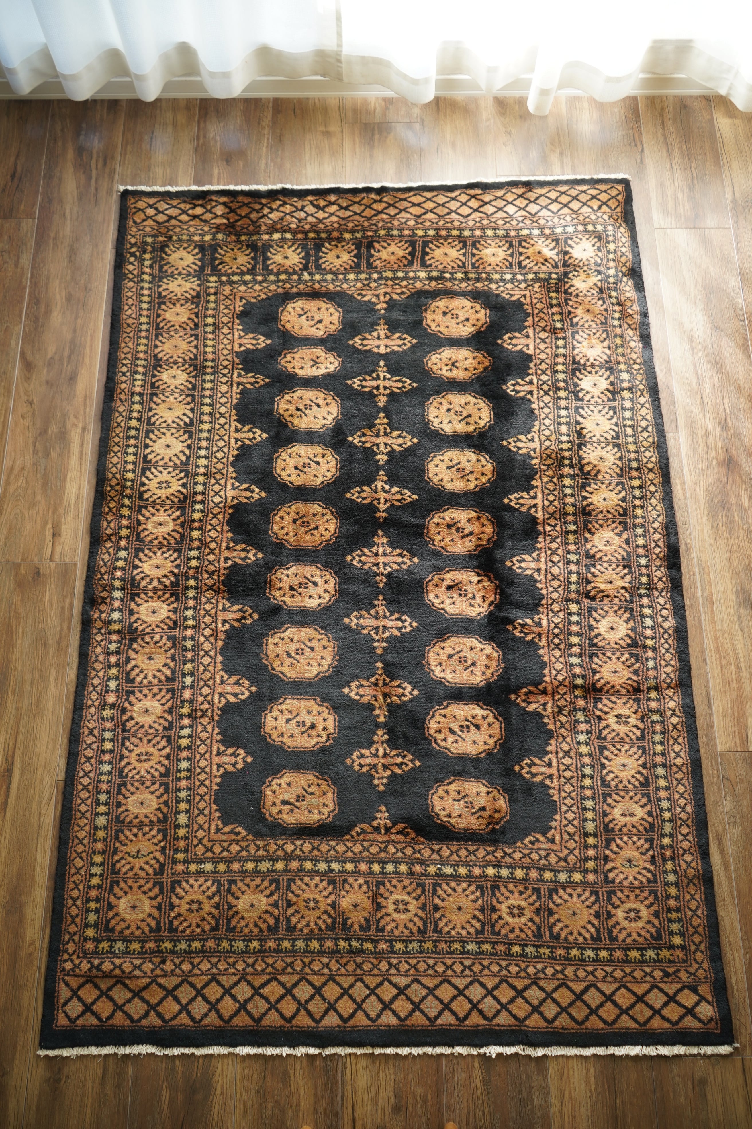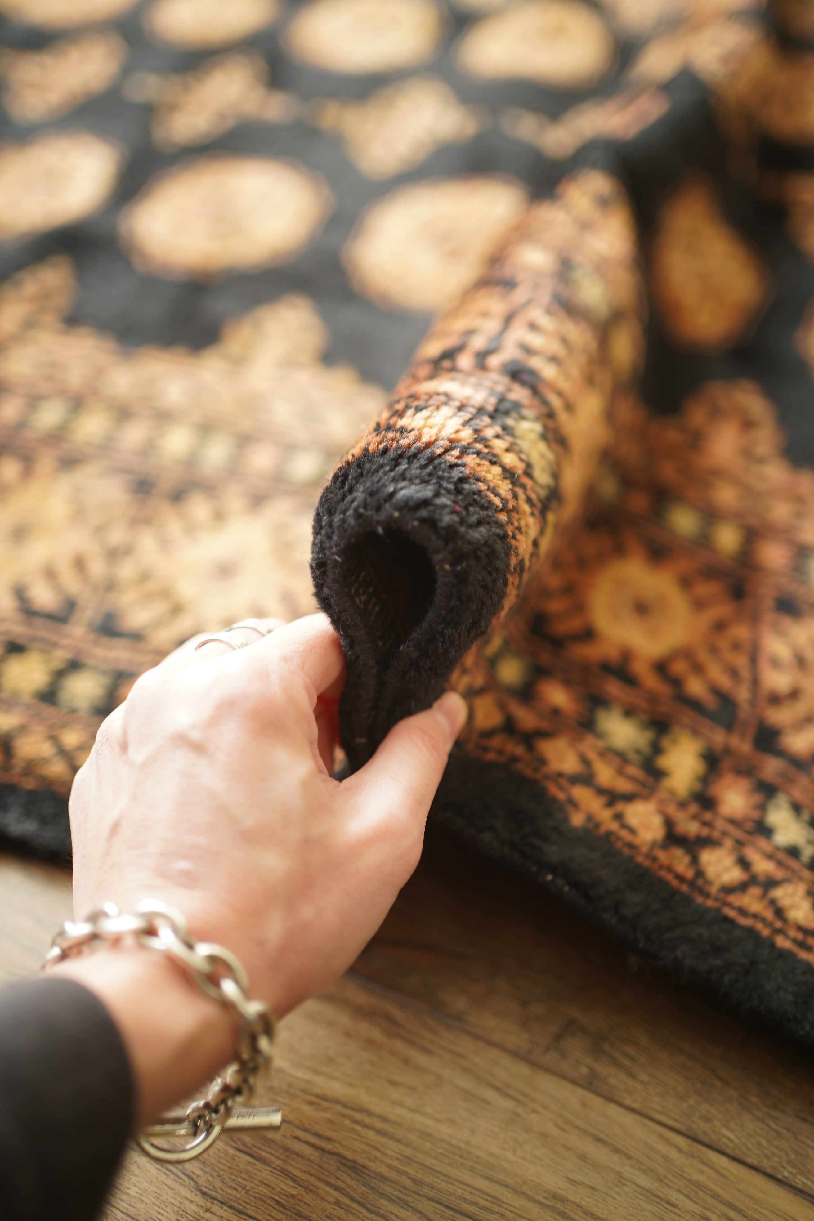 パキスタン北東部の都市・ラホールで織られたヴィンテージラグ。“ボハラ”と呼ばれる象の足跡をモチーフにした伝統的な文様が並ぶデザインです。ブラックをベースに、くすんだコーラル、ベージュを基調とした落ち着いた配色で、パイル全体に広がる艶がより一層上品さを引き立てています。厚みは約1.2cmほどで、表面はふかふかと柔らかく、肌触りの心地よさが魅力です。目立つダメージも見受けられず、大変良好なコンディション。リビングのソファ前や寝室などにどうぞ♫