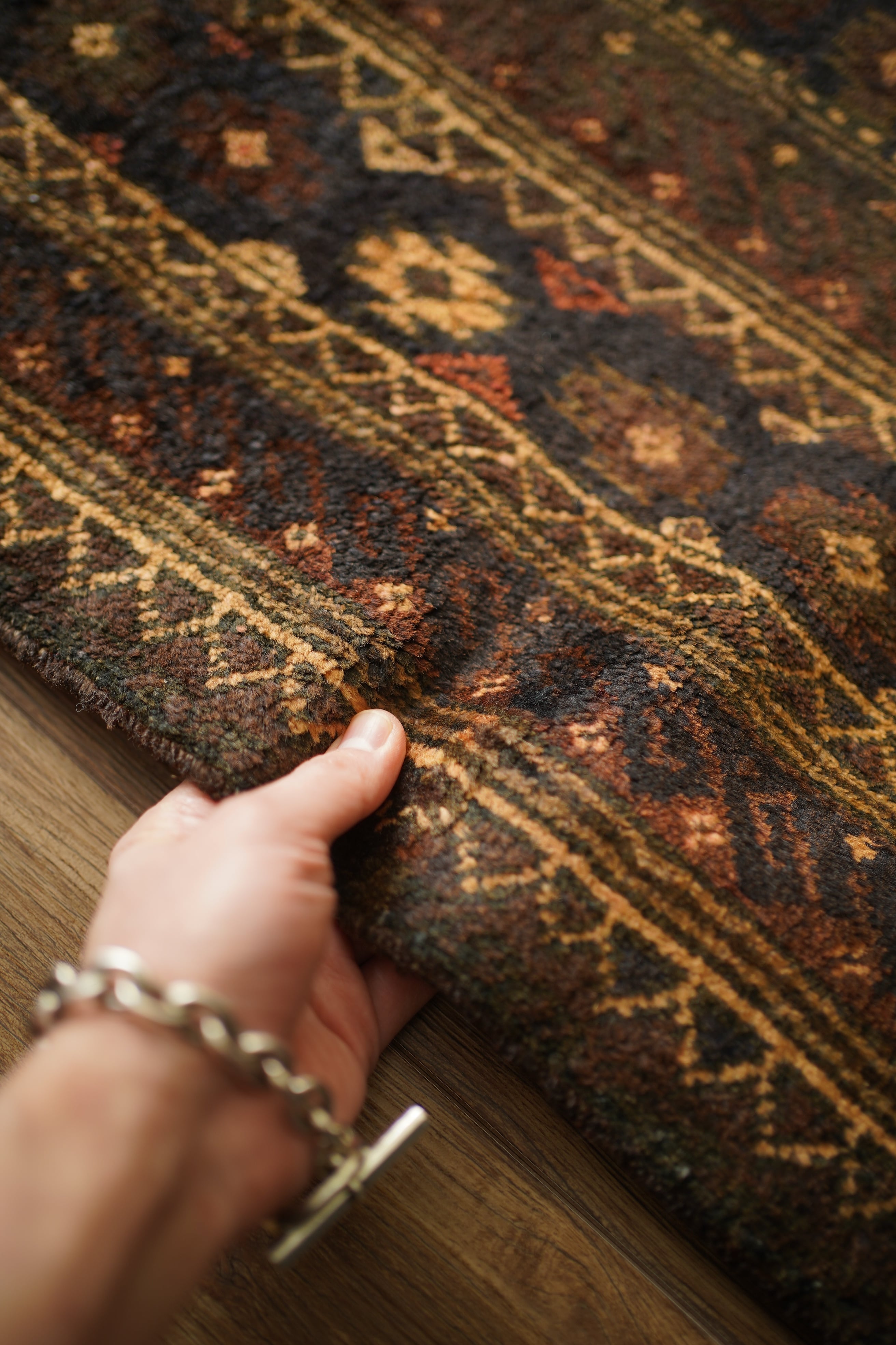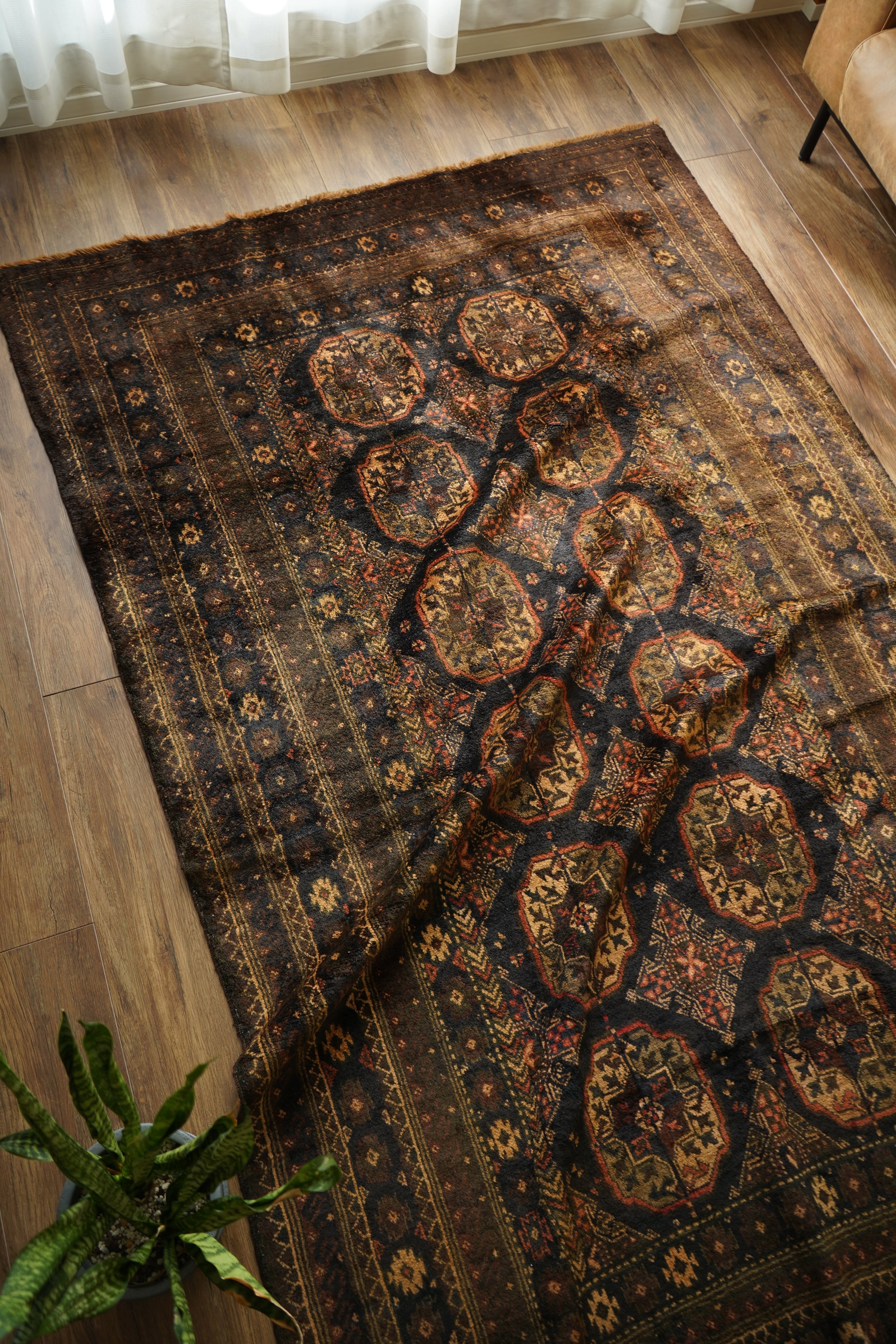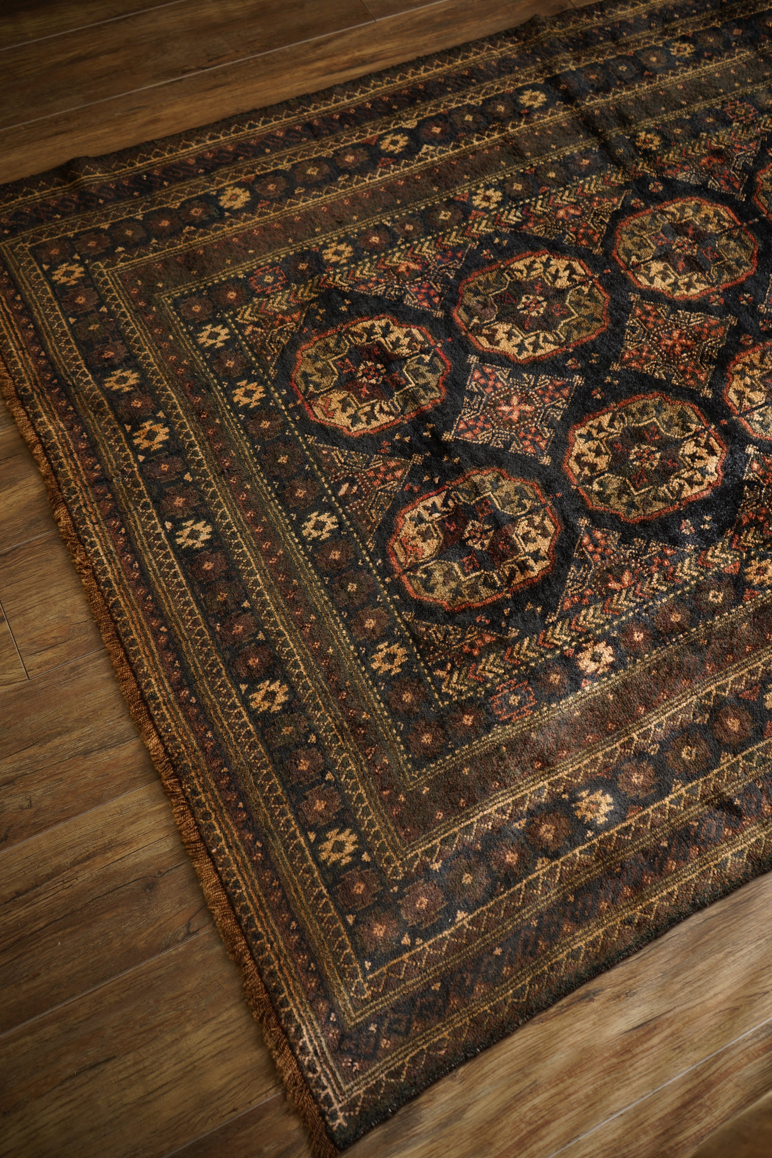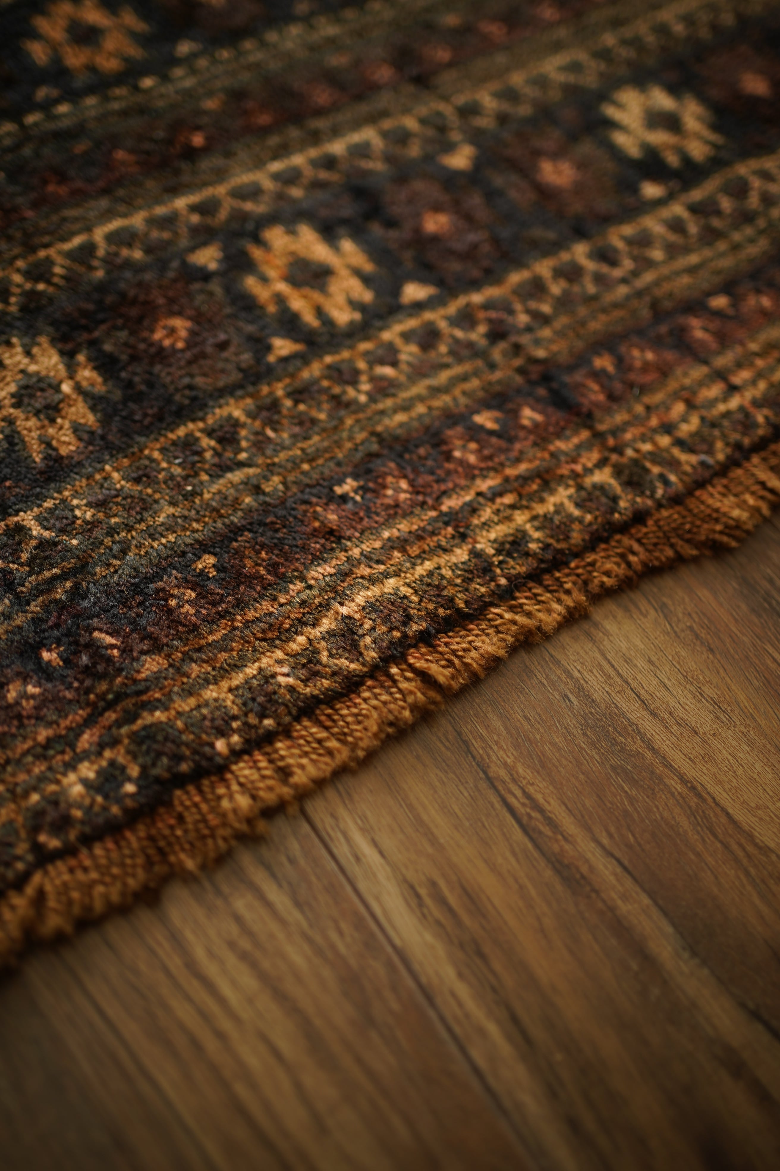 約60年前にアフガニスタンで織られたヴィンテージのバルーチラグです。深いダークブラウンやチャコールグレー、ブラック、薄茶色を基調にした統一感のある配色に、優しい朱色がアクセントとなった一枚。フィールドには大きめのギュル紋様が連なり、存在感のあるデザインが魅力です。経年によってパイル全体にはほんのりとした艶が生まれており、重厚感の中に美しい深みを感じられます。表面はふわっと柔らかく心地よい肌触りで、厚みは約8mm。踏み心地もよく、日常使いにも適した質感です。目立ったダメージも見受けられず、良好なコンティション。落ち着いた渋い色合いのため、ヴィンテージ家具や古材のインテリアとも非常に相性がよろしいかと思います。