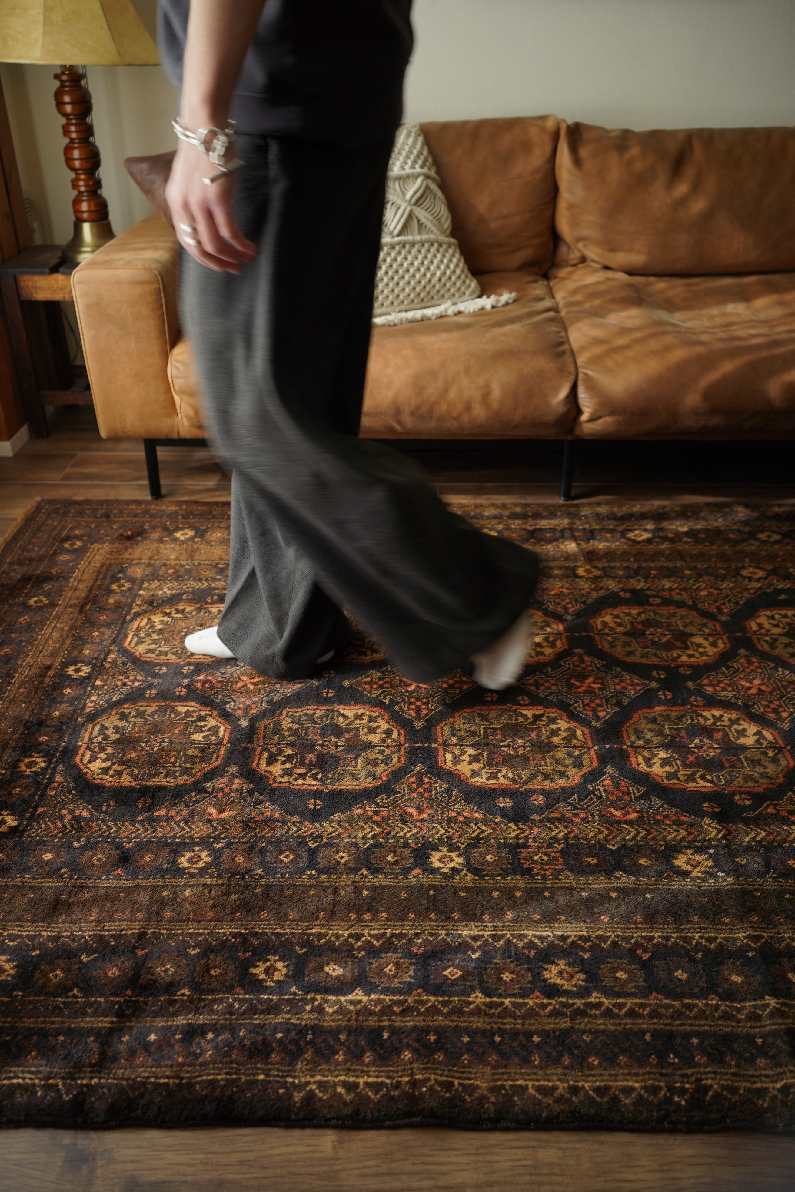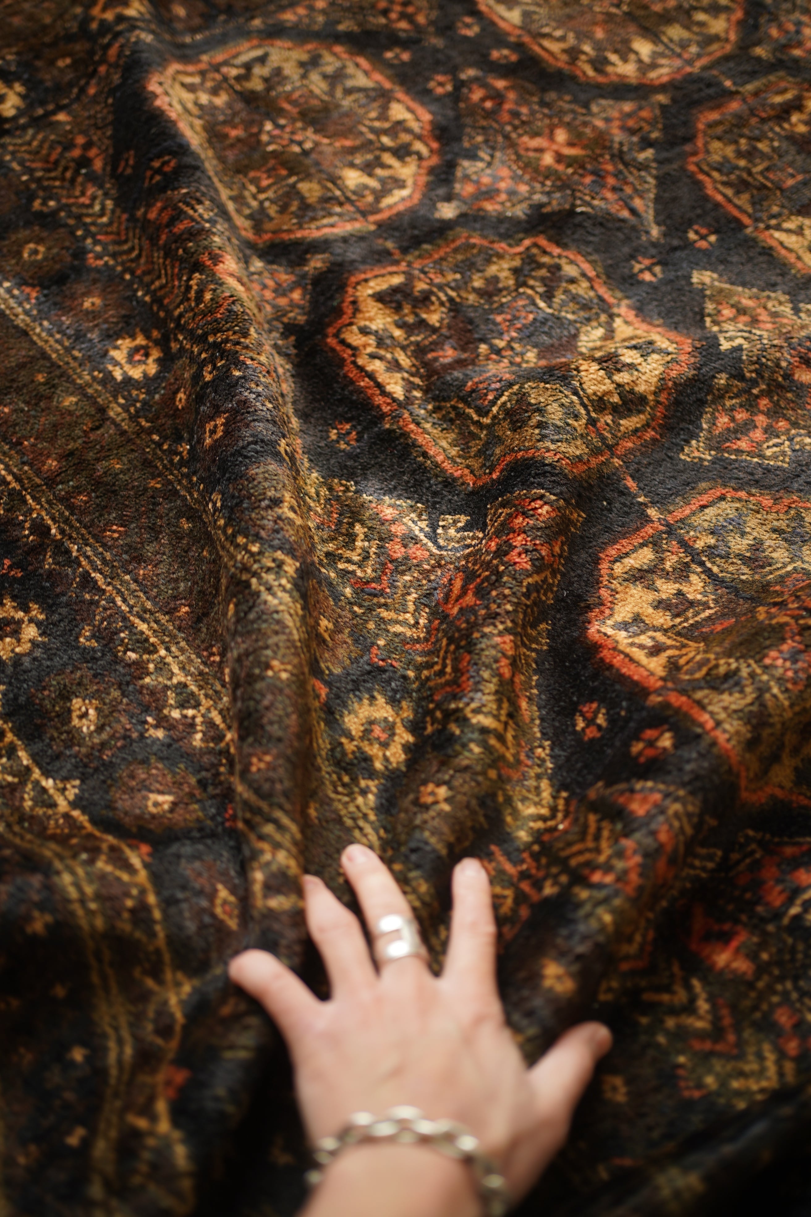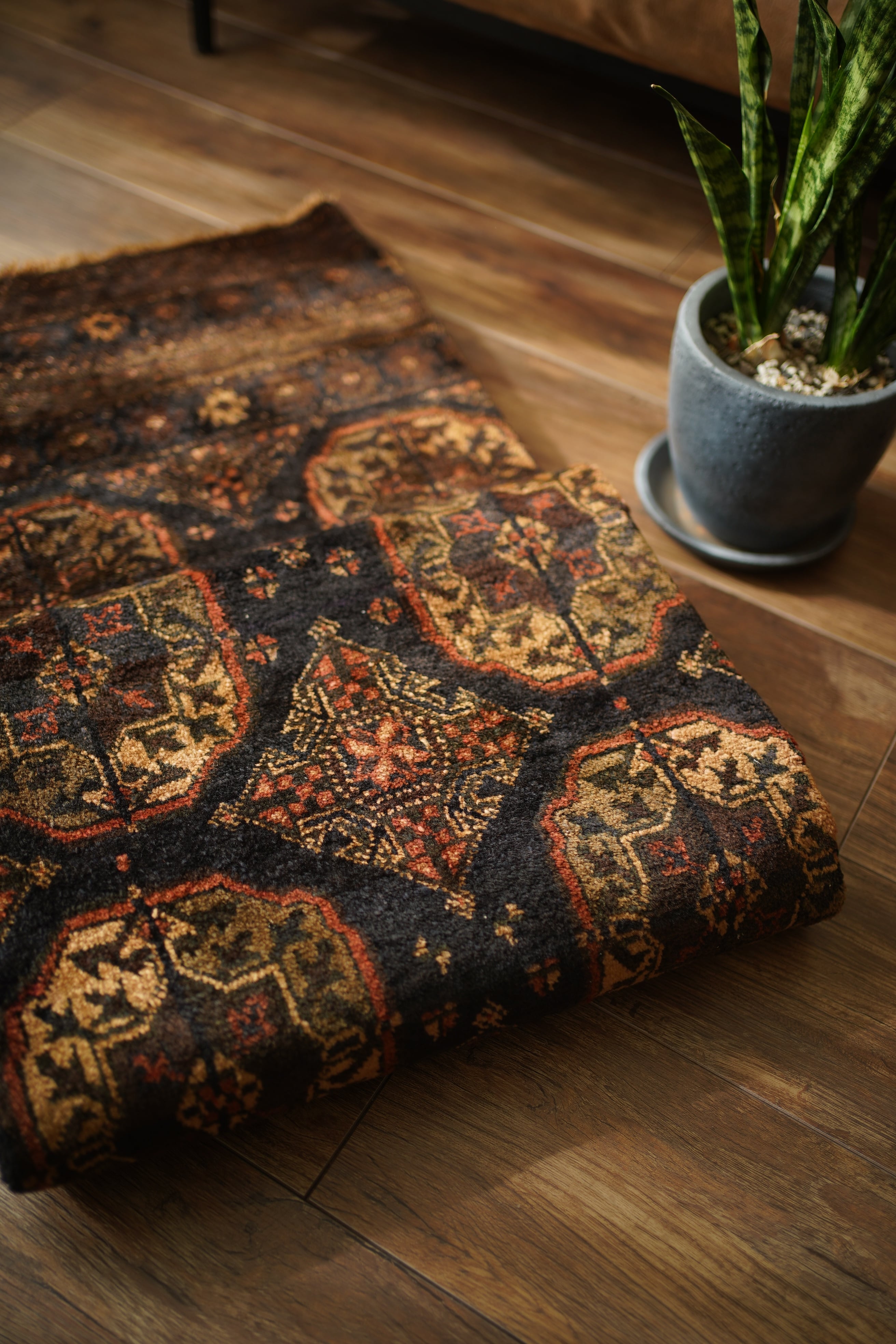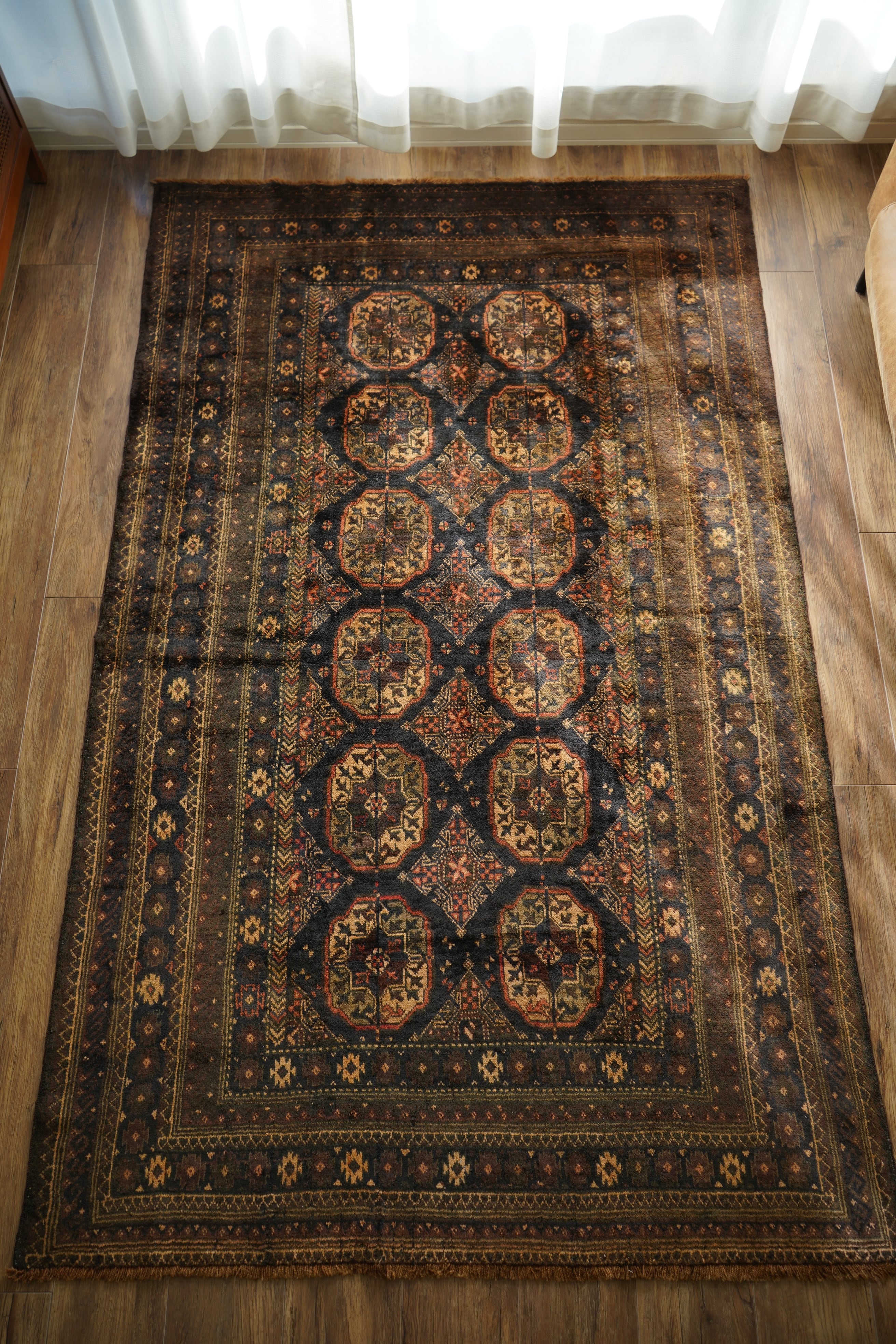 約60年前にアフガニスタンで織られたヴィンテージのバルーチラグです。深いダークブラウンやチャコールグレー、ブラック、薄茶色を基調にした統一感のある配色に、優しい朱色がアクセントとなった一枚。フィールドには大きめのギュル紋様が連なり、存在感のあるデザインが魅力です。経年によってパイル全体にはほんのりとした艶が生まれており、重厚感の中に美しい深みを感じられます。表面はふわっと柔らかく心地よい肌触りで、厚みは約8mm。踏み心地もよく、日常使いにも適した質感です。目立ったダメージも見受けられず、良好なコンティション。落ち着いた渋い色合いのため、ヴィンテージ家具や古材のインテリアとも非常に相性がよろしいかと思います。