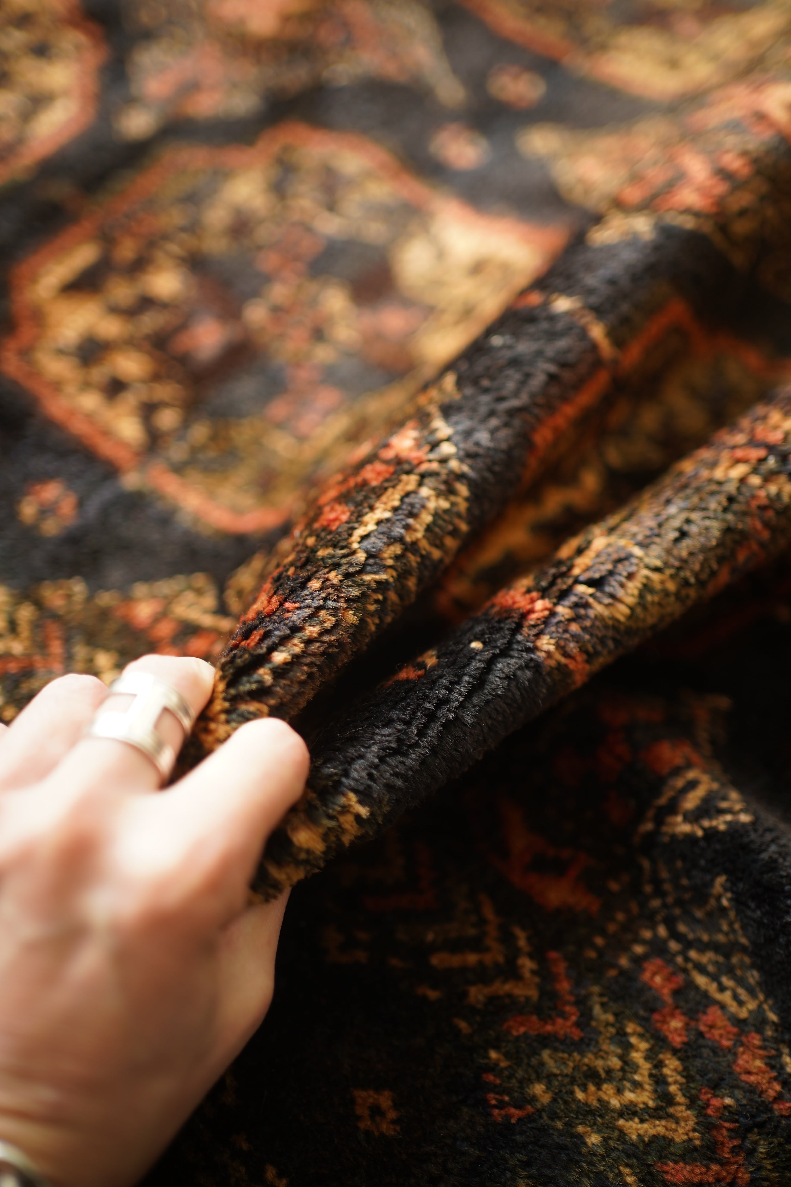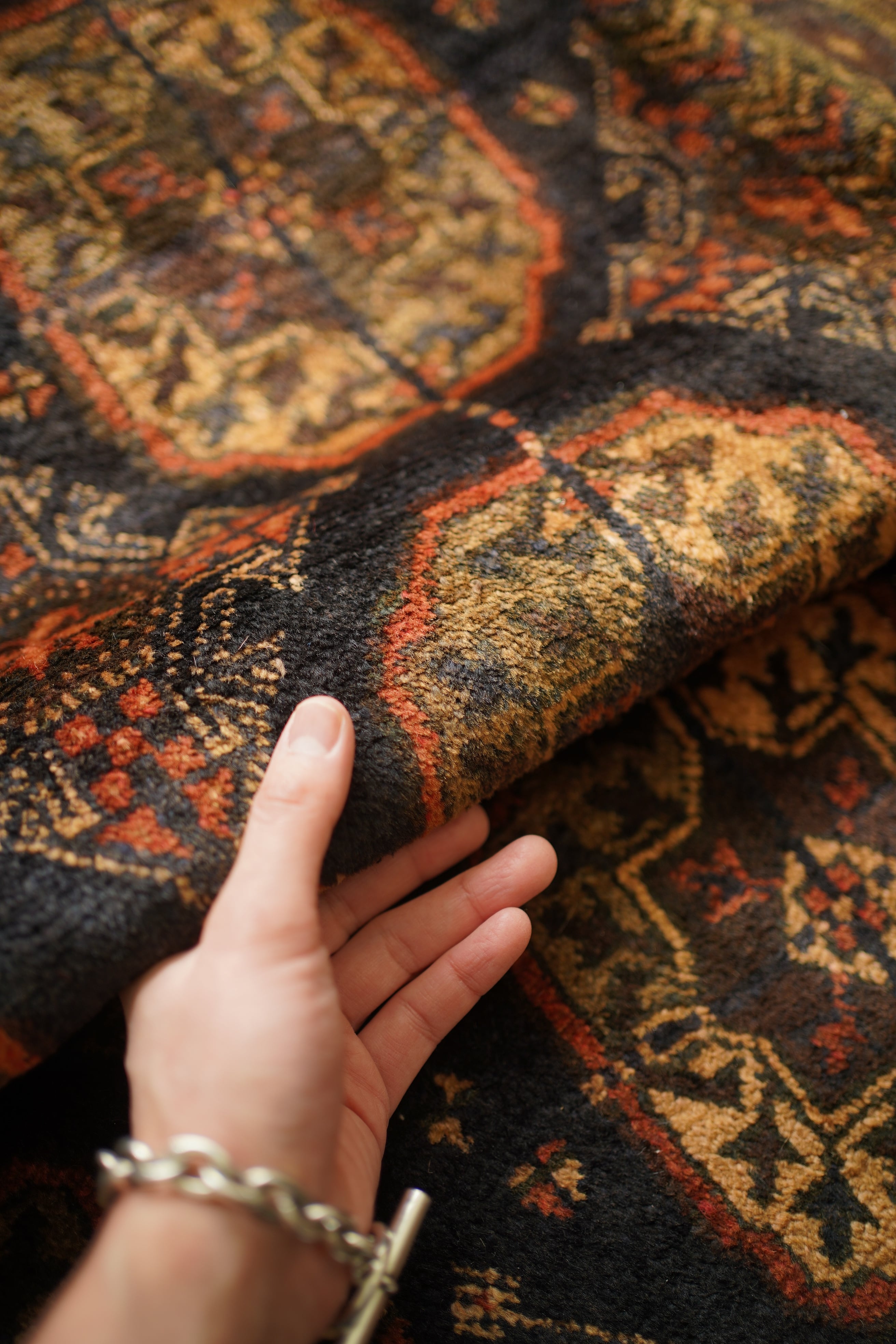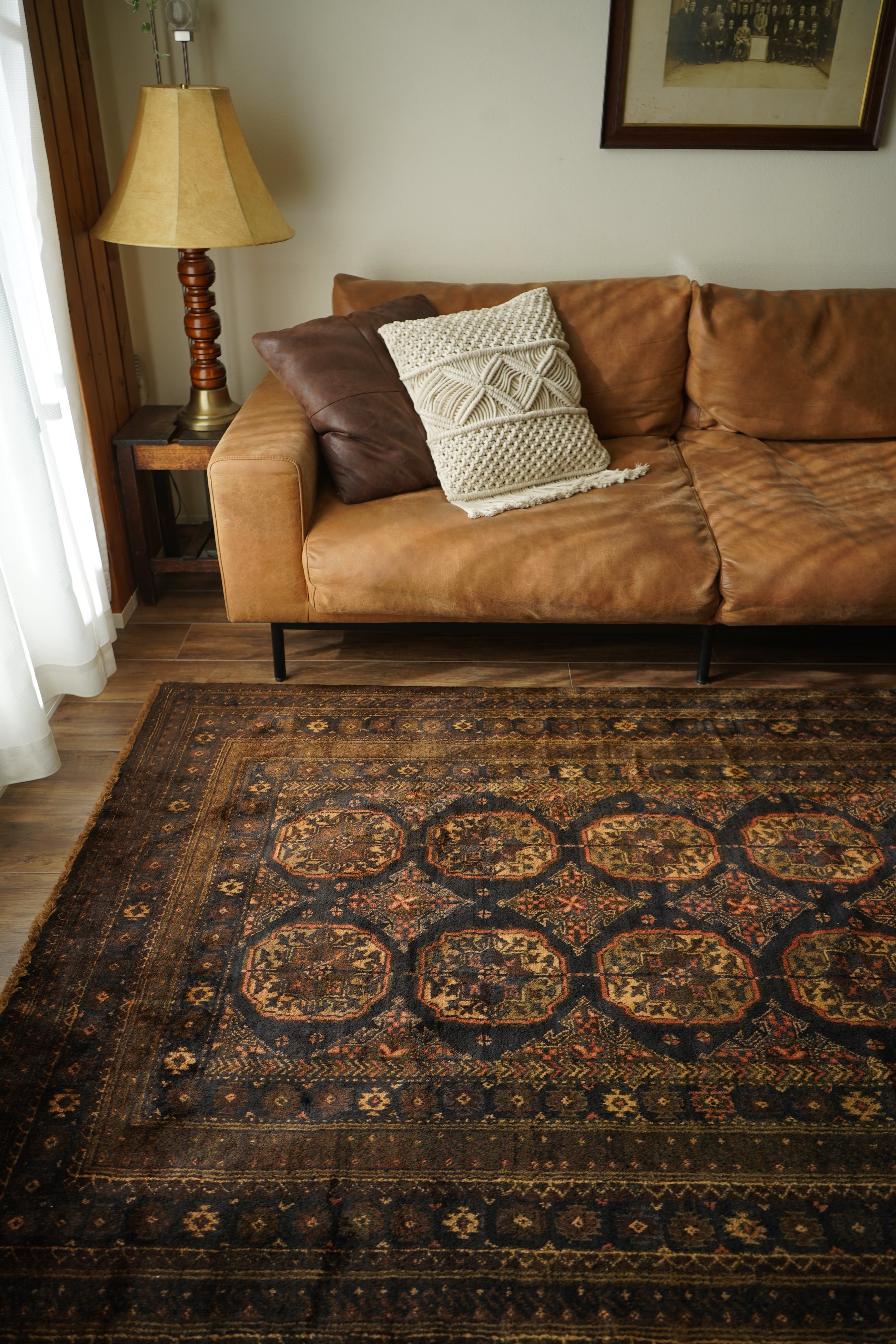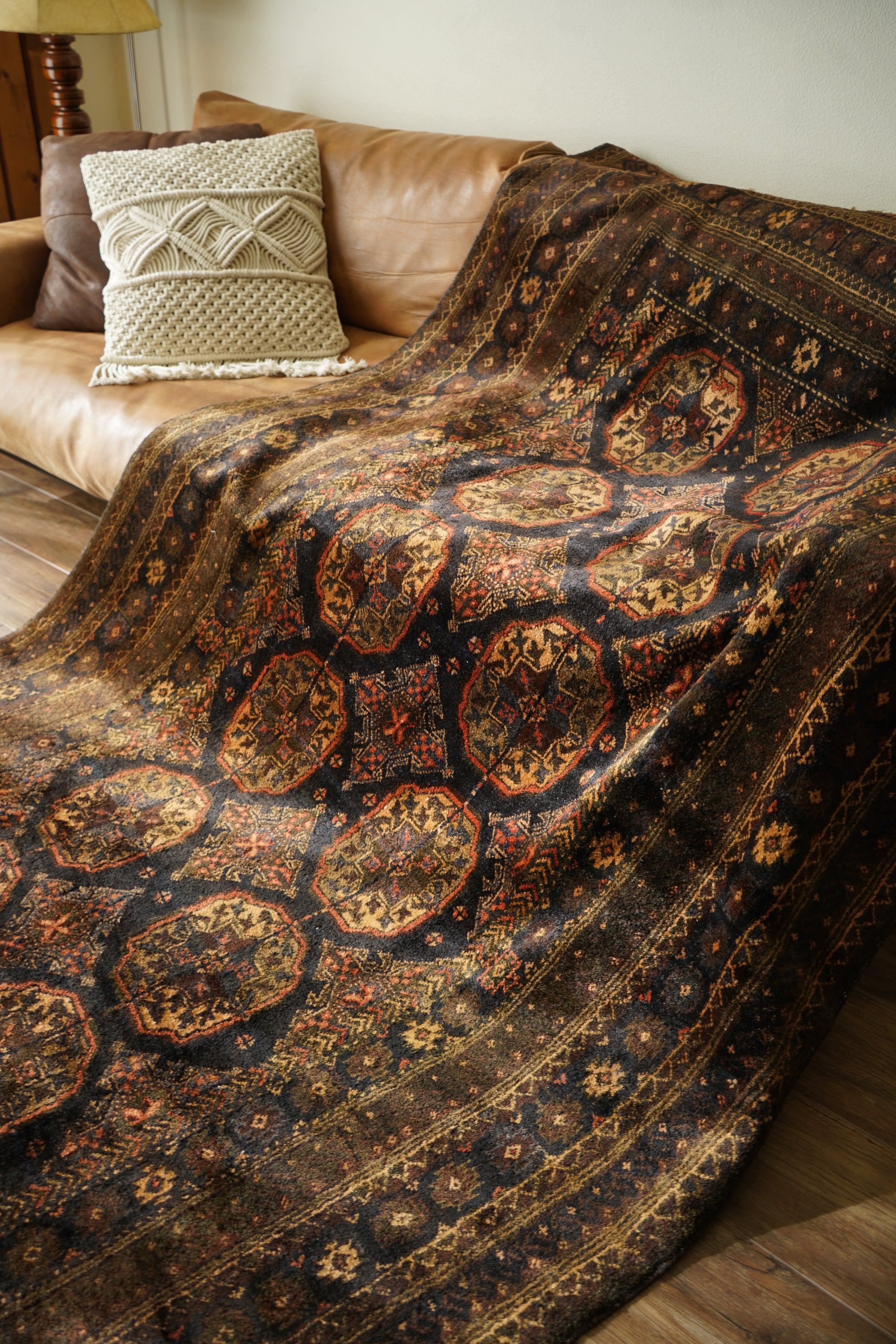 約60年前にアフガニスタンで織られたヴィンテージのバルーチラグです。深いダークブラウンやチャコールグレー、ブラック、薄茶色を基調にした統一感のある配色に、優しい朱色がアクセントとなった一枚。フィールドには大きめのギュル紋様が連なり、存在感のあるデザインが魅力です。経年によってパイル全体にはほんのりとした艶が生まれており、重厚感の中に美しい深みを感じられます。表面はふわっと柔らかく心地よい肌触りで、厚みは約8mm。踏み心地もよく、日常使いにも適した質感です。目立ったダメージも見受けられず、良好なコンティション。落ち着いた渋い色合いのため、ヴィンテージ家具や古材のインテリアとも非常に相性がよろしいかと思います。