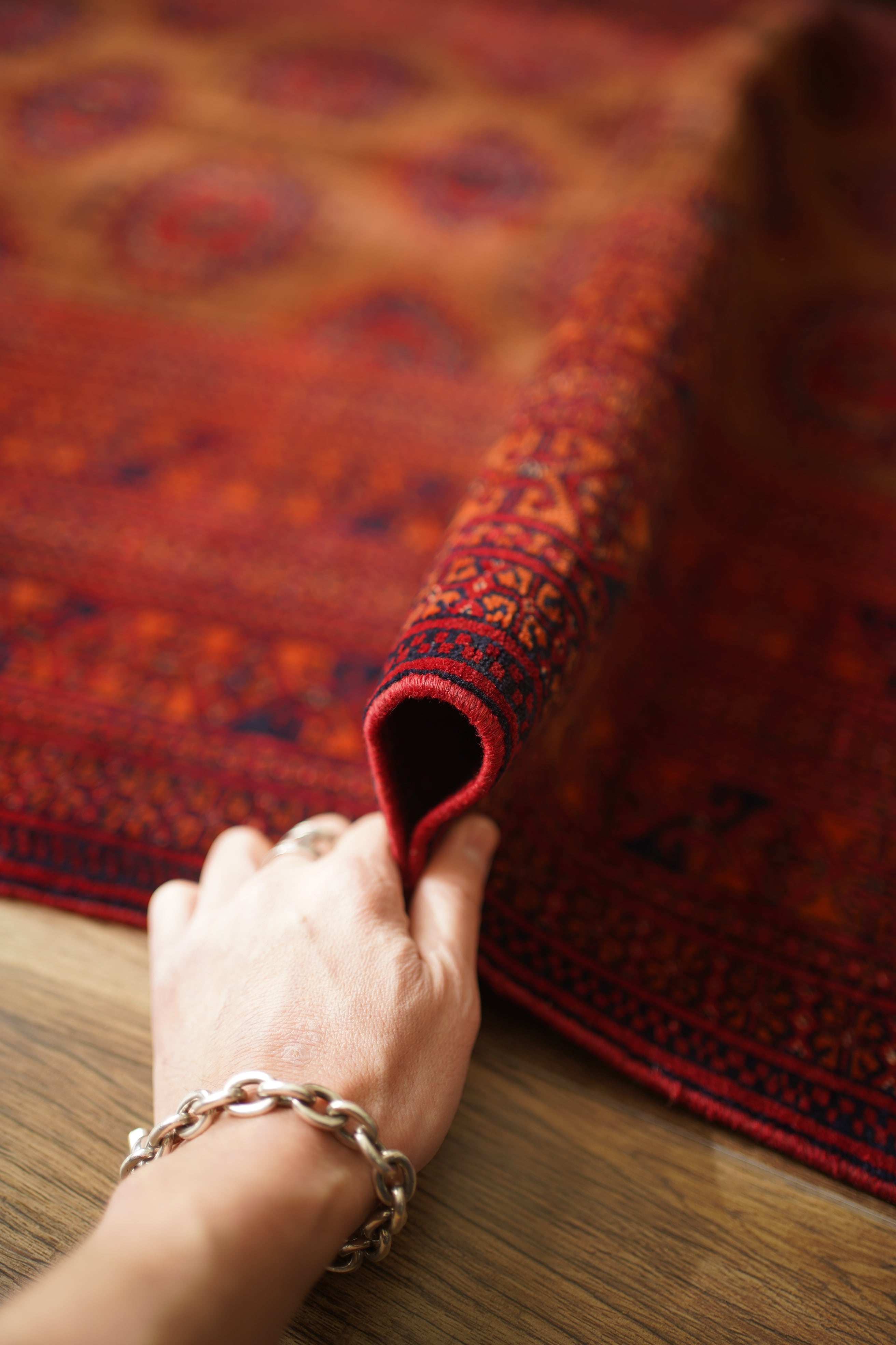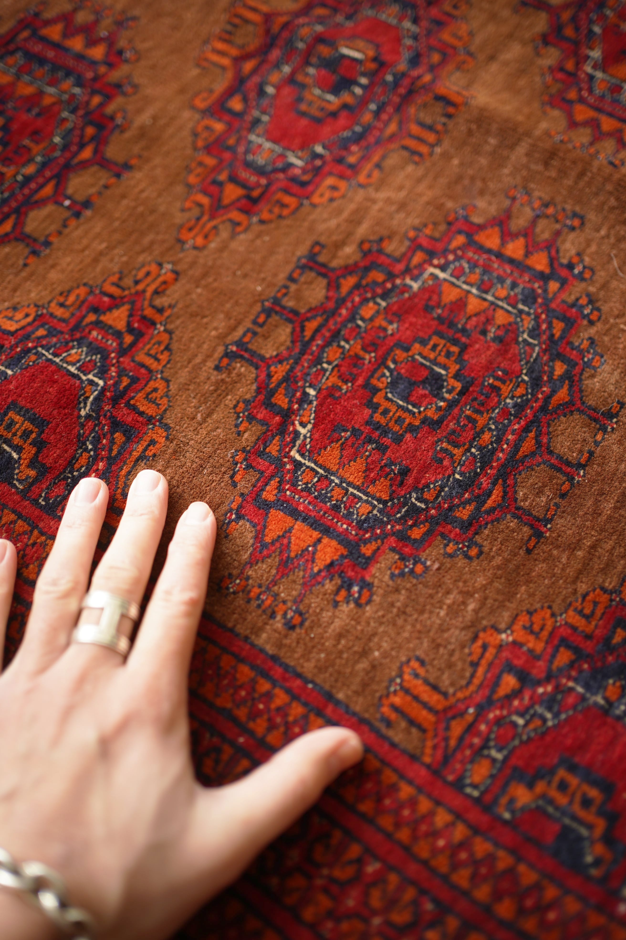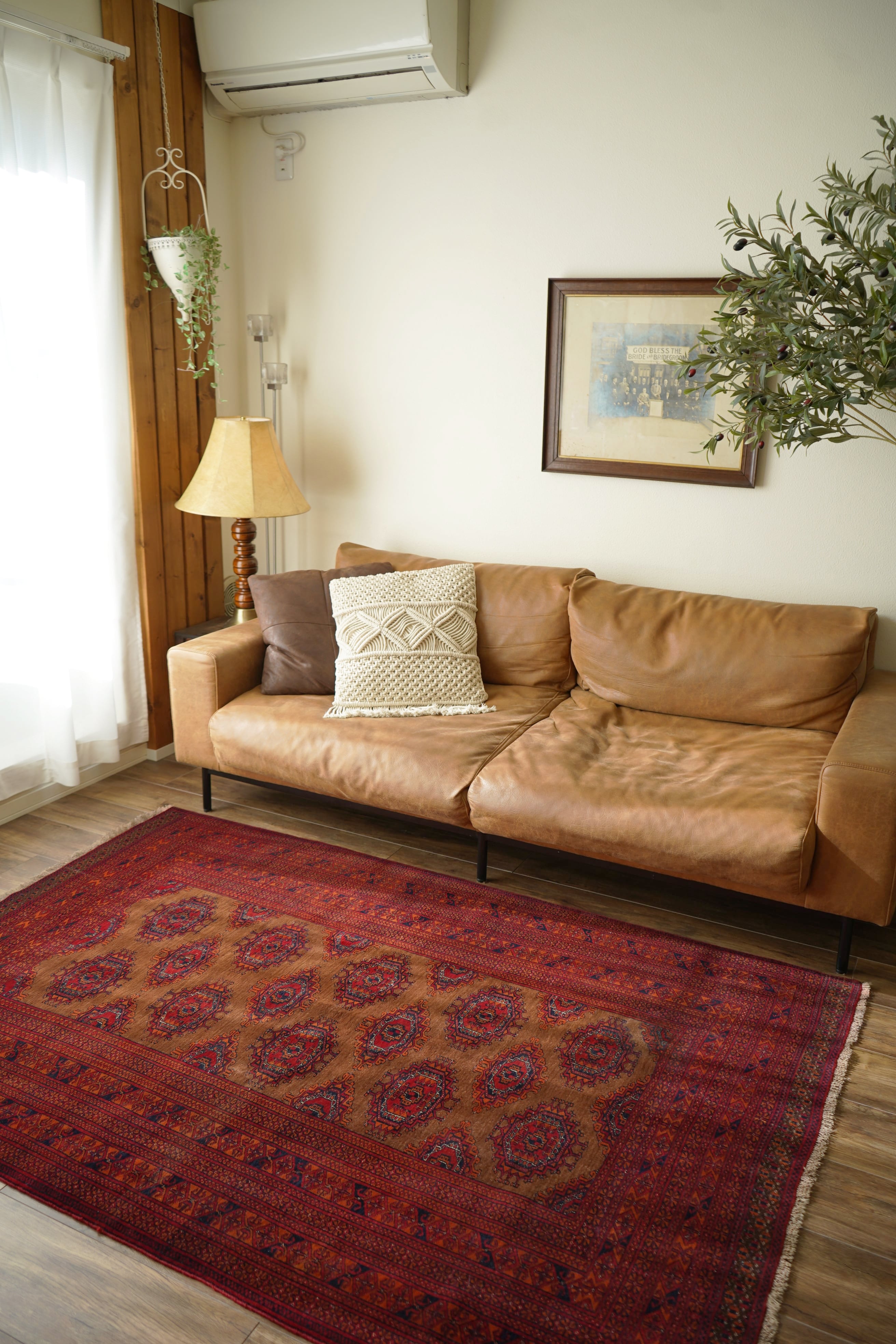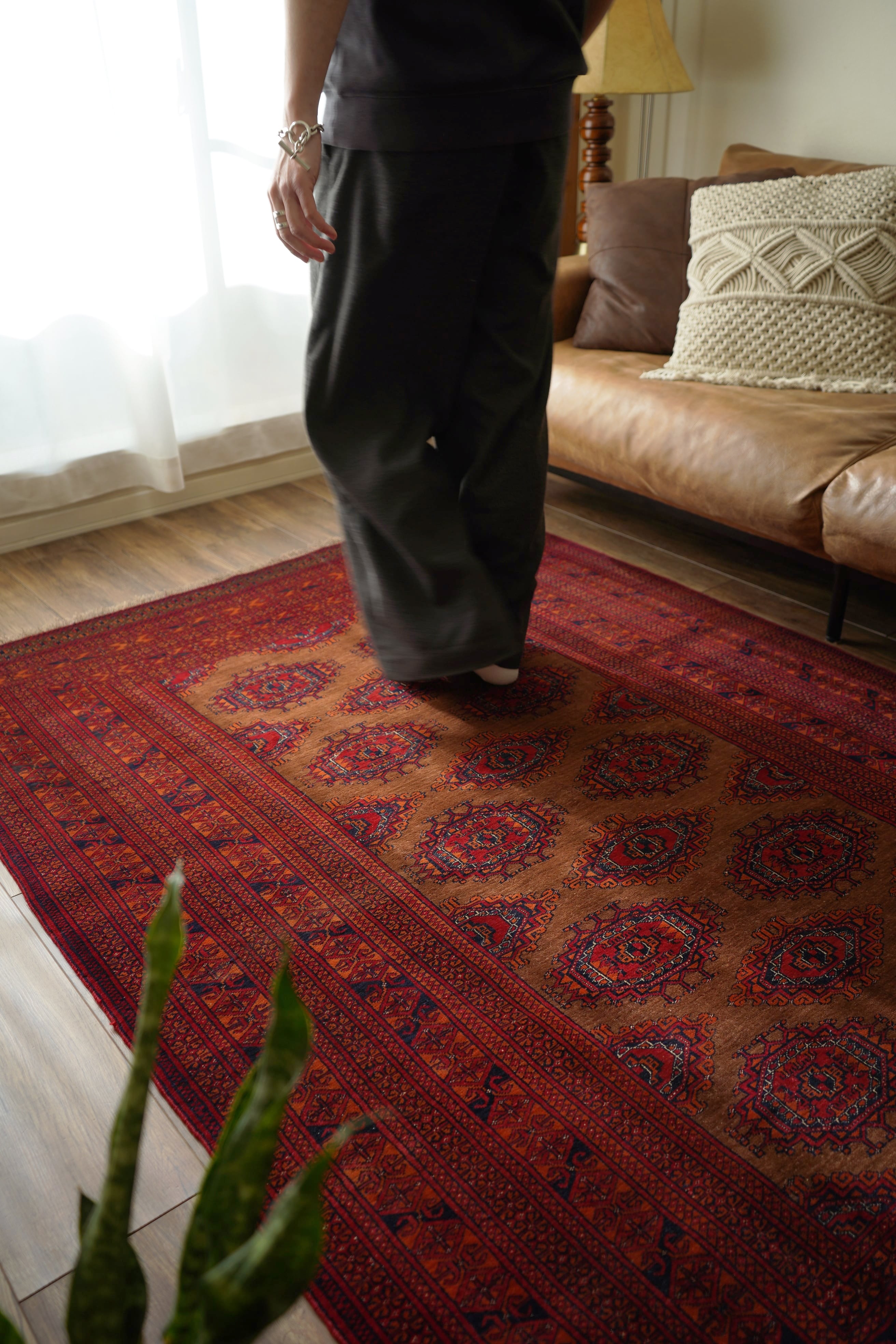 約50年ほど前にトルクメン族によって織られたヴィンテージラグ。フィールドにはサロール支族の家紋であるサロールギュル"という紋様が織り込まれています。トルクメンらしい赤が目を惹く色合いで、ブラウン 、オレンジ、ブラックなどがバランス良く使われた配色です。パイルは短めながら、美しく整ったフラットな毛並みで、表面はサラッとした軽やかな肌触りをしています。厚みは5mm程度。重量感もありズレる心配もほとんどないかと思います。ダメージも見受けられず、大変良好なコンディション。通年で気持ちよく敷いていただける質感かと思います。ダメージなども見受けれず、大変良好なコンディション。ダイニングテーブル下や書斎などにオススメです。