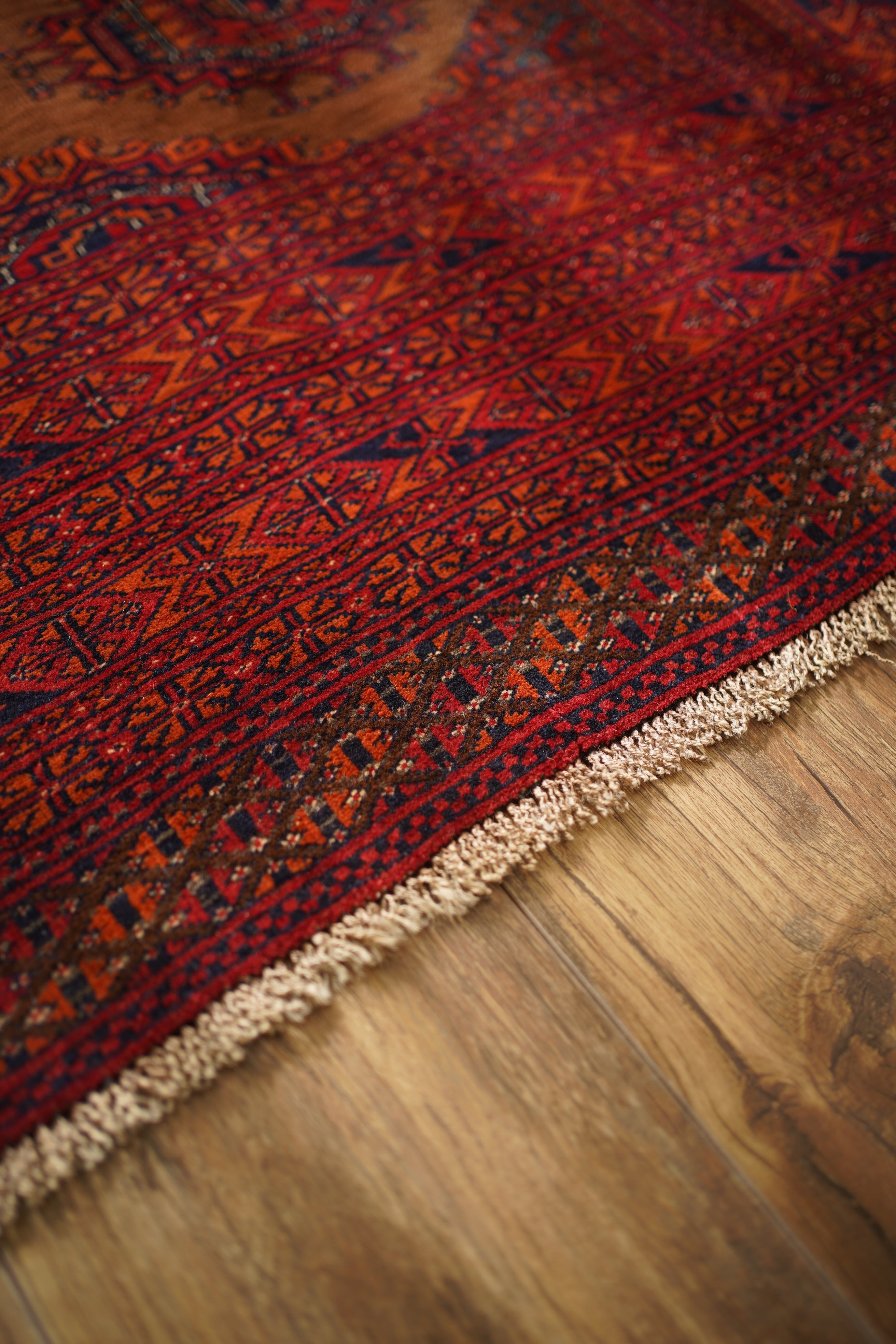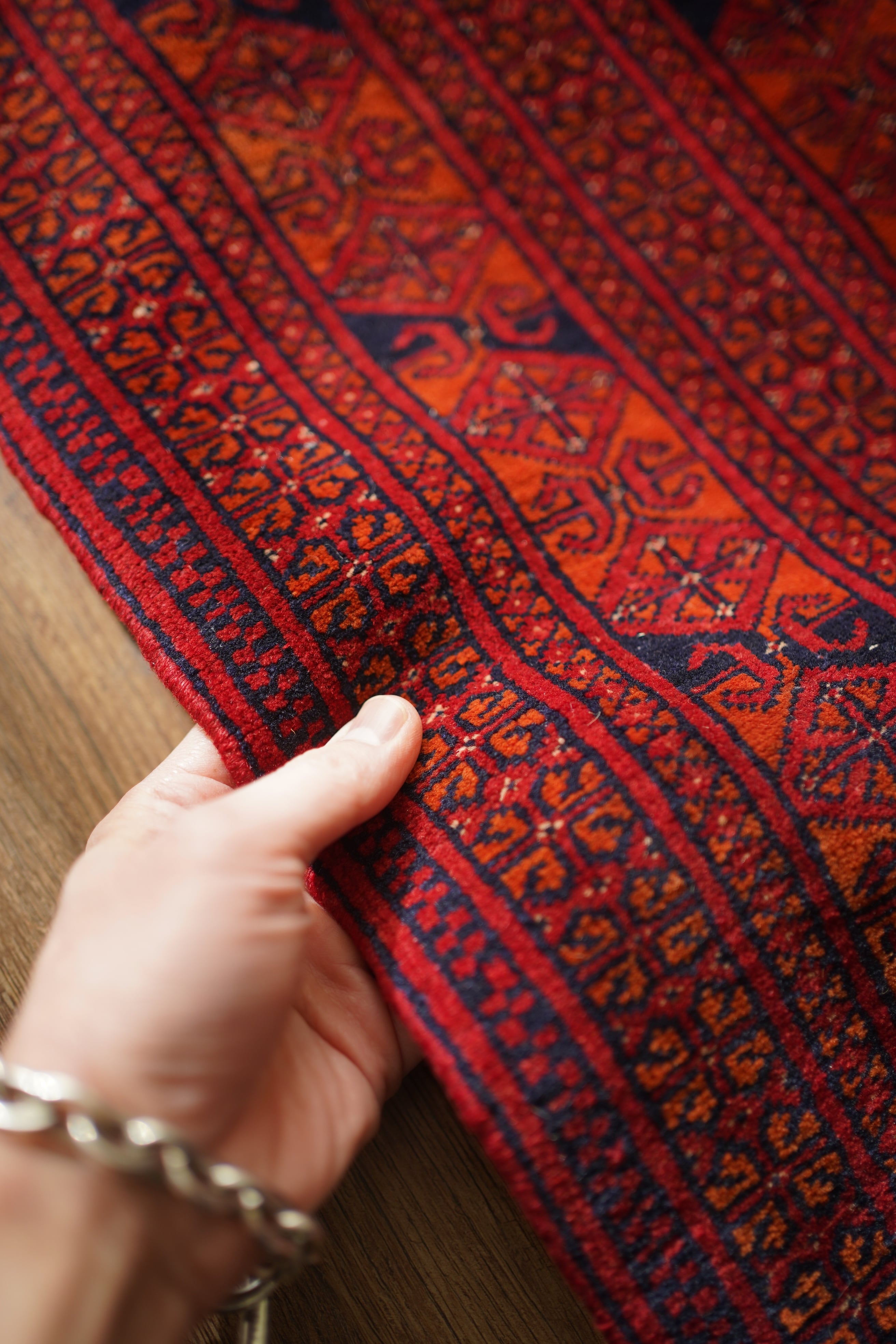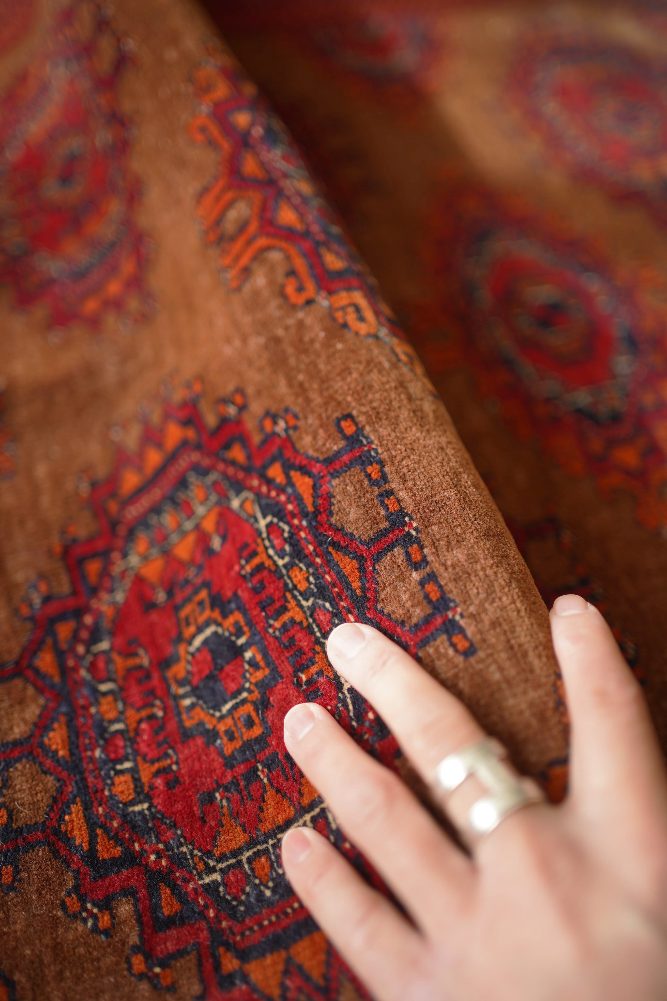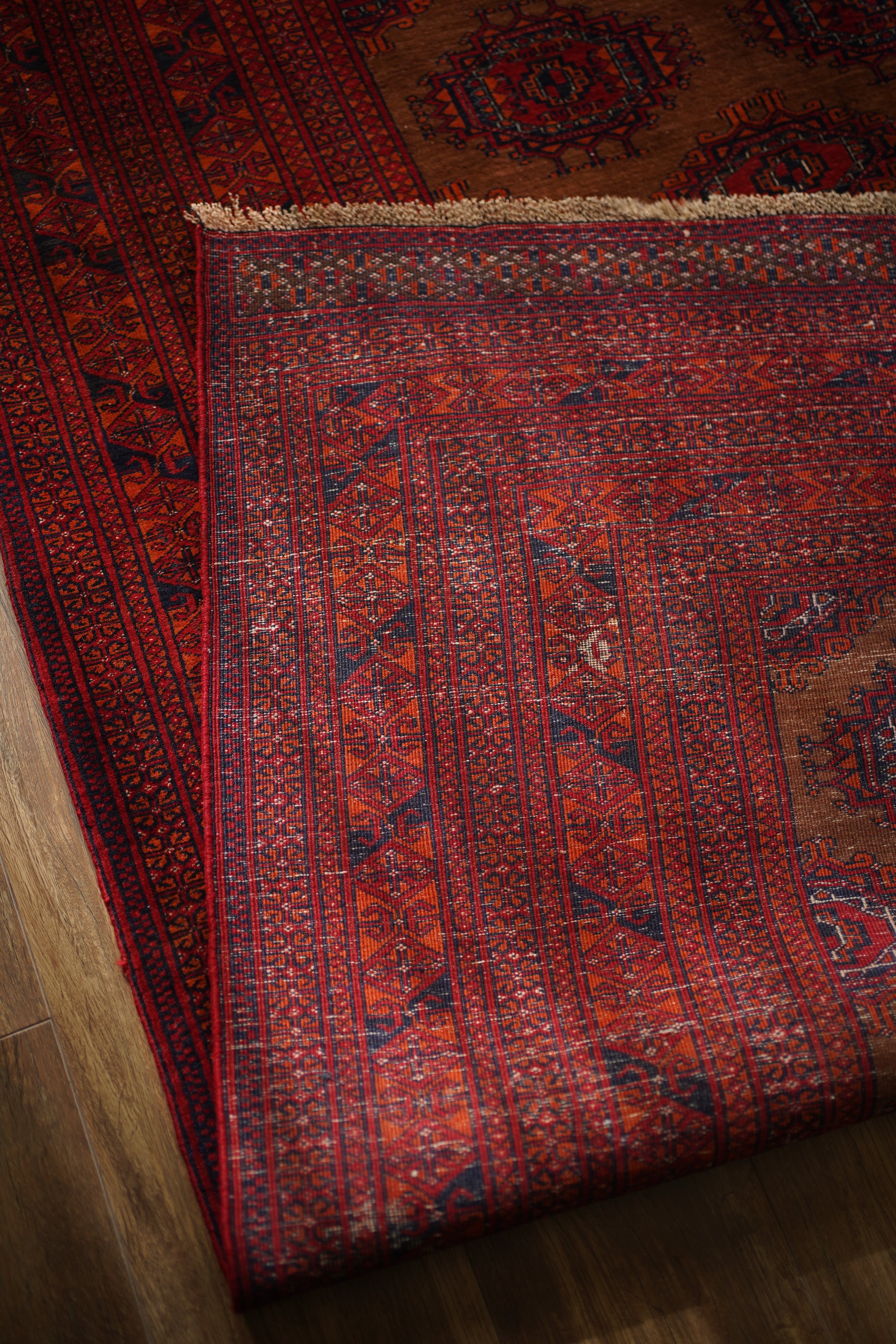 約50年ほど前にトルクメン族によって織られたヴィンテージラグ。フィールドにはサロール支族の家紋であるサロールギュル"という紋様が織り込まれています。トルクメンらしい赤が目を惹く色合いで、ブラウン 、オレンジ、ブラックなどがバランス良く使われた配色です。パイルは短めながら、美しく整ったフラットな毛並みで、表面はサラッとした軽やかな肌触りをしています。厚みは5mm程度。重量感もありズレる心配もほとんどないかと思います。ダメージも見受けられず、大変良好なコンディション。通年で気持ちよく敷いていただける質感かと思います。ダメージなども見受けれず、大変良好なコンディション。ダイニングテーブル下や書斎などにオススメです。