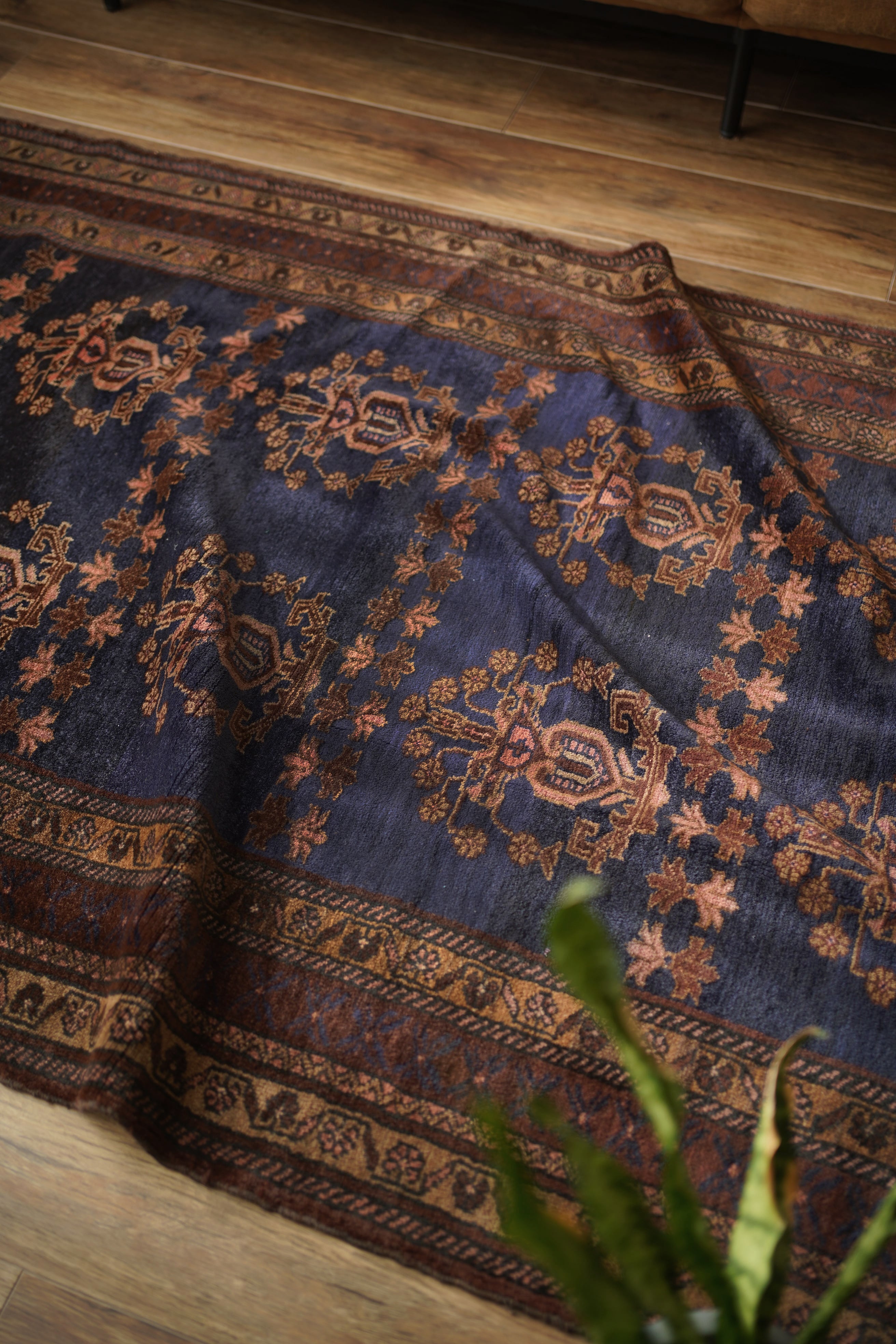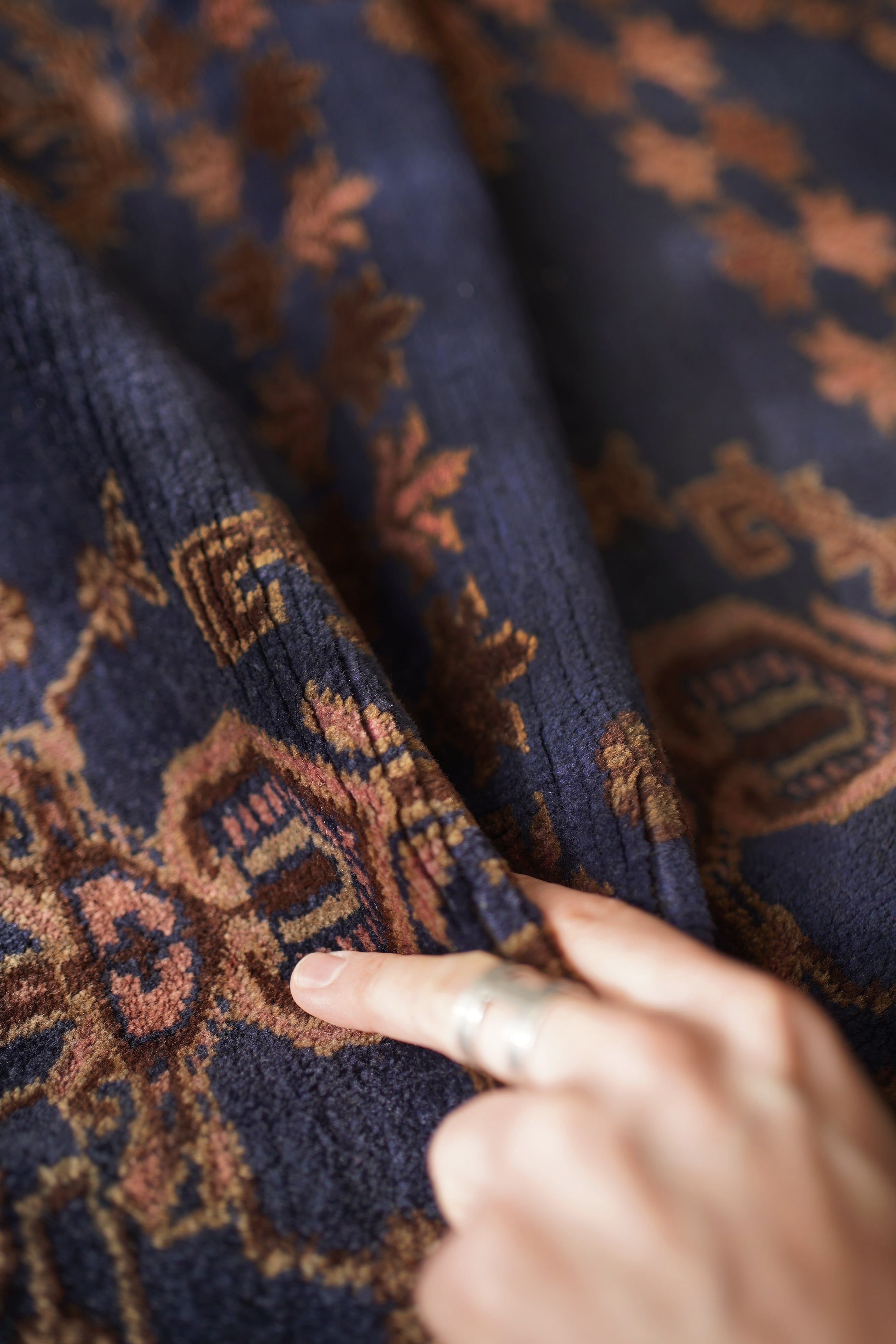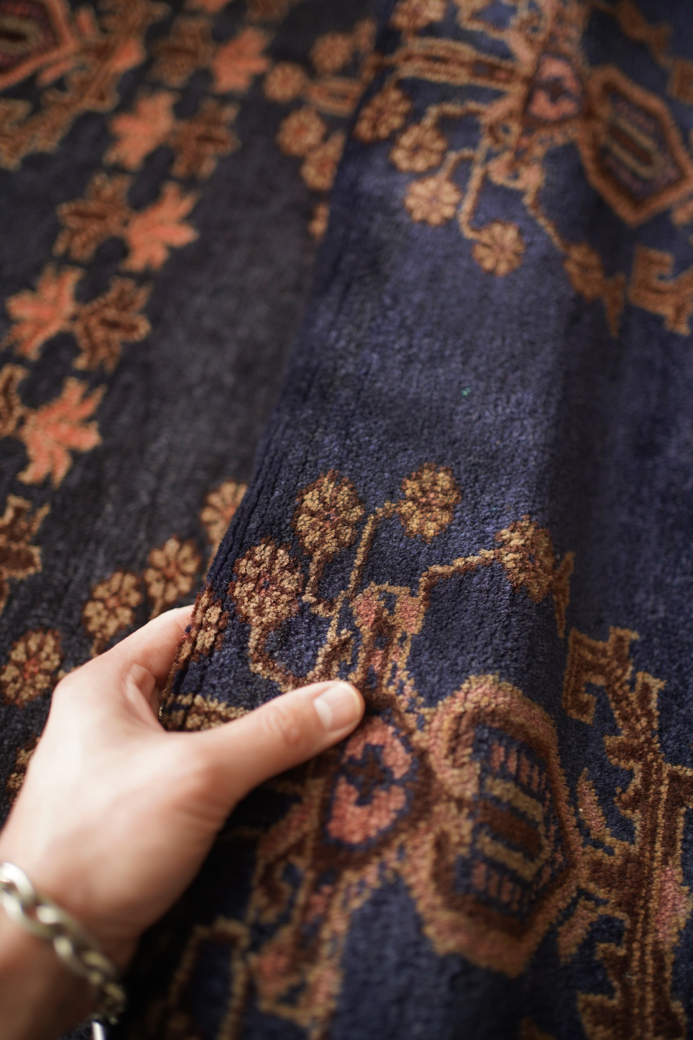 約50年前にアフガニスタン北西部・カラエナウで織られたバルーチラグ。濃紺からネイビーへとゆるやかに移ろう優しいグラデーションが美しく、奥行きのある色彩に思わず心を奪われた一枚です。パイル全体にはしっとりとした上品な艶が見受けられ、角度によって光を柔らかく返すため、ヴィンテージならではの深い味わいが感じられます。フィールドには花瓶に生けられた花のモチーフが規則的に並び、トライバルらしい素朴さと上品さがほどよく調和したデザインに仕上がっています。光の当たり方によって表情が豊かに変化し、陰影が生み出す濃淡の美しさを楽しんでいただけるのも、このラグならではの魅力です。厚みは約6mm。パイルは短めながらソフトウールを使用しており、ふわっと滑らかで心地よい肌触り。目立ったダメージも見受けられず、良好なコンディションです。ベッドサイドや書斎、静かに過ごすスペースなどにそっと敷いていただくだけで、空間に落ち着いた彩りと温もりを添えてくれると思います。