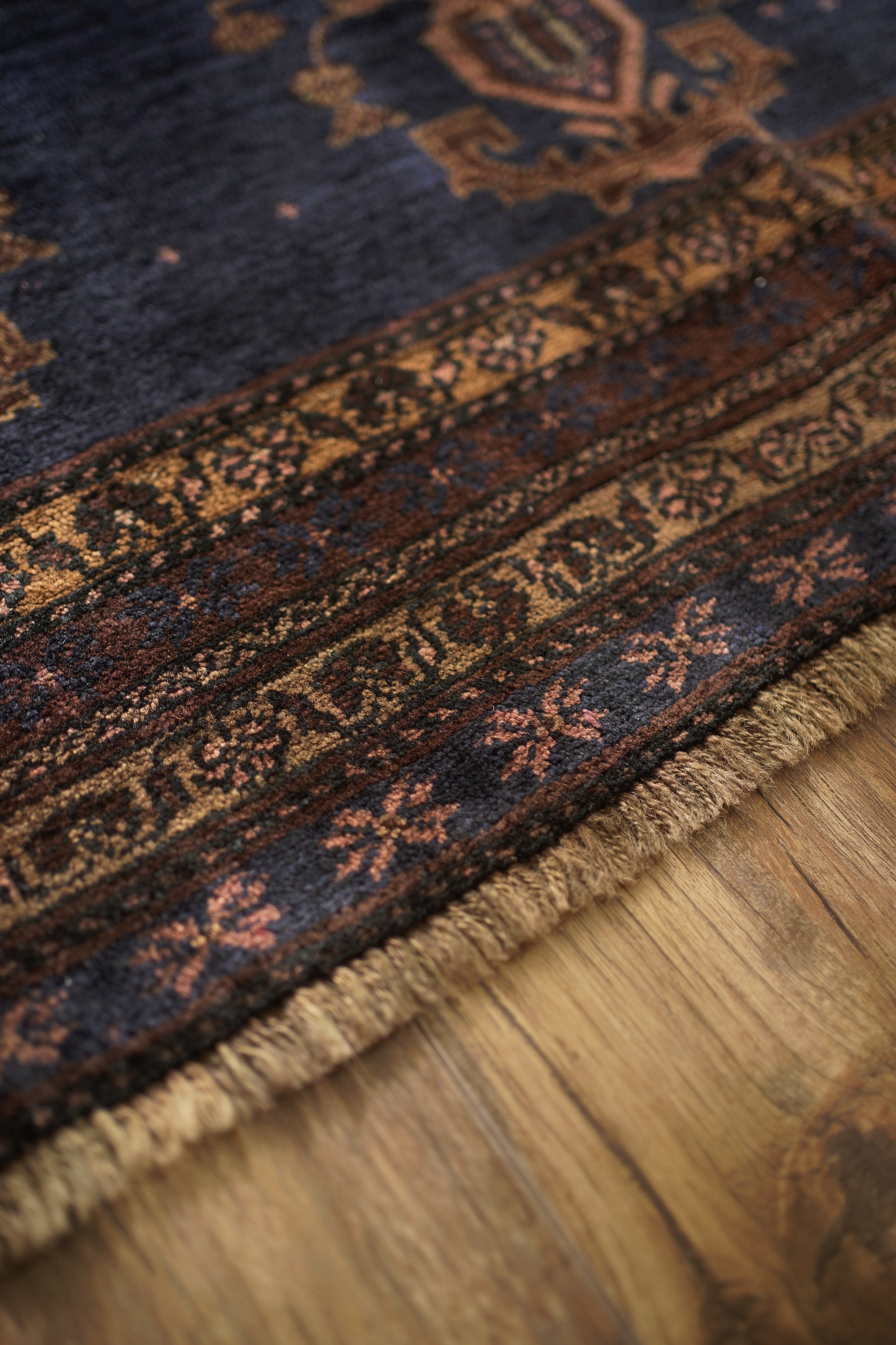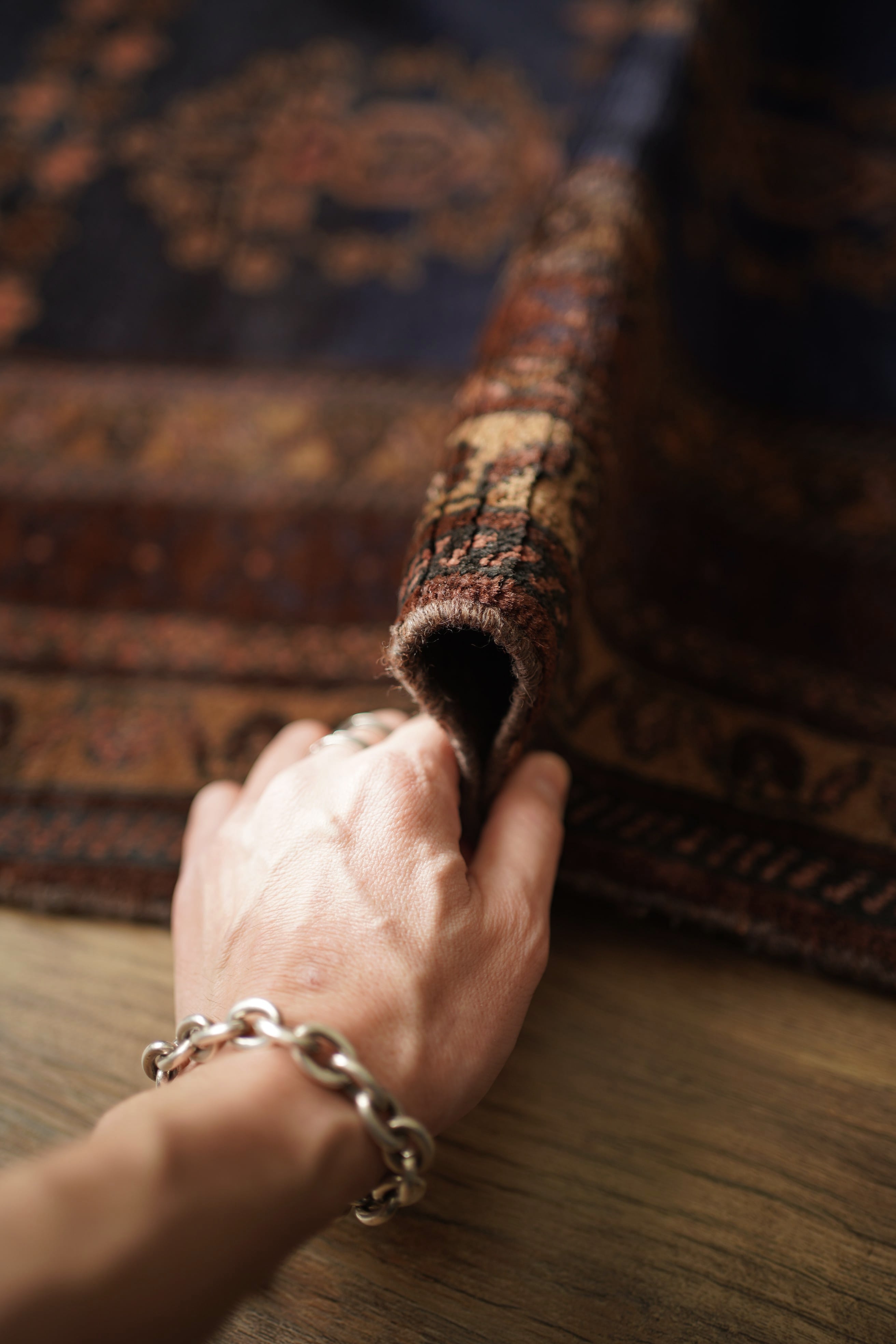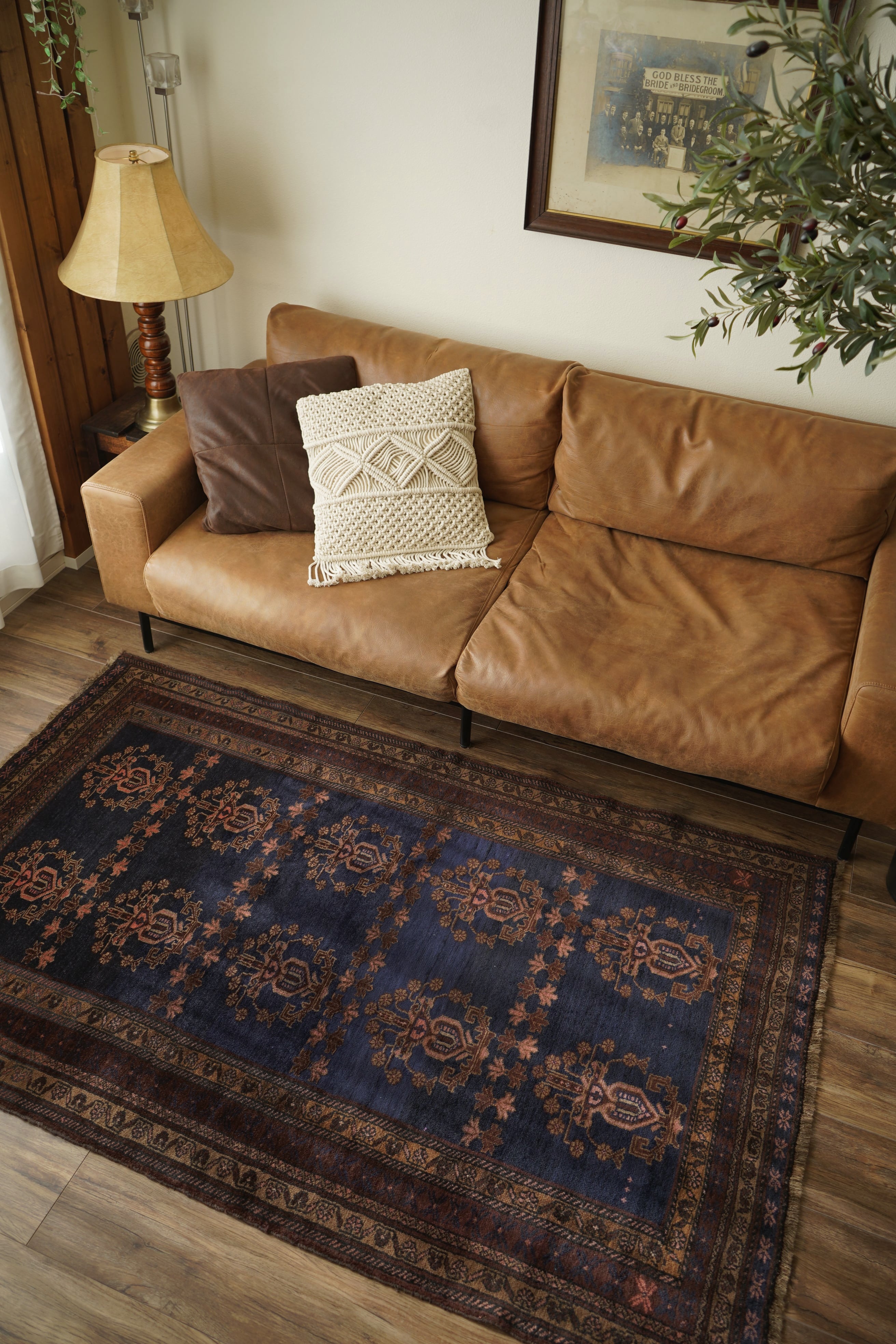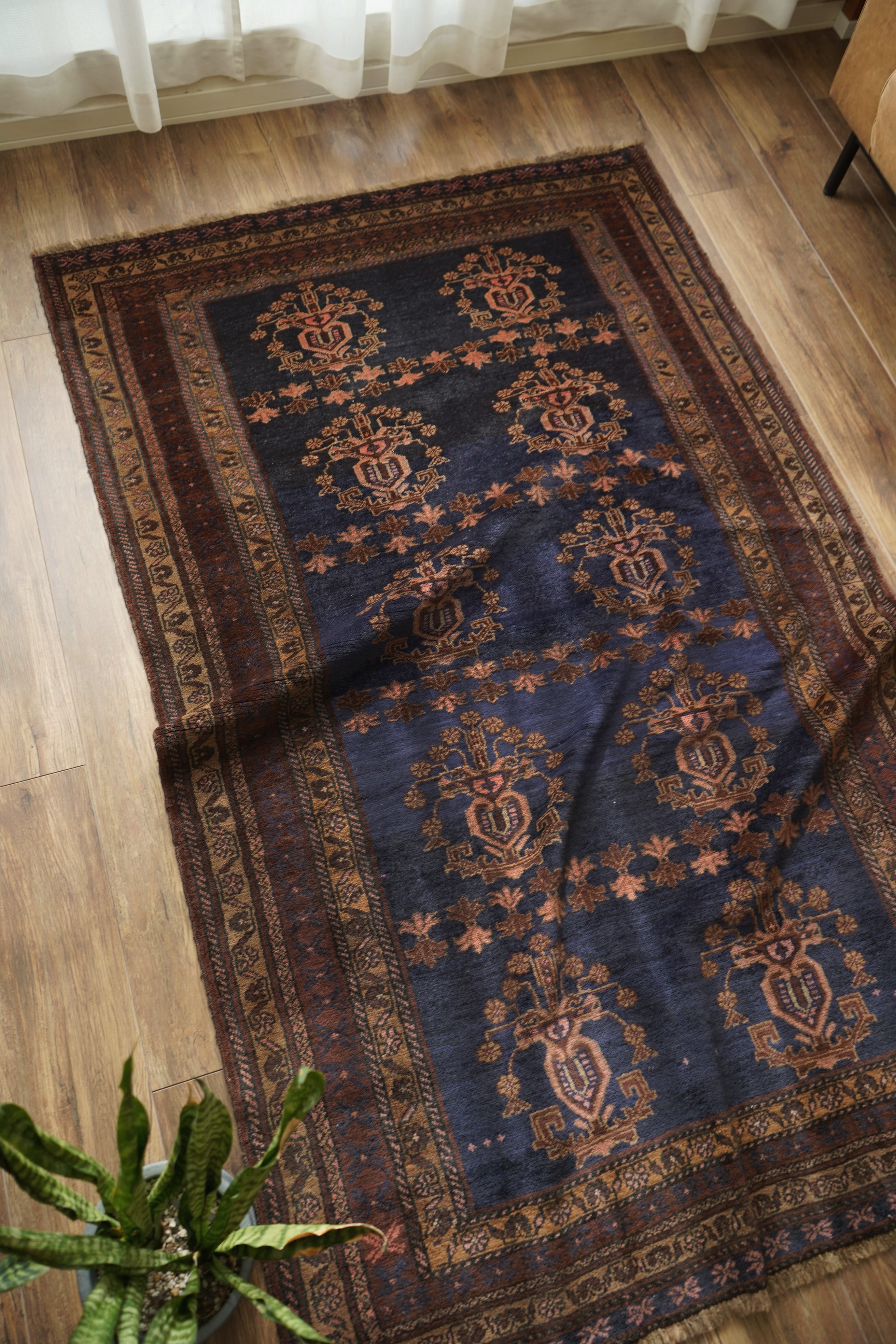 約50年前にアフガニスタン北西部・カラエナウで織られたバルーチラグ。濃紺からネイビーへとゆるやかに移ろう優しいグラデーションが美しく、奥行きのある色彩に思わず心を奪われた一枚です。パイル全体にはしっとりとした上品な艶が見受けられ、角度によって光を柔らかく返すため、ヴィンテージならではの深い味わいが感じられます。フィールドには花瓶に生けられた花のモチーフが規則的に並び、トライバルらしい素朴さと上品さがほどよく調和したデザインに仕上がっています。光の当たり方によって表情が豊かに変化し、陰影が生み出す濃淡の美しさを楽しんでいただけるのも、このラグならではの魅力です。厚みは約6mm。パイルは短めながらソフトウールを使用しており、ふわっと滑らかで心地よい肌触り。目立ったダメージも見受けられず、良好なコンディションです。ベッドサイドや書斎、静かに過ごすスペースなどにそっと敷いていただくだけで、空間に落ち着いた彩りと温もりを添えてくれると思います。