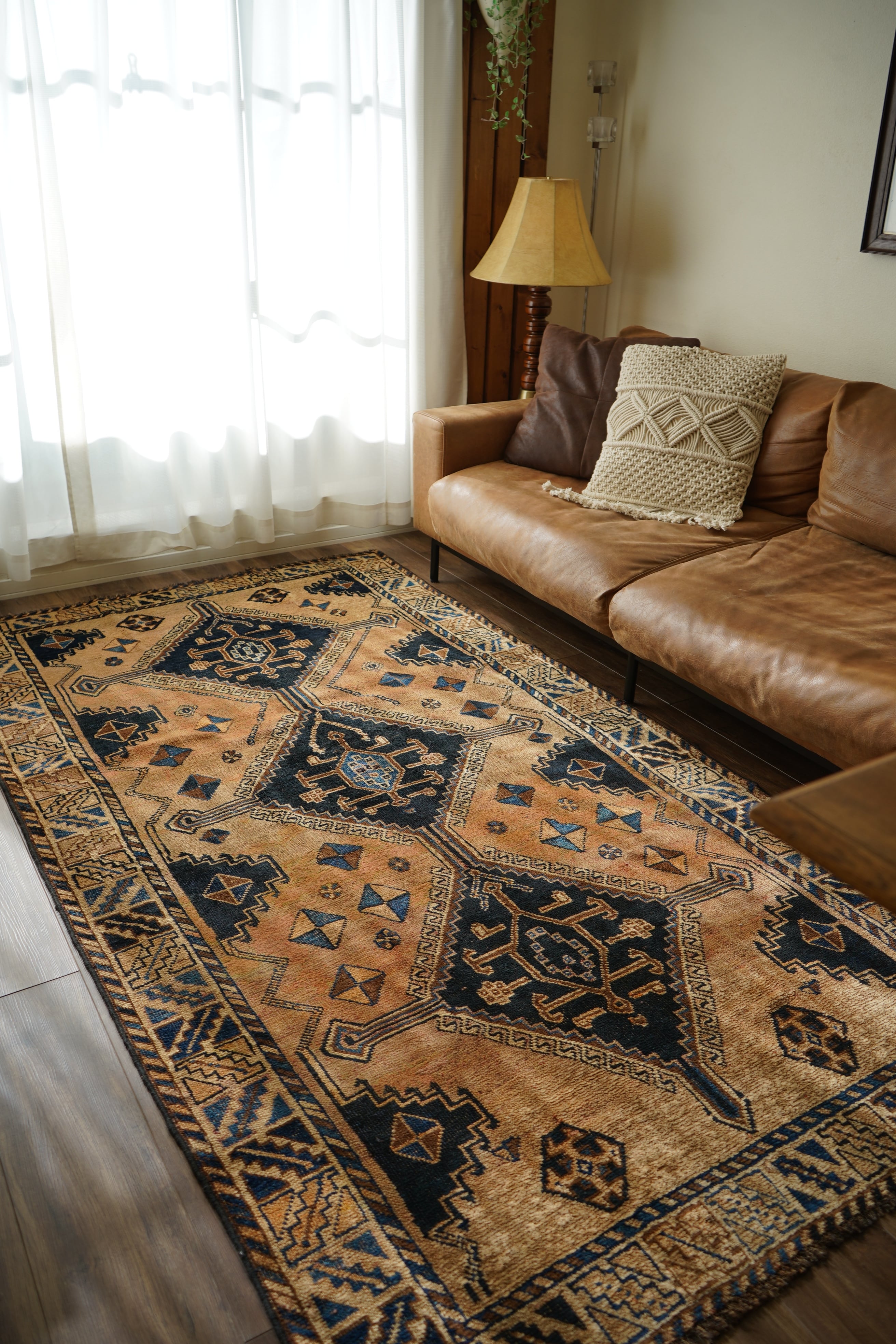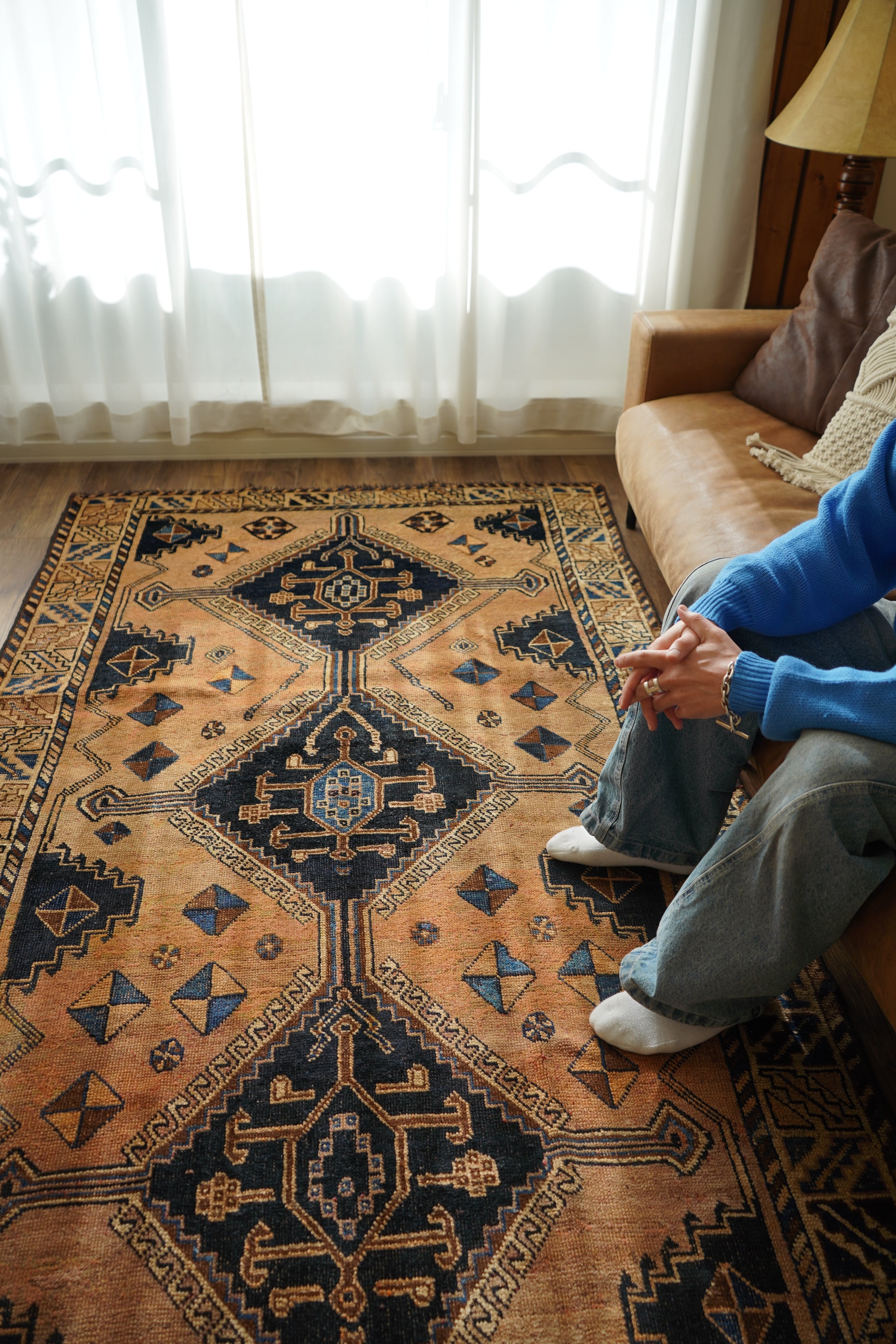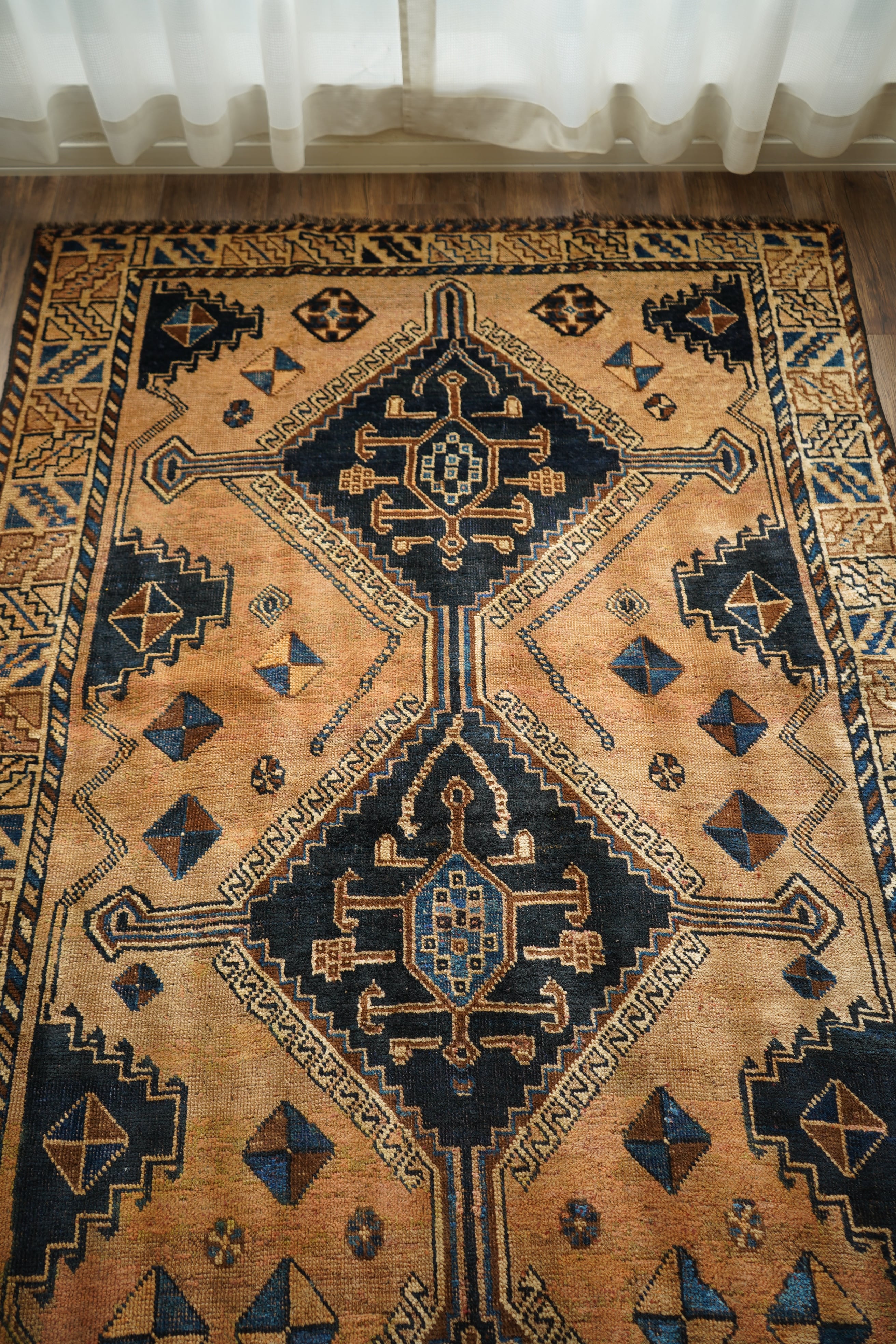 およそ60年前、イラン南西部に居住するカシュガイ族によって手織りされたヴィンテージラグです。肌色を思わせる柔らかなベージュをベースに、濃紺の三連メダリオンが力強く浮かび上がる印象的な一枚。メダリオンのまわりには菱形モチーフがリズミカルに配され、伝統的な部族美と遊び心が心地よく調和したデザインとなっています。パイルは全体的にすり減っており、薄いところも多かったり、ところどころリペアされている部分も見受けられますが、全体に自然に馴染んでおり、ヴィンテージらしい深みや味わいとしてお楽しみいただけます。表面はサラッとしつつも、ほんのりパイルの柔らかさを感じる肌触り。厚みは5mmほど。経年による落ち着いた色合いが家具にもよく馴染み、ダイニングテーブル下や書斎などの落ち着いた空間におすすめです。