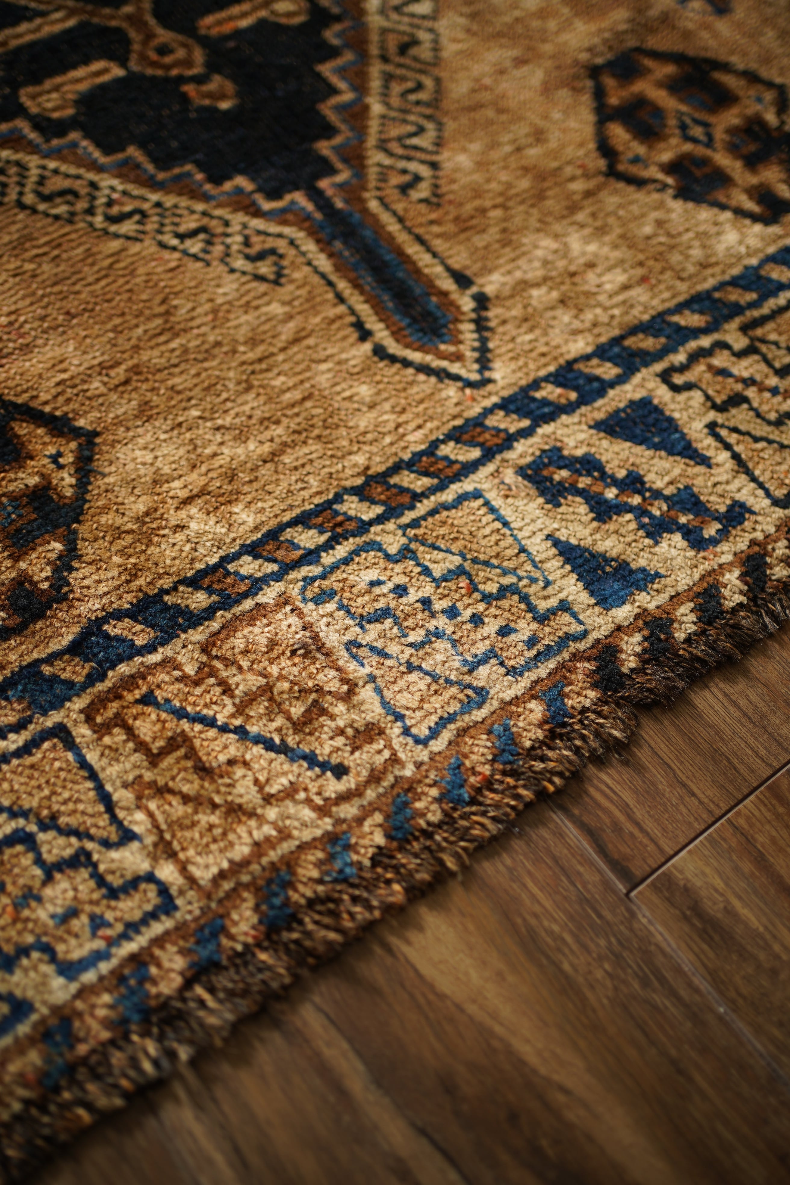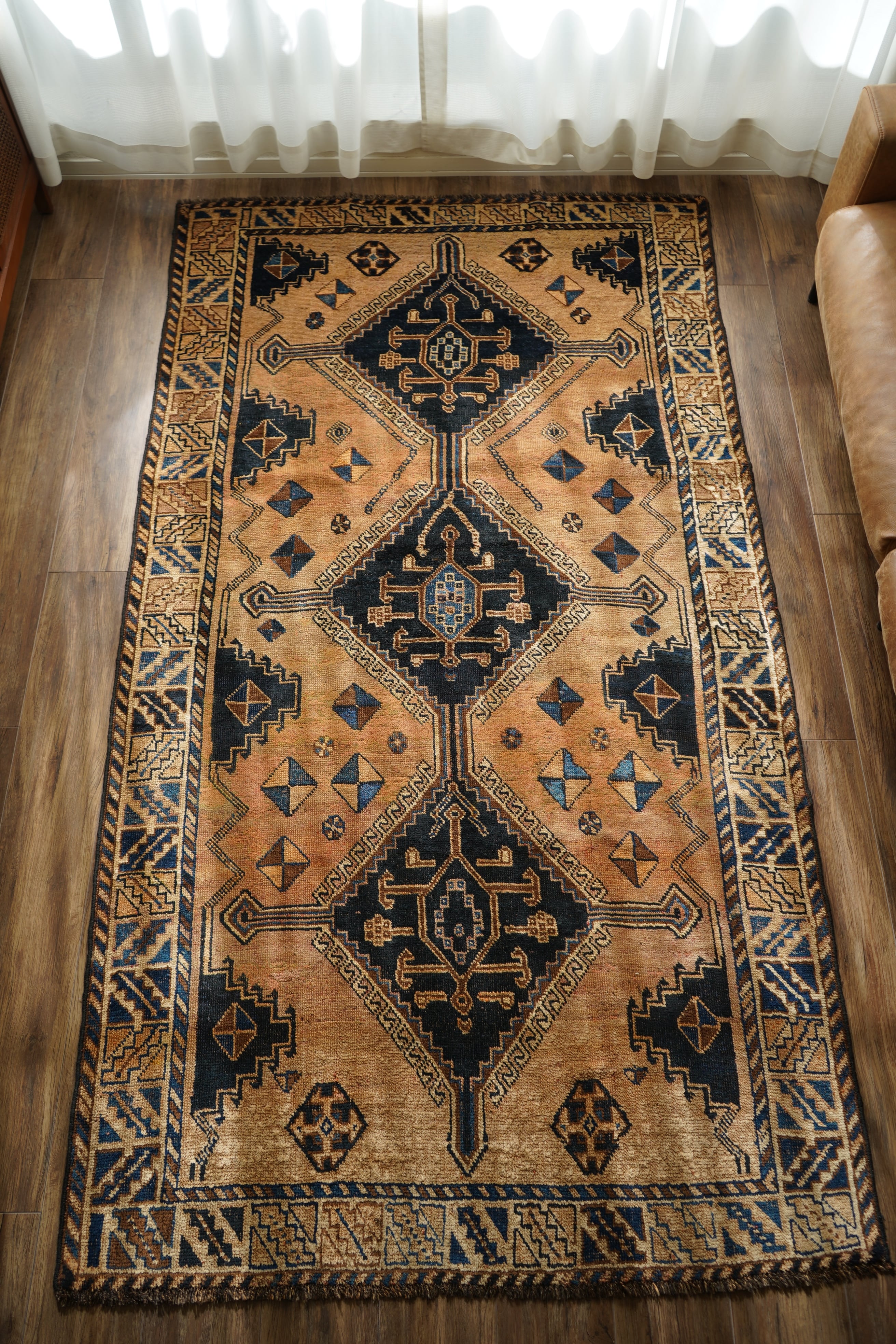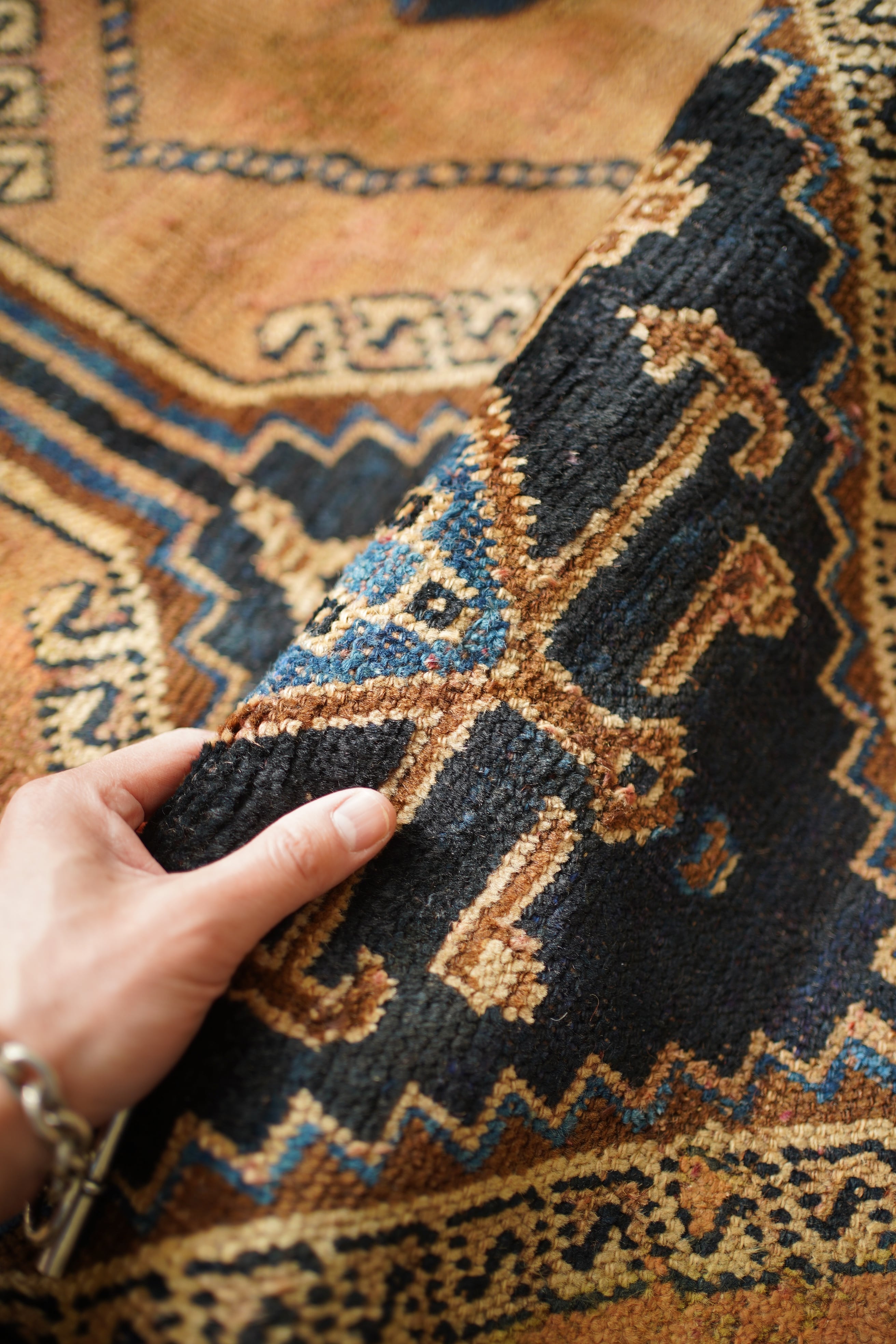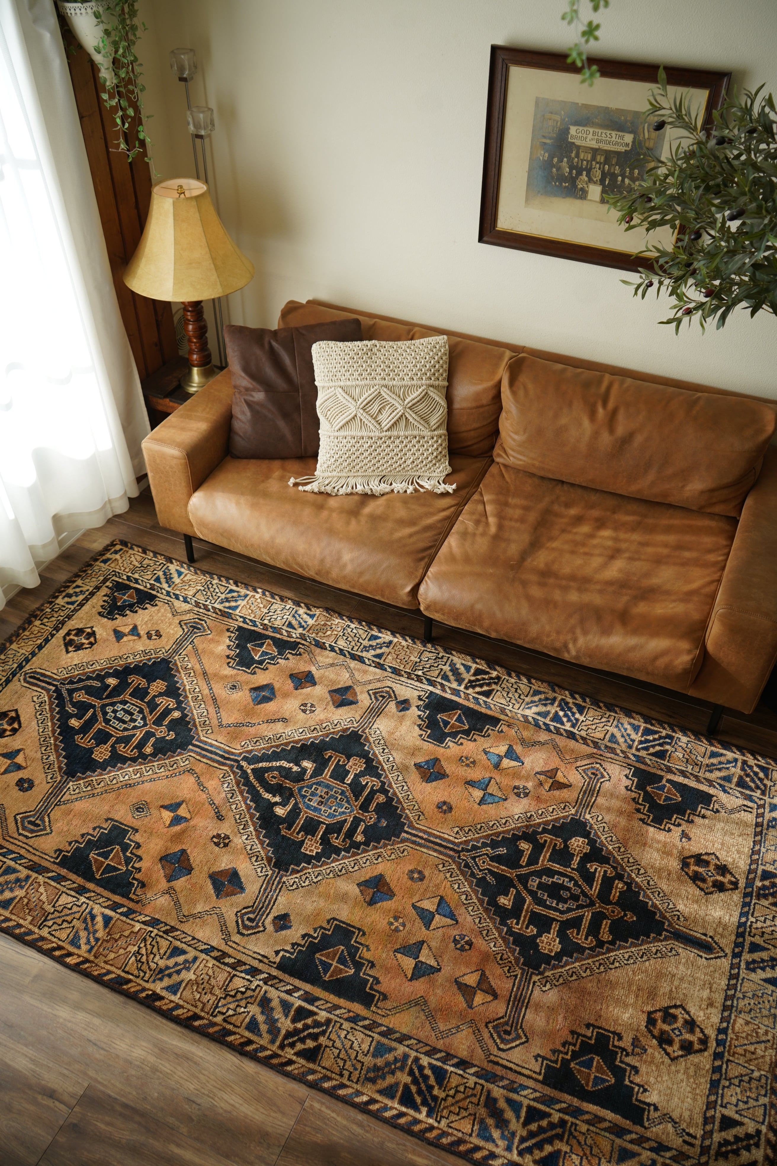 およそ60年前、イラン南西部に居住するカシュガイ族によって手織りされたヴィンテージラグです。肌色を思わせる柔らかなベージュをベースに、濃紺の三連メダリオンが力強く浮かび上がる印象的な一枚。メダリオンのまわりには菱形モチーフがリズミカルに配され、伝統的な部族美と遊び心が心地よく調和したデザインとなっています。パイルは全体的にすり減っており、薄いところも多かったり、ところどころリペアされている部分も見受けられますが、全体に自然に馴染んでおり、ヴィンテージらしい深みや味わいとしてお楽しみいただけます。表面はサラッとしつつも、ほんのりパイルの柔らかさを感じる肌触り。厚みは5mmほど。経年による落ち着いた色合いが家具にもよく馴染み、ダイニングテーブル下や書斎などの落ち着いた空間におすすめです。