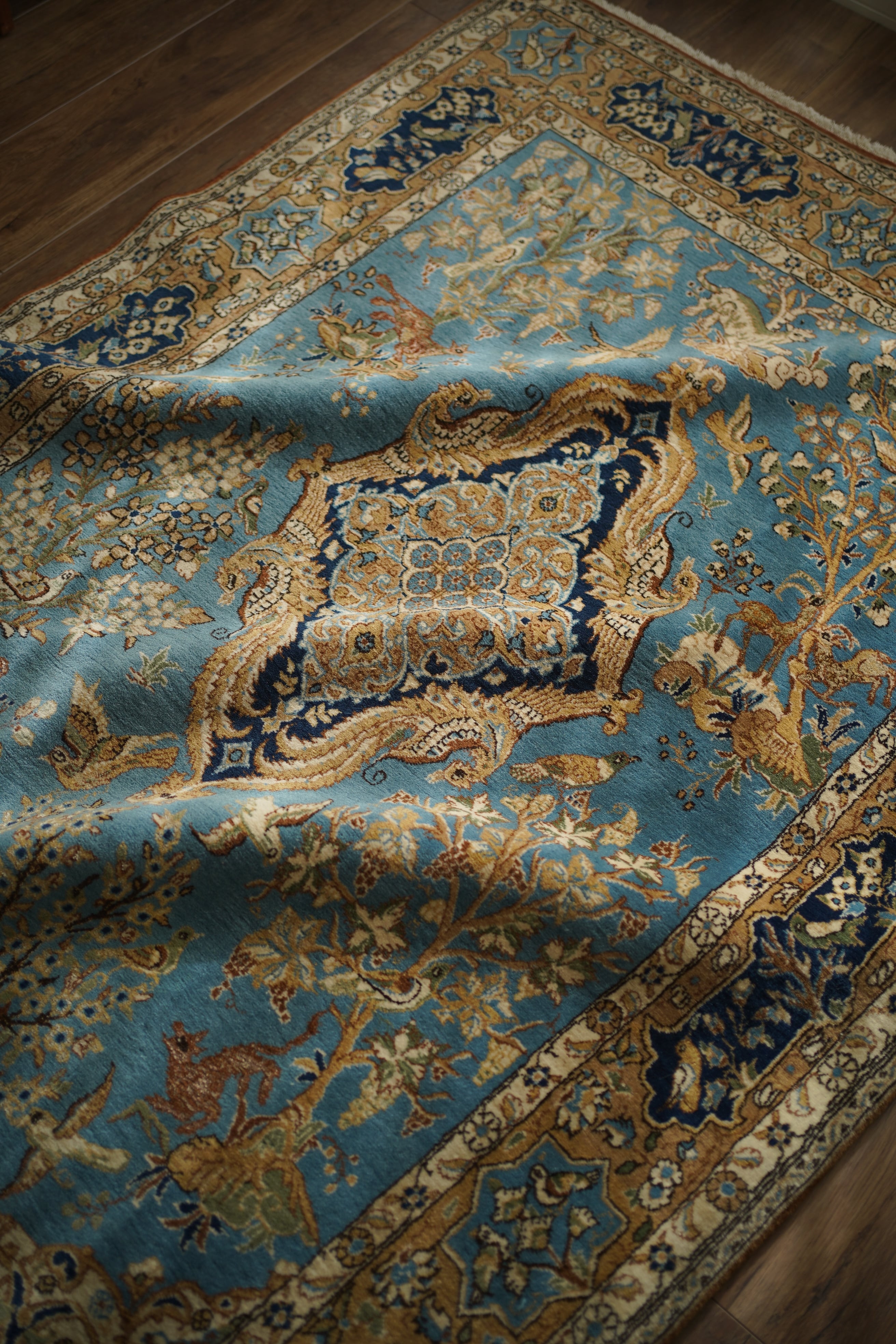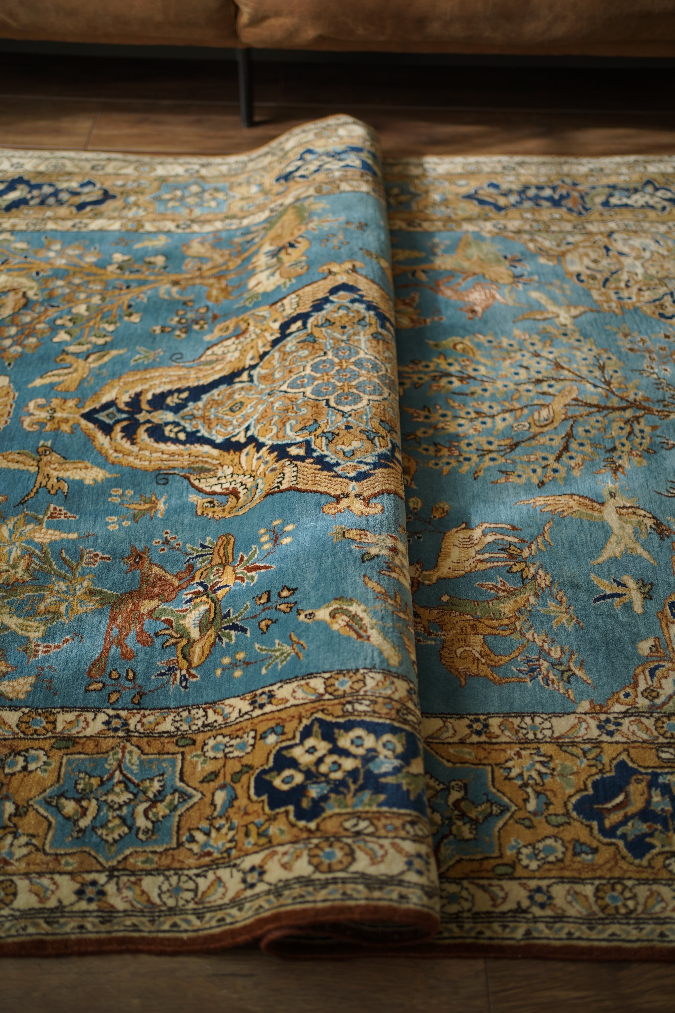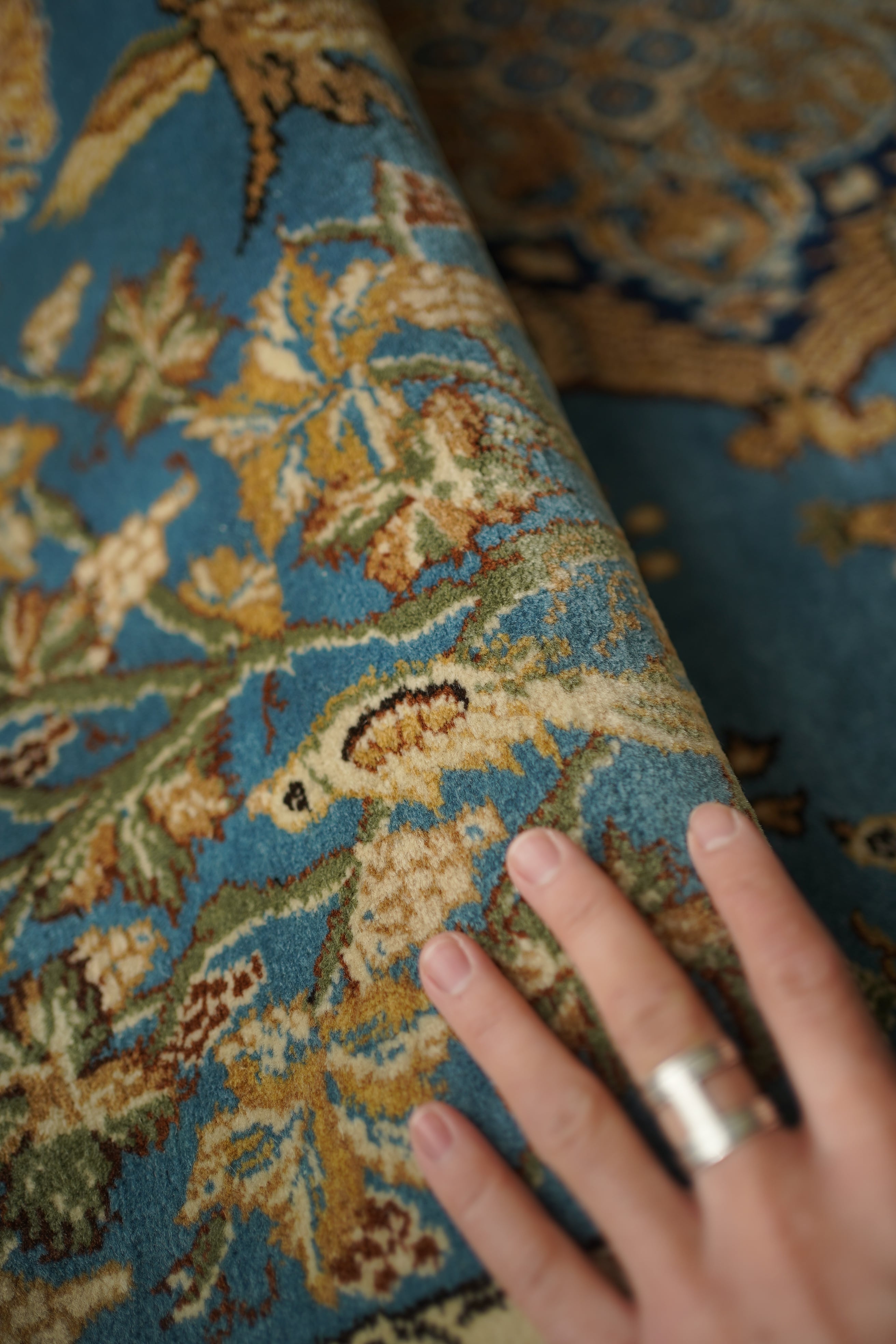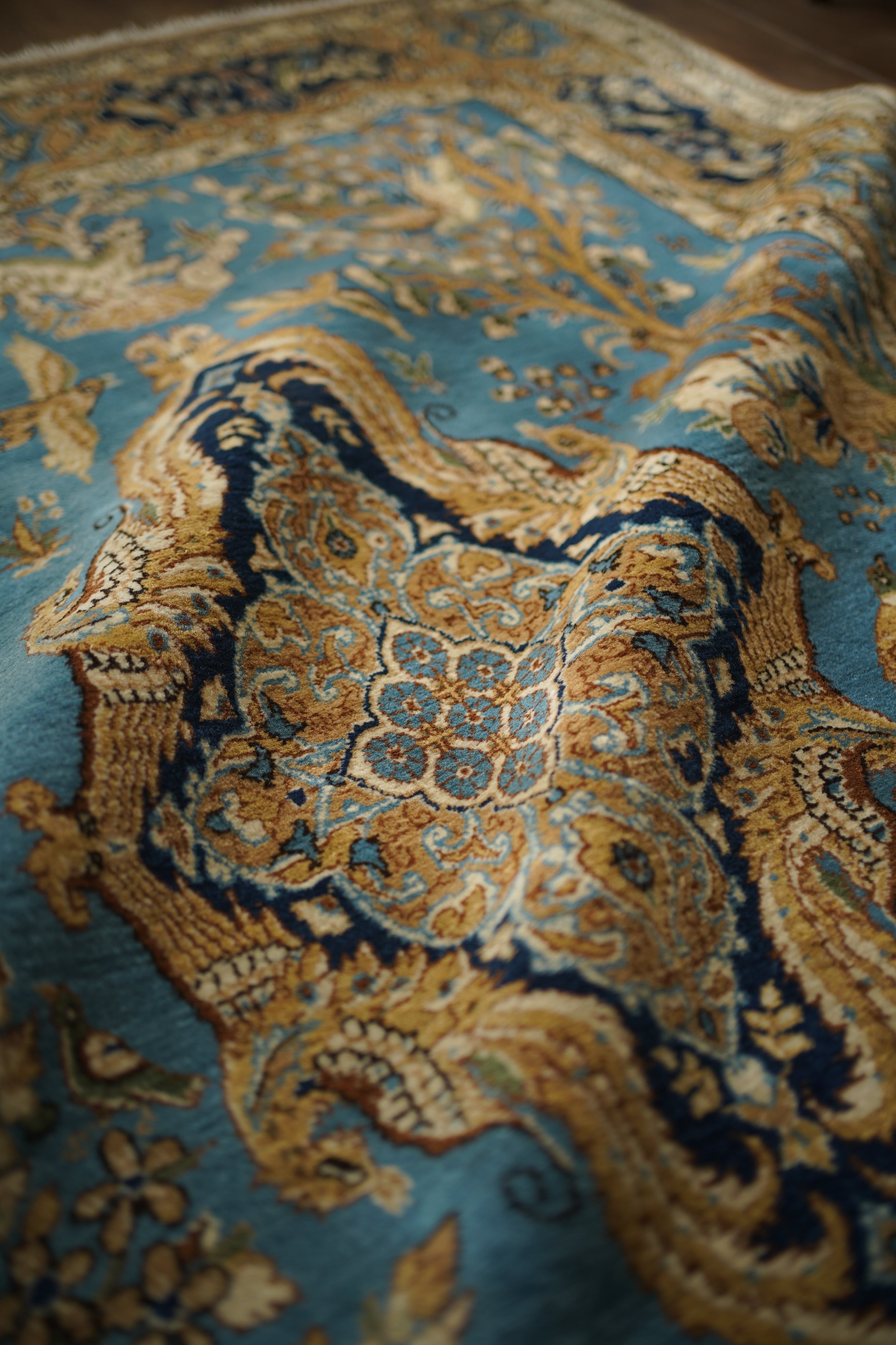 クム産ならではのきめ細かい織りと優美な意匠が際立つ一枚で、優しいターコイズブルーを主役に、ベージュ、クリーム、ブラウン、濃紺が調和する上品で洗練された配色が魅力です。