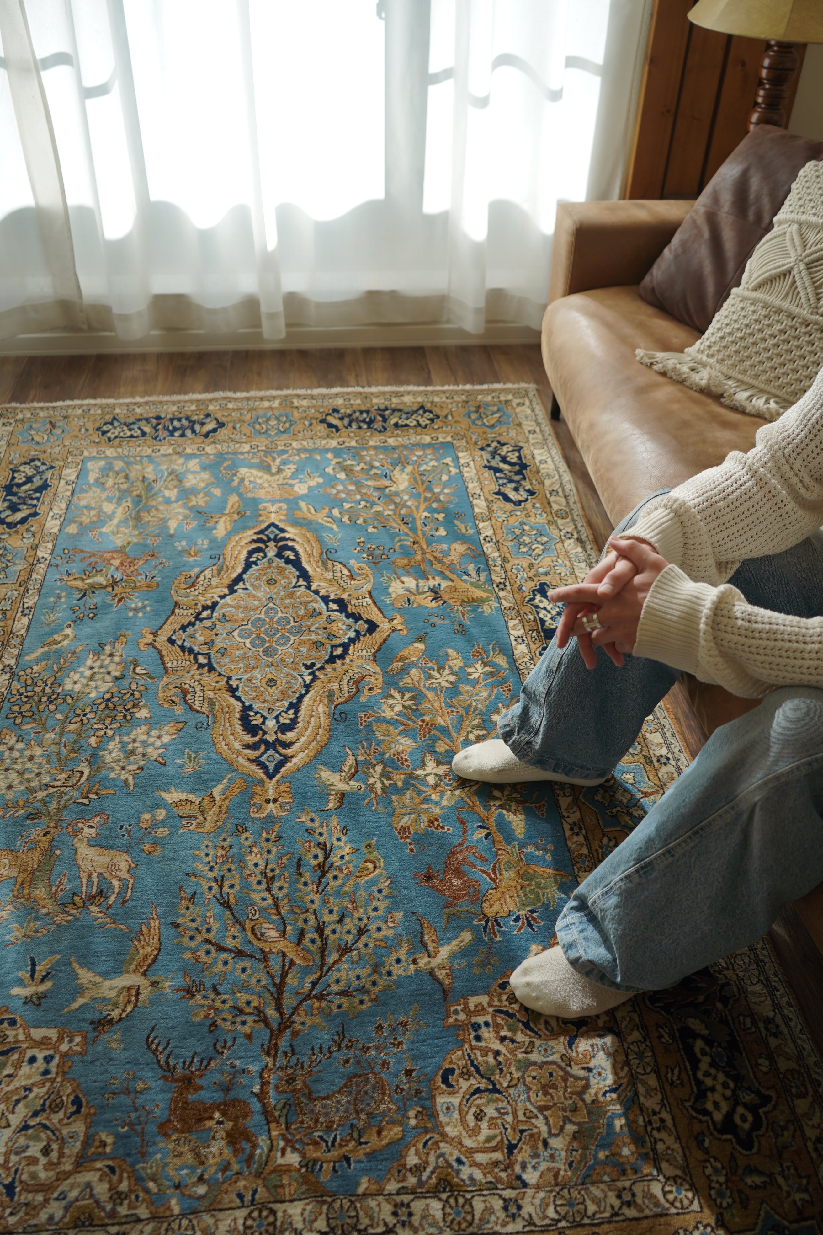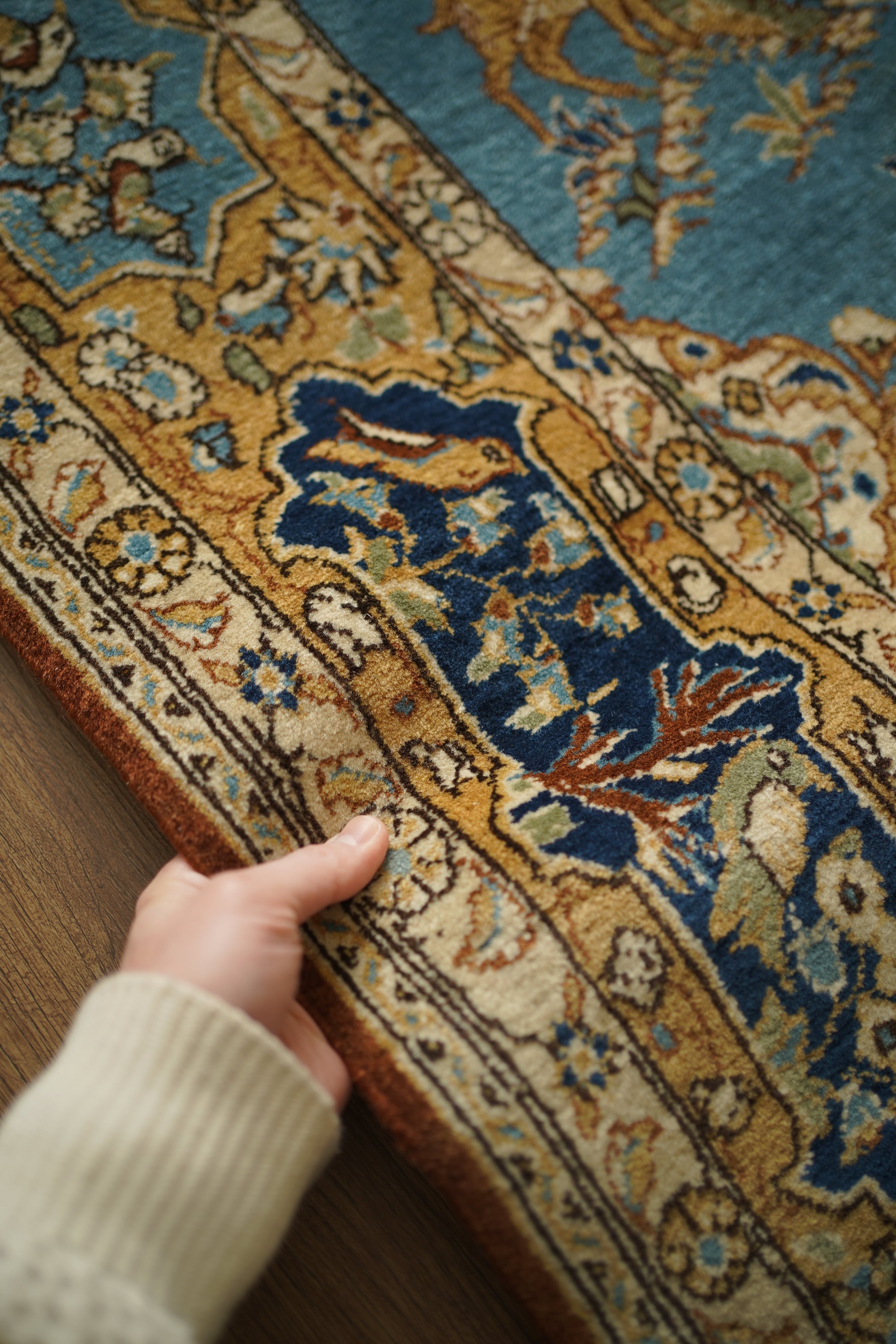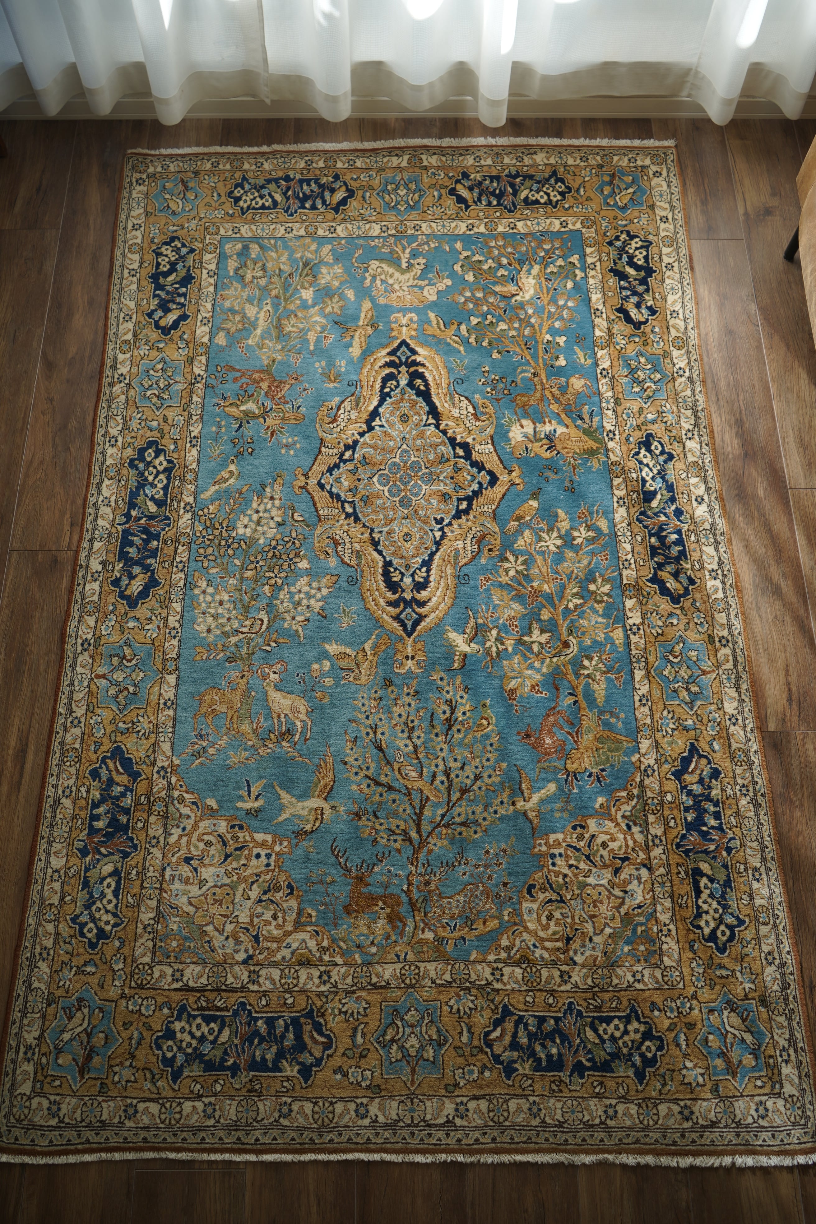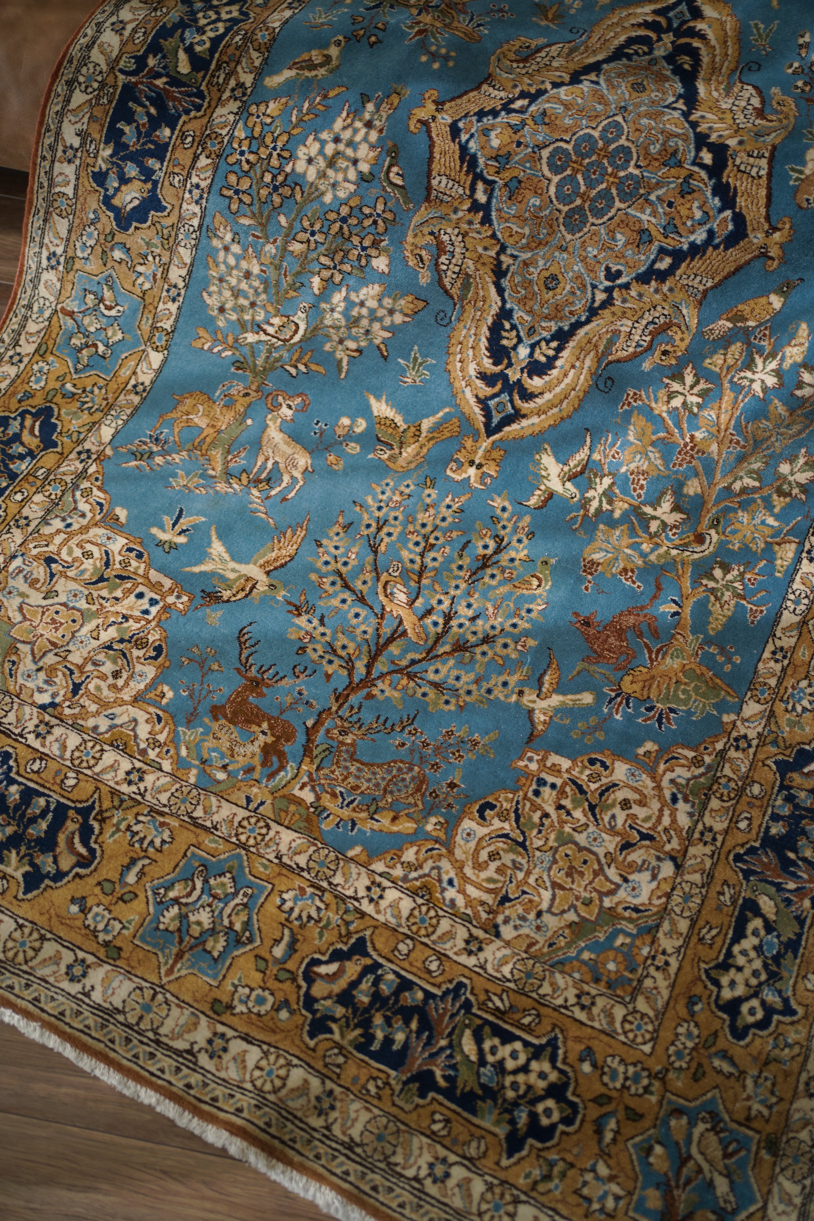 クム産ならではのきめ細かい織りと優美な意匠が際立つ一枚で、優しいターコイズブルーを主役に、ベージュ、クリーム、ブラウン、濃紺が調和する上品で洗練された配色が魅力です。