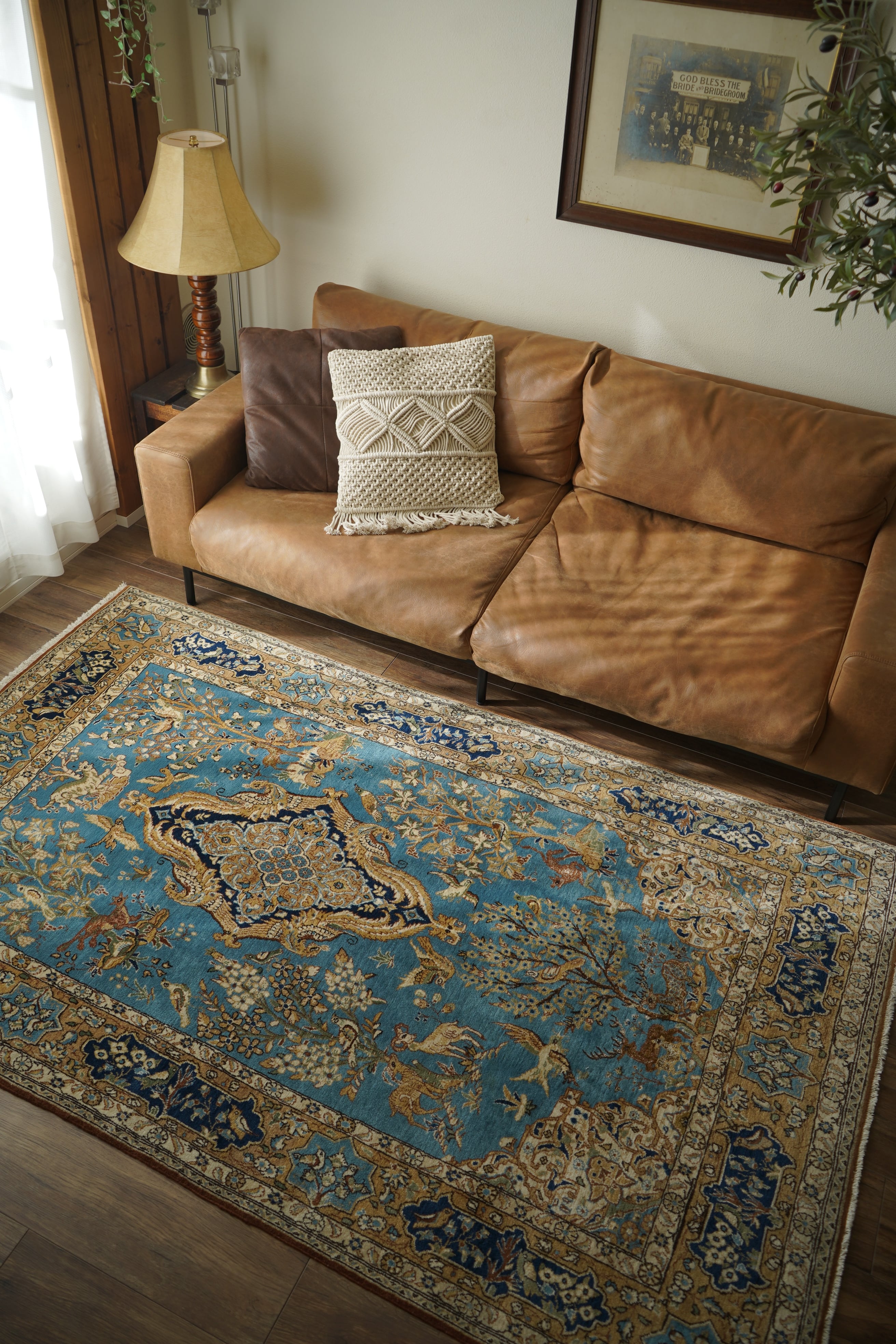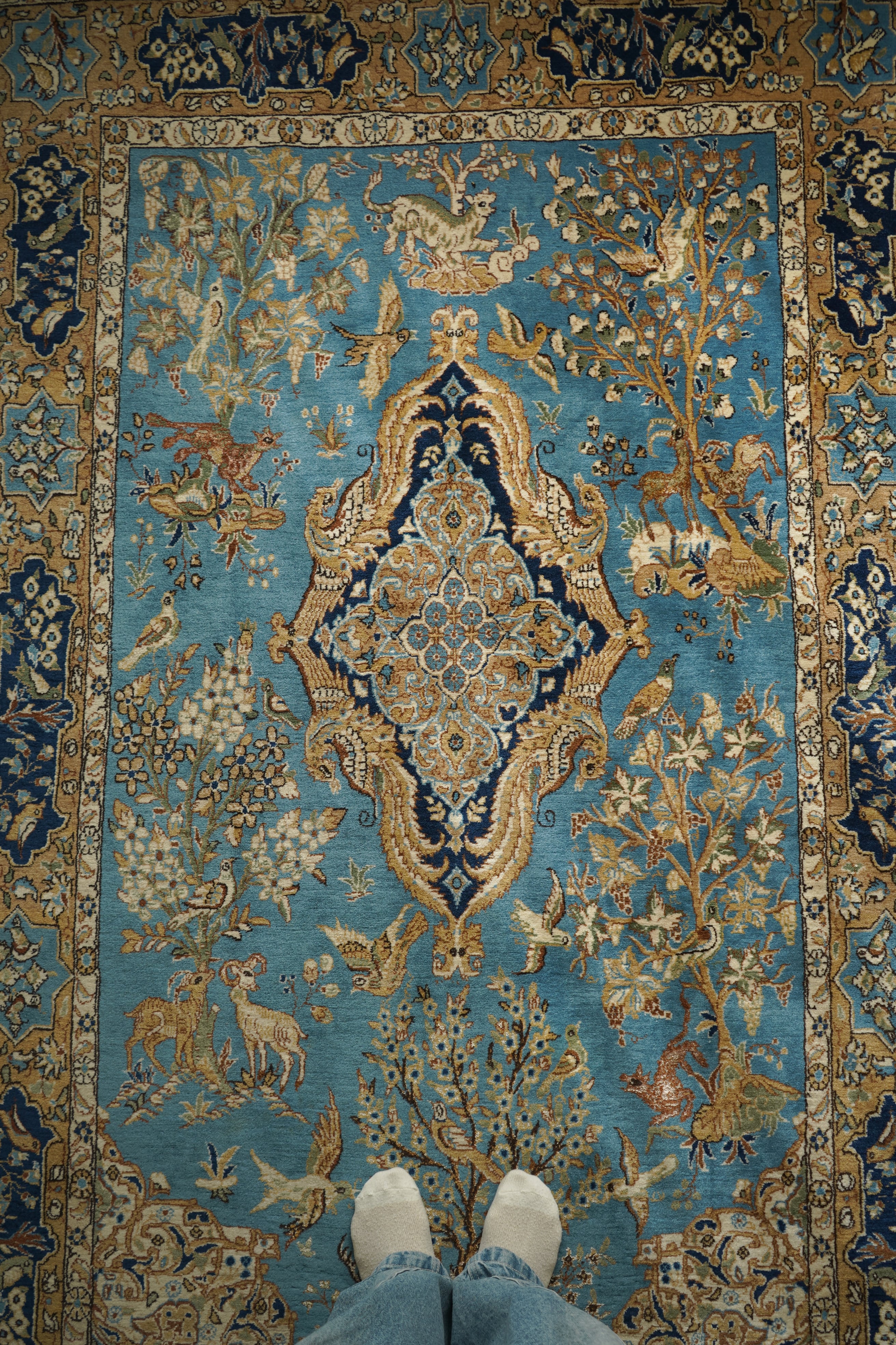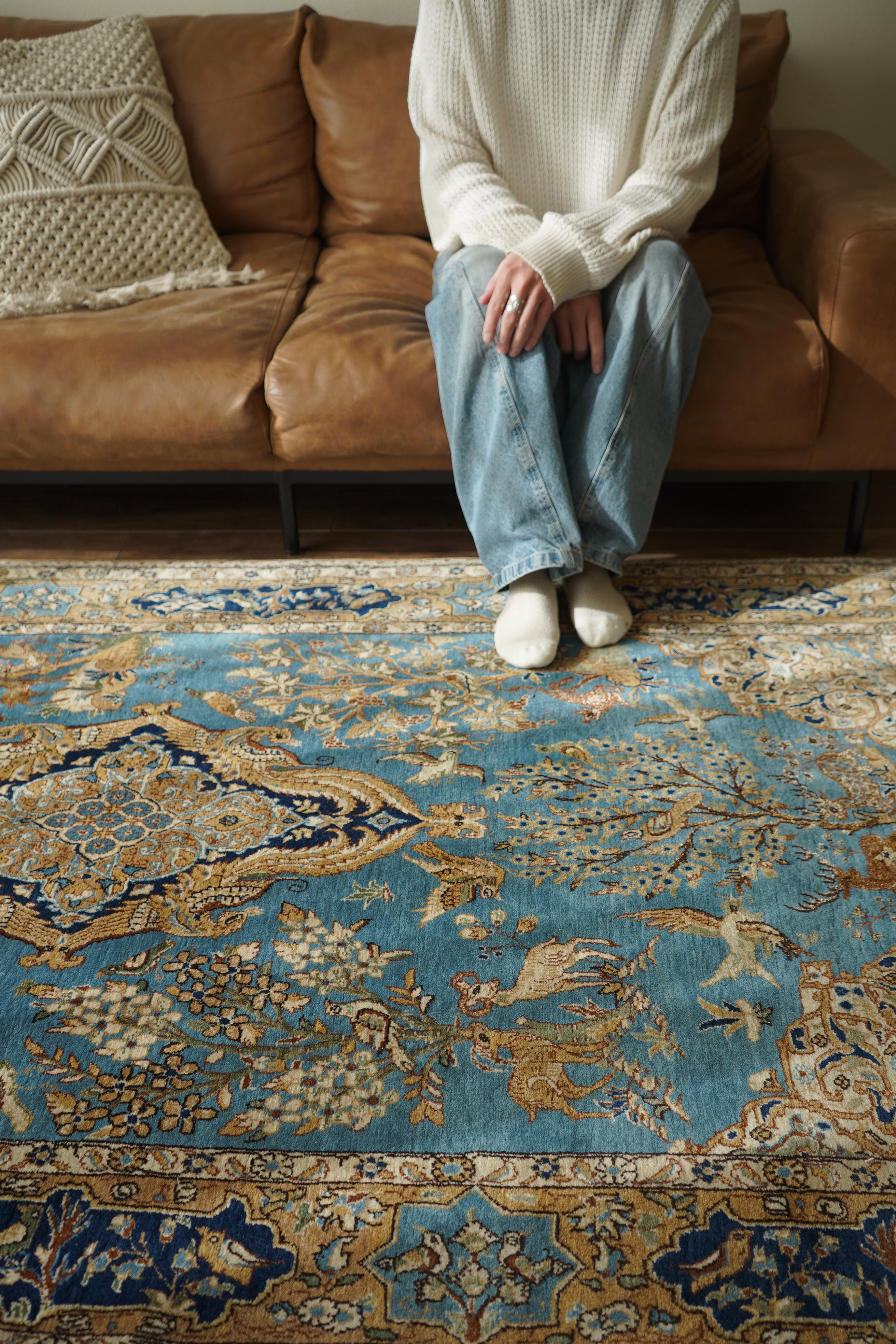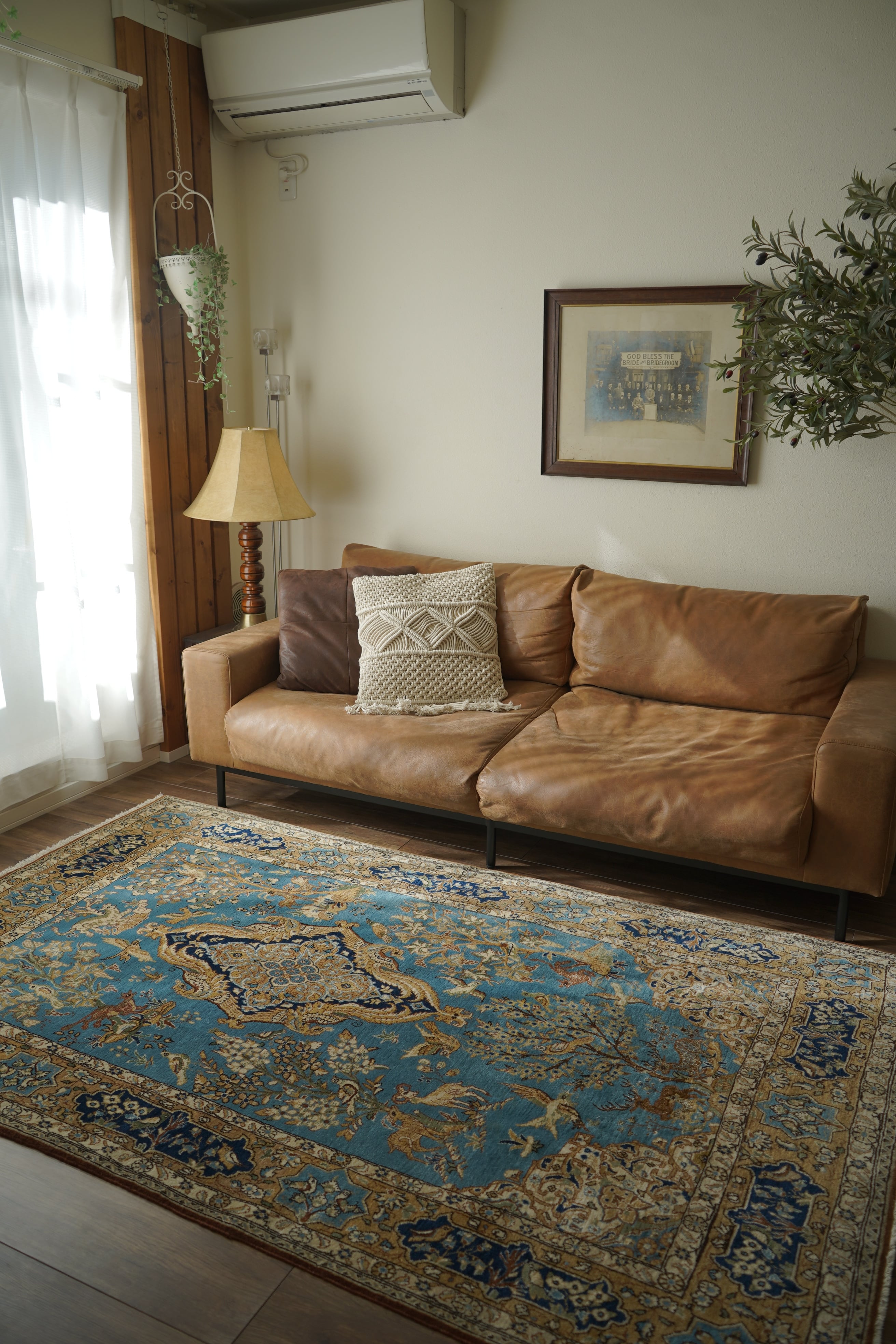 クム産ならではのきめ細かい織りと優美な意匠が際立つ一枚で、優しいターコイズブルーを主役に、ベージュ、クリーム、ブラウン、濃紺が調和する上品で洗練された配色が魅力です。