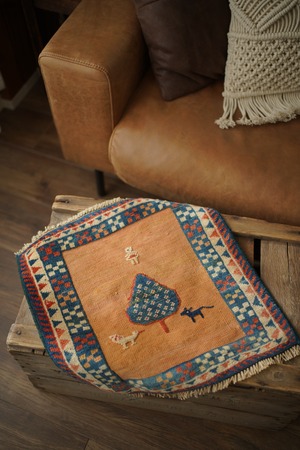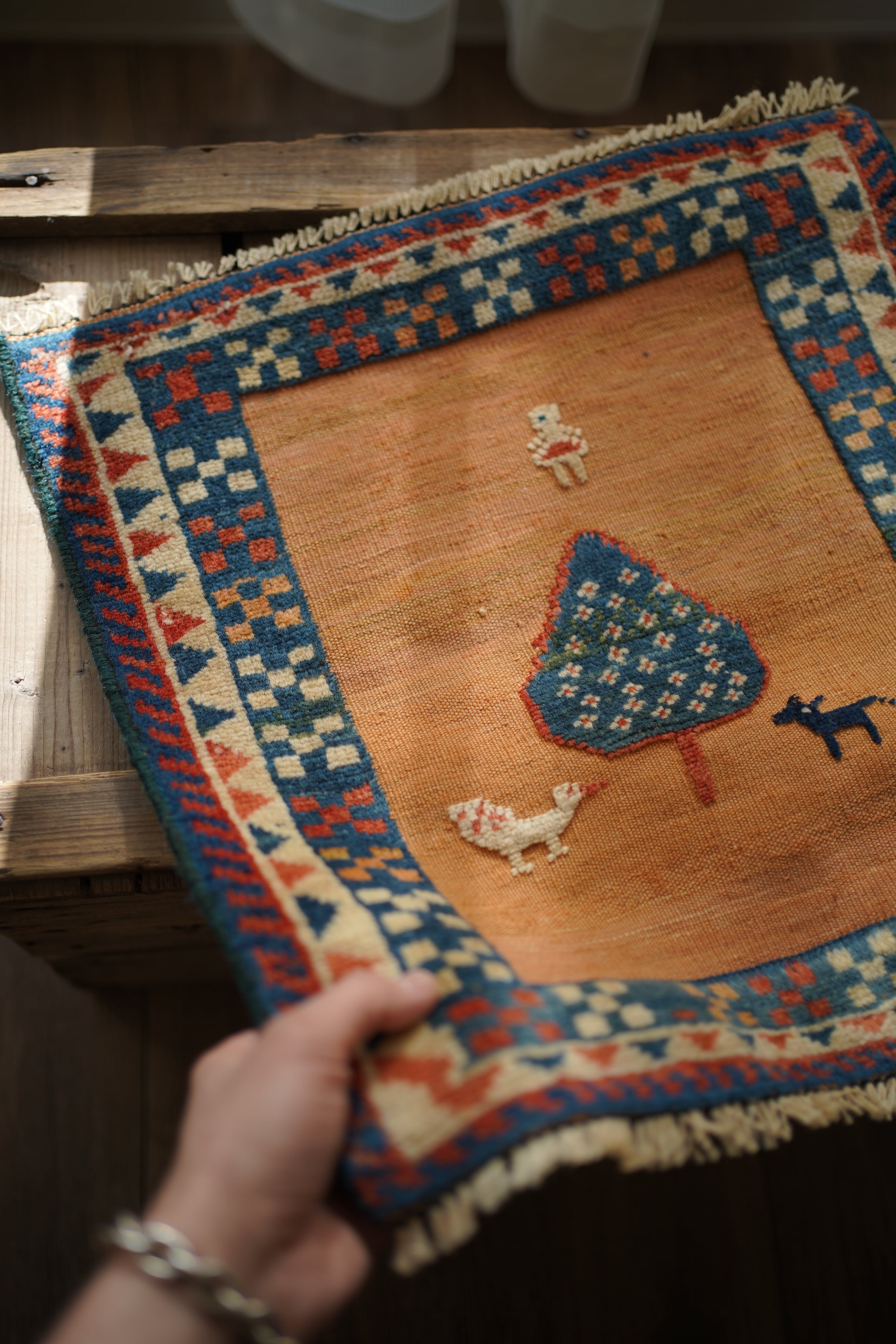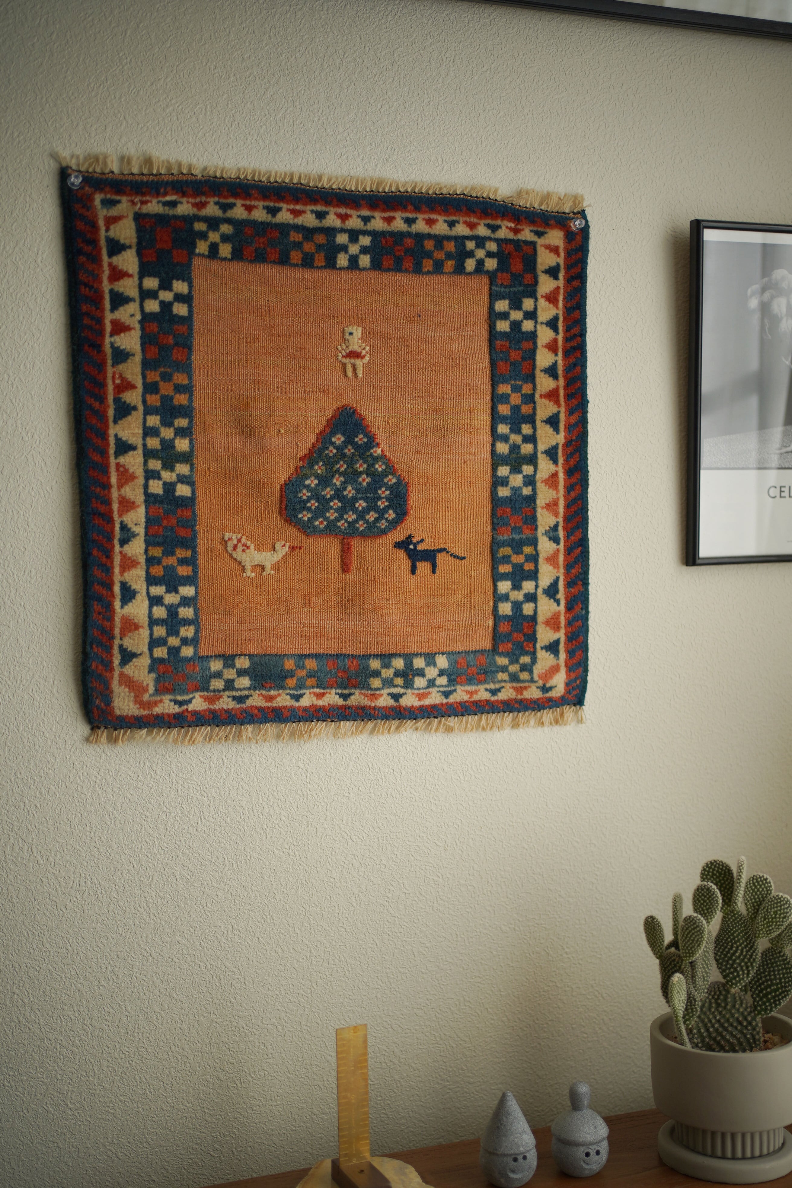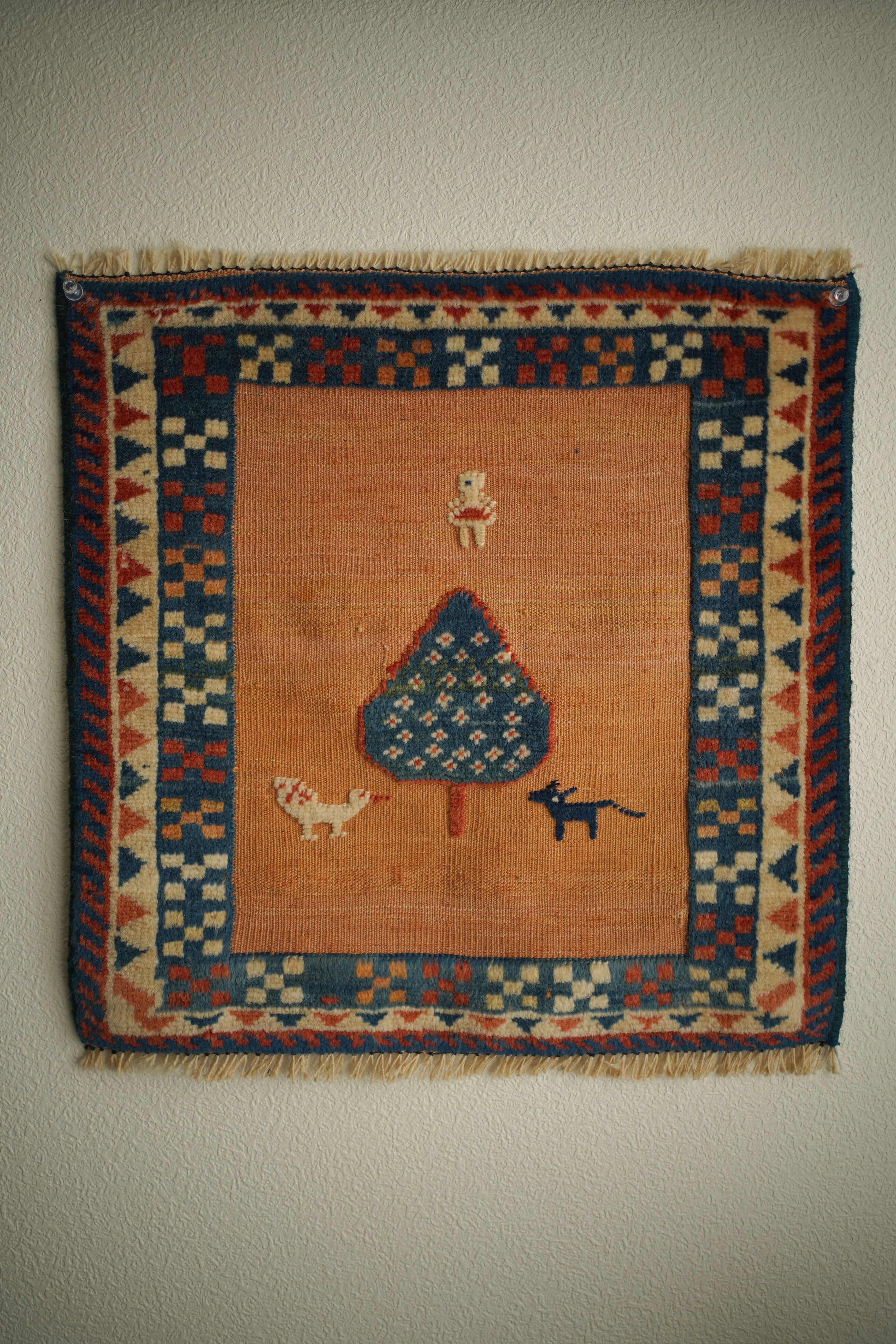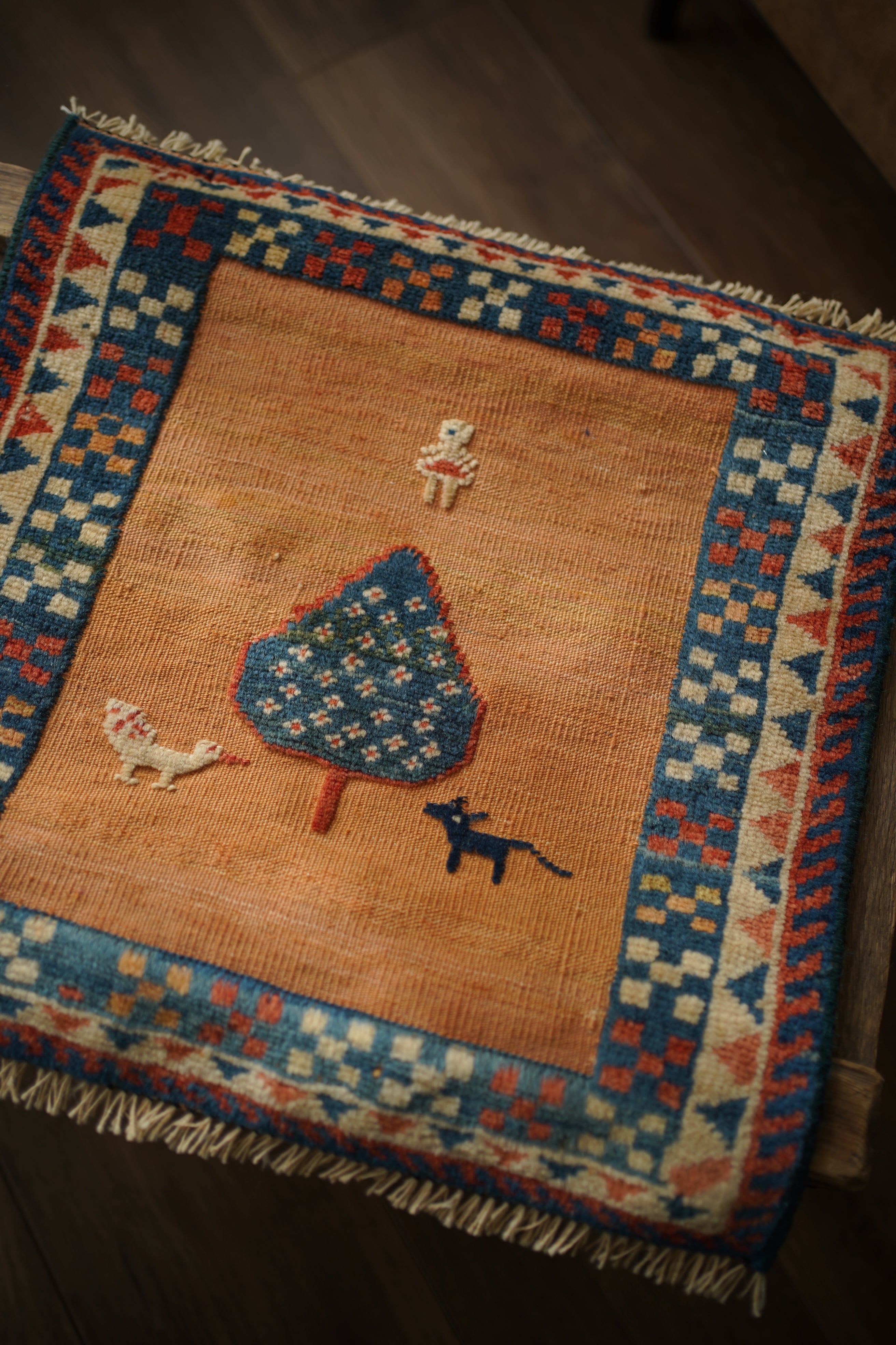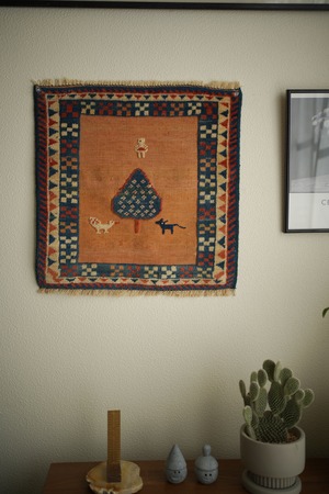 約40年前にイラン・シラーズ地方で織られたクッションカバーを、表面のみに加工し、一枚のアートピースとして仕立てたお品です。中央の可愛らしいフォルムの木が印象的で、その周囲を女の子や動物たちが囲む、どこか物語を感じさせる構図。素朴であたたかな世界観に惹かれて仕入れを決めた一枚で、見ているだけでほっこりする優しい雰囲気が魅力的です。配色は、淡いオレンジをベースに、ブルーグリーンやくすんだ白、アクセントにキャロットオレンジが使われています。オレンジの背景部分のみ平織りとなっており、それ以外はパイル織りで作られております。厚みは6mm程度。目立ったダメージもなくグッドコンディションです。タペストリーとして玄関やリビング、寝室など、お好きな場所に飾ってお楽しみいただければと思います♫