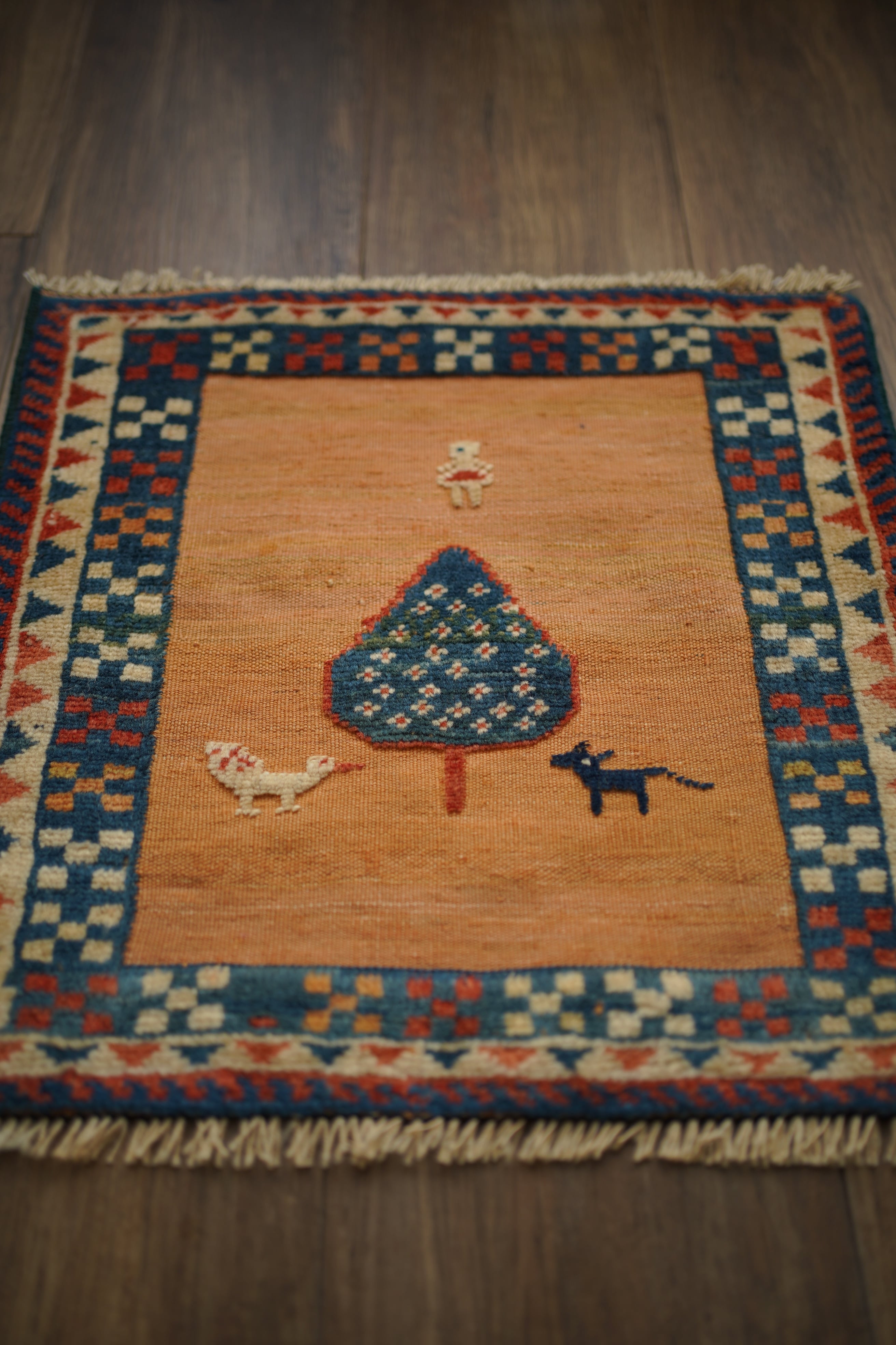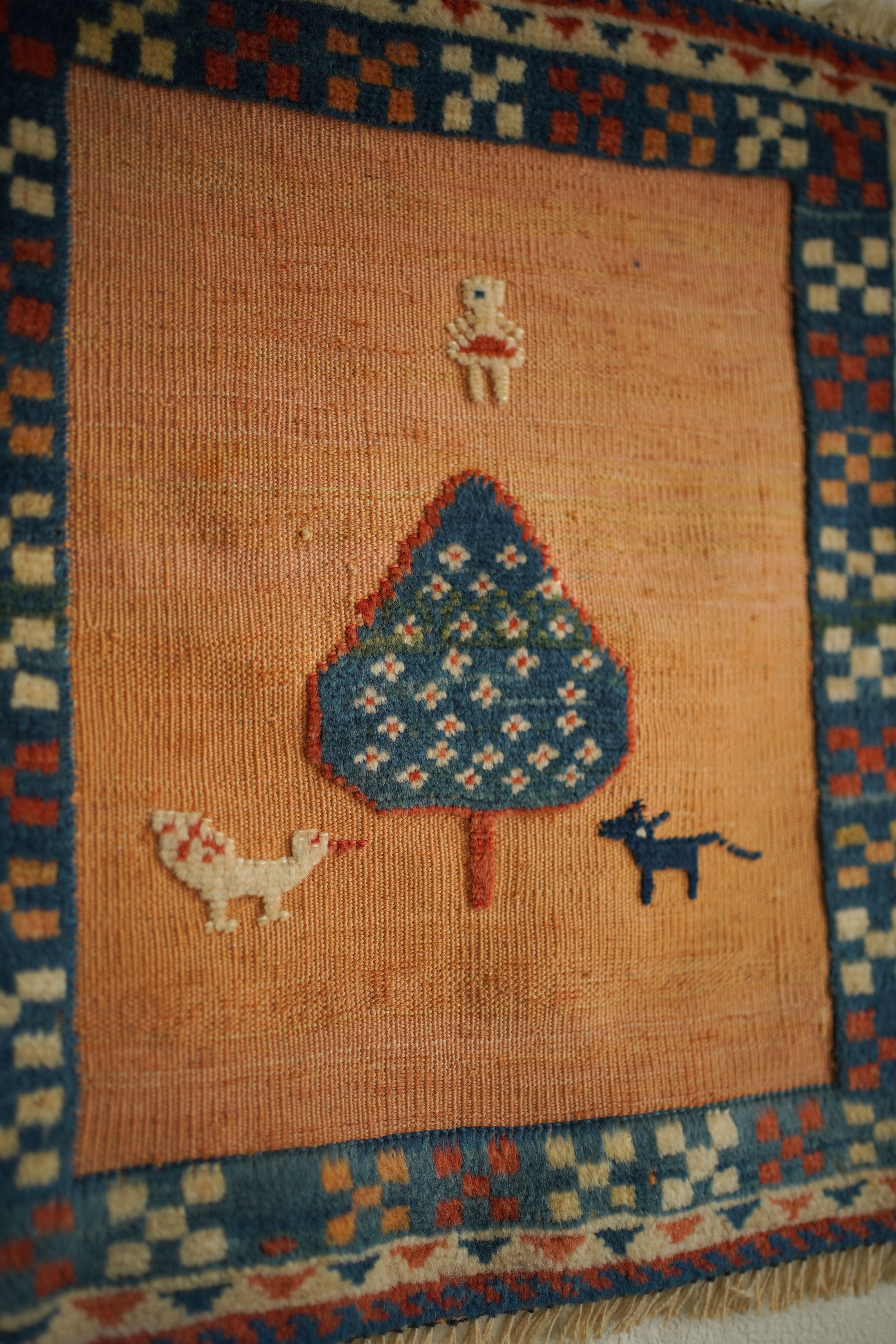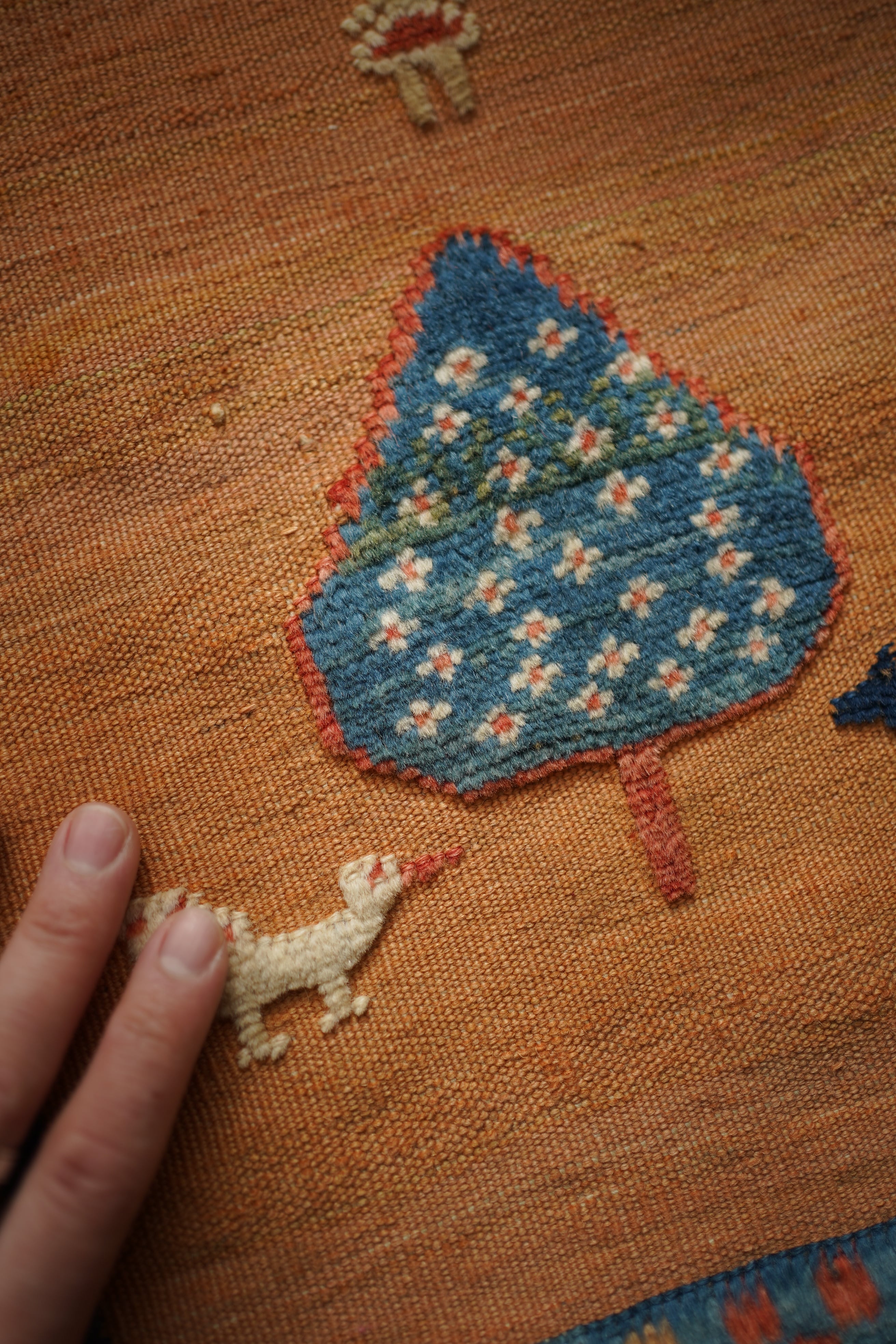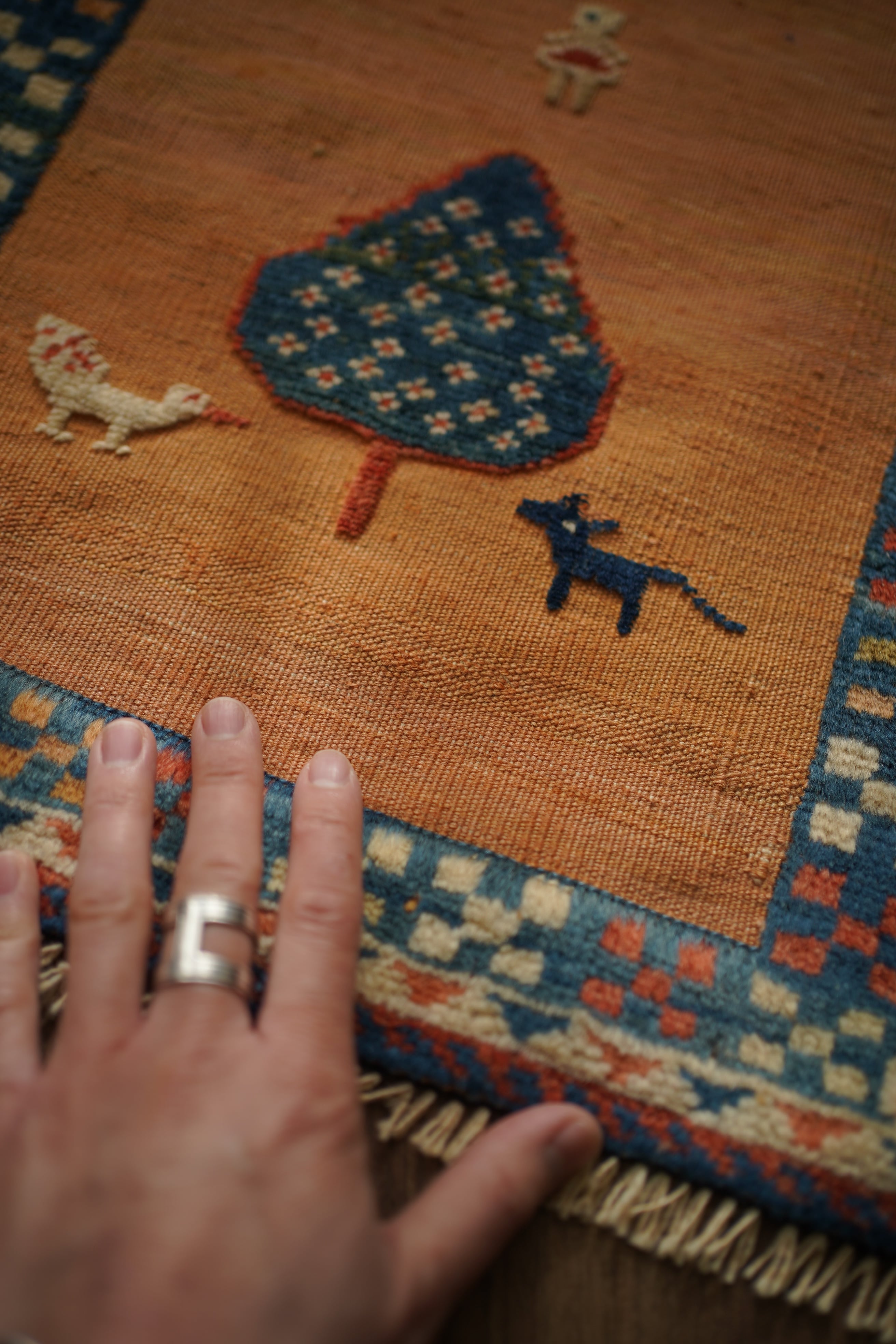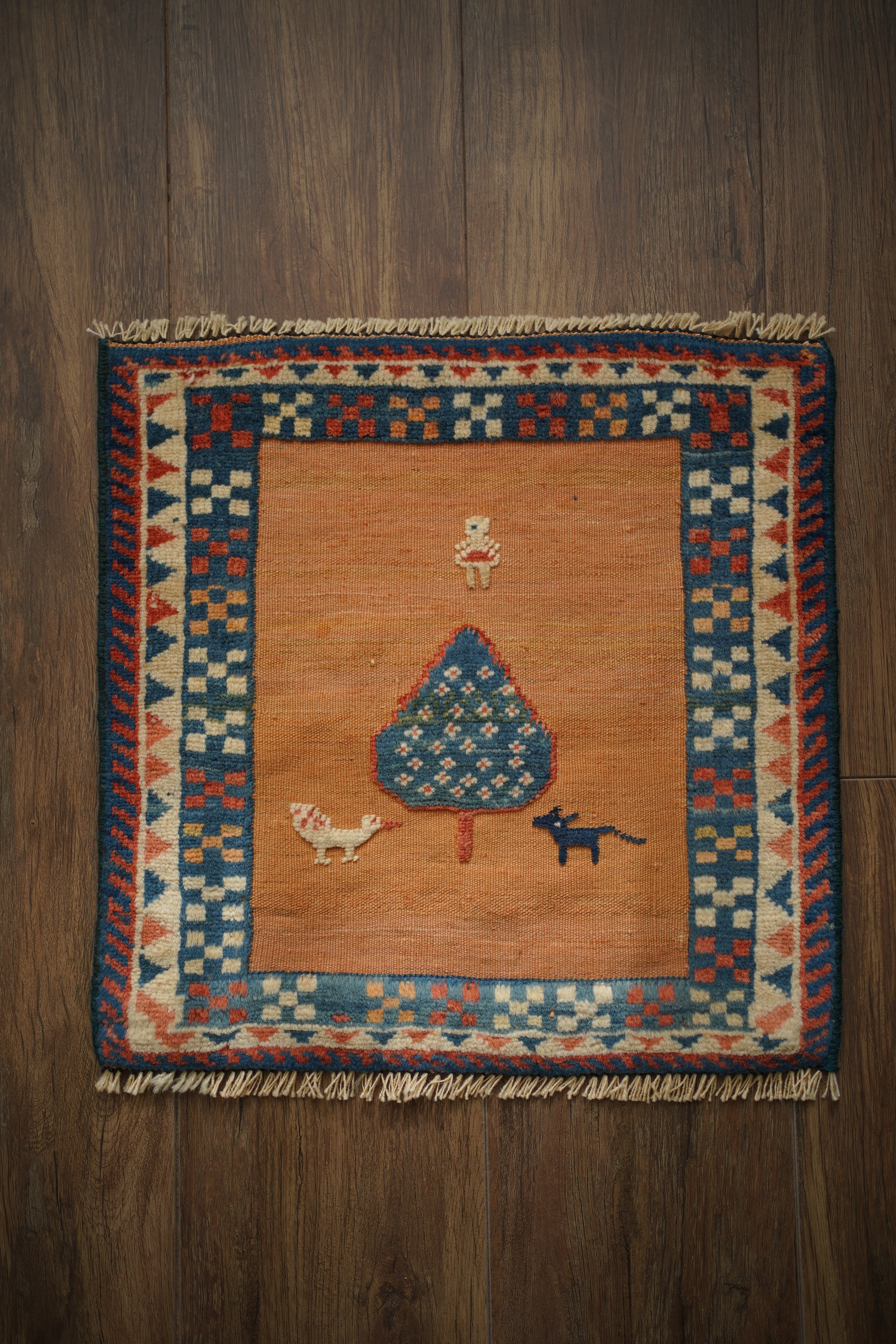 約40年前にイラン・シラーズ地方で織られたクッションカバーを、表面のみに加工し、一枚のアートピースとして仕立てたお品です。中央の可愛らしいフォルムの木が印象的で、その周囲を女の子や動物たちが囲む、どこか物語を感じさせる構図。素朴であたたかな世界観に惹かれて仕入れを決めた一枚で、見ているだけでほっこりする優しい雰囲気が魅力的です。配色は、淡いオレンジをベースに、ブルーグリーンやくすんだ白、アクセントにキャロットオレンジが使われています。オレンジの背景部分のみ平織りとなっており、それ以外はパイル織りで作られております。厚みは6mm程度。目立ったダメージもなくグッドコンディションです。タペストリーとして玄関やリビング、寝室など、お好きな場所に飾ってお楽しみいただければと思います♫