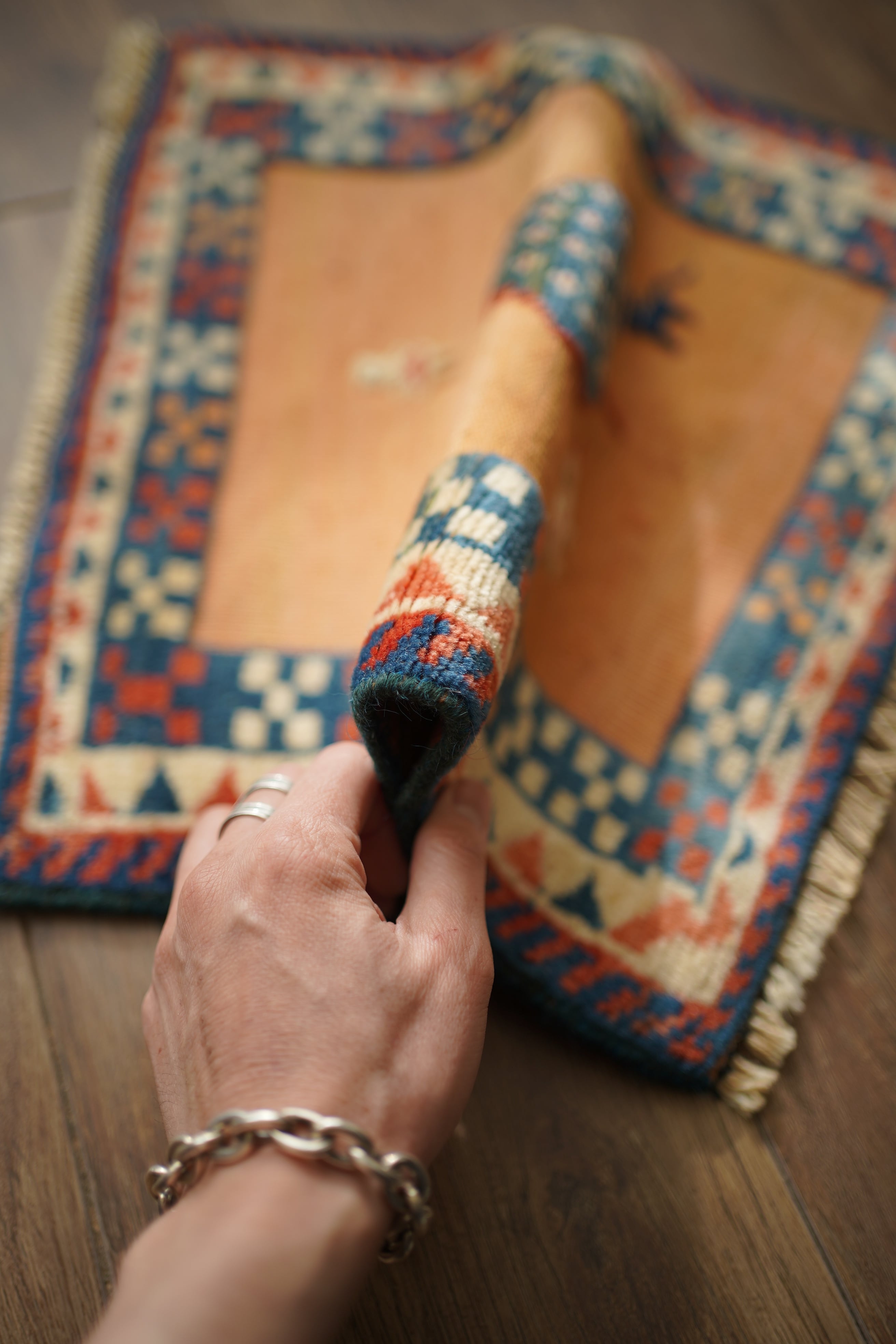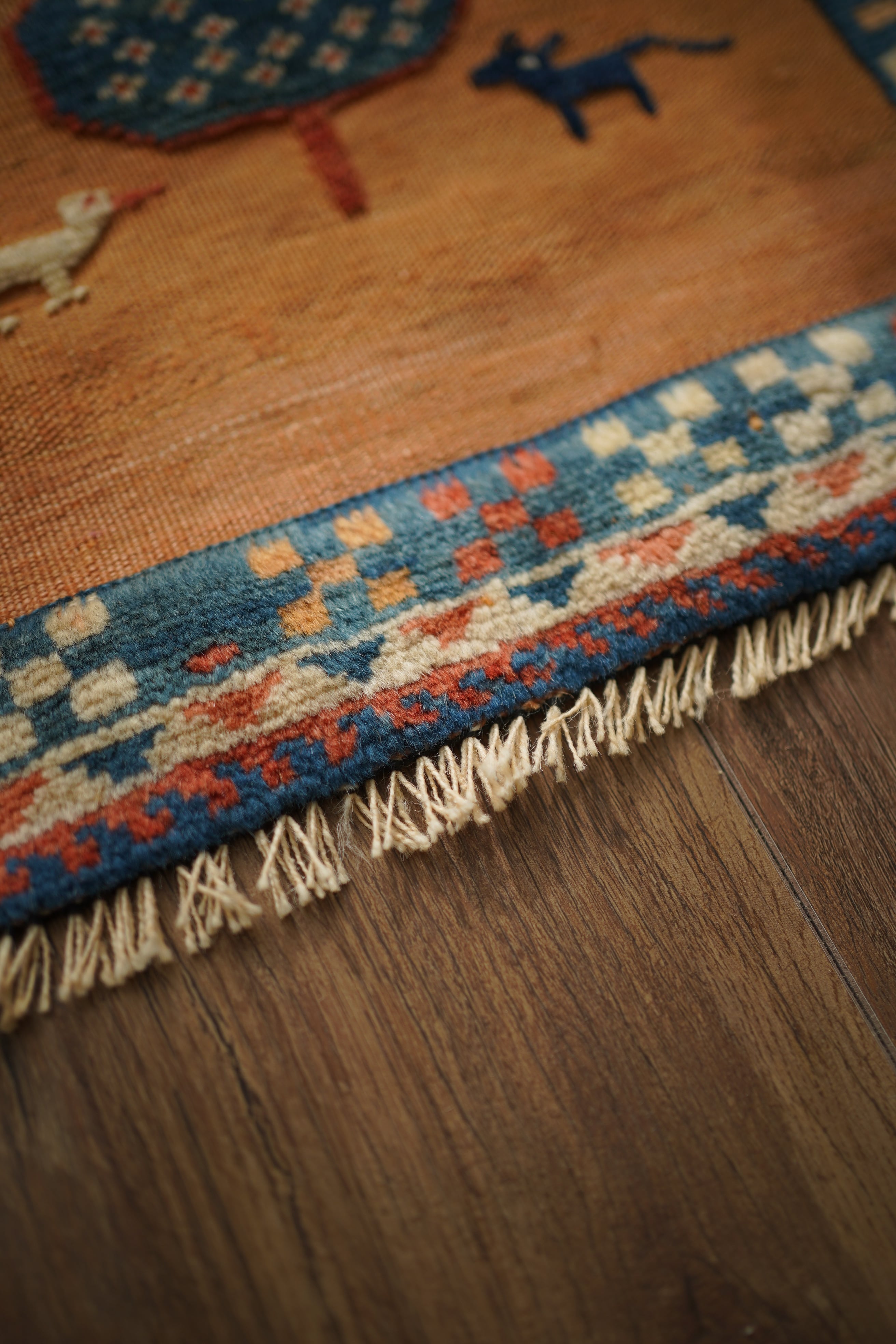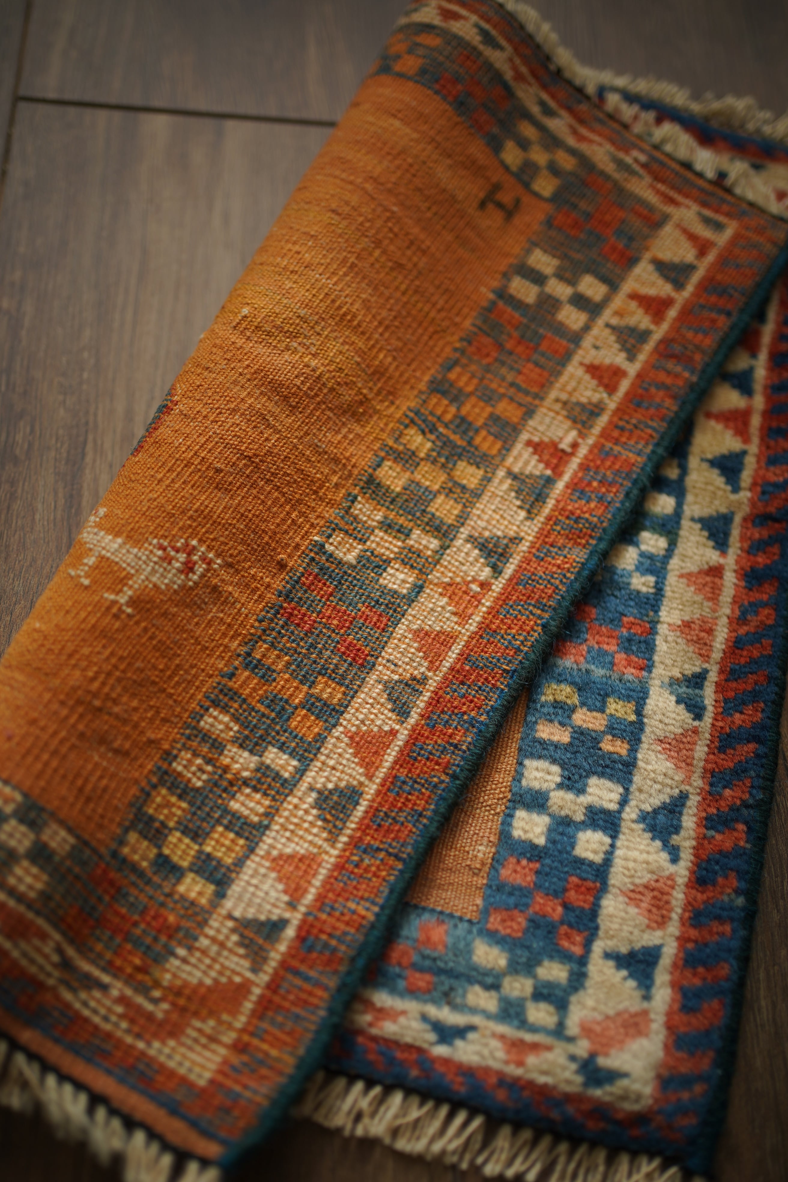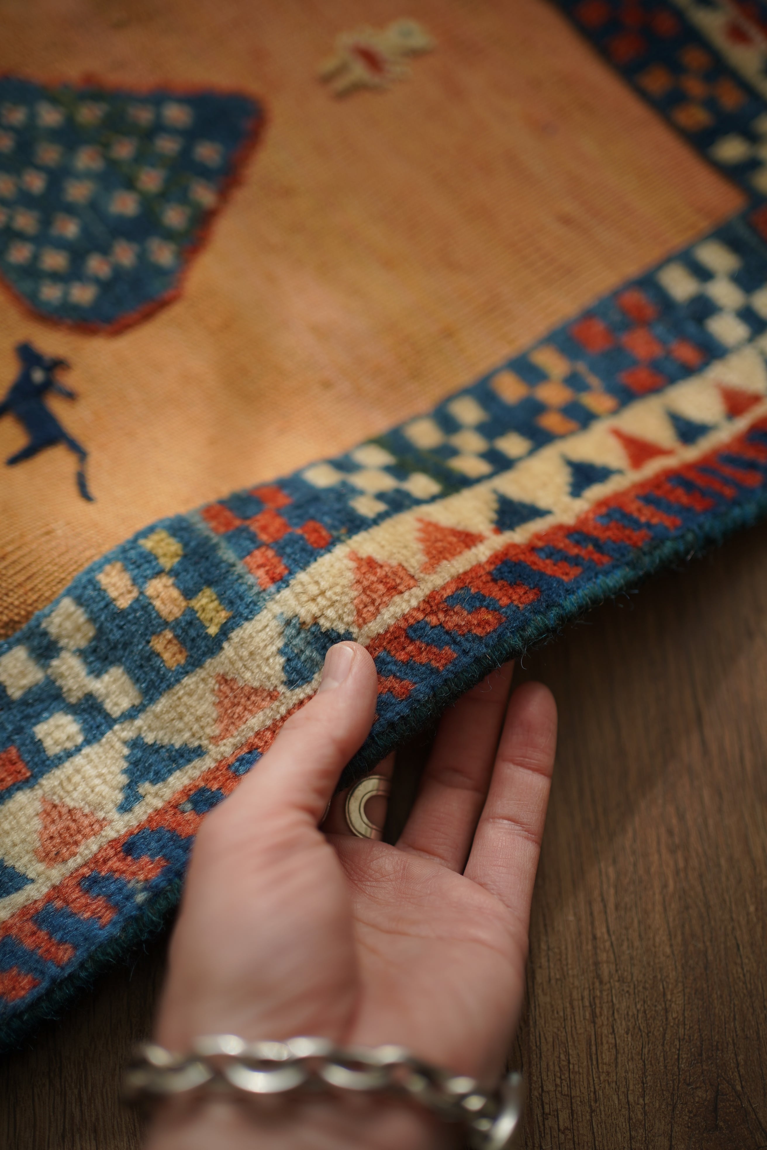 約40年前にイラン・シラーズ地方で織られたクッションカバーを、表面のみに加工し、一枚のアートピースとして仕立てたお品です。中央の可愛らしいフォルムの木が印象的で、その周囲を女の子や動物たちが囲む、どこか物語を感じさせる構図。素朴であたたかな世界観に惹かれて仕入れを決めた一枚で、見ているだけでほっこりする優しい雰囲気が魅力的です。配色は、淡いオレンジをベースに、ブルーグリーンやくすんだ白、アクセントにキャロットオレンジが使われています。オレンジの背景部分のみ平織りとなっており、それ以外はパイル織りで作られております。厚みは6mm程度。目立ったダメージもなくグッドコンディションです。タペストリーとして玄関やリビング、寝室など、お好きな場所に飾ってお楽しみいただければと思います♫