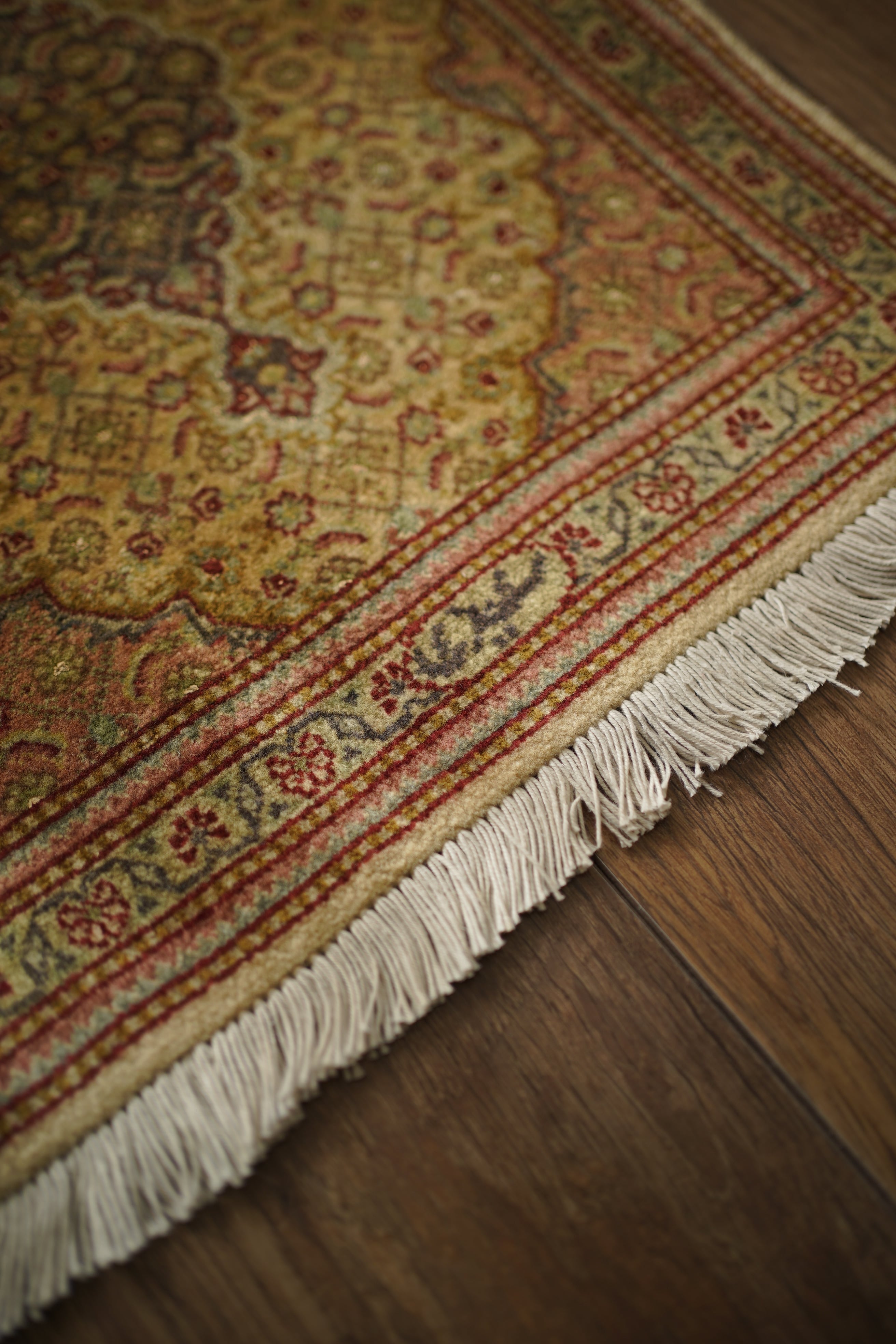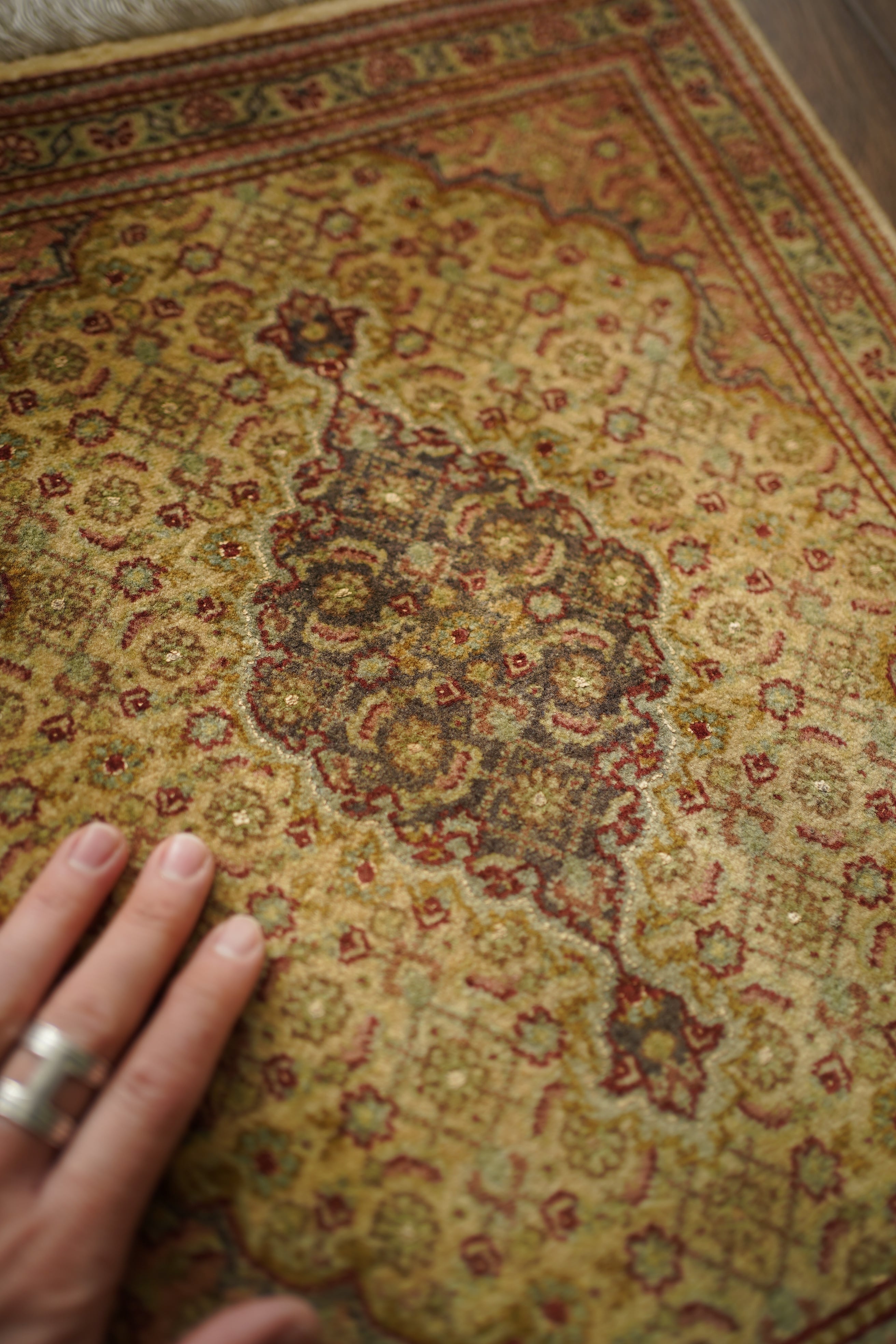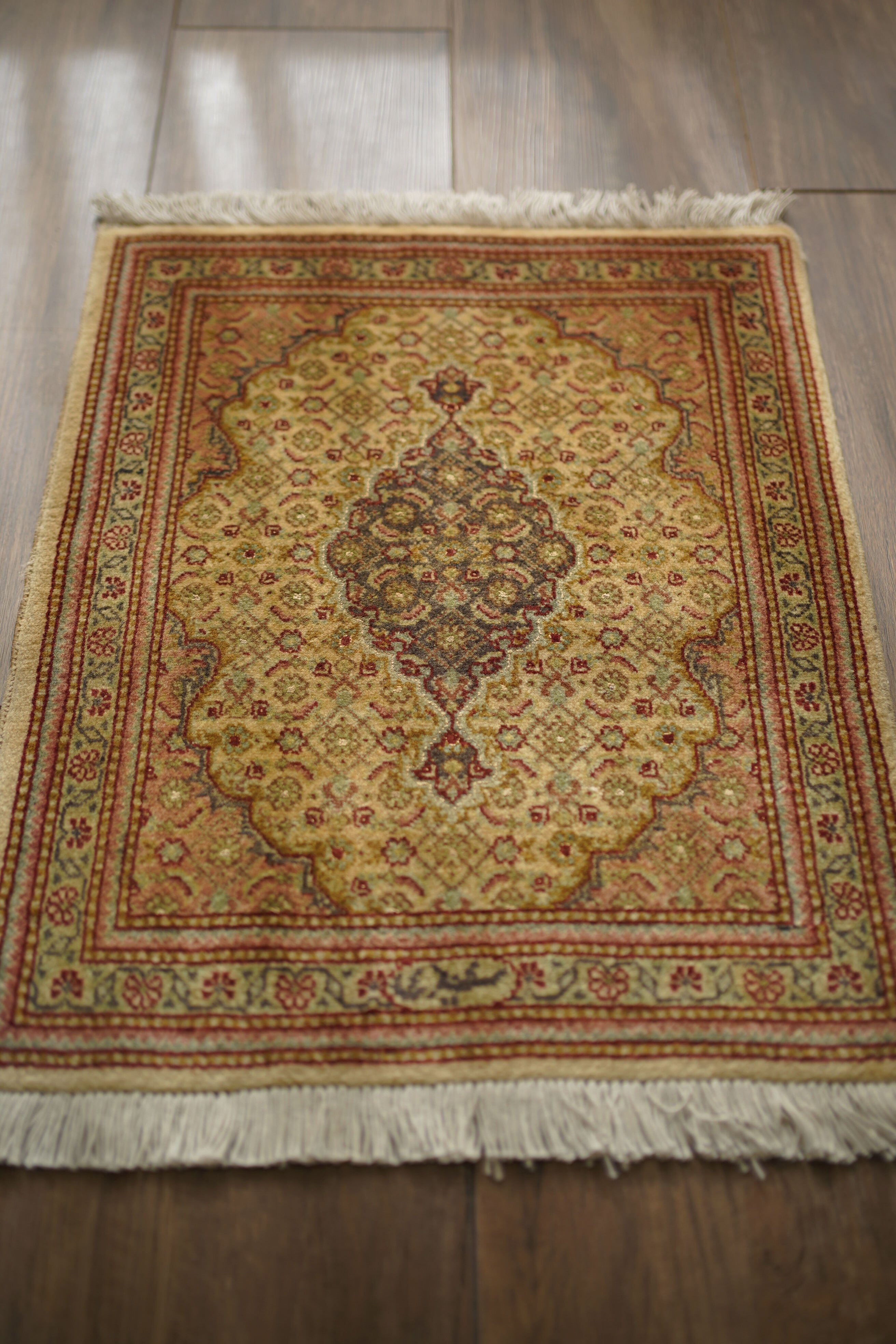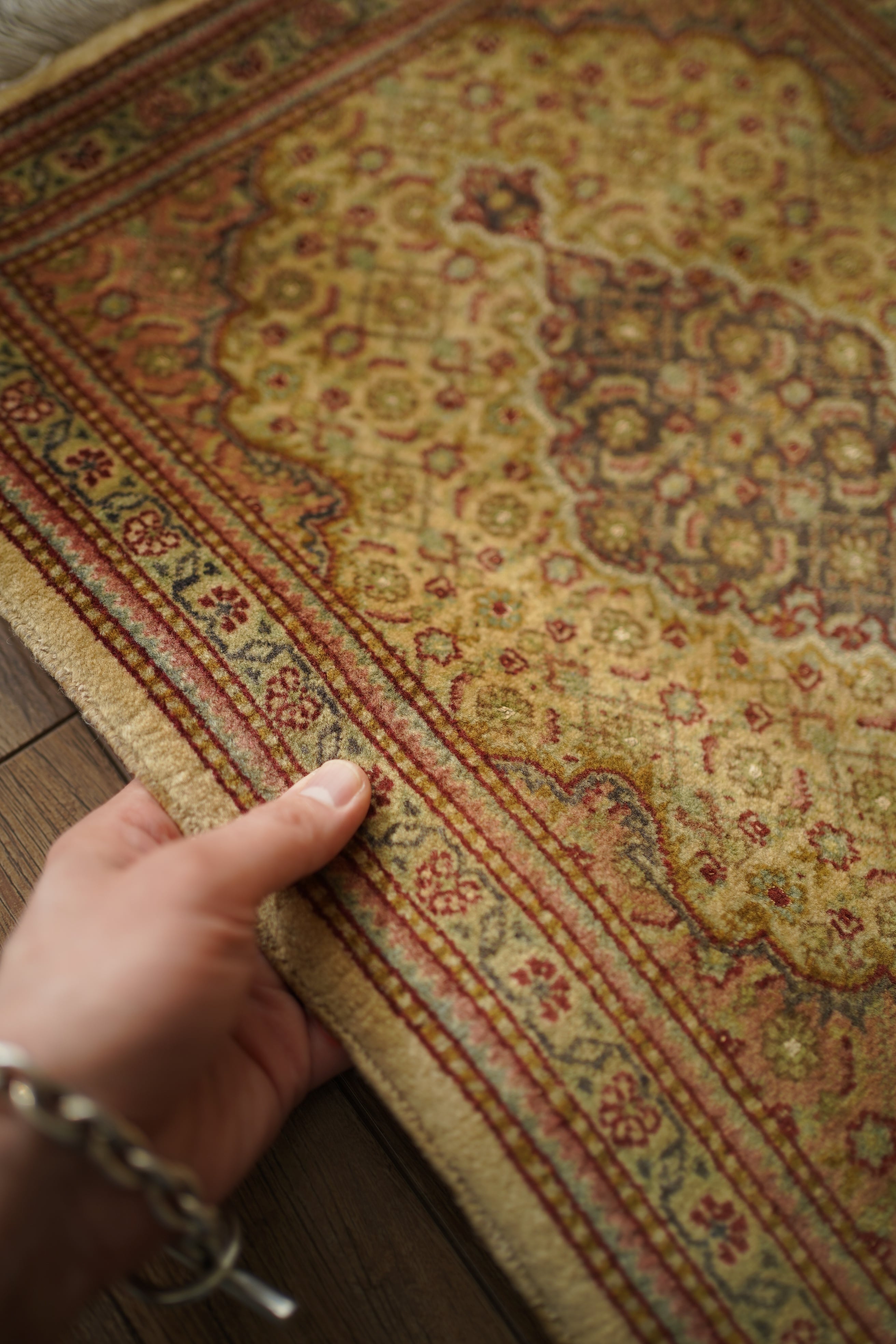 イラン北西部に位置する都市ビジャーで、クルド人によって織られたペルシャラグです。デザインは4枚のアカンサスの葉に囲まれた菱形モチーフが連続する「ヘラティ紋様(マヒ)」柄。中央のメダリオンを軸に、細やかな意匠が美しく広がっており、ボーダーには小花文様が織り込まれています。配色は、よもぎ色や若葉色を基調に、くすんだピンクやベージュ、赤茶などが使われた落ち着きのあるトーン。華やかさというよりも、しっとりとした深みを感じさせる色合いです。厚みは約6mmほどで、表面はサラッとした滑らかな肌触りをしています。目立ったダメージや補修跡もなく、大変良好なコンディションです。ラックやサイドボードの上に敷いてお気に入りの小物を飾ったり、小ぶりな観葉植物の下に合わせたりと、空間のさりげないアクセントとしてお楽しみいただけます。また、壁に掛けてタペストリーのように飾っていただくのもおすすめです。