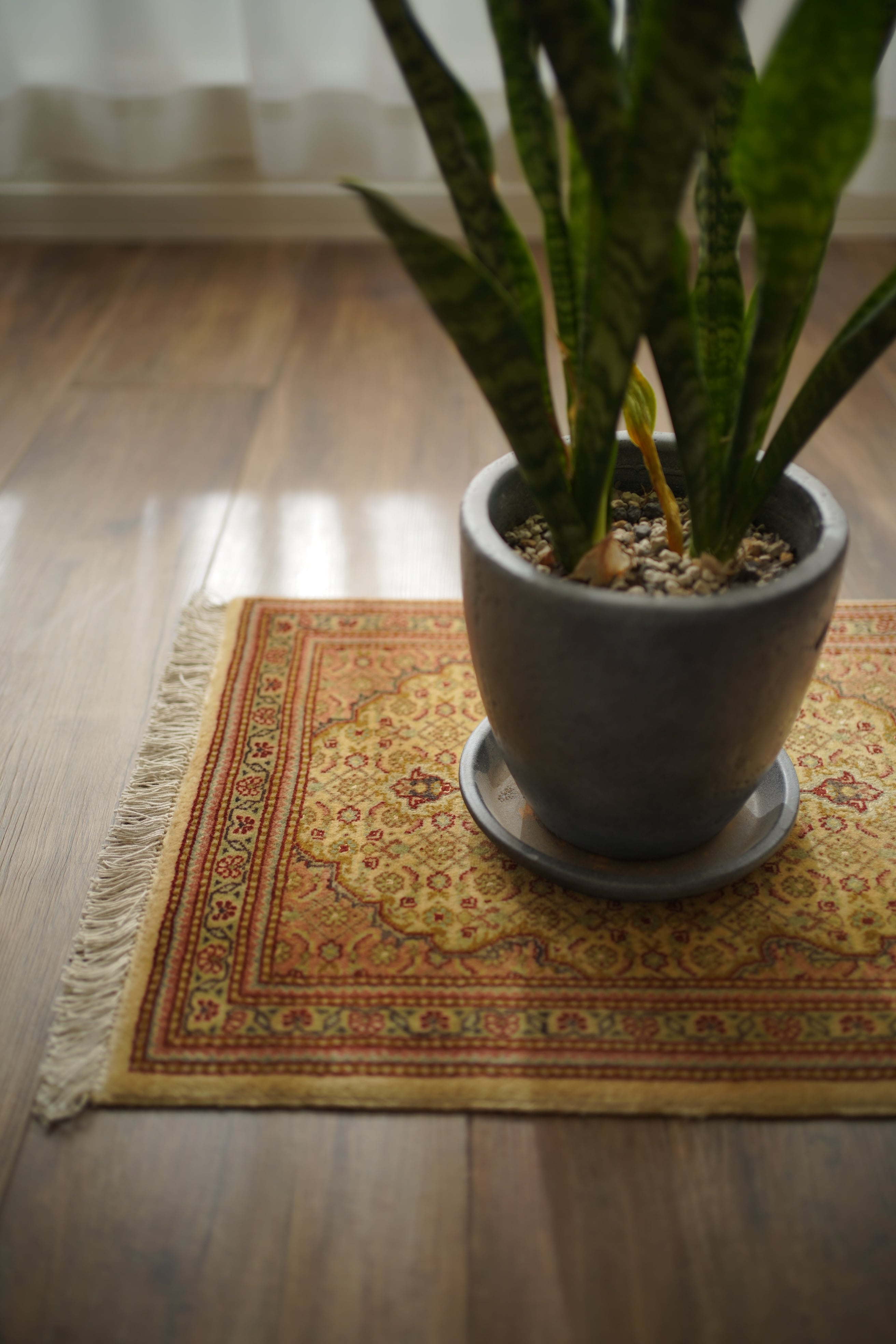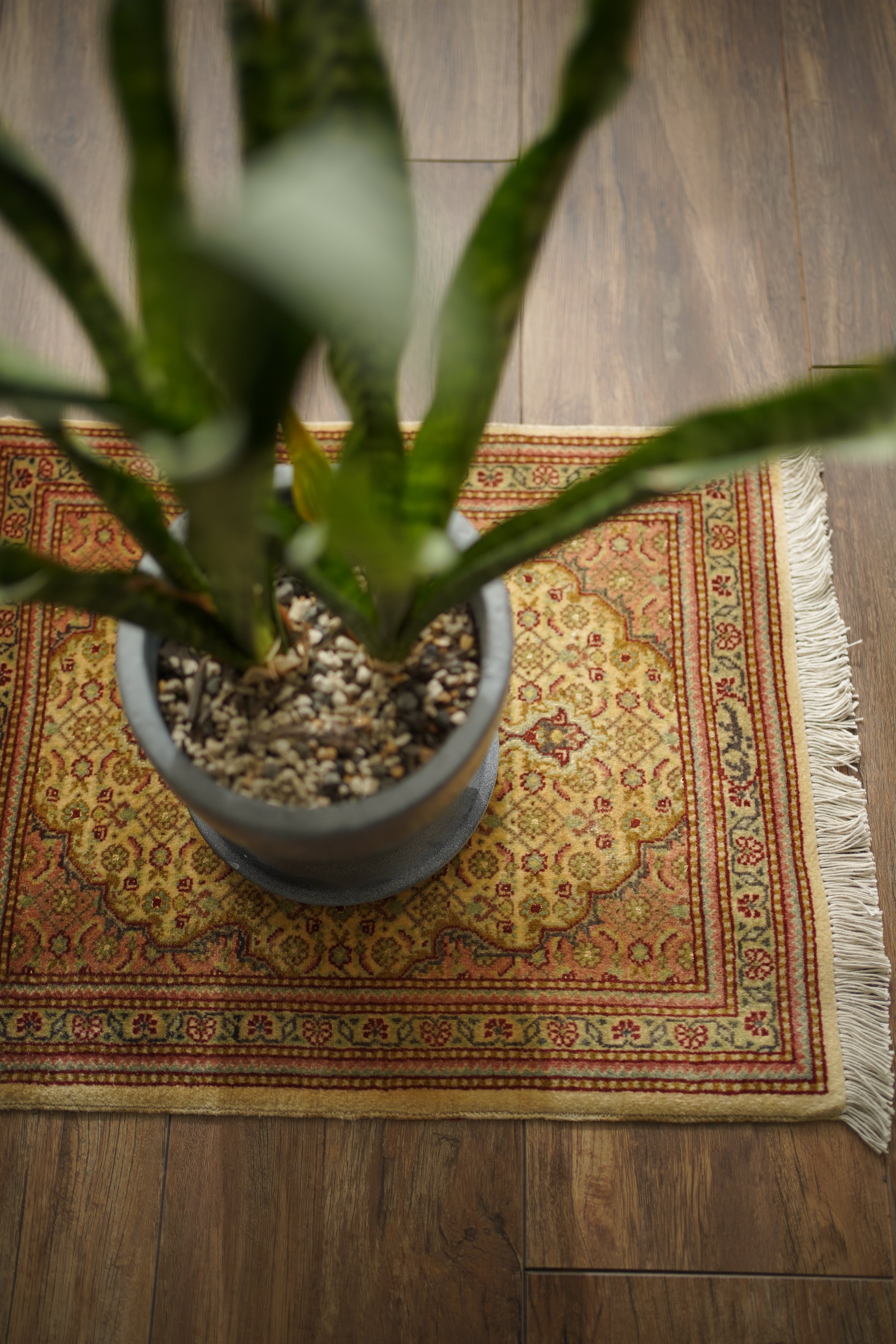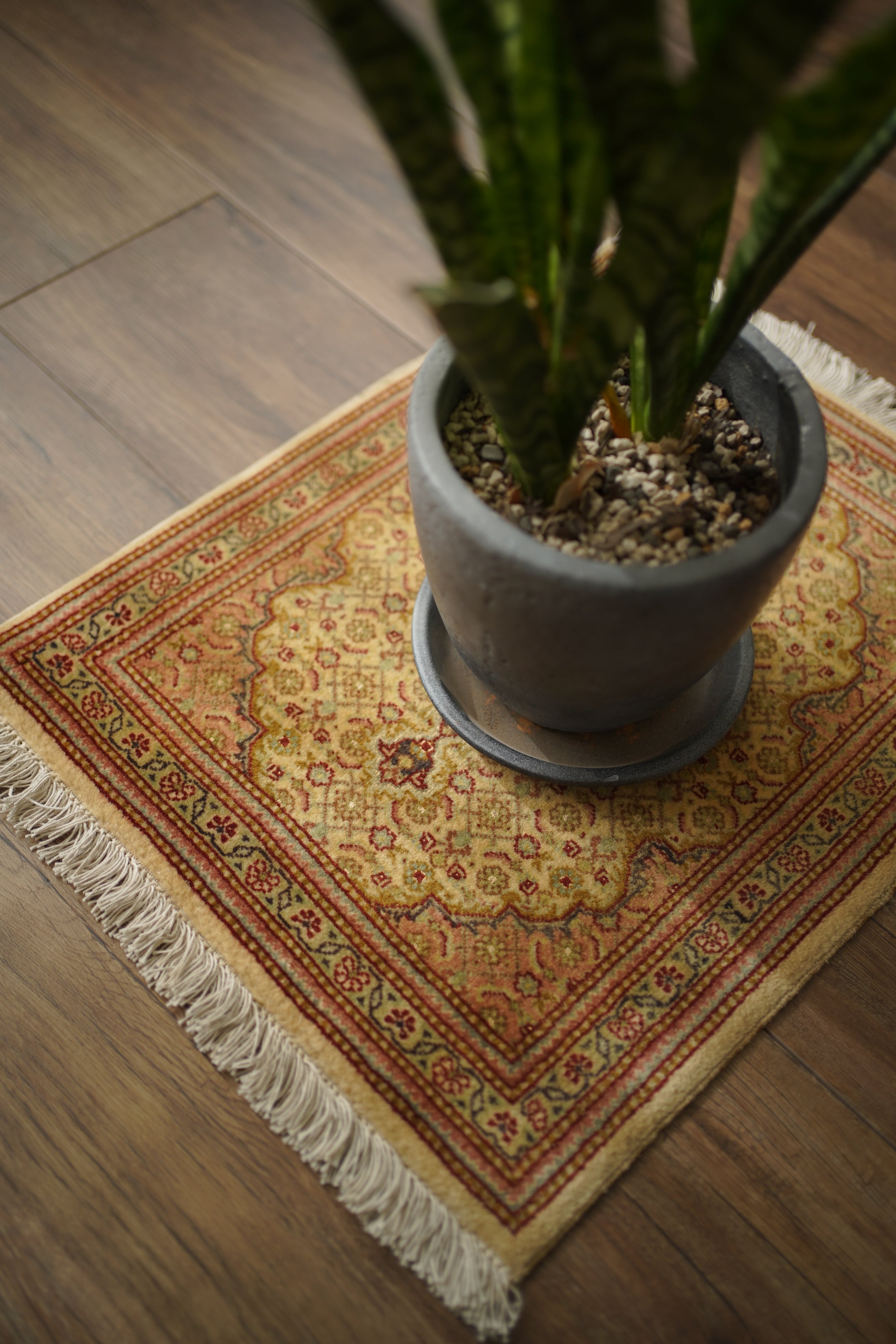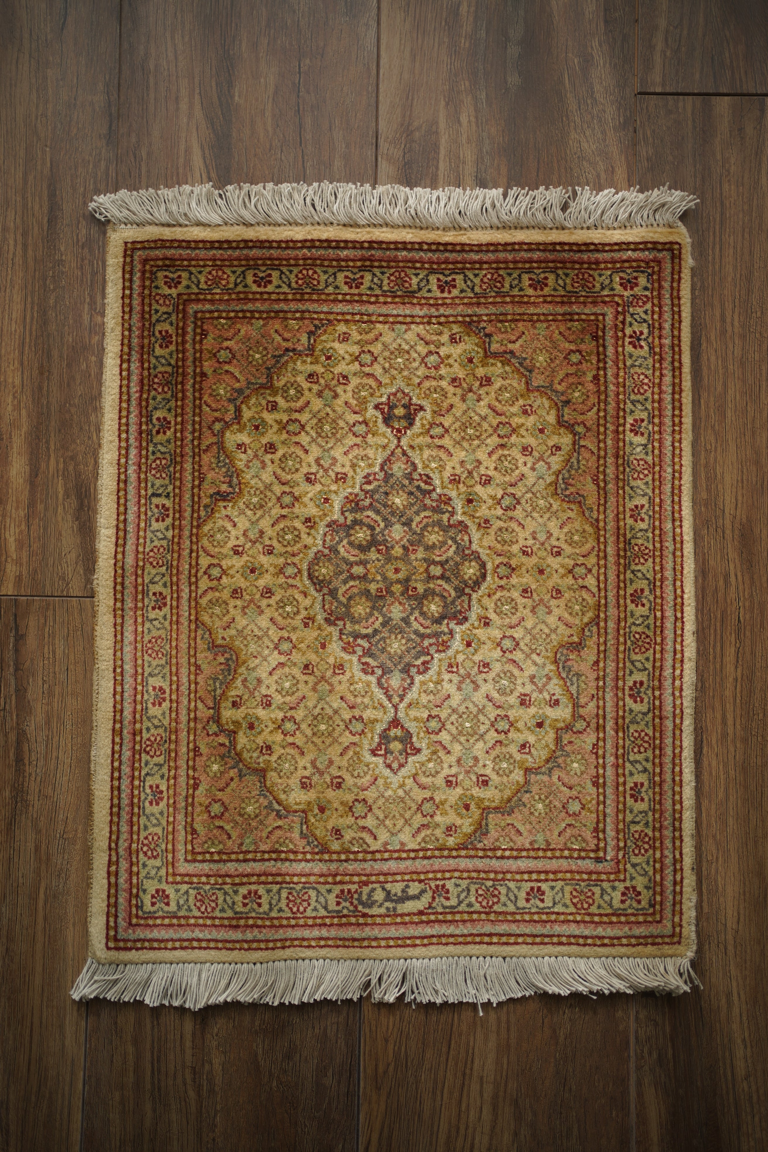 イラン北西部に位置する都市ビジャーで、クルド人によって織られたペルシャラグです。デザインは4枚のアカンサスの葉に囲まれた菱形モチーフが連続する「ヘラティ紋様(マヒ)」柄。中央のメダリオンを軸に、細やかな意匠が美しく広がっており、ボーダーには小花文様が織り込まれています。配色は、よもぎ色や若葉色を基調に、くすんだピンクやベージュ、赤茶などが使われた落ち着きのあるトーン。華やかさというよりも、しっとりとした深みを感じさせる色合いです。厚みは約6mmほどで、表面はサラッとした滑らかな肌触りをしています。目立ったダメージや補修跡もなく、大変良好なコンディションです。ラックやサイドボードの上に敷いてお気に入りの小物を飾ったり、小ぶりな観葉植物の下に合わせたりと、空間のさりげないアクセントとしてお楽しみいただけます。また、壁に掛けてタペストリーのように飾っていただくのもおすすめです。