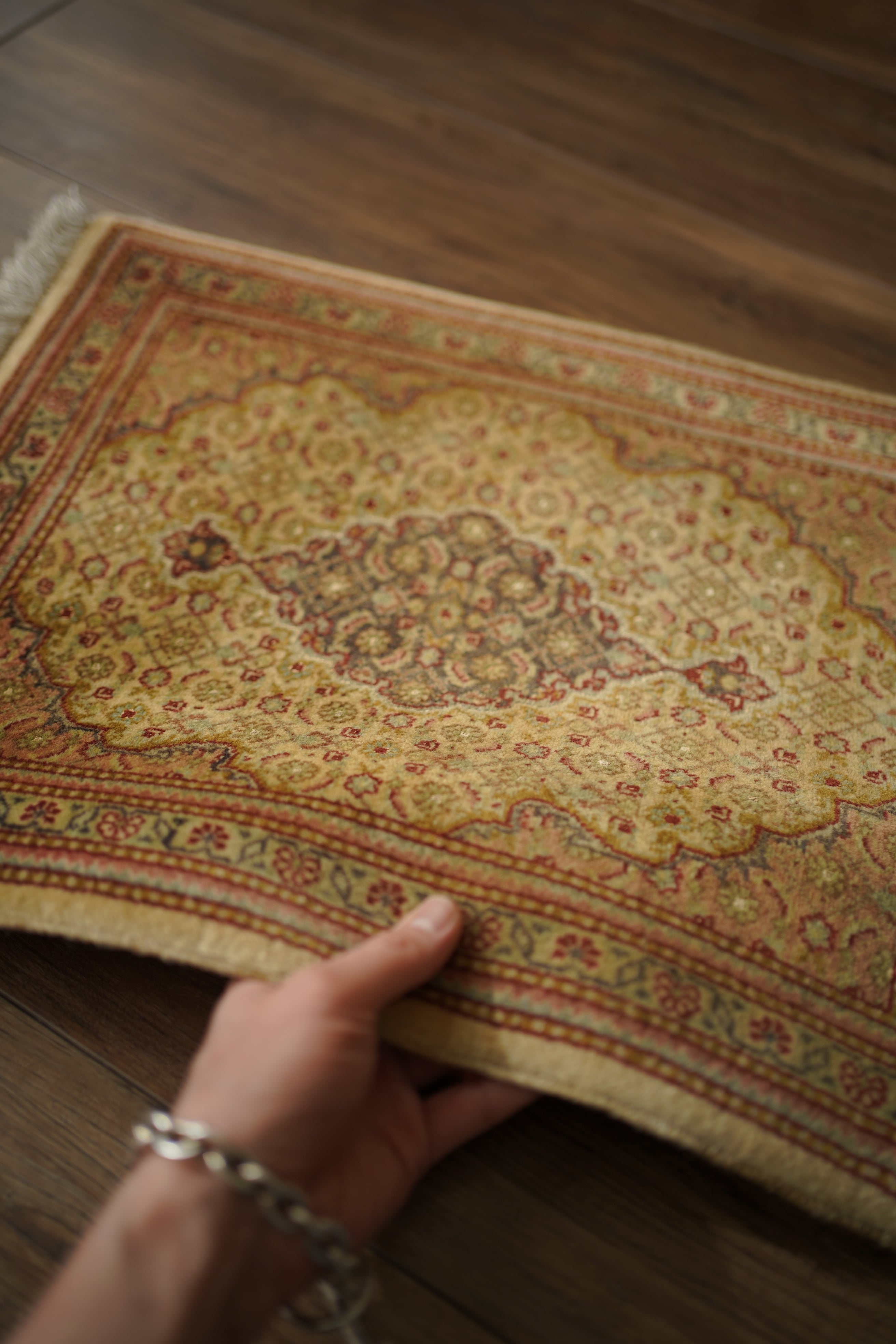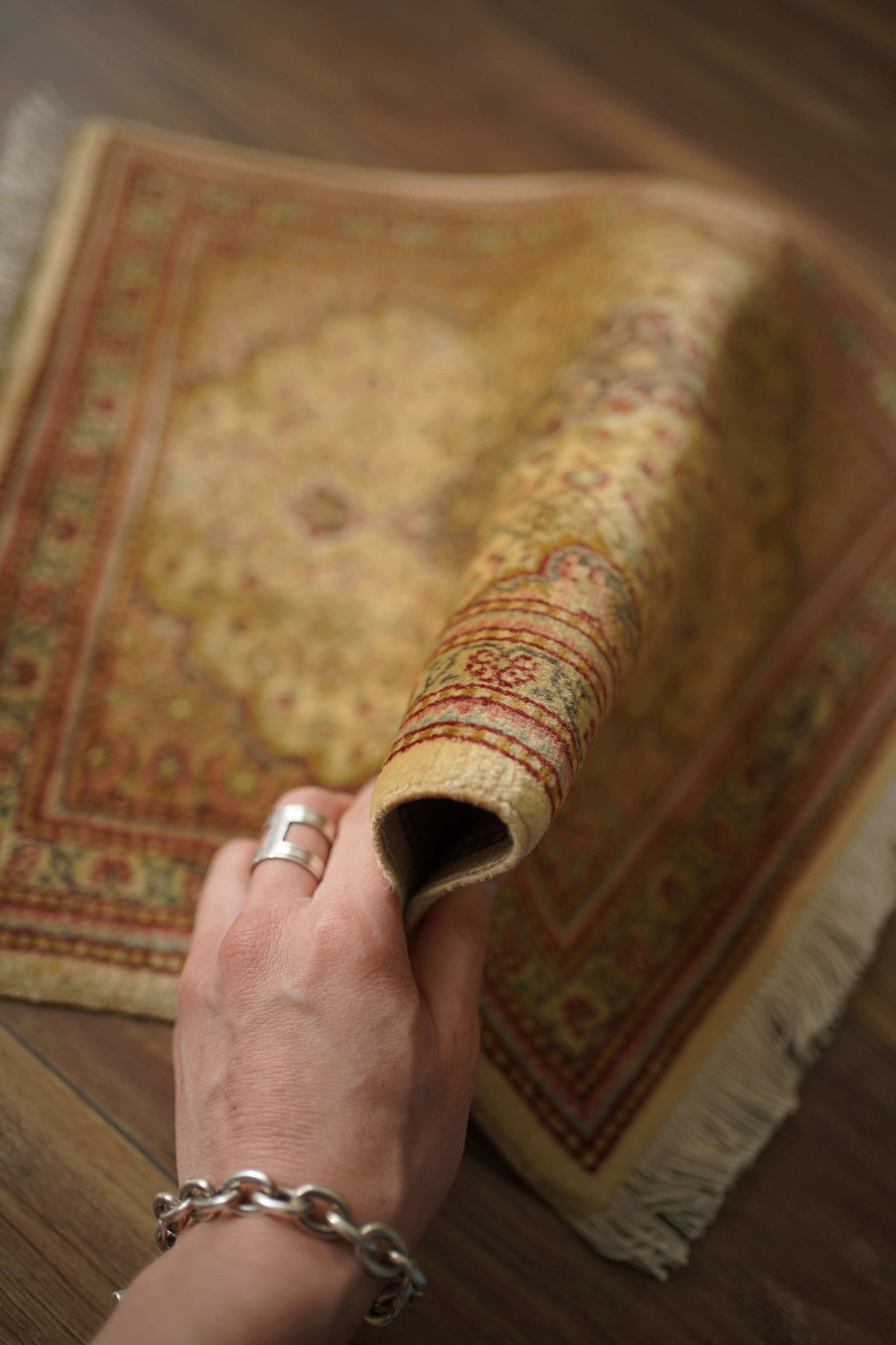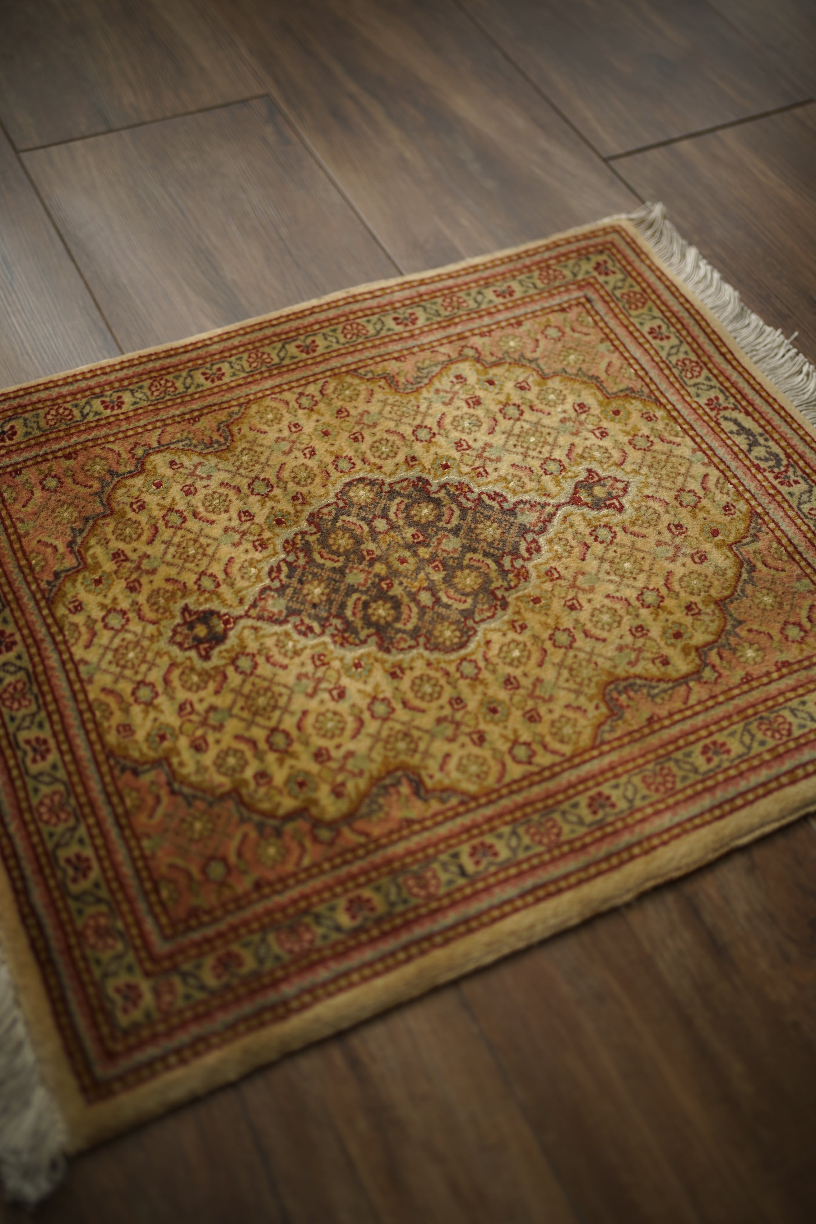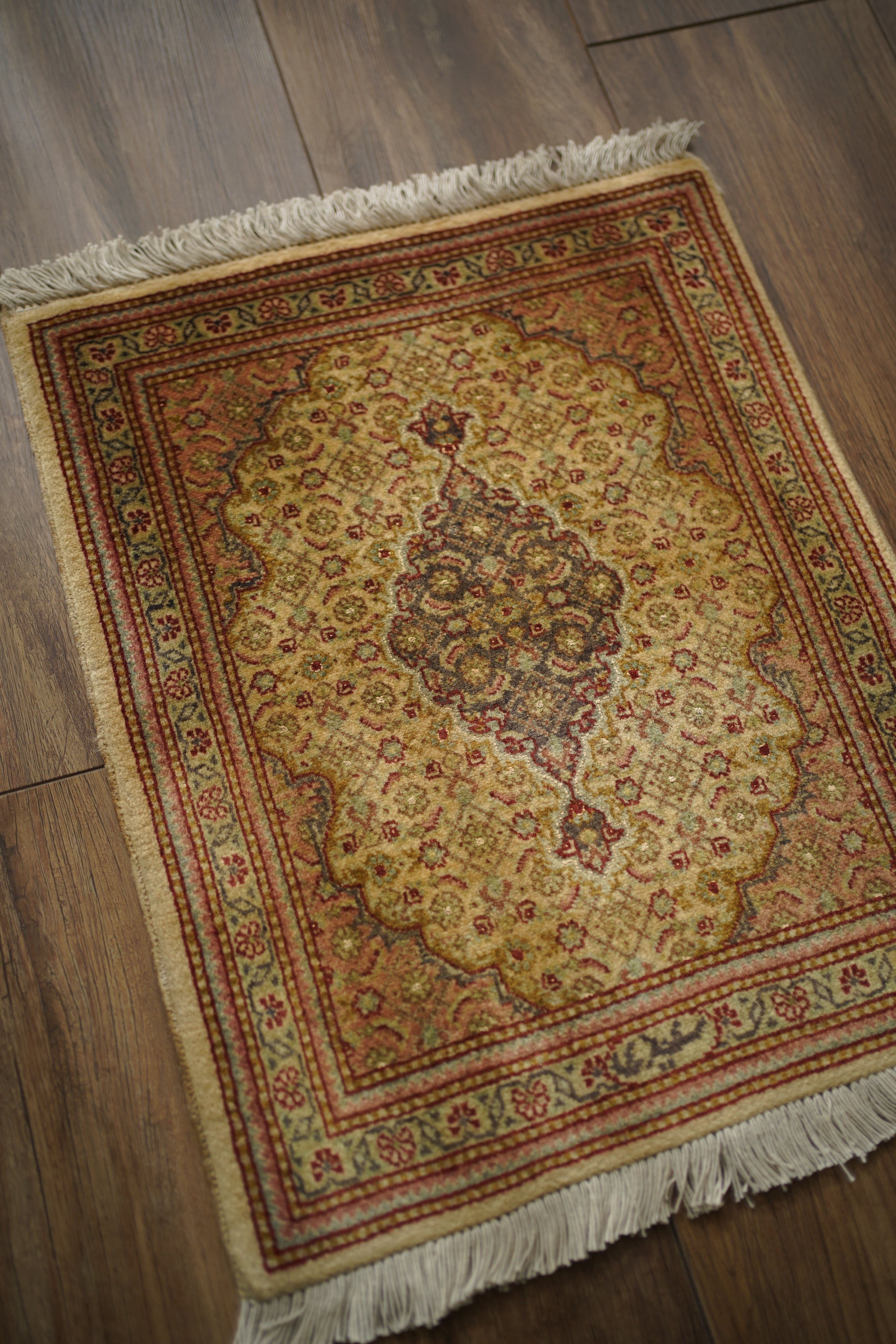 イラン北西部に位置する都市ビジャーで、クルド人によって織られたペルシャラグです。デザインは4枚のアカンサスの葉に囲まれた菱形モチーフが連続する「ヘラティ紋様(マヒ)」柄。中央のメダリオンを軸に、細やかな意匠が美しく広がっており、ボーダーには小花文様が織り込まれています。配色は、よもぎ色や若葉色を基調に、くすんだピンクやベージュ、赤茶などが使われた落ち着きのあるトーン。華やかさというよりも、しっとりとした深みを感じさせる色合いです。厚みは約6mmほどで、表面はサラッとした滑らかな肌触りをしています。目立ったダメージや補修跡もなく、大変良好なコンディションです。ラックやサイドボードの上に敷いてお気に入りの小物を飾ったり、小ぶりな観葉植物の下に合わせたりと、空間のさりげないアクセントとしてお楽しみいただけます。また、壁に掛けてタペストリーのように飾っていただくのもおすすめです。