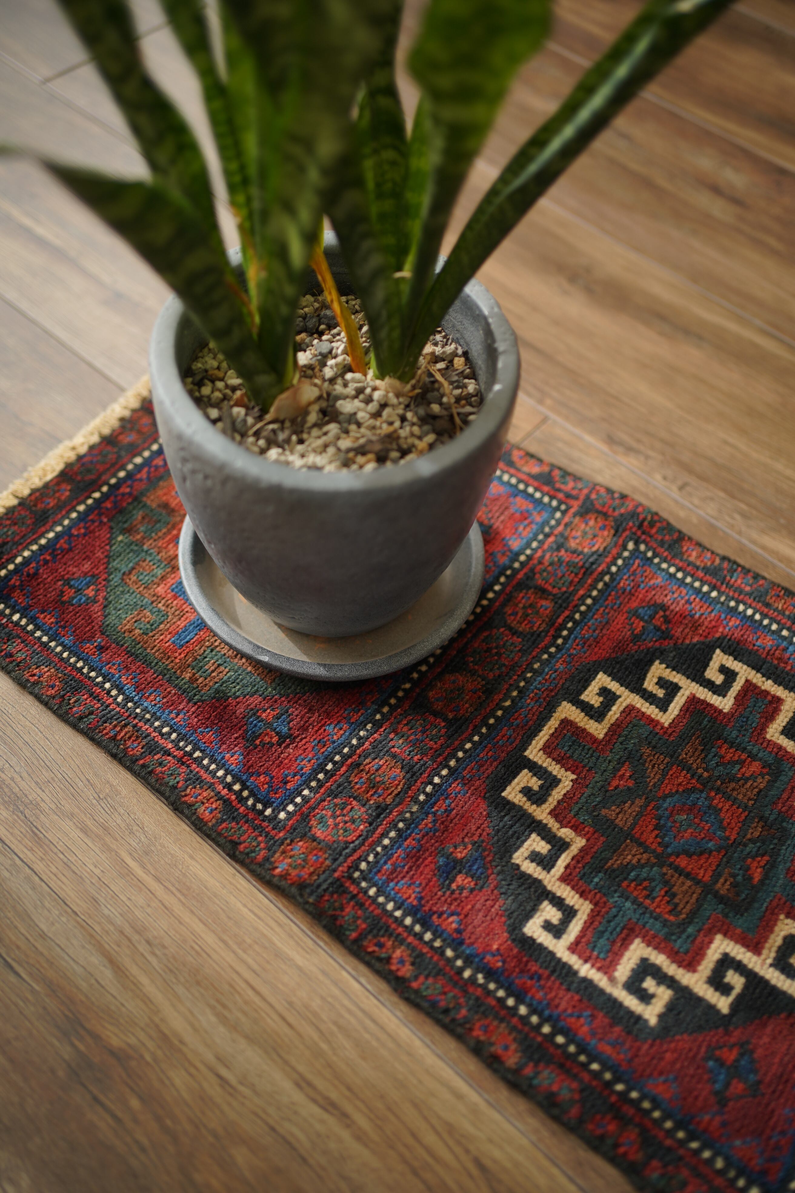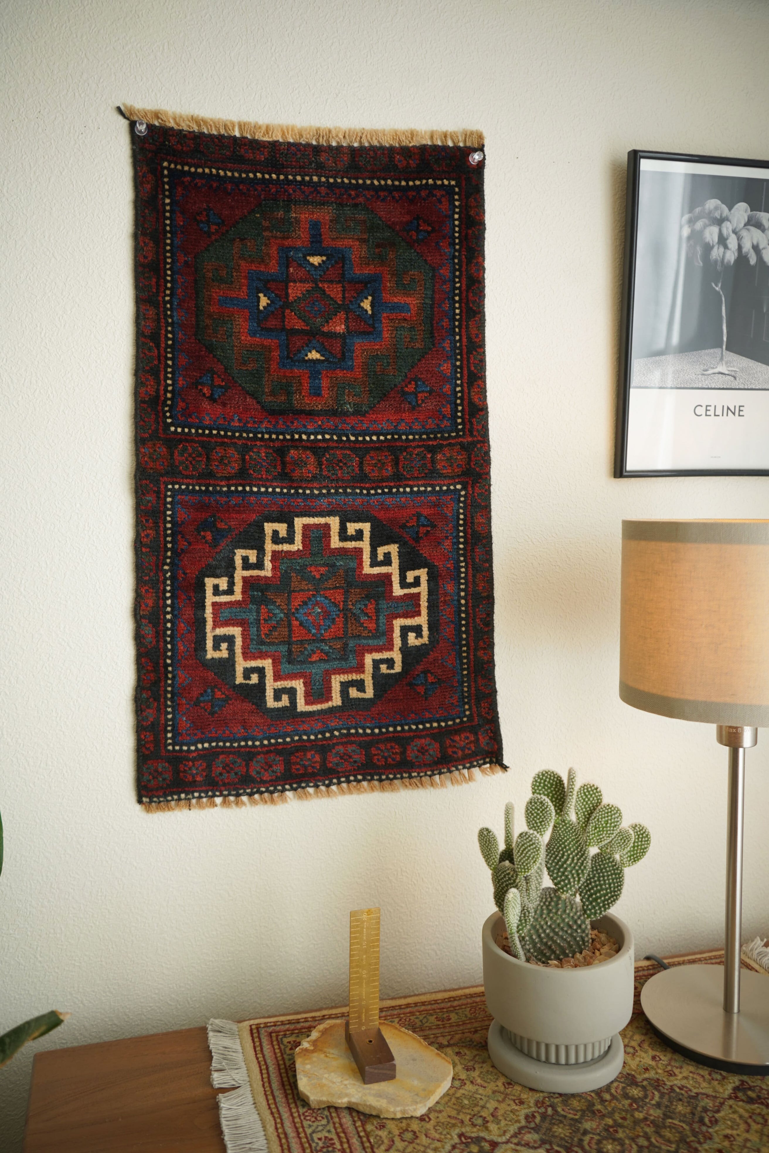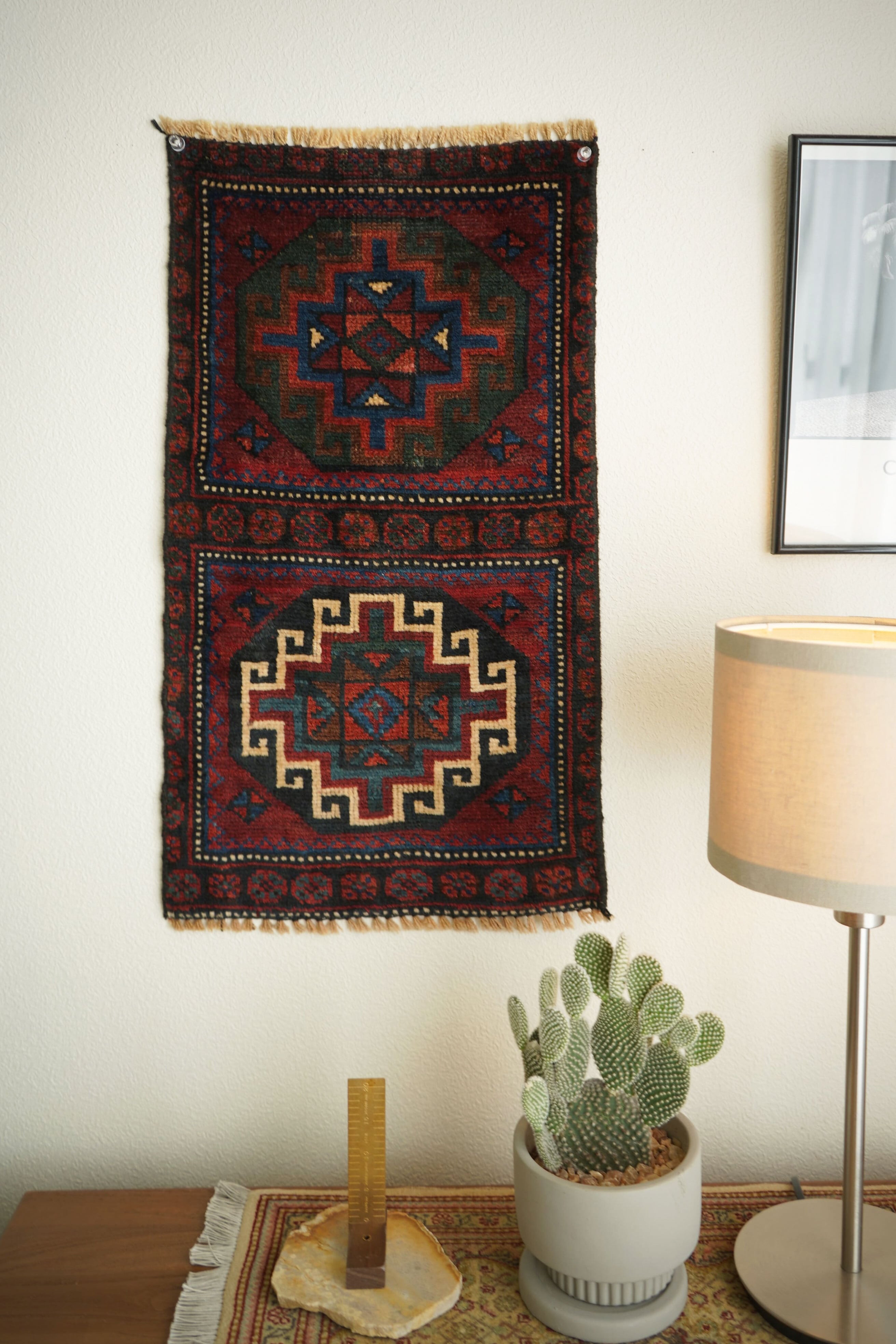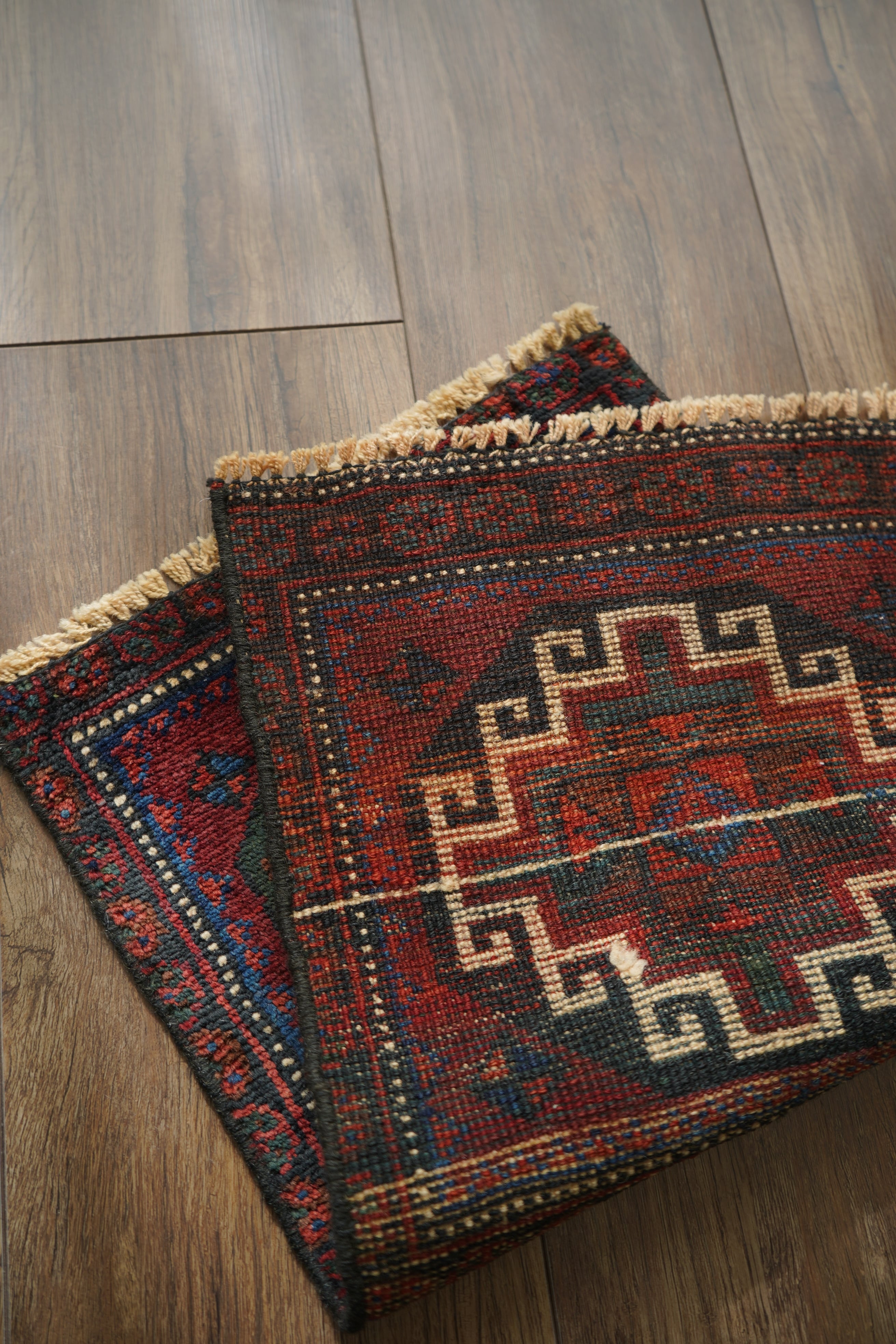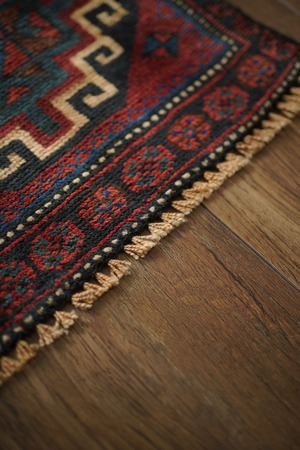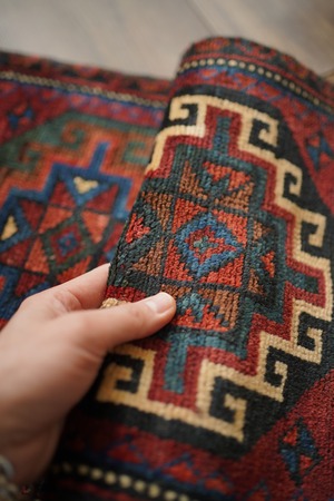 イラン西部〜イラク北部にかけて暮らすクルド族の手によって織られたラグです。深みのあるワインレッドを基調に、上下で紋様に異なる配色が施された、ひと目で印象に残るユニークなデザインが特徴的。厚みは約5〜6mmほどで、表面はサラッとした肌触りで扱いやすい質感です。目立ったダメージもなく大変良好なコンディション。壁に掛けてタペストリーのように飾ったり、ラックやサイドボードの上に敷いて小物を引き立てたり、小ぶりな観葉植物の下に合わせたり。空間にさりげない個性と彩りを添えてくれる一枚です。