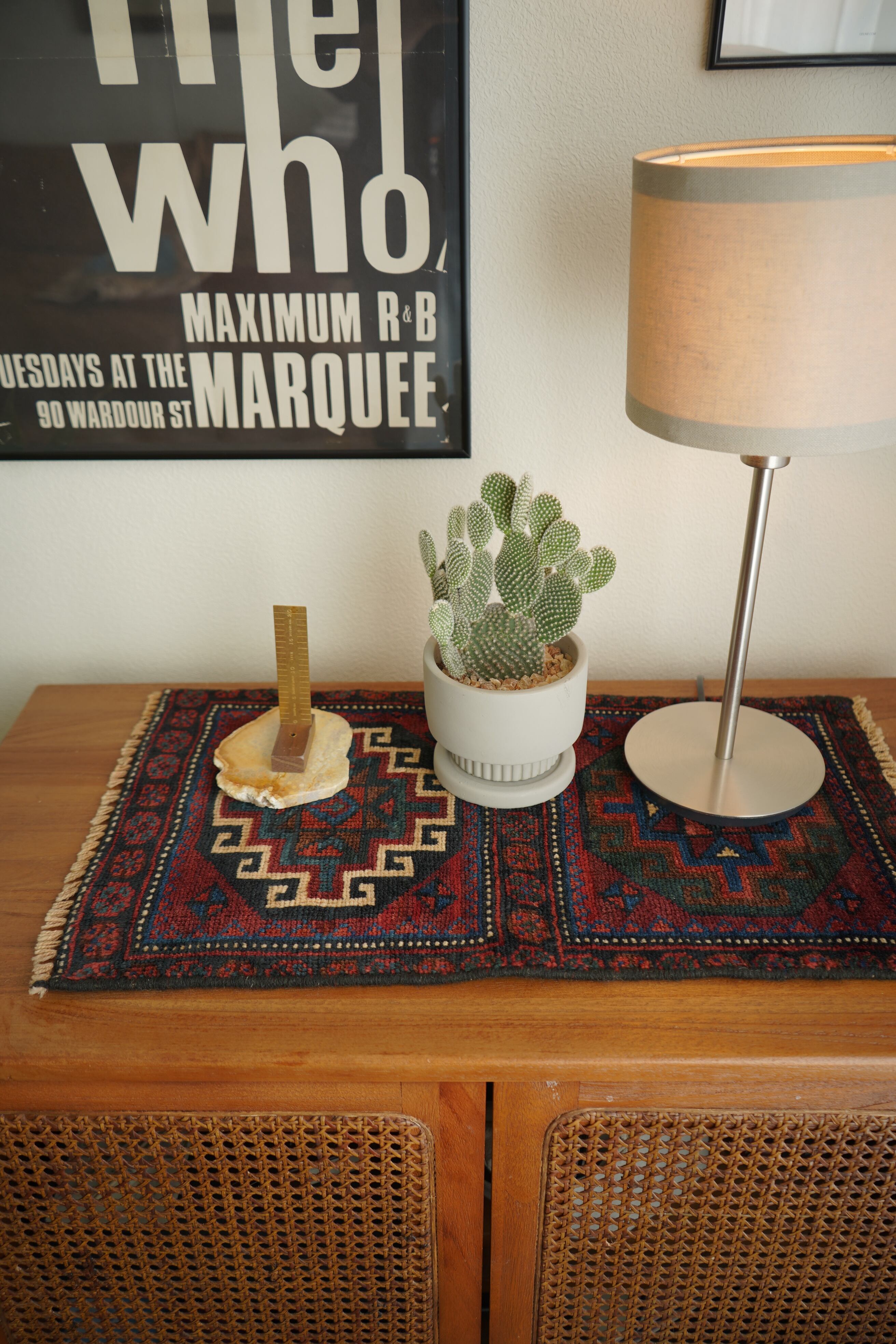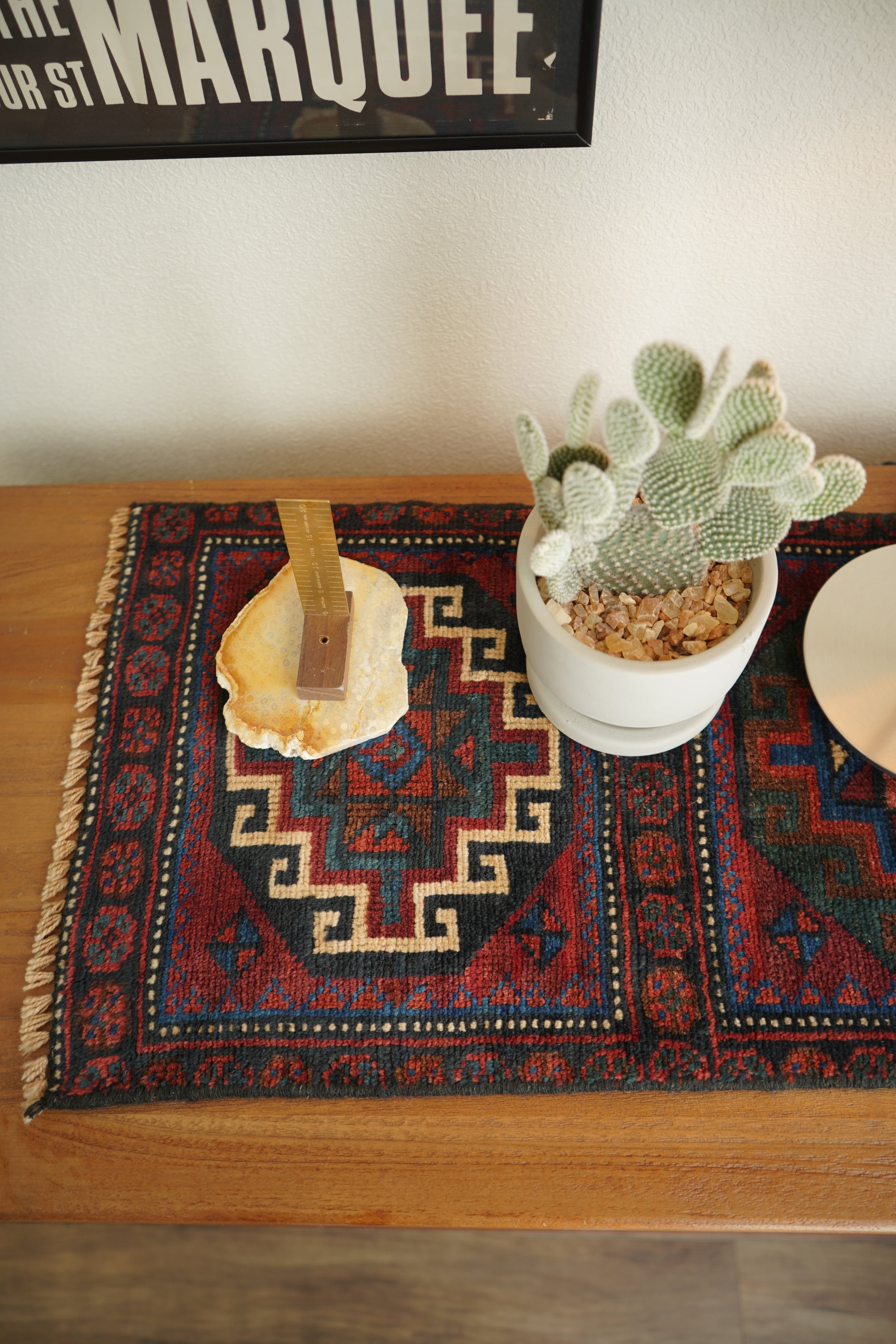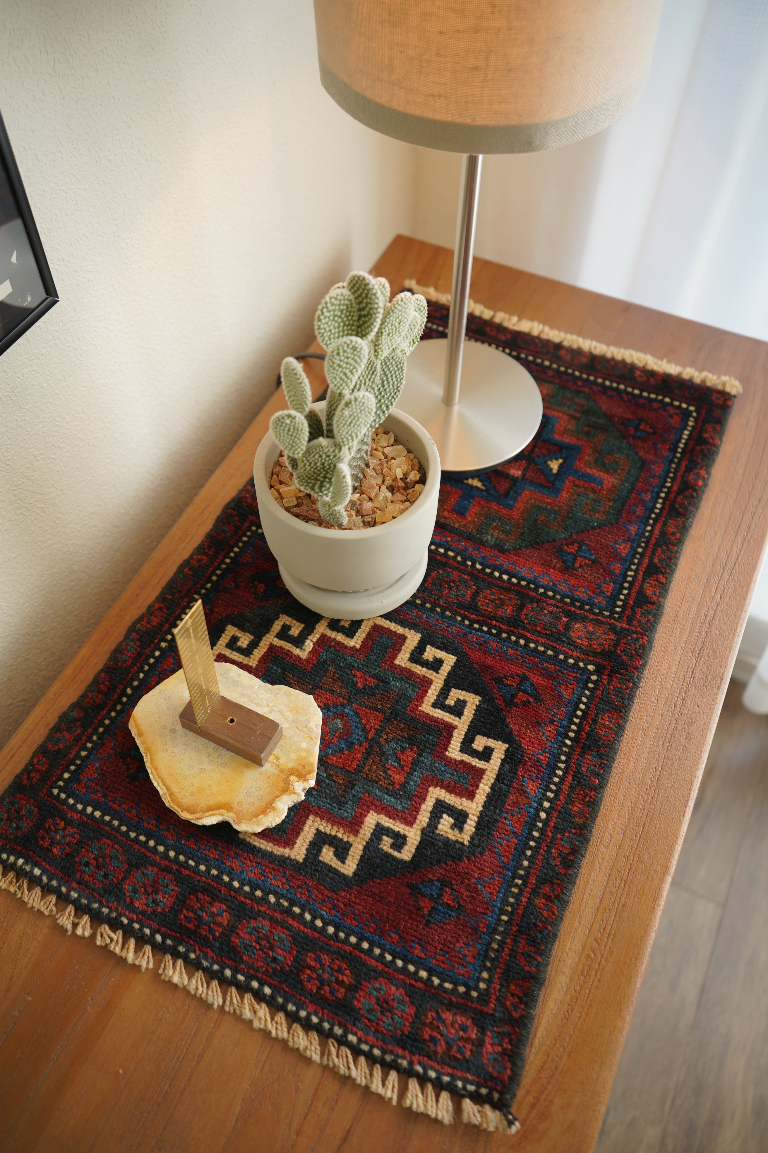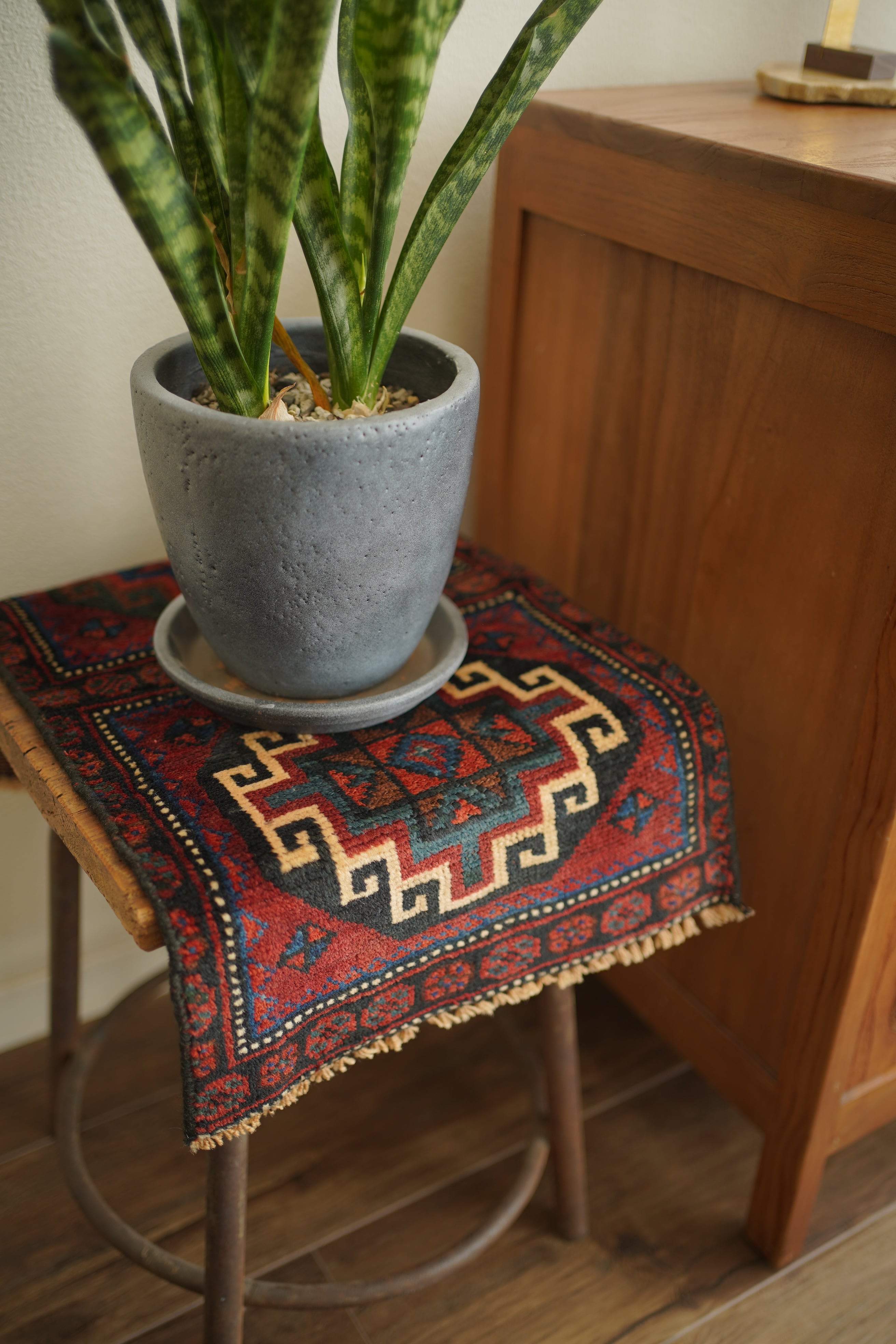 イラン西部〜イラク北部にかけて暮らすクルド族の手によって織られたラグです。深みのあるワインレッドを基調に、上下で紋様に異なる配色が施された、ひと目で印象に残るユニークなデザインが特徴的。厚みは約5〜6mmほどで、表面はサラッとした肌触りで扱いやすい質感です。目立ったダメージもなく大変良好なコンディション。壁に掛けてタペストリーのように飾ったり、ラックやサイドボードの上に敷いて小物を引き立てたり、小ぶりな観葉植物の下に合わせたり。空間にさりげない個性と彩りを添えてくれる一枚です。