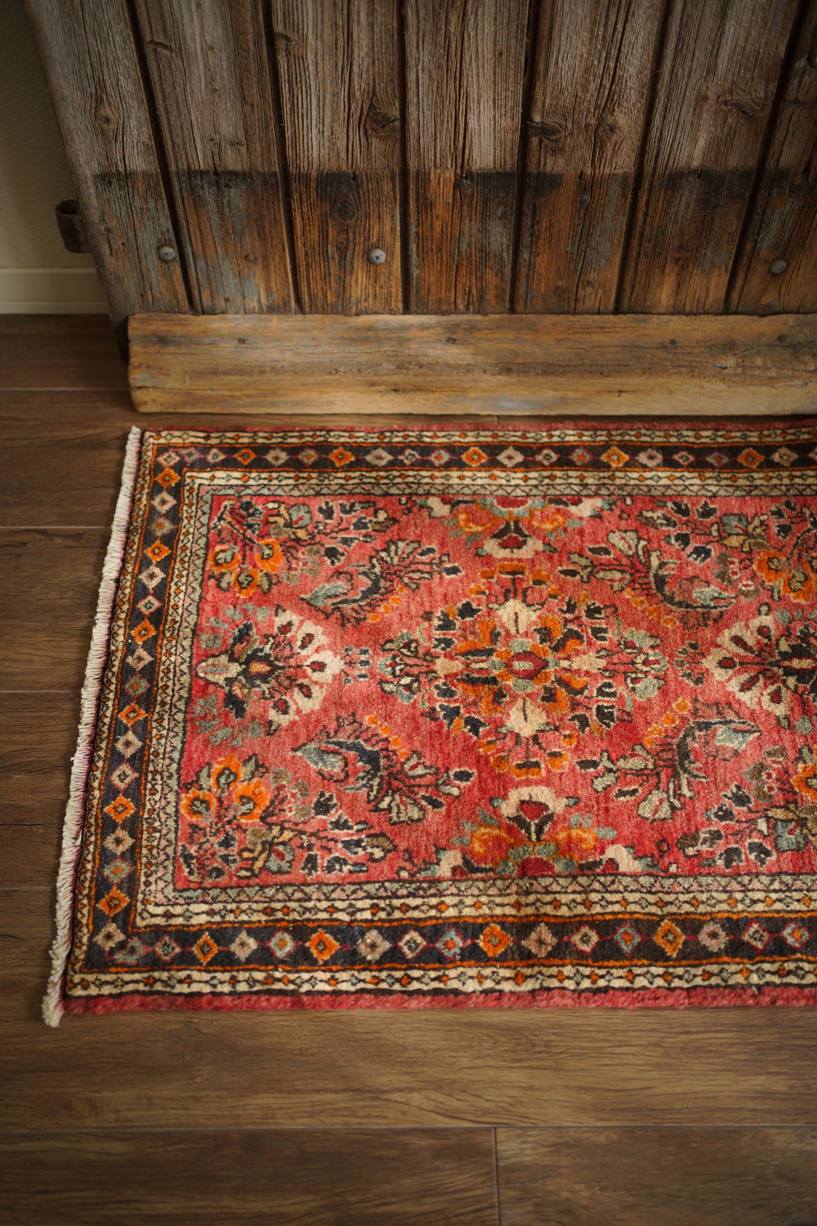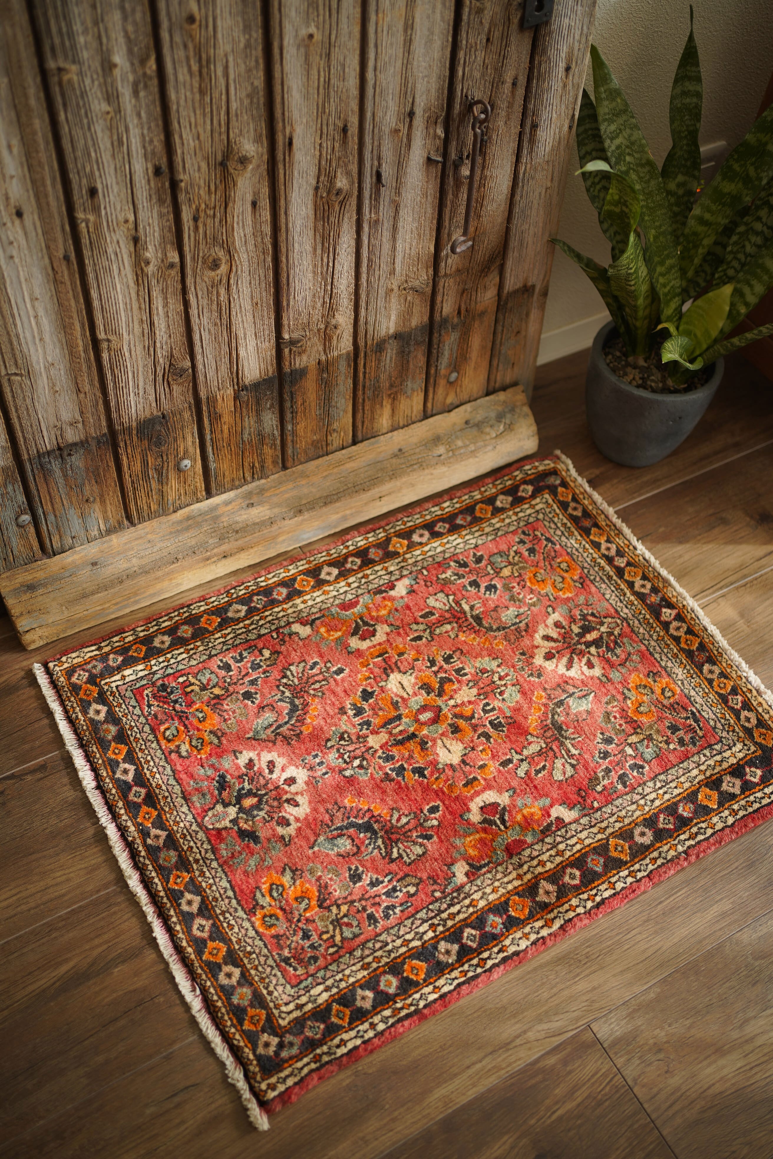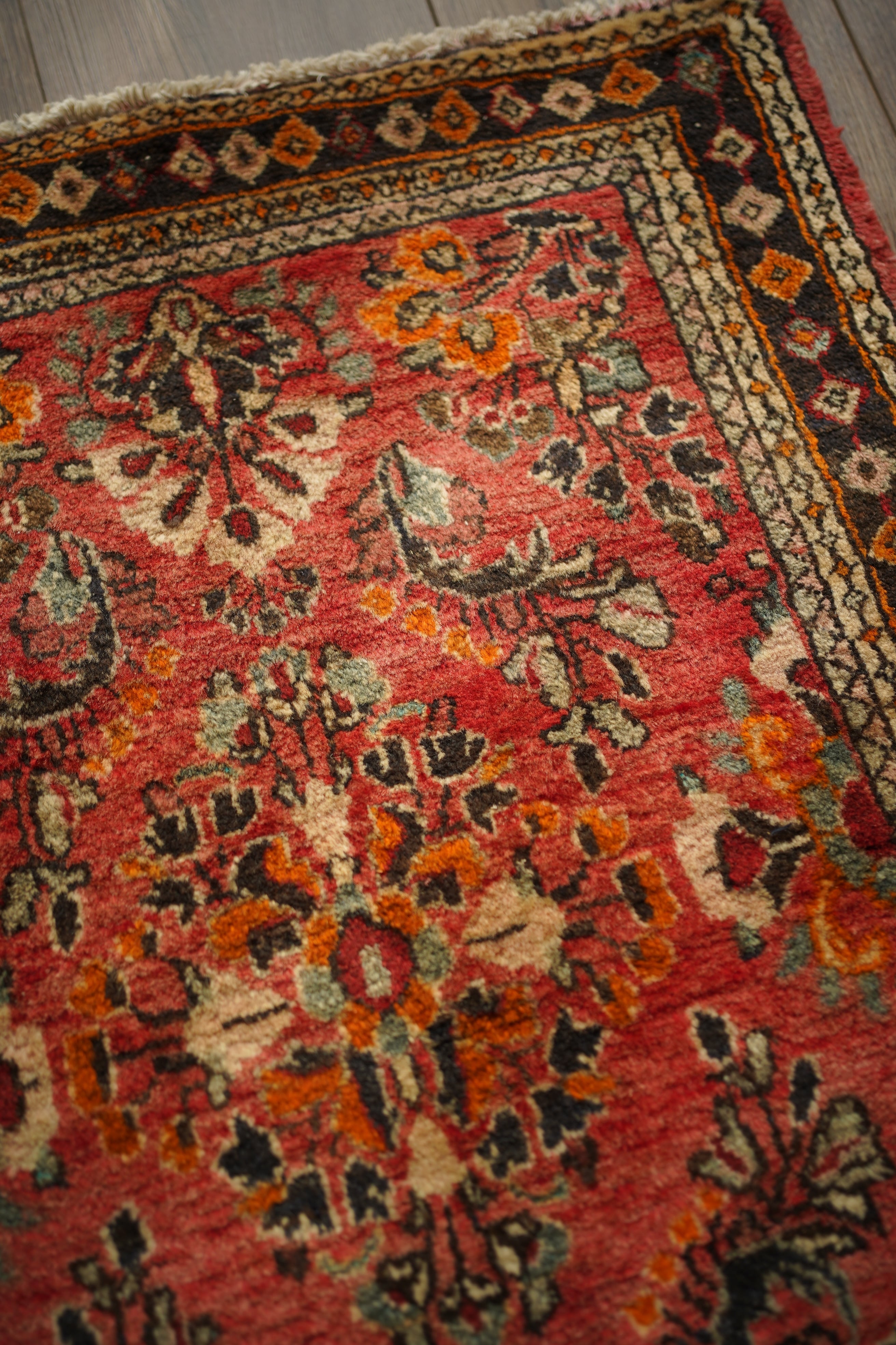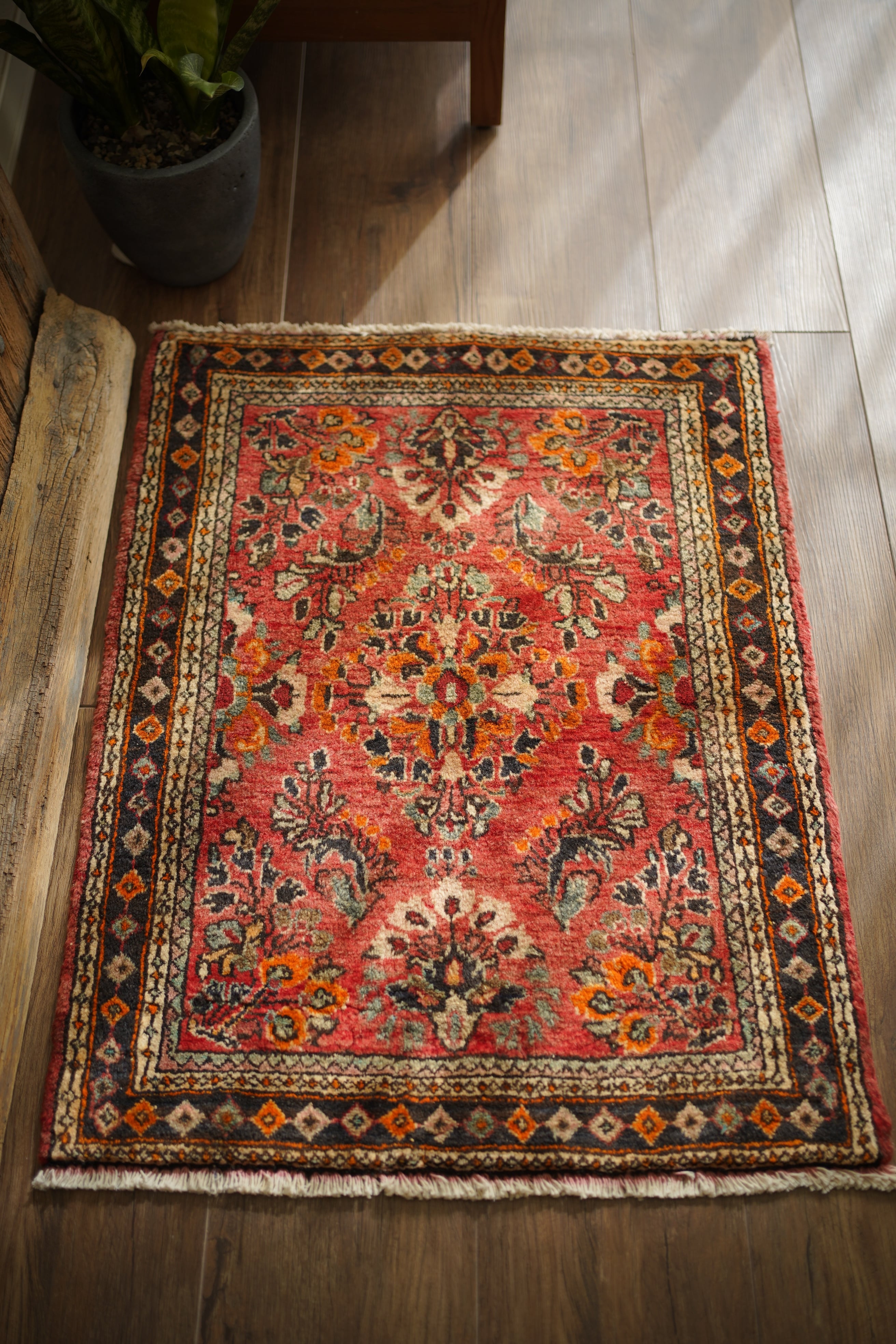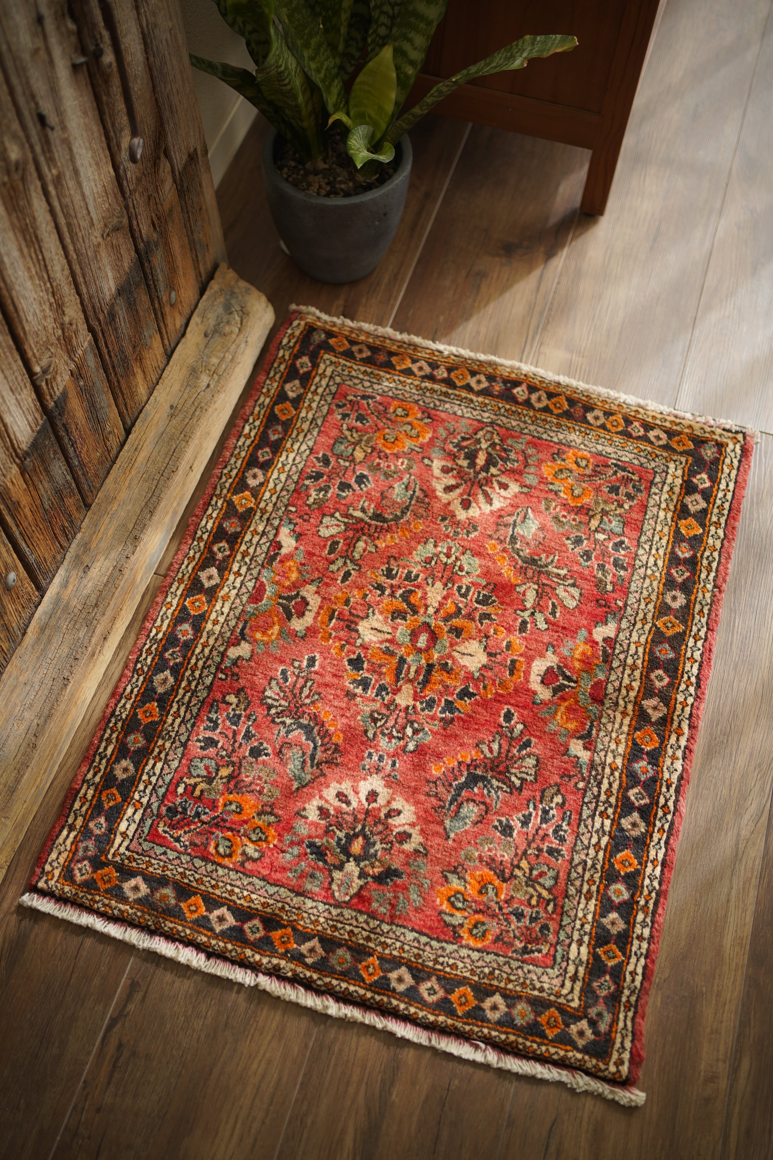 イラン中西部、アラク市(旧スルタナバード)周辺で織られたサルーク産のペルシャ絨毯。サルークのラグは美しい花柄と頑丈な作りとして世界的にも有名です。経年により退色し薄い赤色をベースに、オレンジ色、黒、くすんだコバルトグリーン、ベージュなどが使われたヴィンテージの奥行きを感じる色合いです。可愛らしくも素朴な雰囲気を感じる一枚です。厚みは1.2cm程度、表面はふわっとした優しい肌触りをしています目立ったダメージなども見受けられず良好なコンディション。コンパクトなサイズ感のため、全身鏡の前やラック前、観葉植物下などにオススメです。