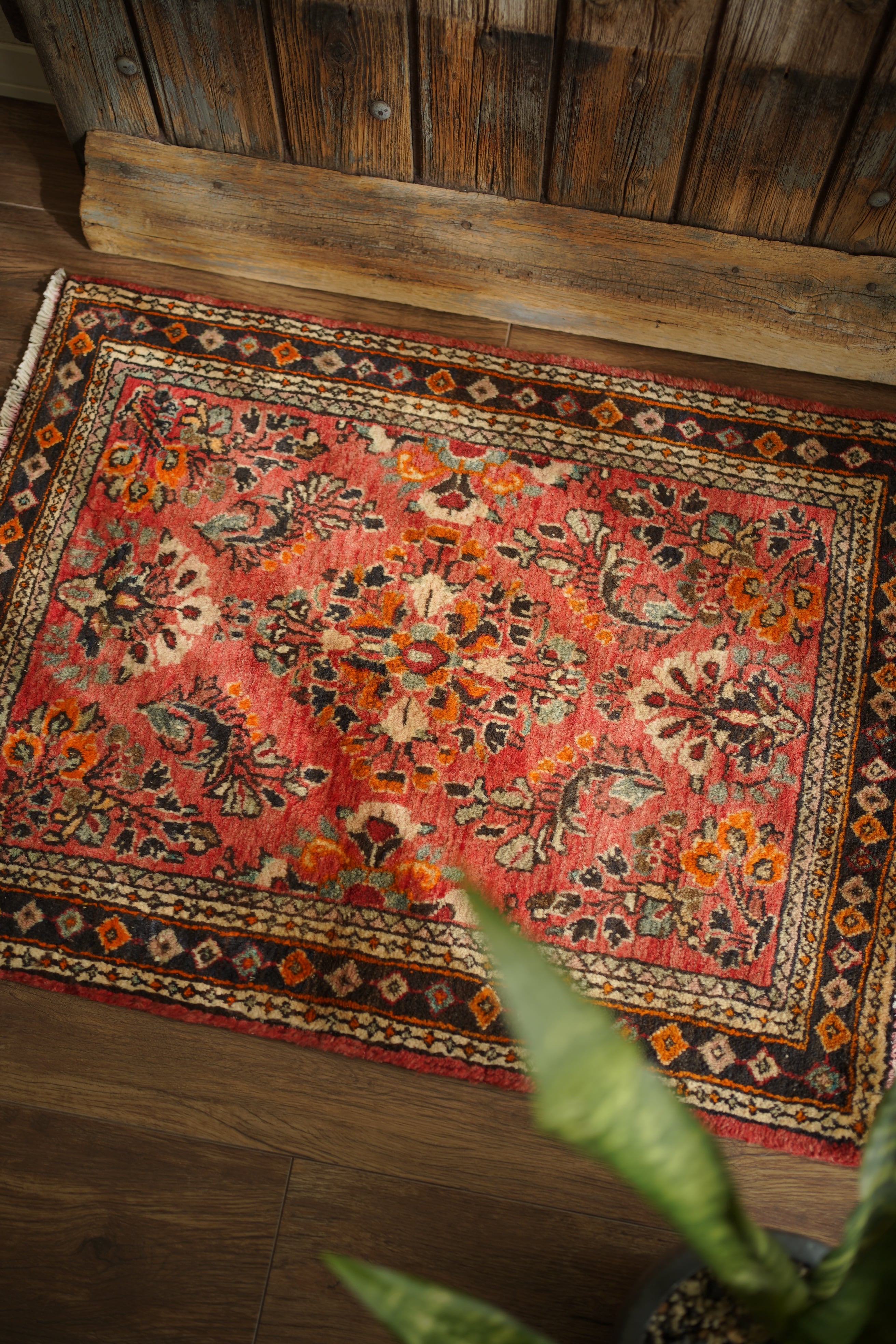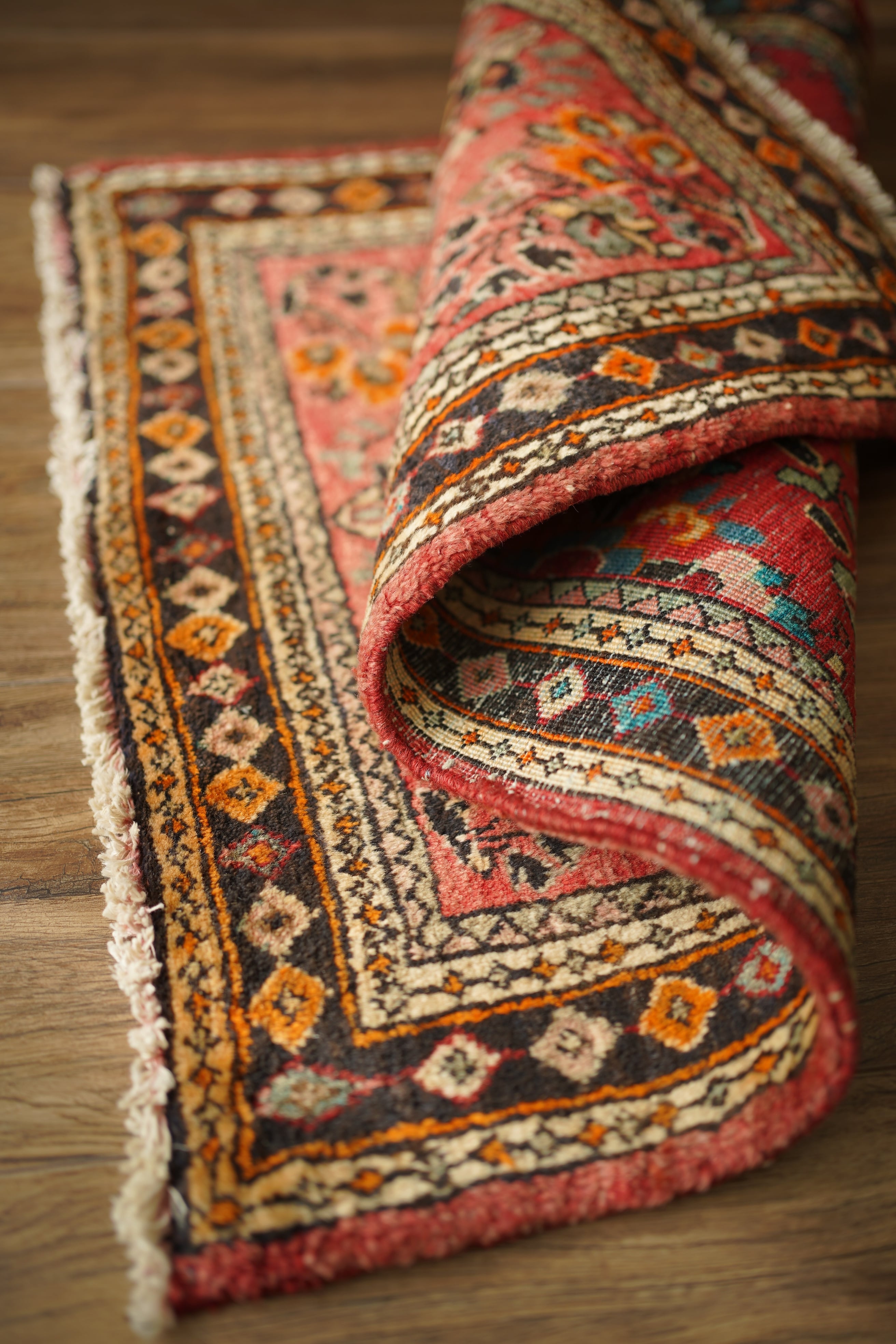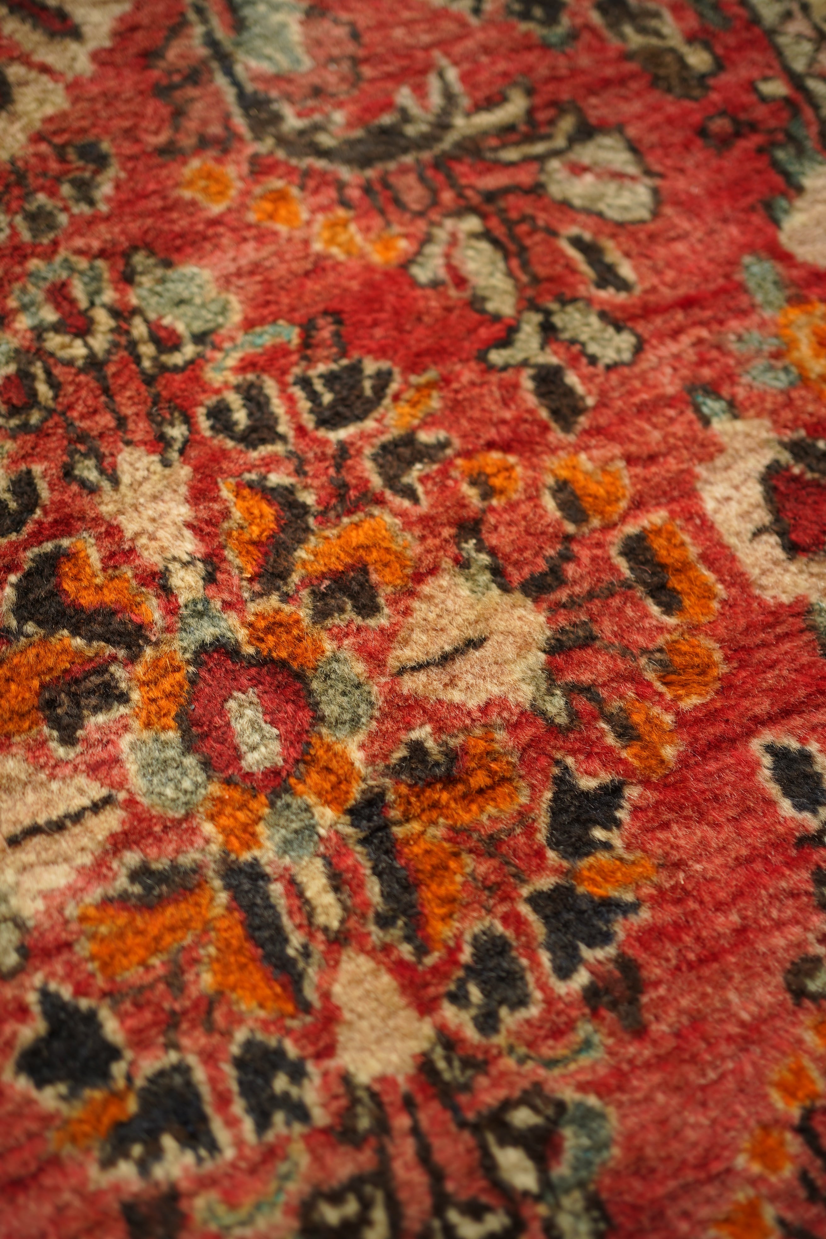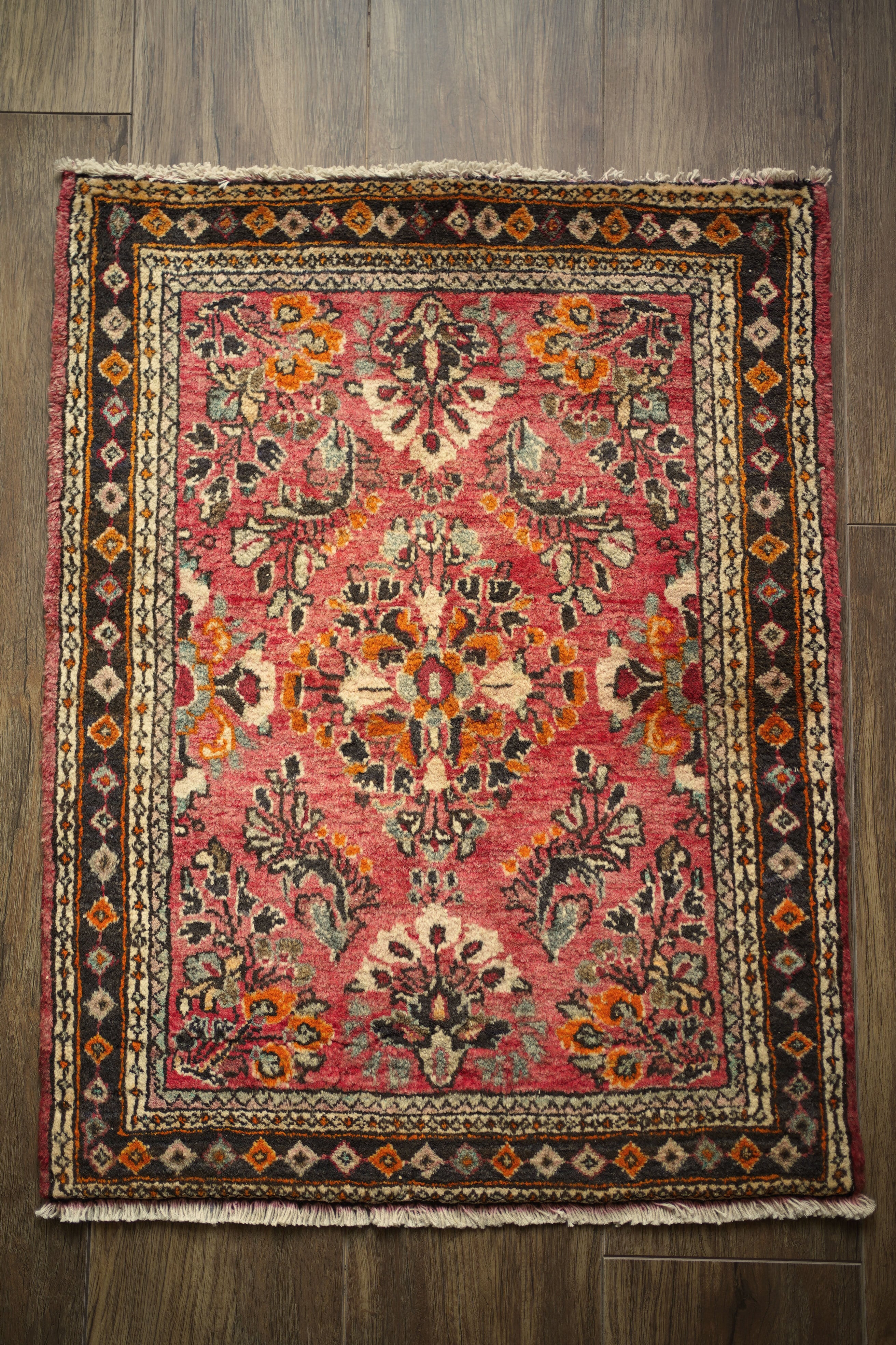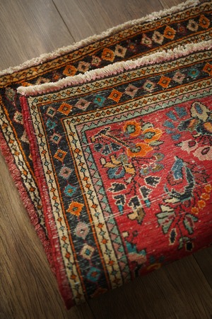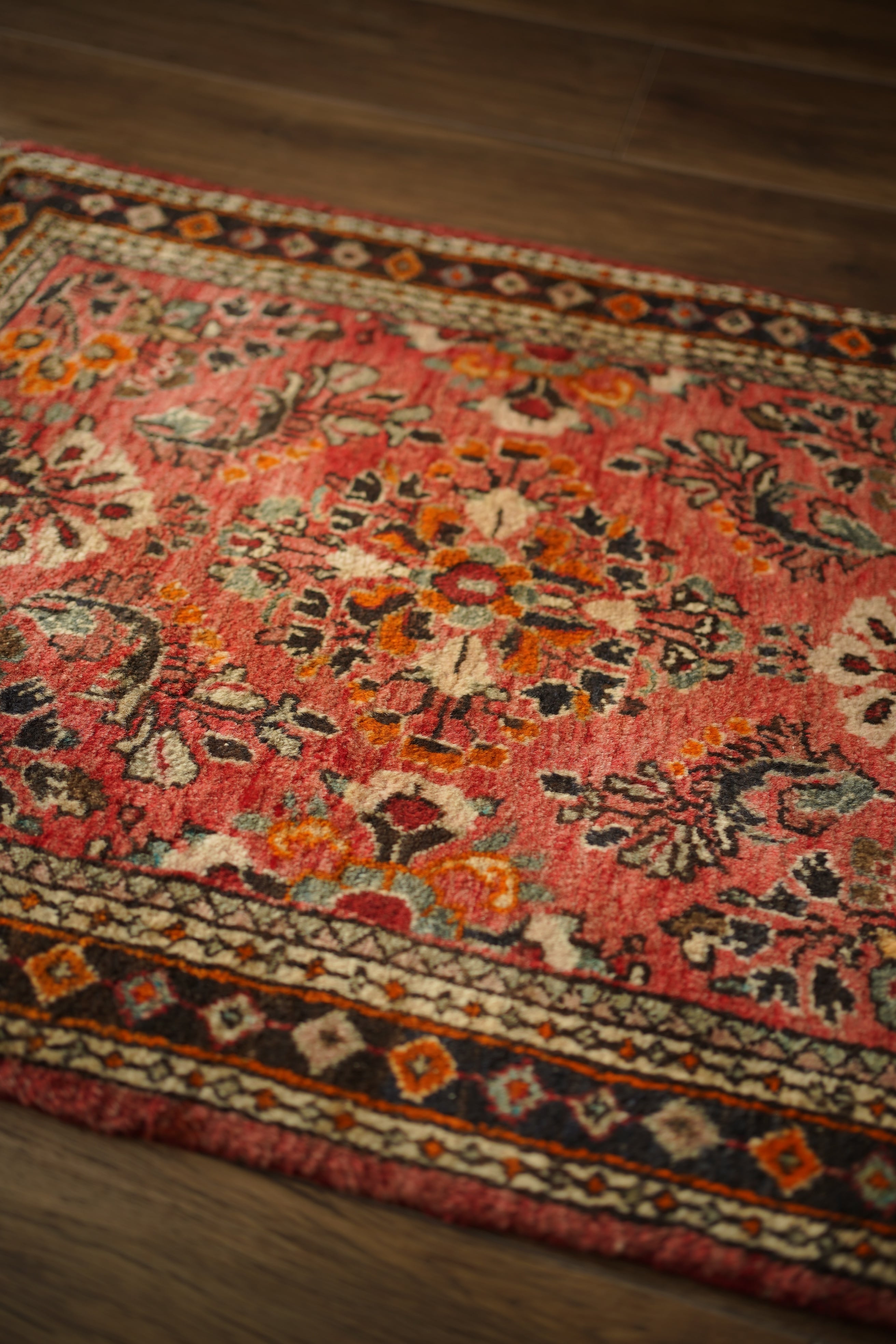 イラン中西部、アラク市(旧スルタナバード)周辺で織られたサルーク産のペルシャ絨毯。サルークのラグは美しい花柄と頑丈な作りとして世界的にも有名です。経年により退色し薄い赤色をベースに、オレンジ色、黒、くすんだコバルトグリーン、ベージュなどが使われたヴィンテージの奥行きを感じる色合いです。可愛らしくも素朴な雰囲気を感じる一枚です。厚みは1.2cm程度、表面はふわっとした優しい肌触りをしています目立ったダメージなども見受けられず良好なコンディション。コンパクトなサイズ感のため、全身鏡の前やラック前、観葉植物下などにオススメです。