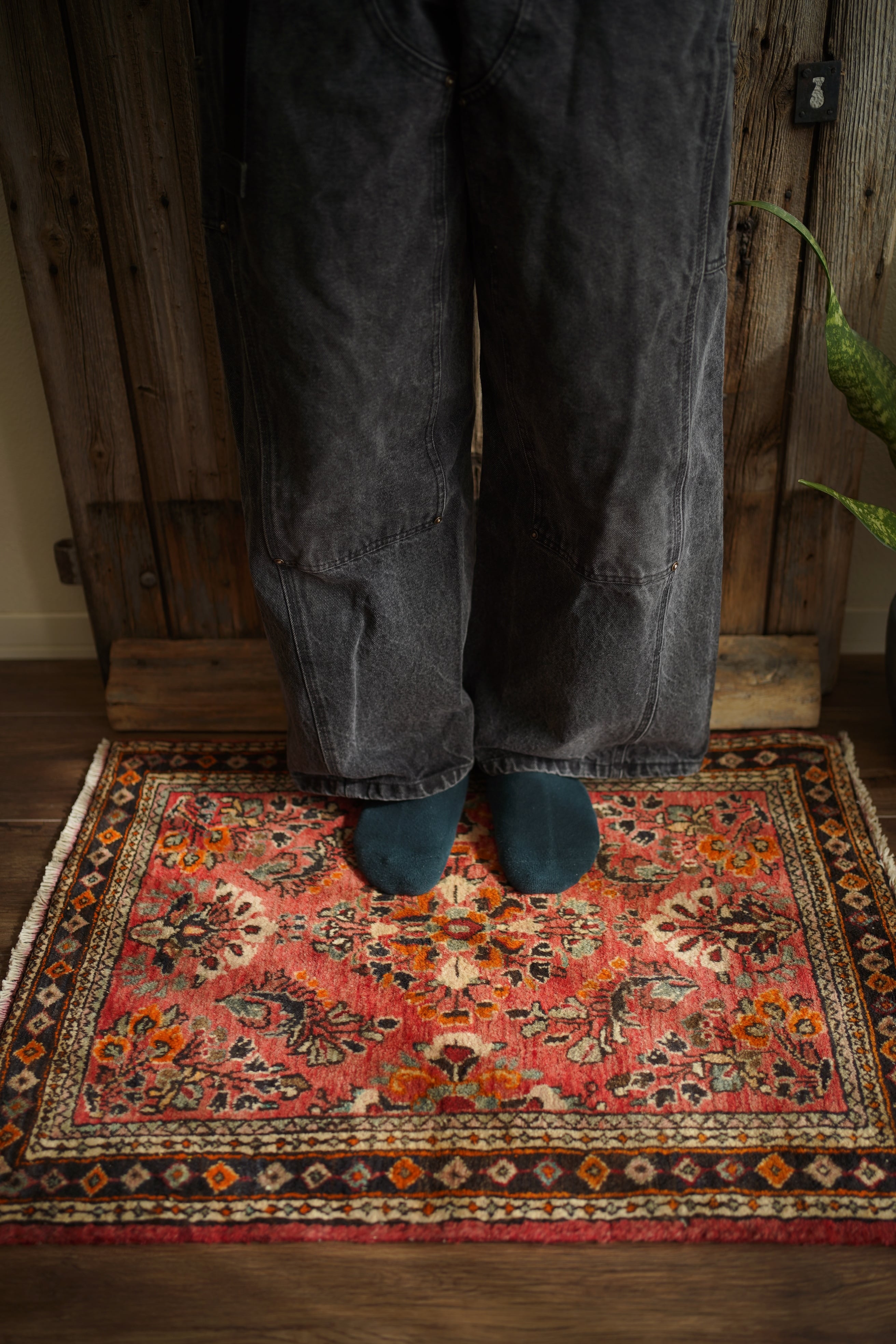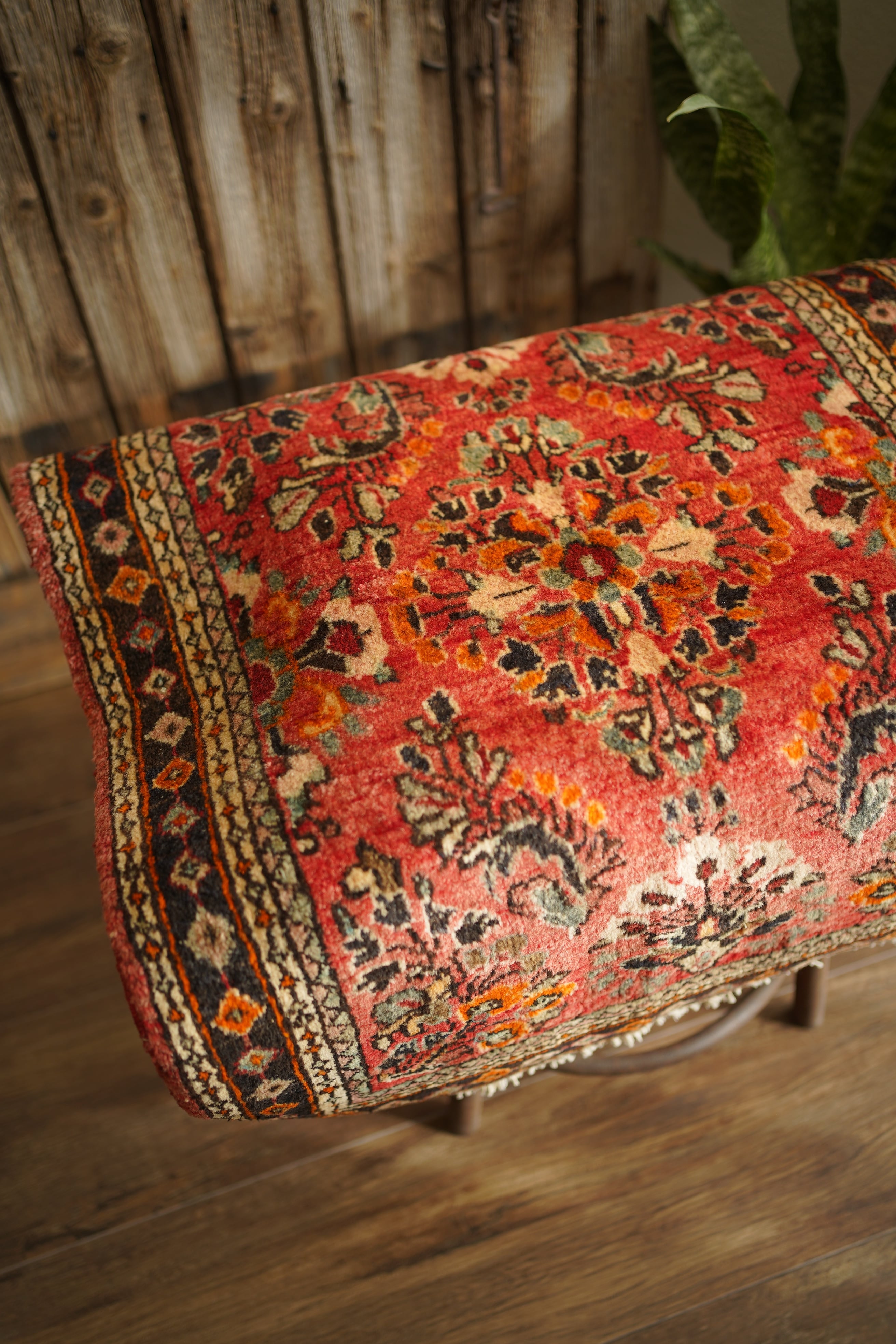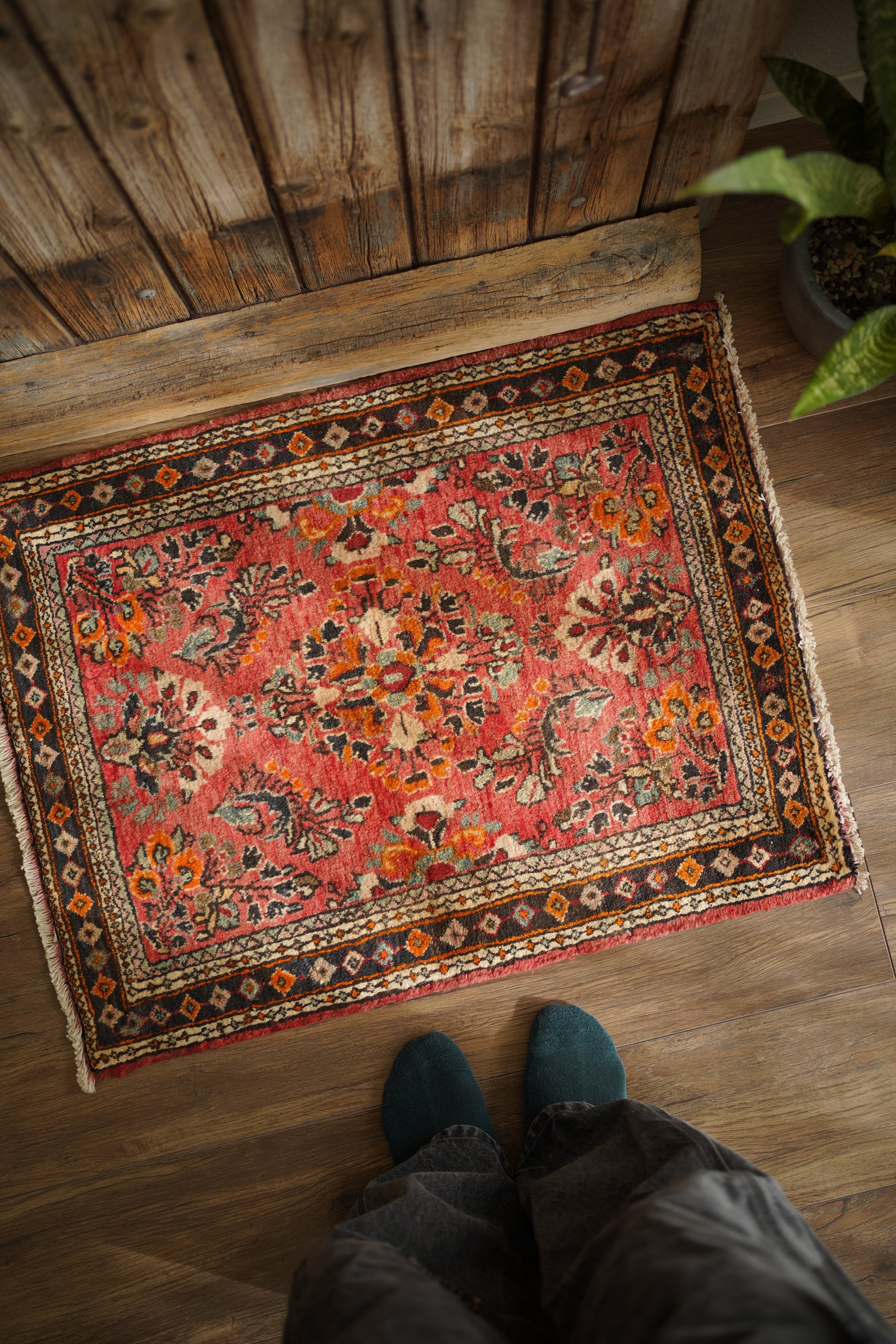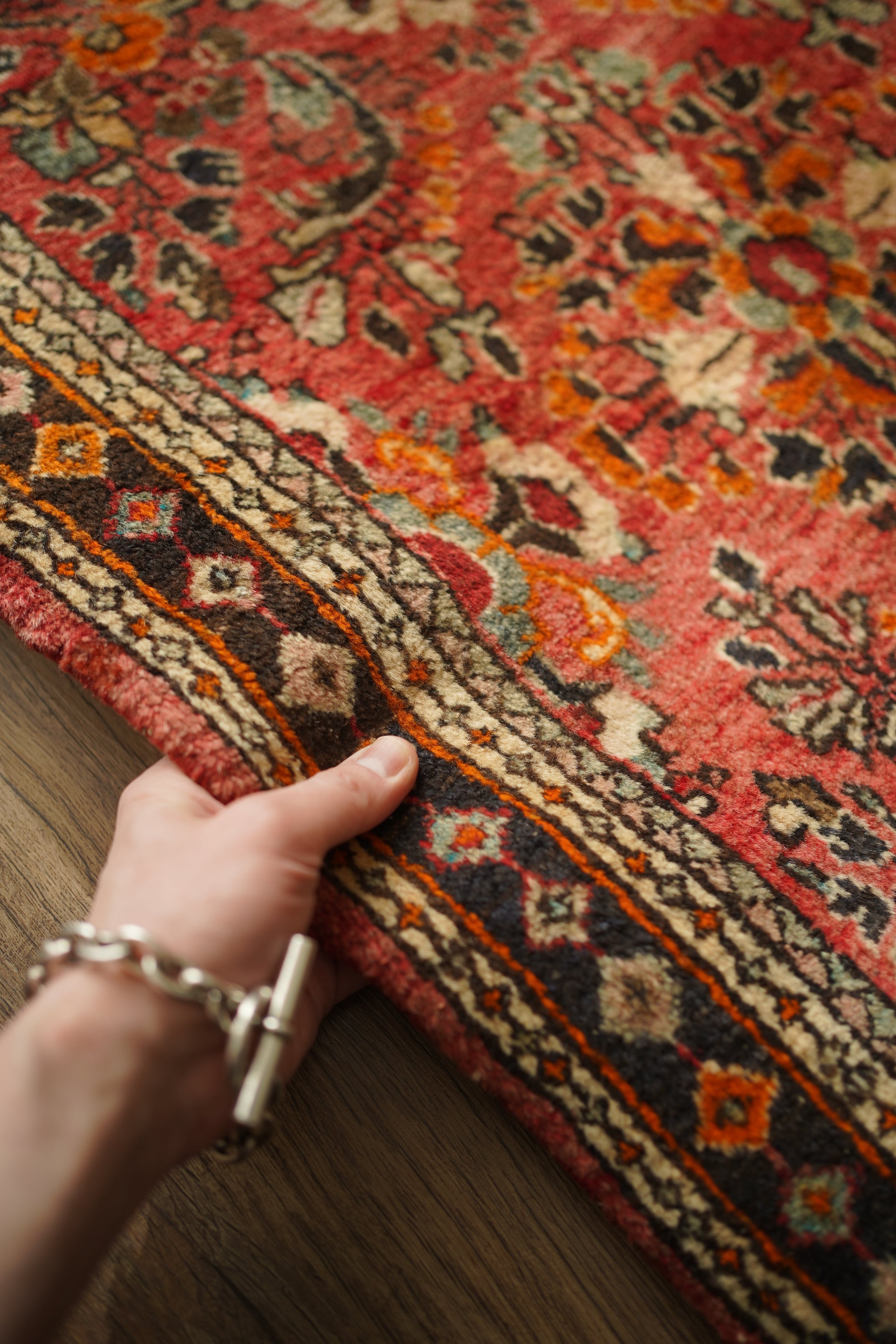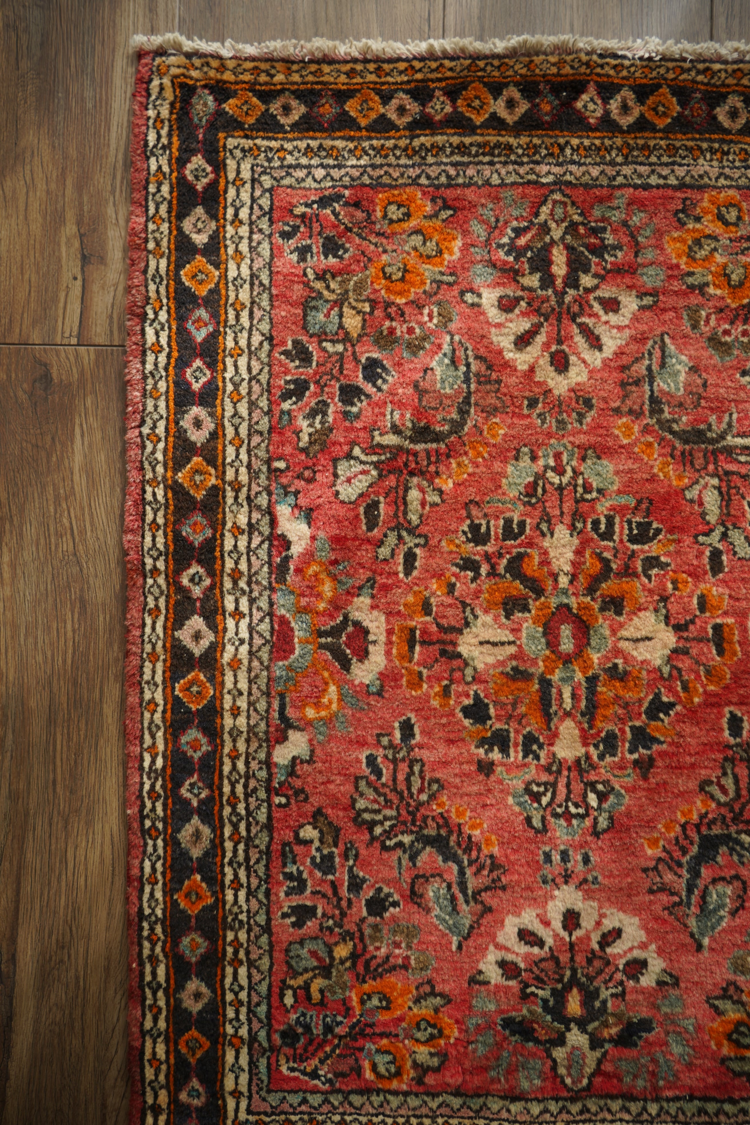 イラン中西部、アラク市(旧スルタナバード)周辺で織られたサルーク産のペルシャ絨毯。サルークのラグは美しい花柄と頑丈な作りとして世界的にも有名です。経年により退色し薄い赤色をベースに、オレンジ色、黒、くすんだコバルトグリーン、ベージュなどが使われたヴィンテージの奥行きを感じる色合いです。可愛らしくも素朴な雰囲気を感じる一枚です。厚みは1.2cm程度、表面はふわっとした優しい肌触りをしています目立ったダメージなども見受けられず良好なコンディション。コンパクトなサイズ感のため、全身鏡の前やラック前、観葉植物下などにオススメです。