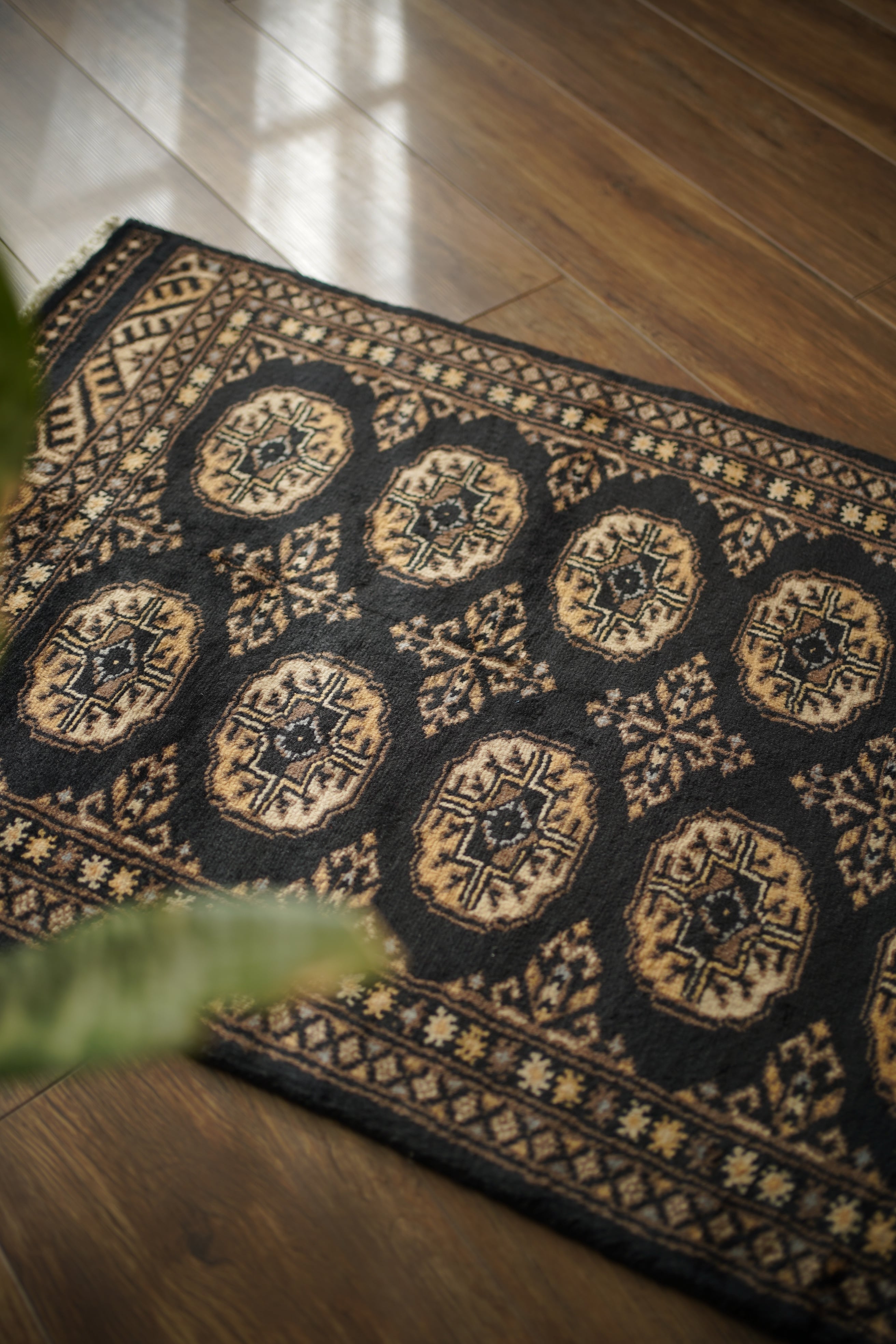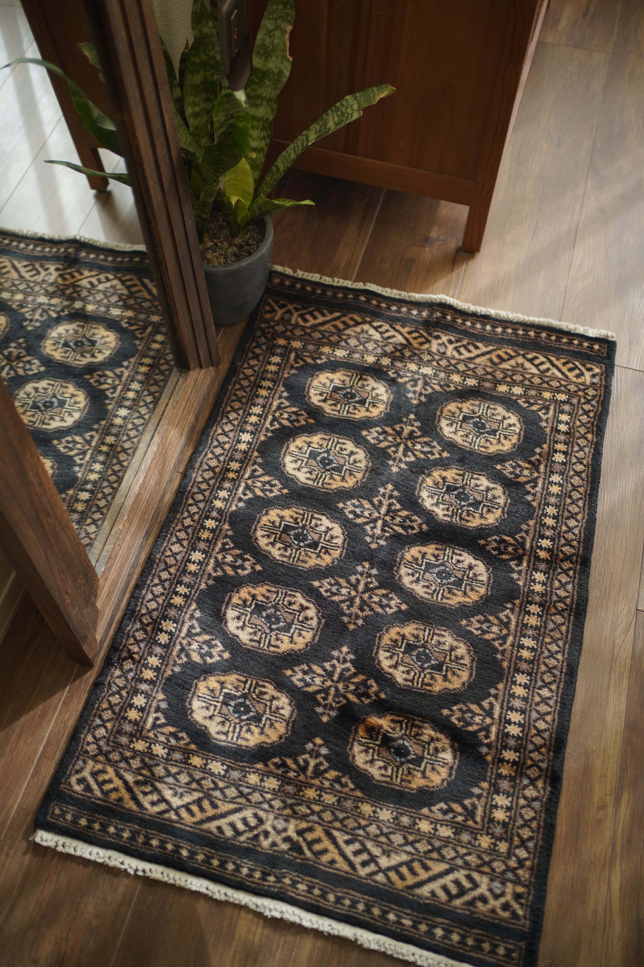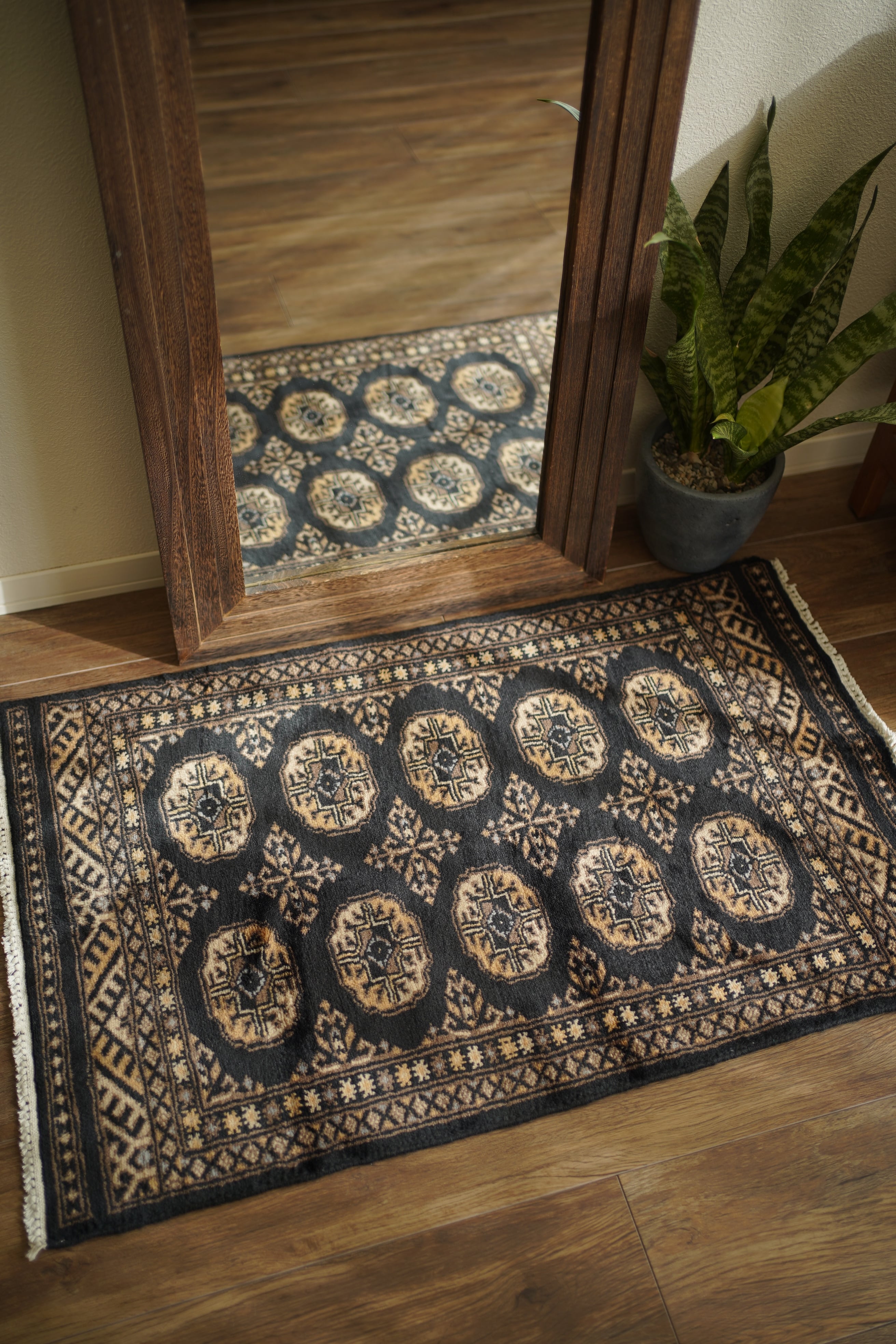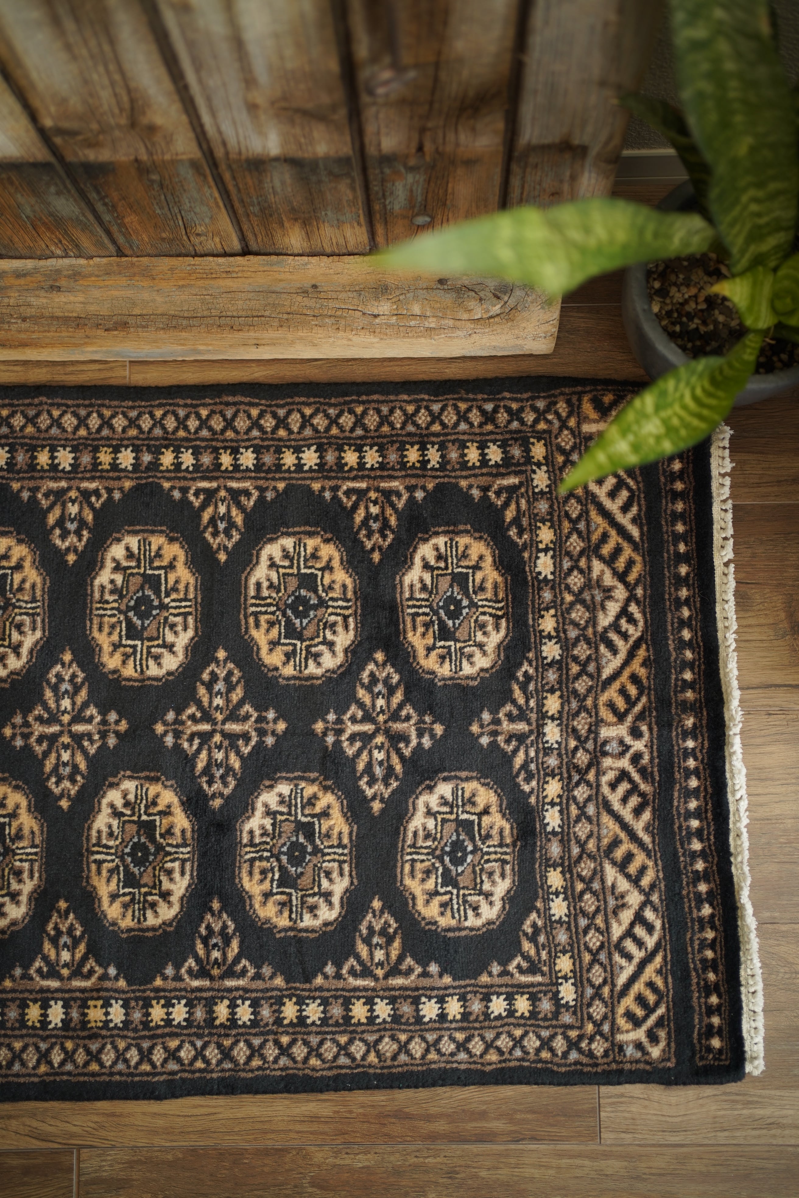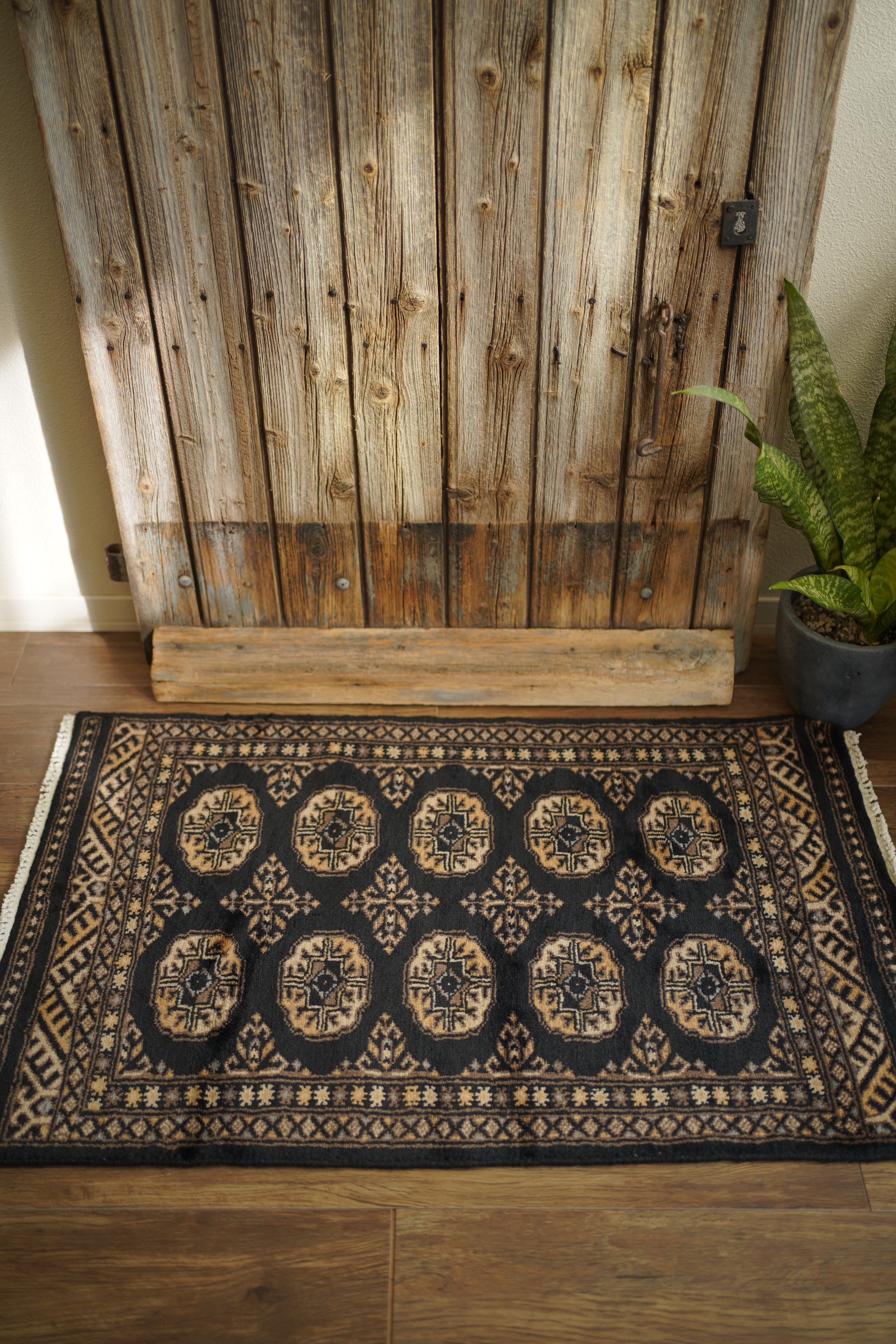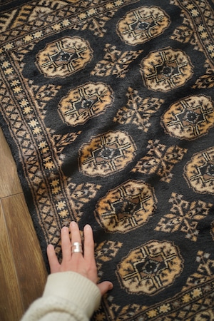 パキスタン北東部の都市ラホールで織られたヴィンテージラグ。“ボハラ”と呼ばれる、象の足跡をモチーフにした紋様が織り込まれたデザインです。黒をベースに、キャメルや薄茶色、ベージュを中心とした落ち着いた配色に、ほんのりと水色を含んだグレーがアクセントとして効いている点が、店主の心を惹きつけたポイントです。落ち着きのある格好良さを持ち、さまざまなインテリアに自然と溶け込みながら、空間に上品な存在感を添えてくれるかと思います。表面はソフトウールで、ふんわりと柔らかく心地よい肌触り。厚みは8mm程度です。ダメージや補修された跡も見受けられず大変良好なコンディション。玄関やラック前など、幅広いシーンでお使いいただける一枚です。
