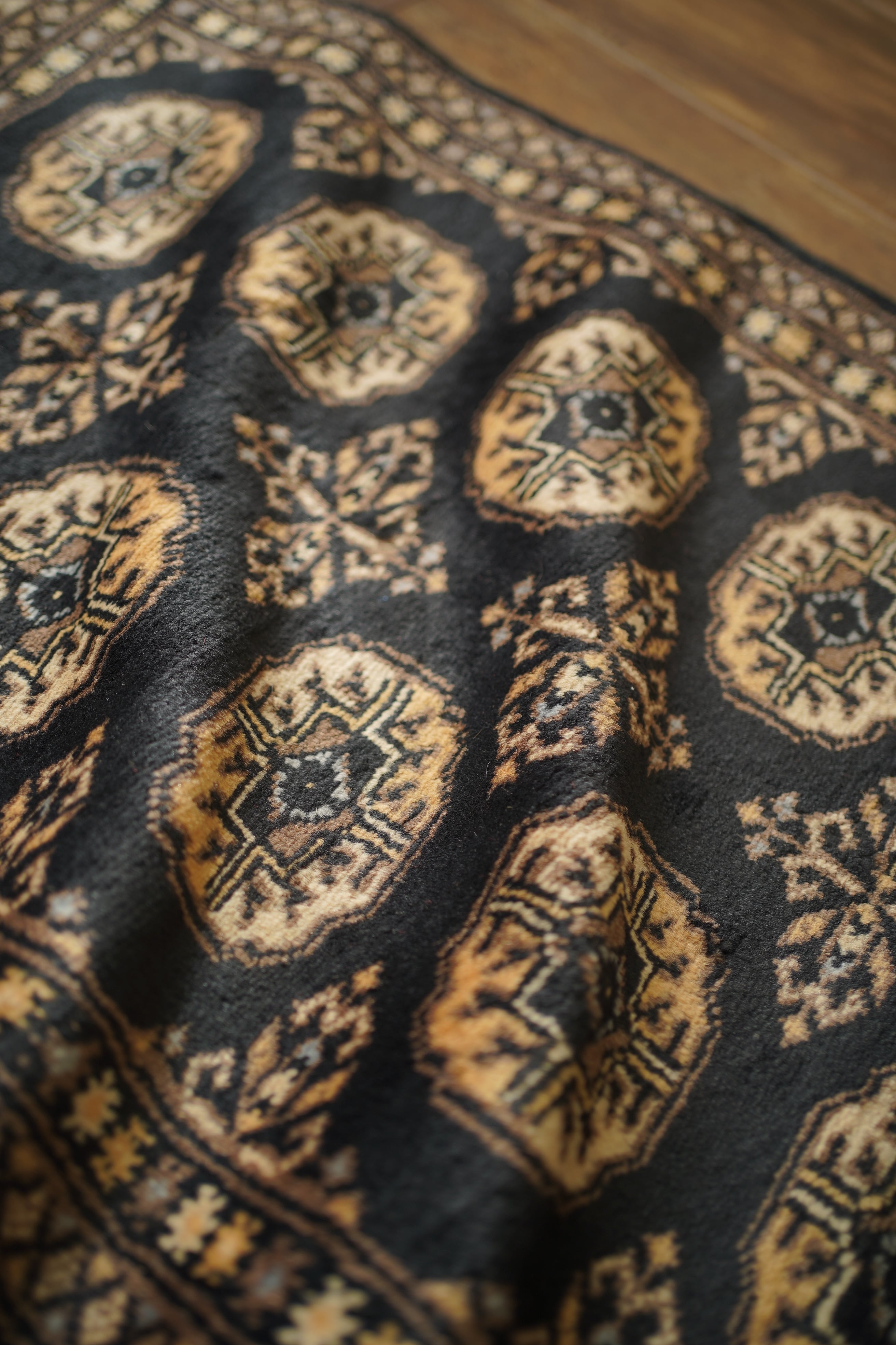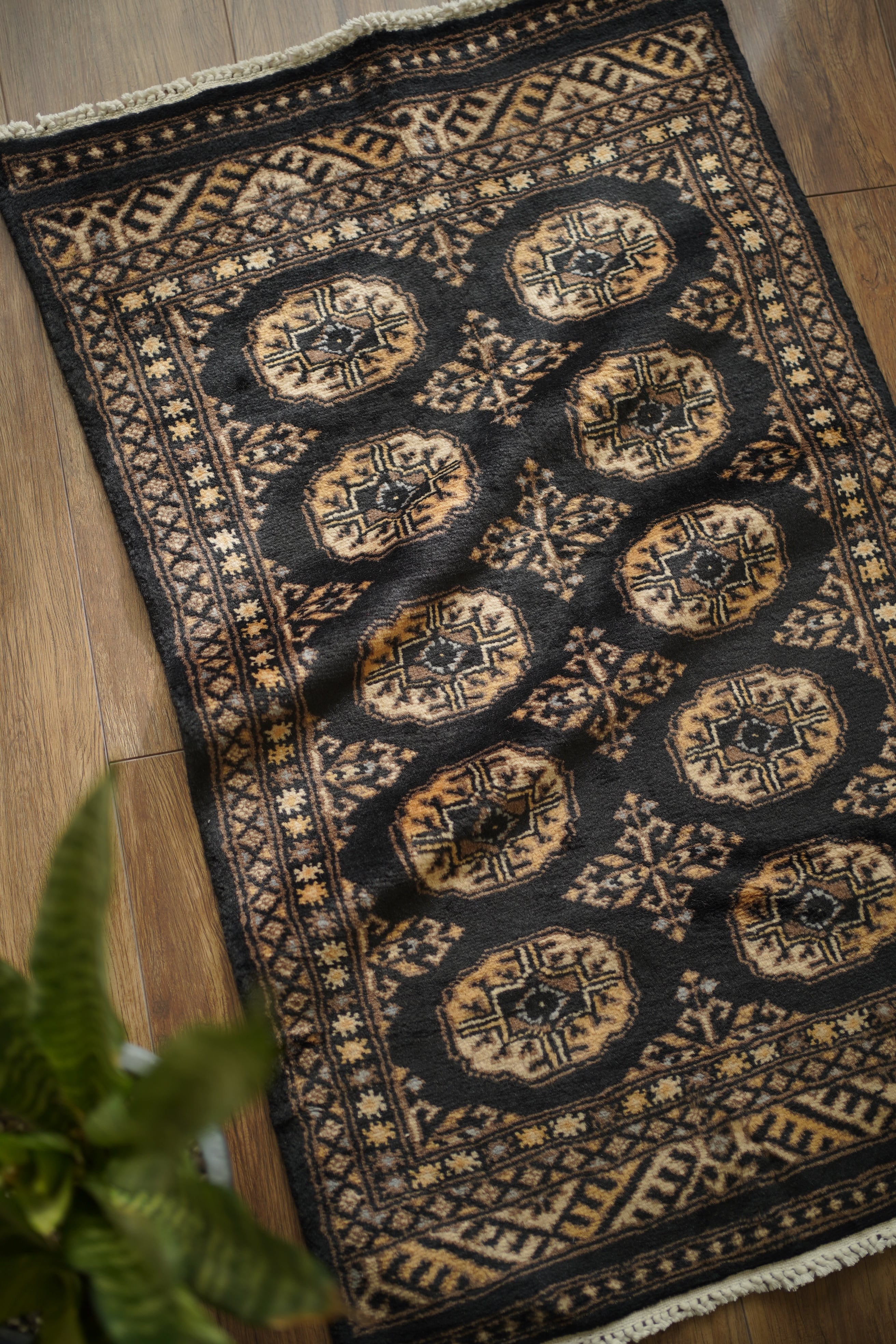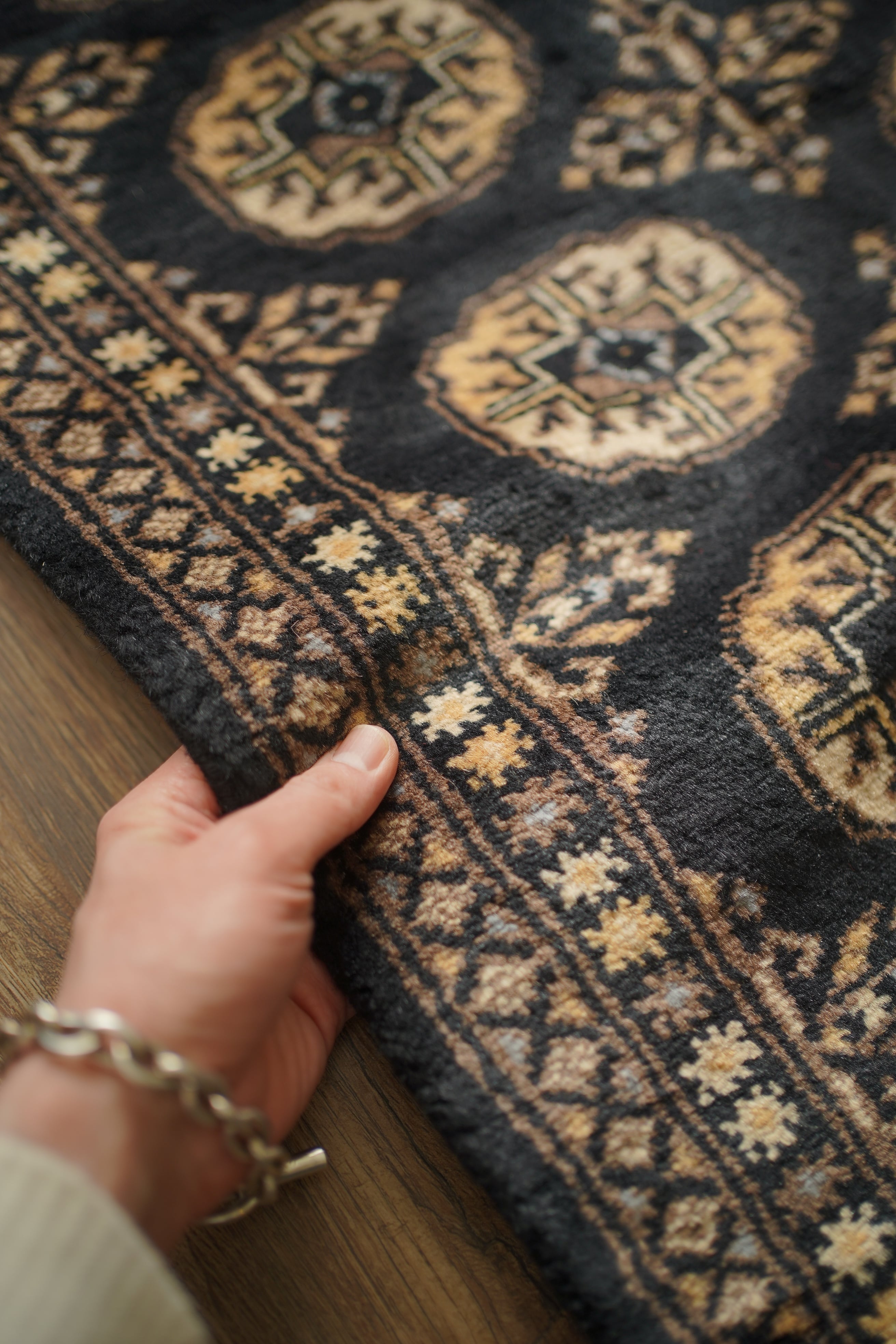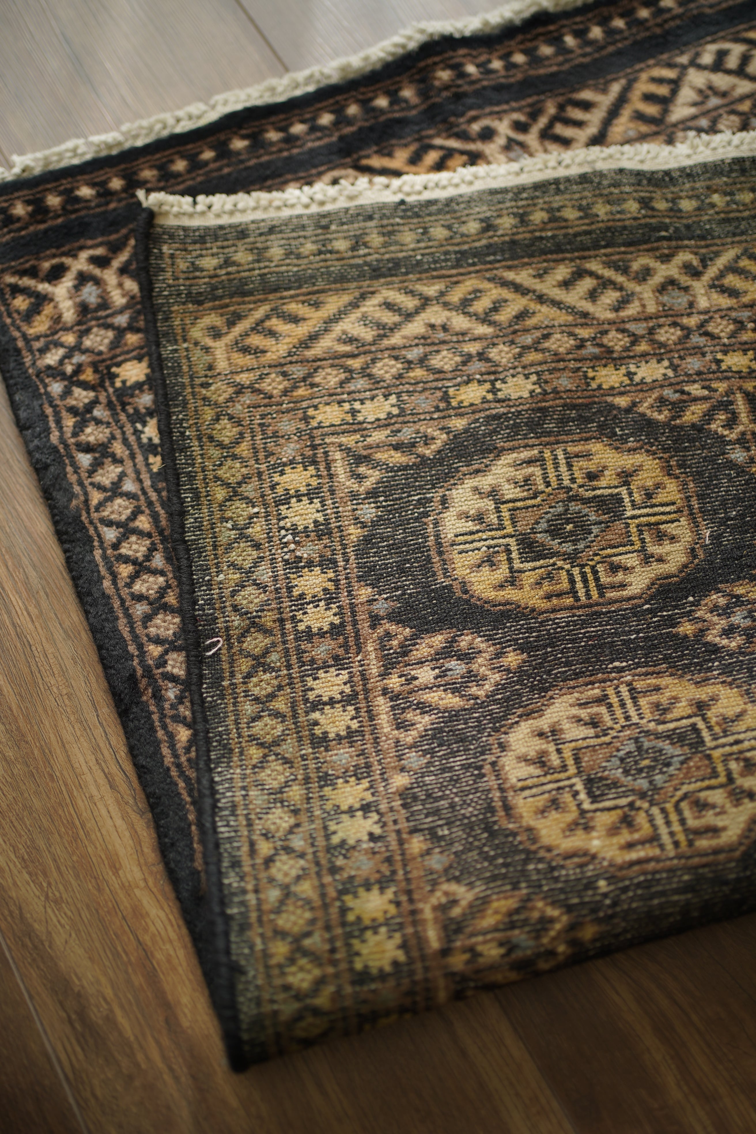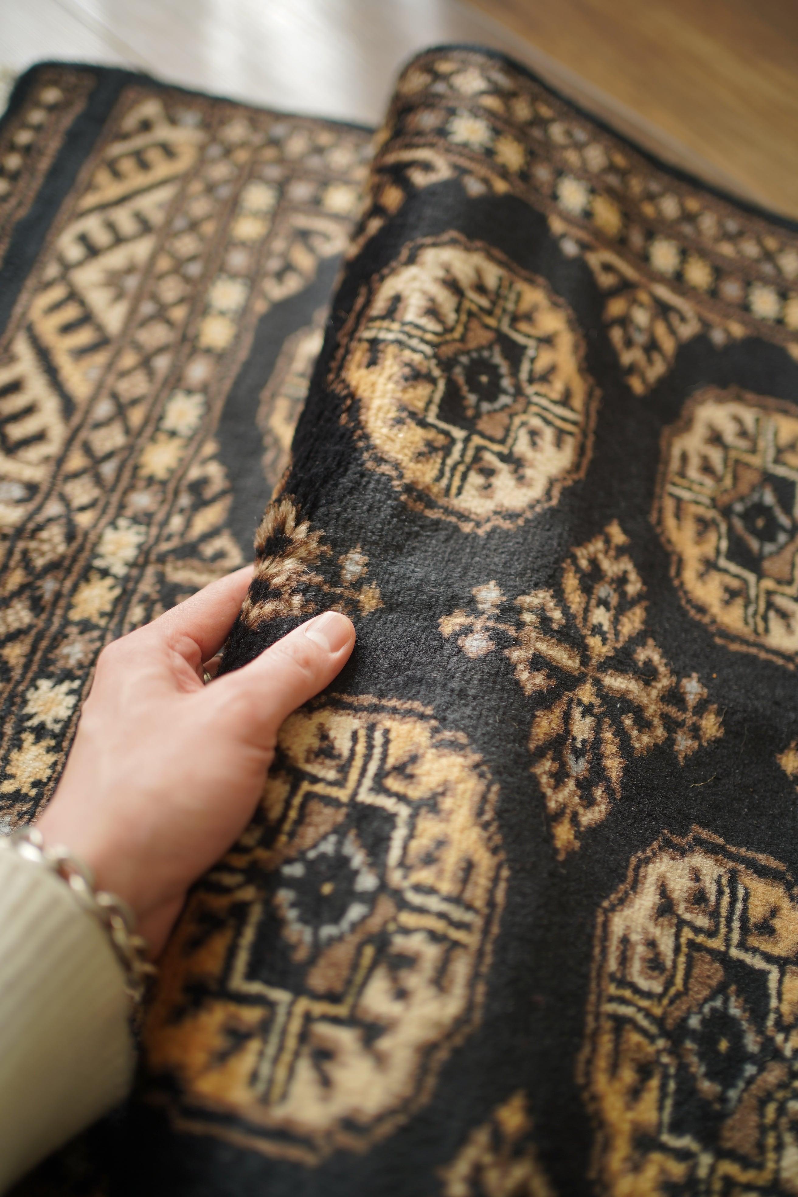 パキスタン北東部の都市ラホールで織られたヴィンテージラグ。“ボハラ”と呼ばれる、象の足跡をモチーフにした紋様が織り込まれたデザインです。黒をベースに、キャメルや薄茶色、ベージュを中心とした落ち着いた配色に、ほんのりと水色を含んだグレーがアクセントとして効いている点が、店主の心を惹きつけたポイントです。落ち着きのある格好良さを持ち、さまざまなインテリアに自然と溶け込みながら、空間に上品な存在感を添えてくれるかと思います。表面はソフトウールで、ふんわりと柔らかく心地よい肌触り。厚みは8mm程度です。ダメージや補修された跡も見受けられず大変良好なコンディション。玄関やラック前など、幅広いシーンでお使いいただける一枚です。