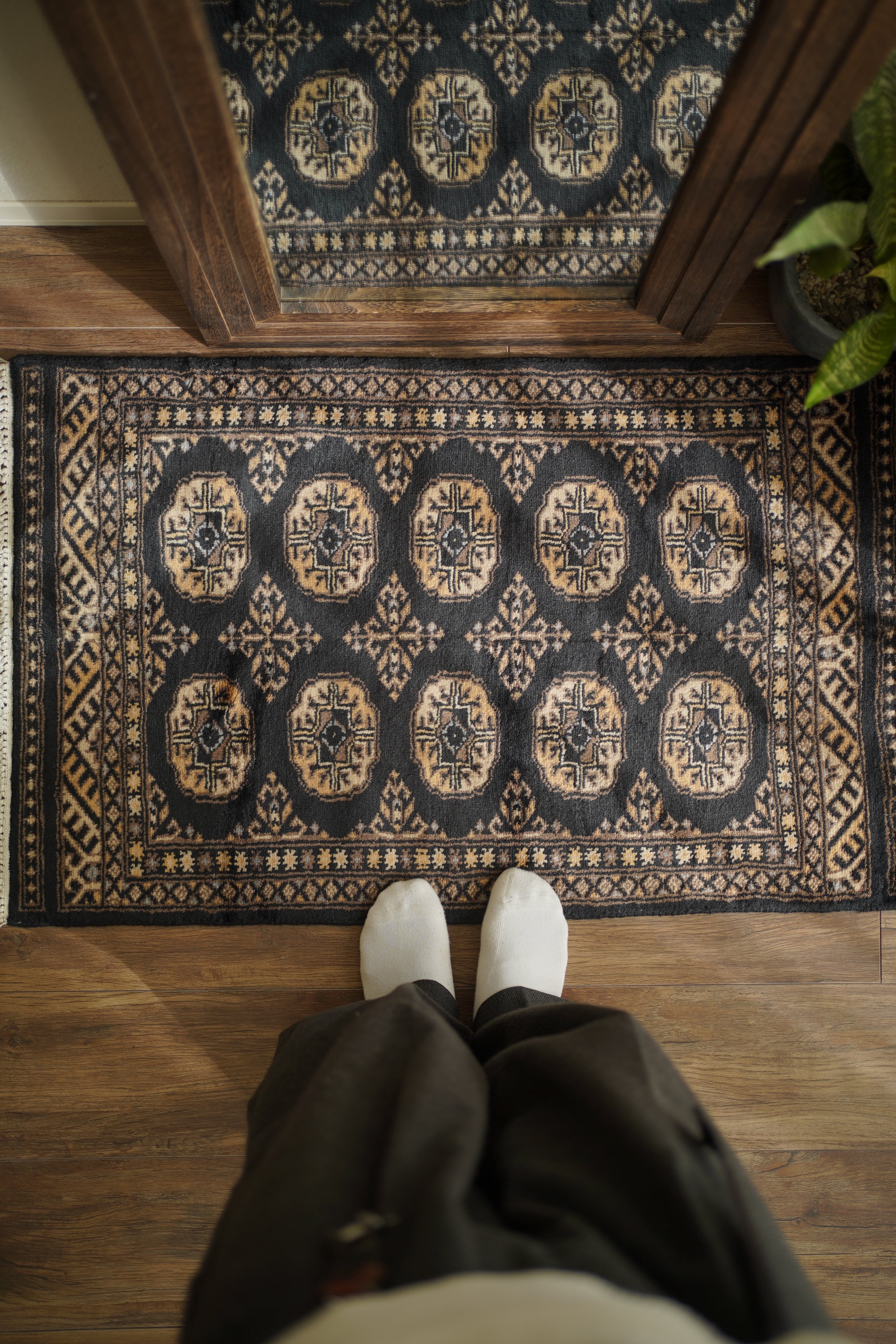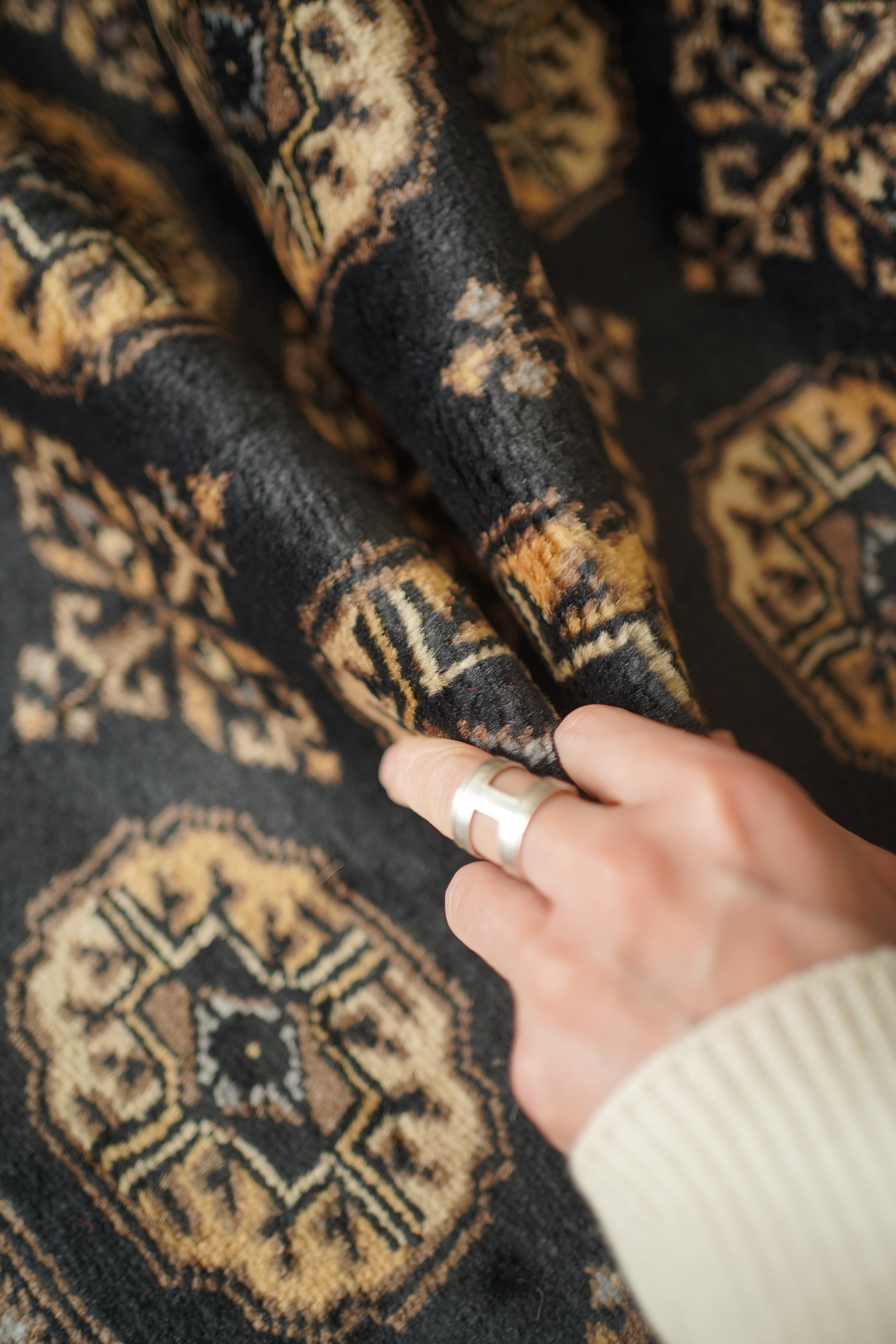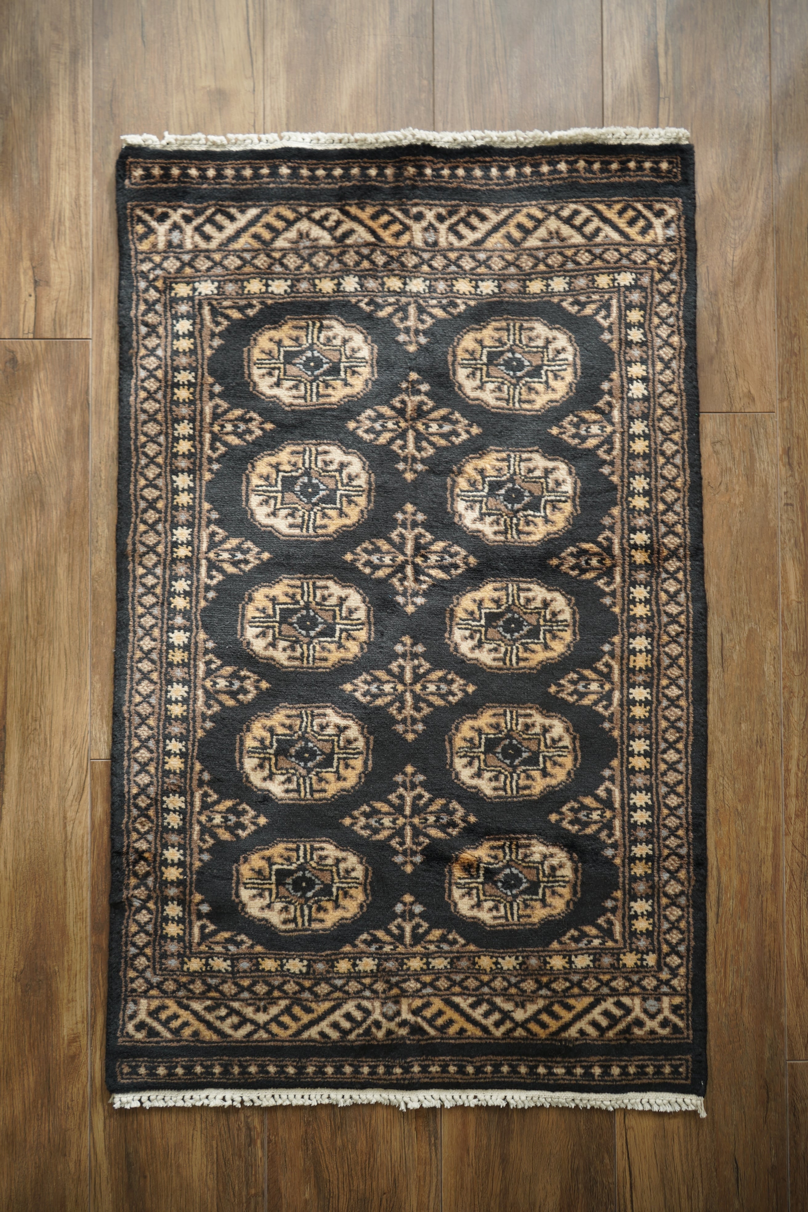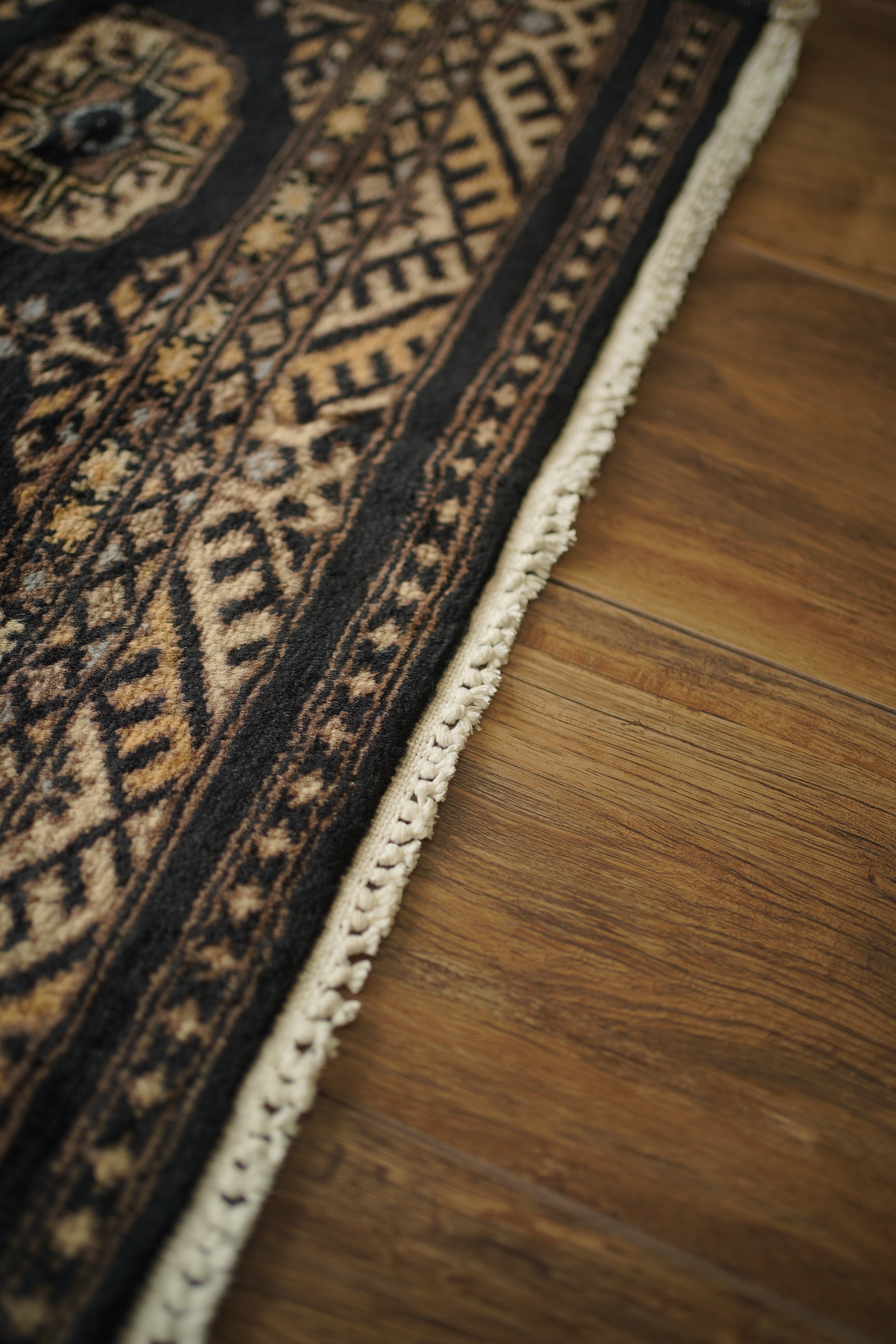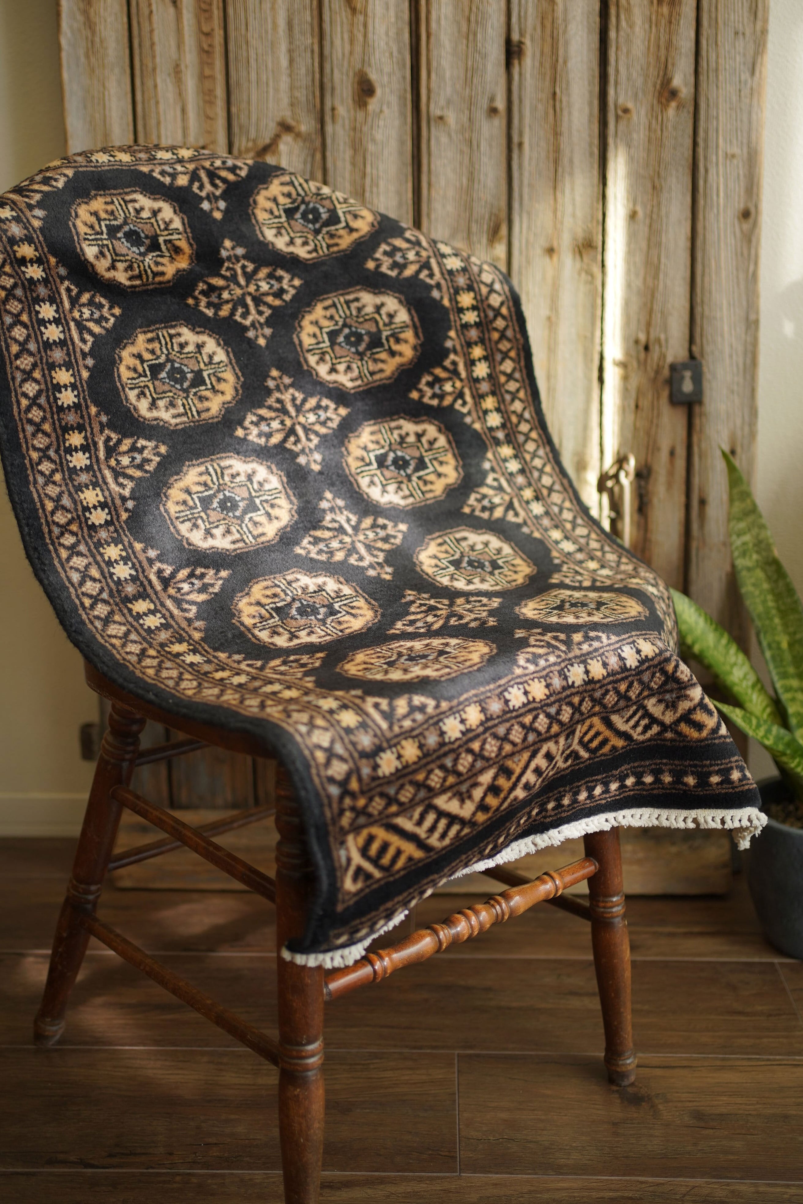 パキスタン北東部の都市ラホールで織られたヴィンテージラグ。“ボハラ”と呼ばれる、象の足跡をモチーフにした紋様が織り込まれたデザインです。黒をベースに、キャメルや薄茶色、ベージュを中心とした落ち着いた配色に、ほんのりと水色を含んだグレーがアクセントとして効いている点が、店主の心を惹きつけたポイントです。落ち着きのある格好良さを持ち、さまざまなインテリアに自然と溶け込みながら、空間に上品な存在感を添えてくれるかと思います。表面はソフトウールで、ふんわりと柔らかく心地よい肌触り。厚みは8mm程度です。ダメージや補修された跡も見受けられず大変良好なコンディション。玄関やラック前など、幅広いシーンでお使いいただける一枚です。