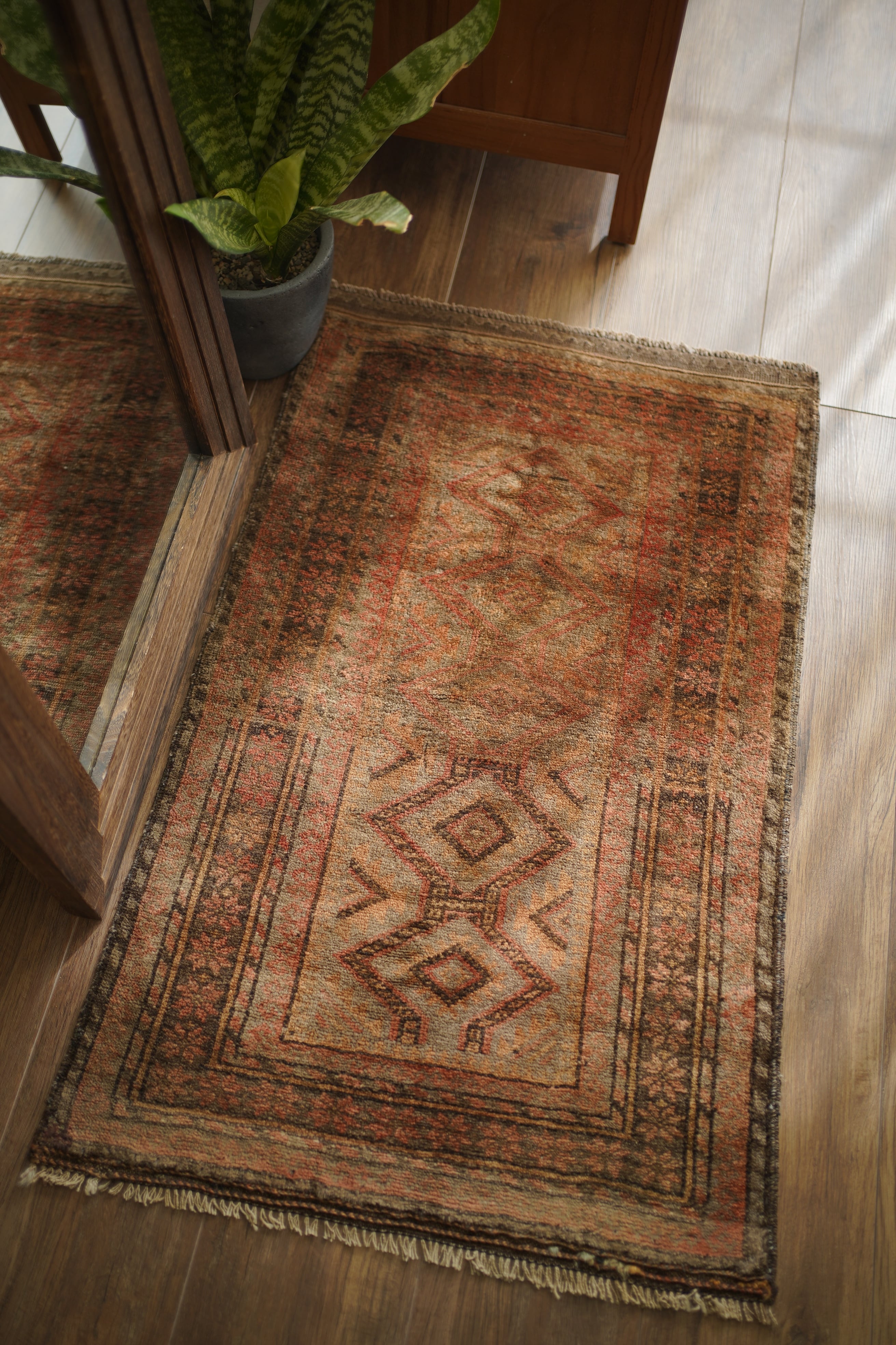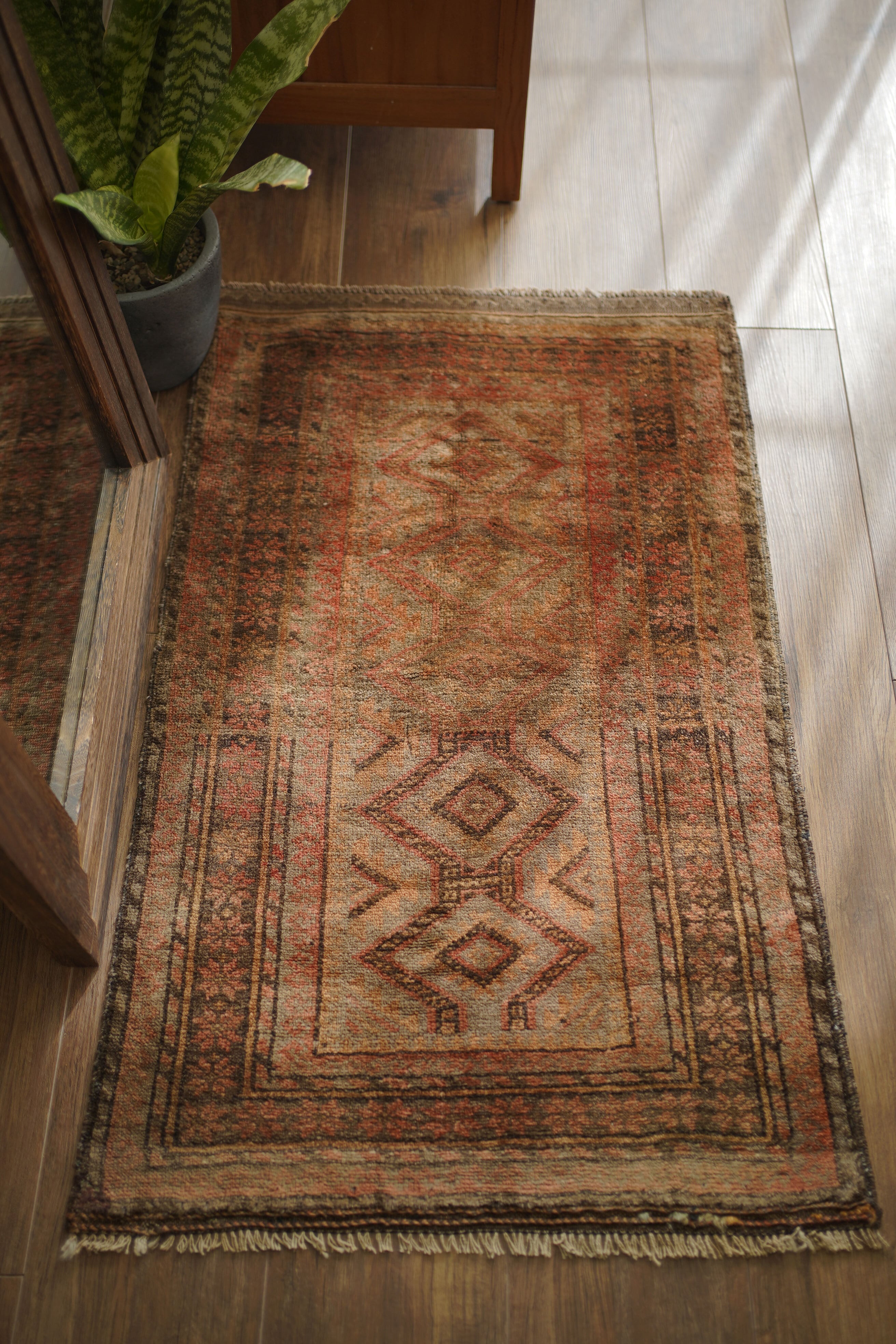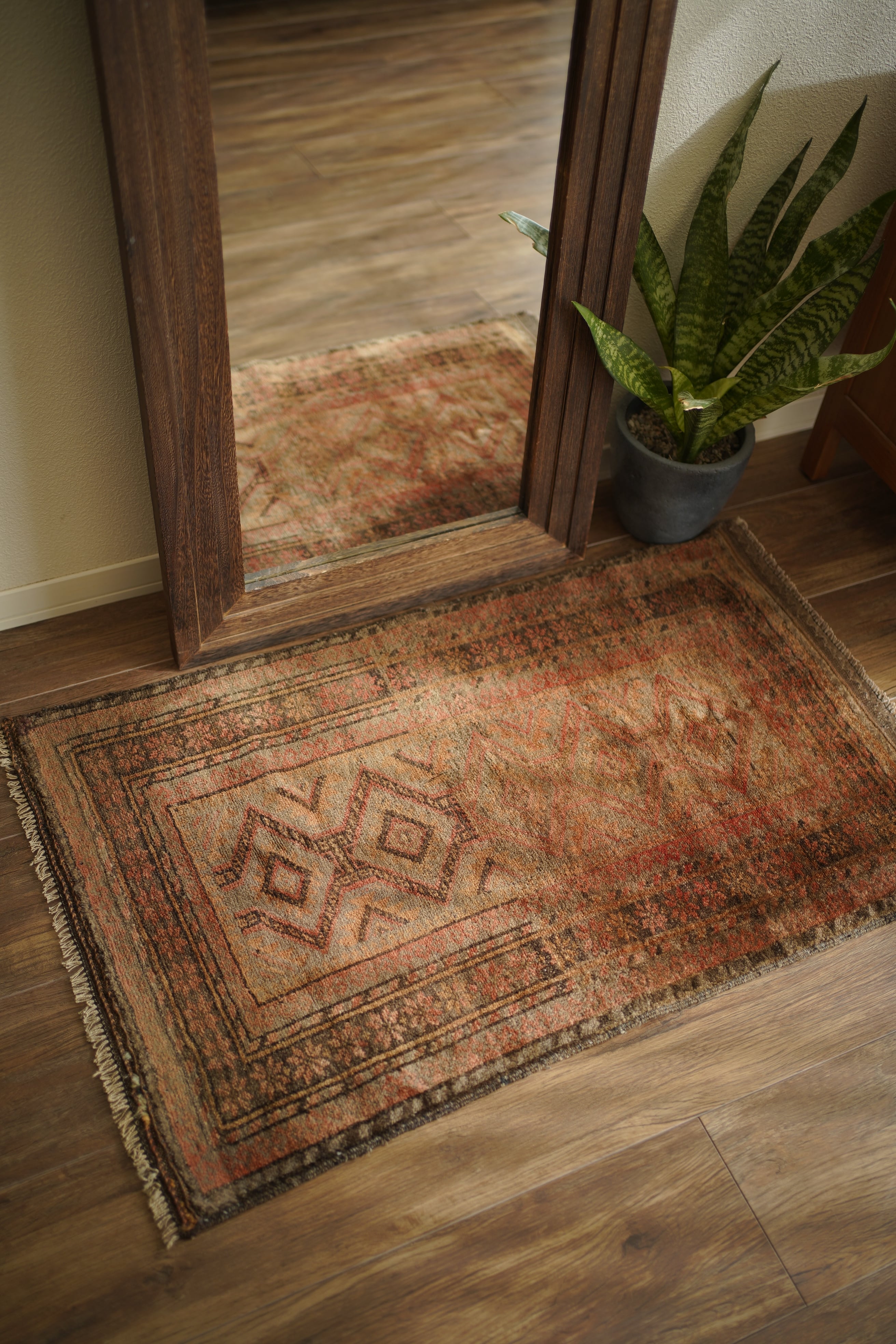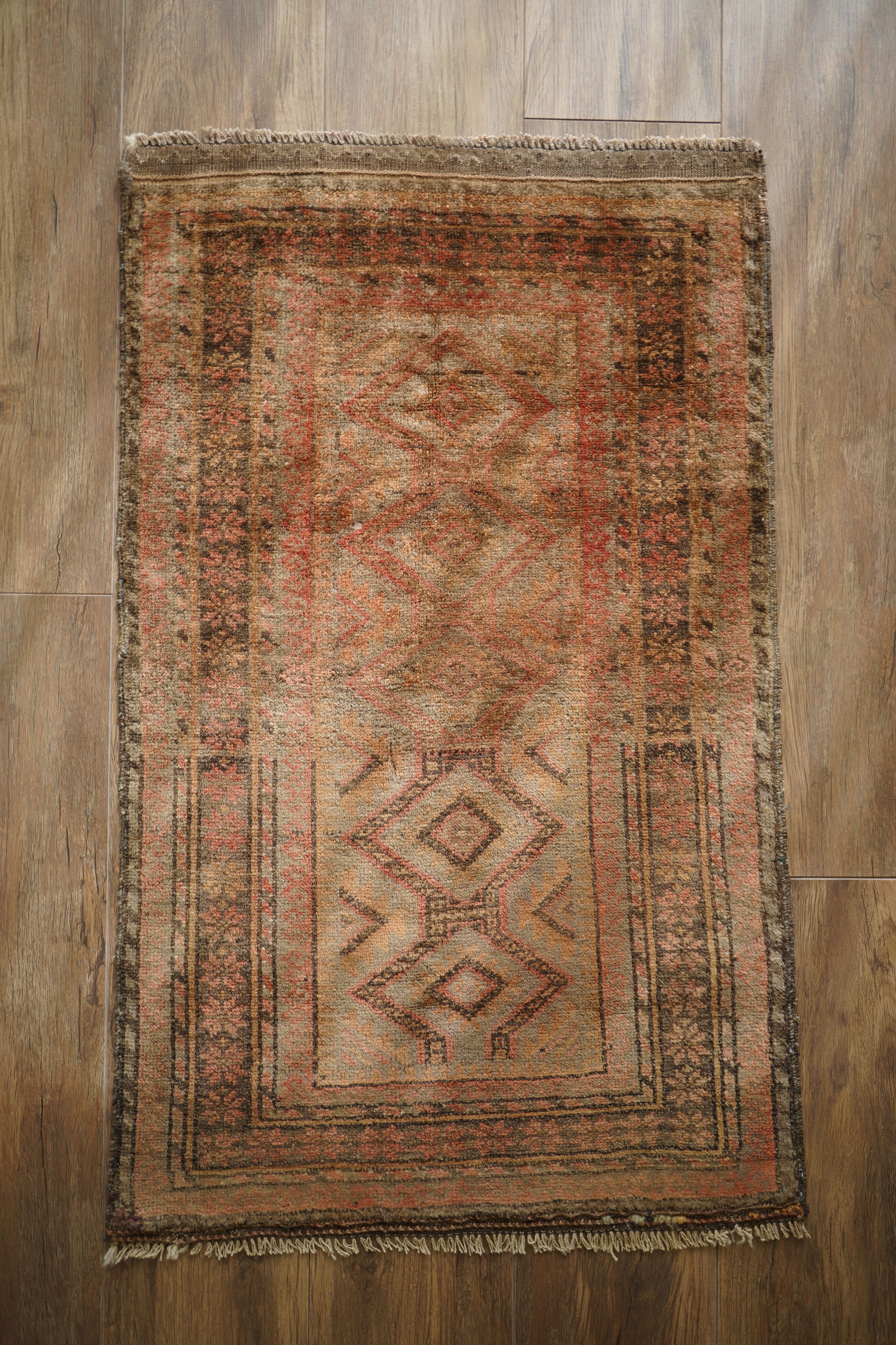 約50年前にアフガニスタン北西部に居住するタイマニ族によって織られた一枚。ヴィンテージ感満載の個性的な風合いが魅力で、木製家具とも自然によく馴染むラグです。くすんだブラウン、薄茶色などの統一感のある配色で、年月を経たラグならではの奥行きのある色合いが印象的です。表面はふわっとした優しい心地良い肌触りで、厚みは約6mmほど。目立ったダメージや補修跡も見られず、良好なコンディションです。コンパクトなサイズのため、玄関や鏡前など限られたスペースにも取り入れやすく、空間のアクセントとしてお楽しみいただけます。