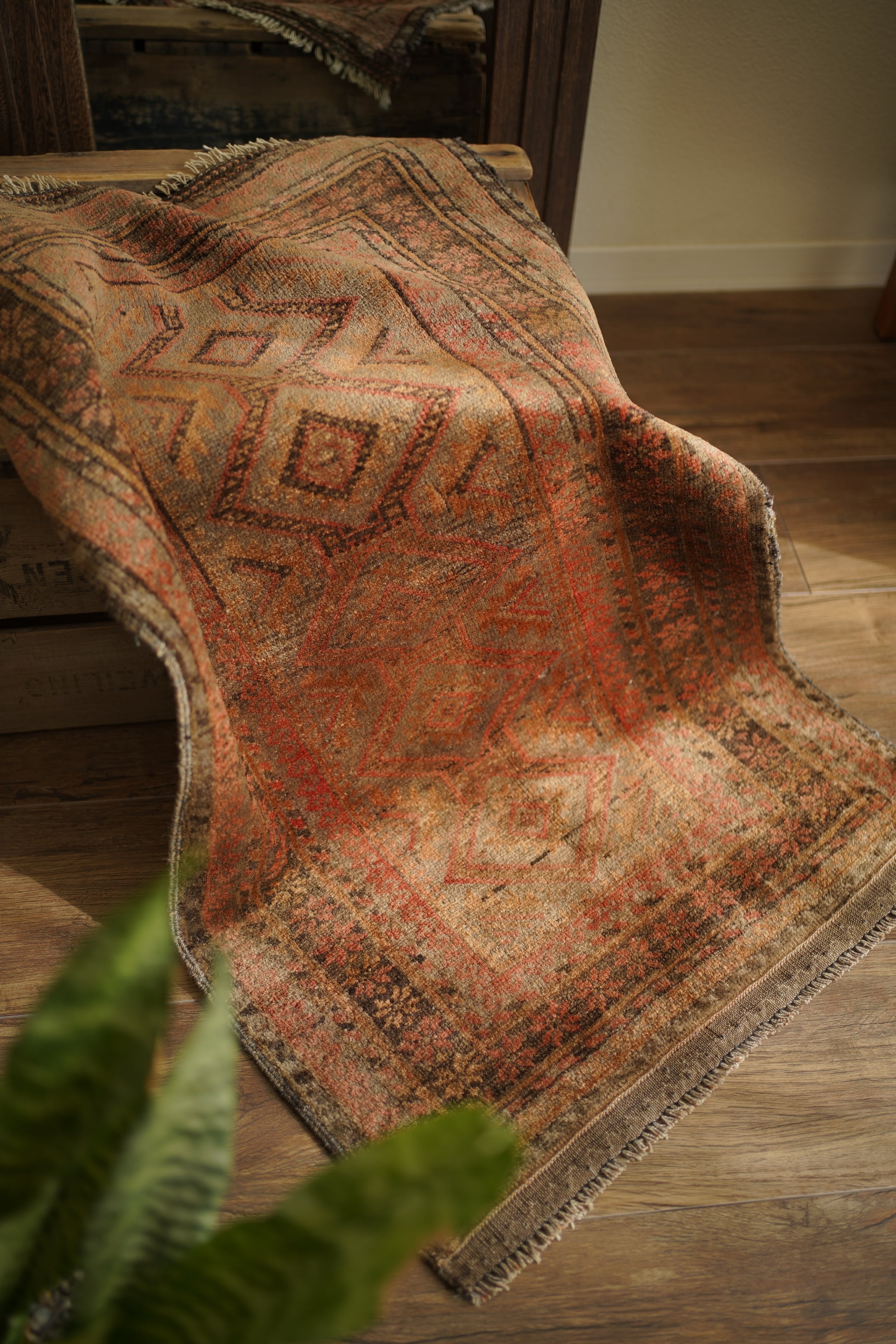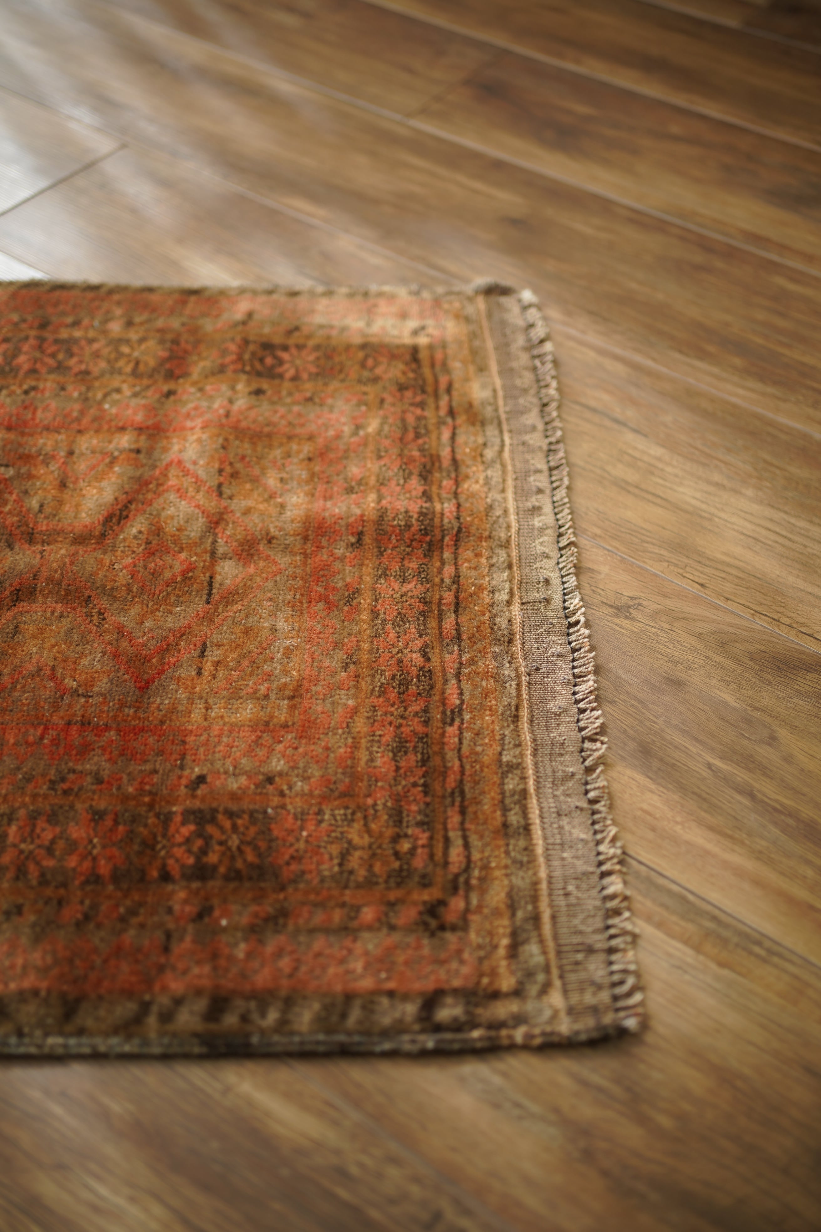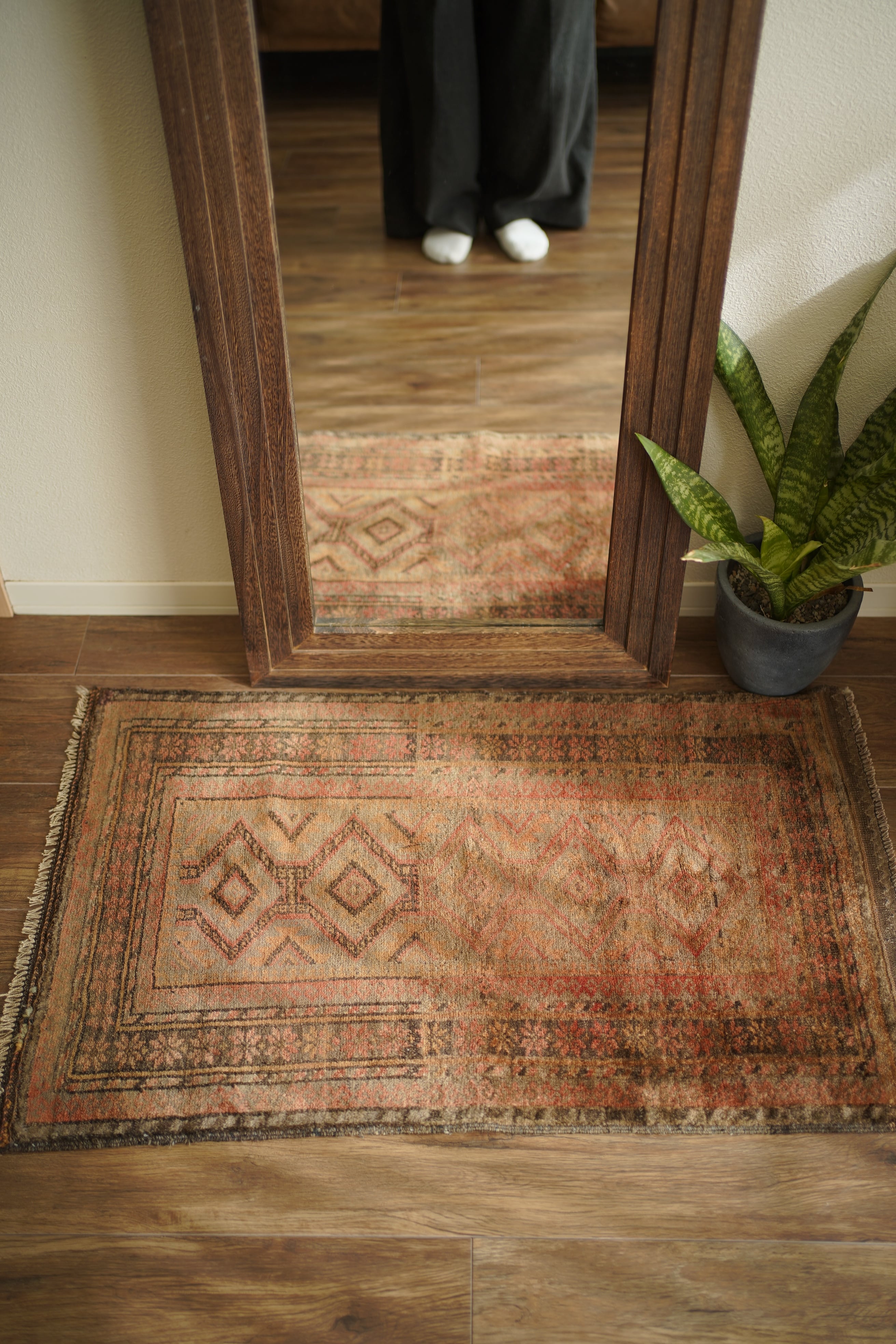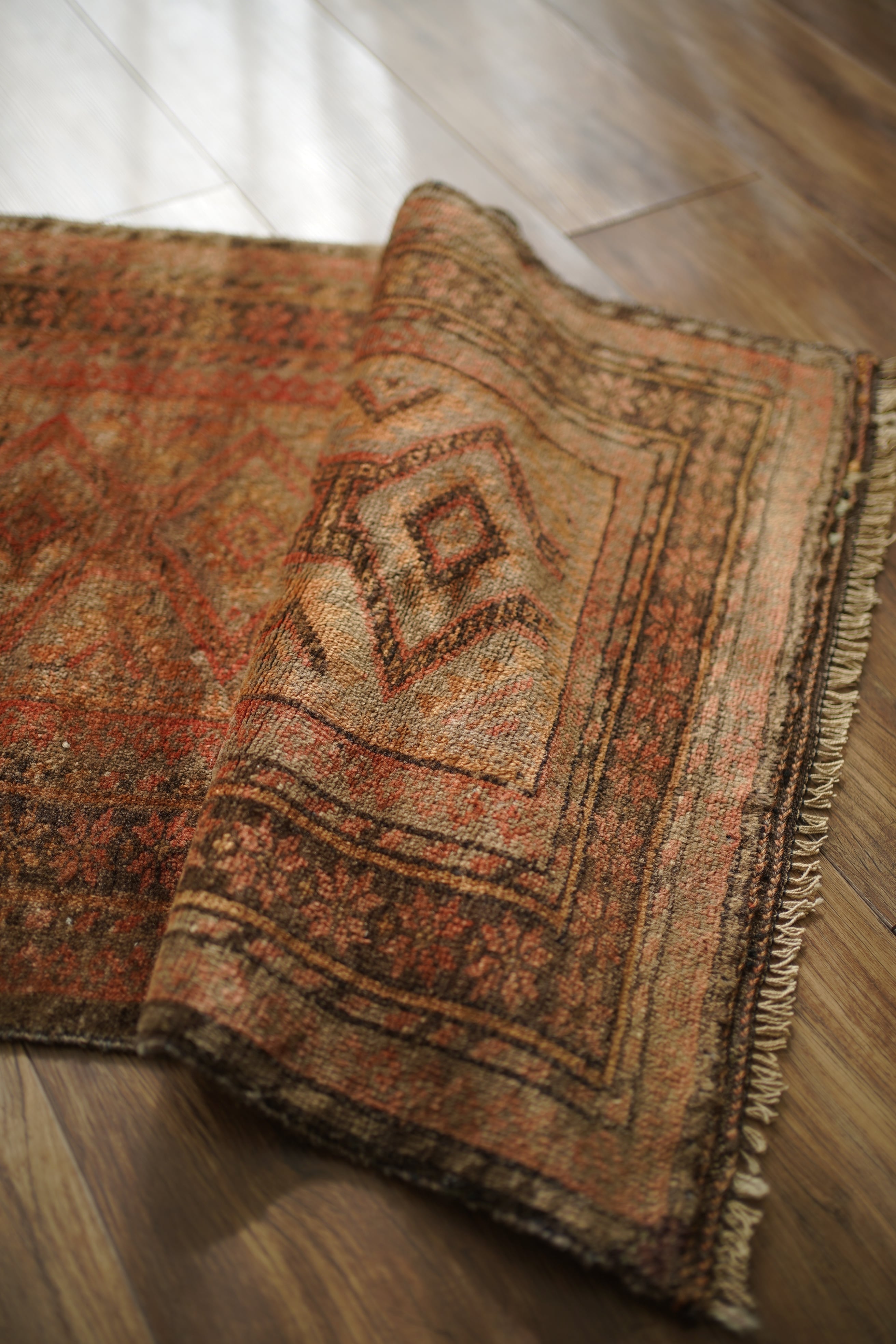 約50年前にアフガニスタン北西部に居住するタイマニ族によって織られた一枚。ヴィンテージ感満載の個性的な風合いが魅力で、木製家具とも自然によく馴染むラグです。くすんだブラウン、薄茶色などの統一感のある配色で、年月を経たラグならではの奥行きのある色合いが印象的です。表面はふわっとした優しい心地良い肌触りで、厚みは約6mmほど。目立ったダメージや補修跡も見られず、良好なコンディションです。コンパクトなサイズのため、玄関や鏡前など限られたスペースにも取り入れやすく、空間のアクセントとしてお楽しみいただけます。