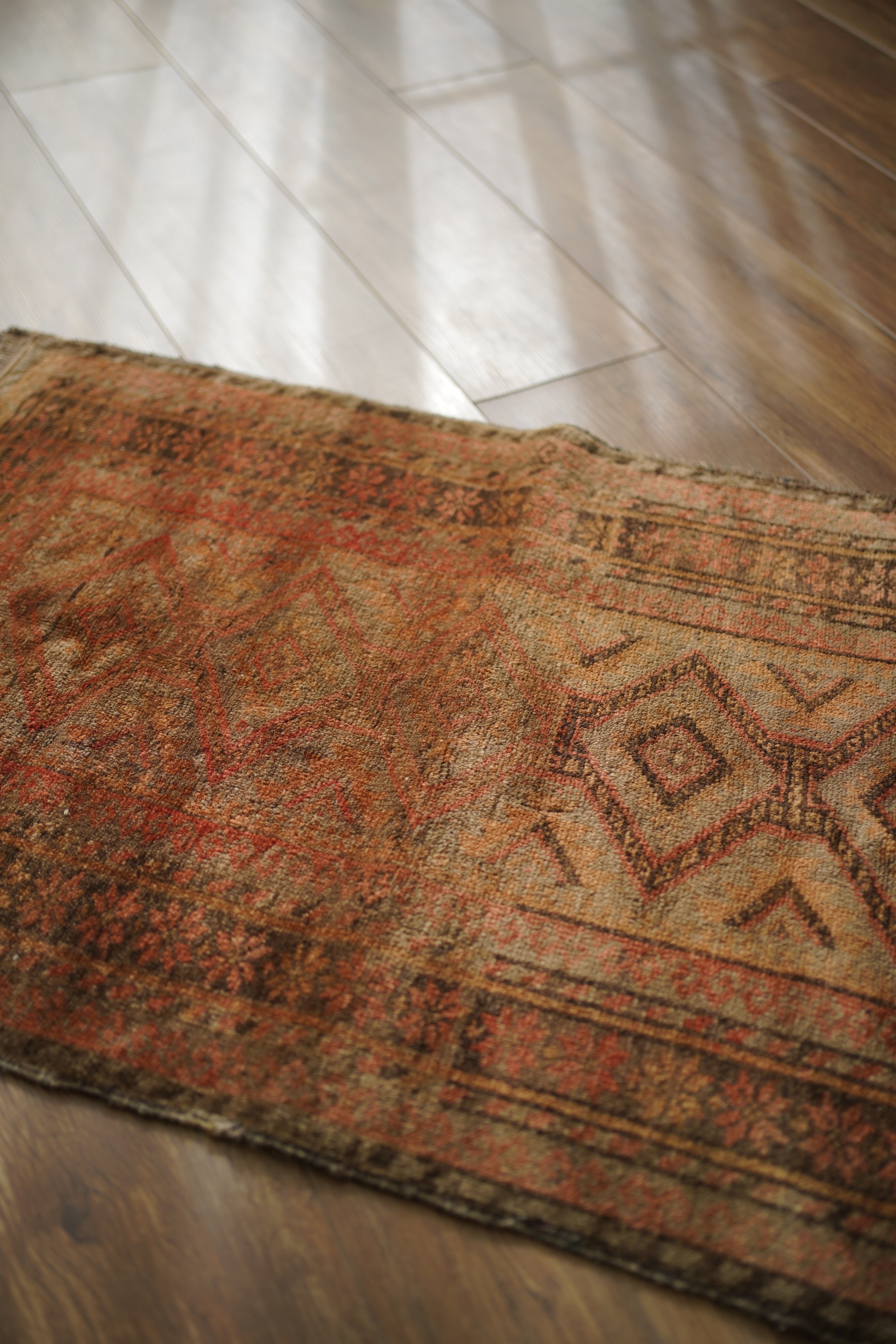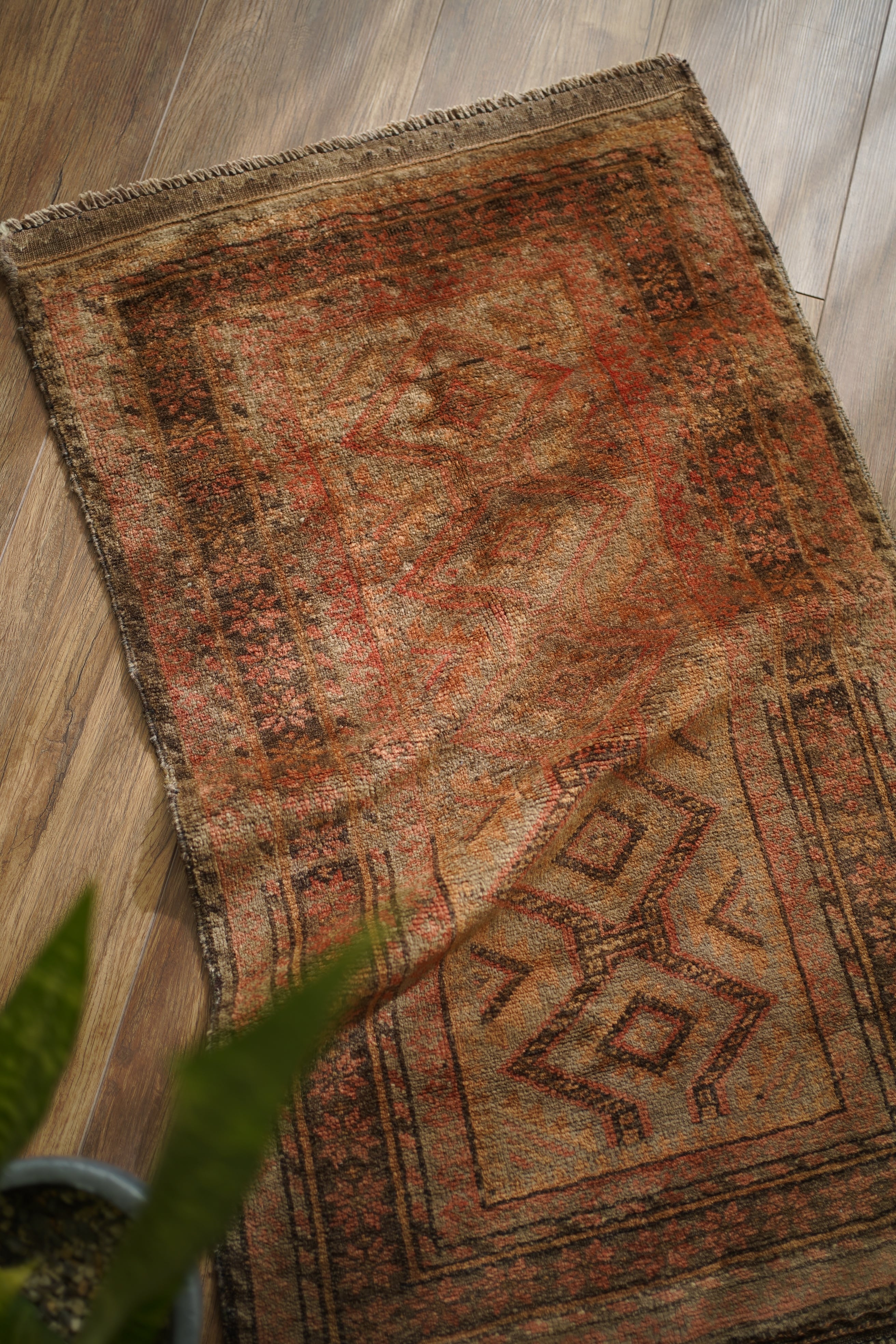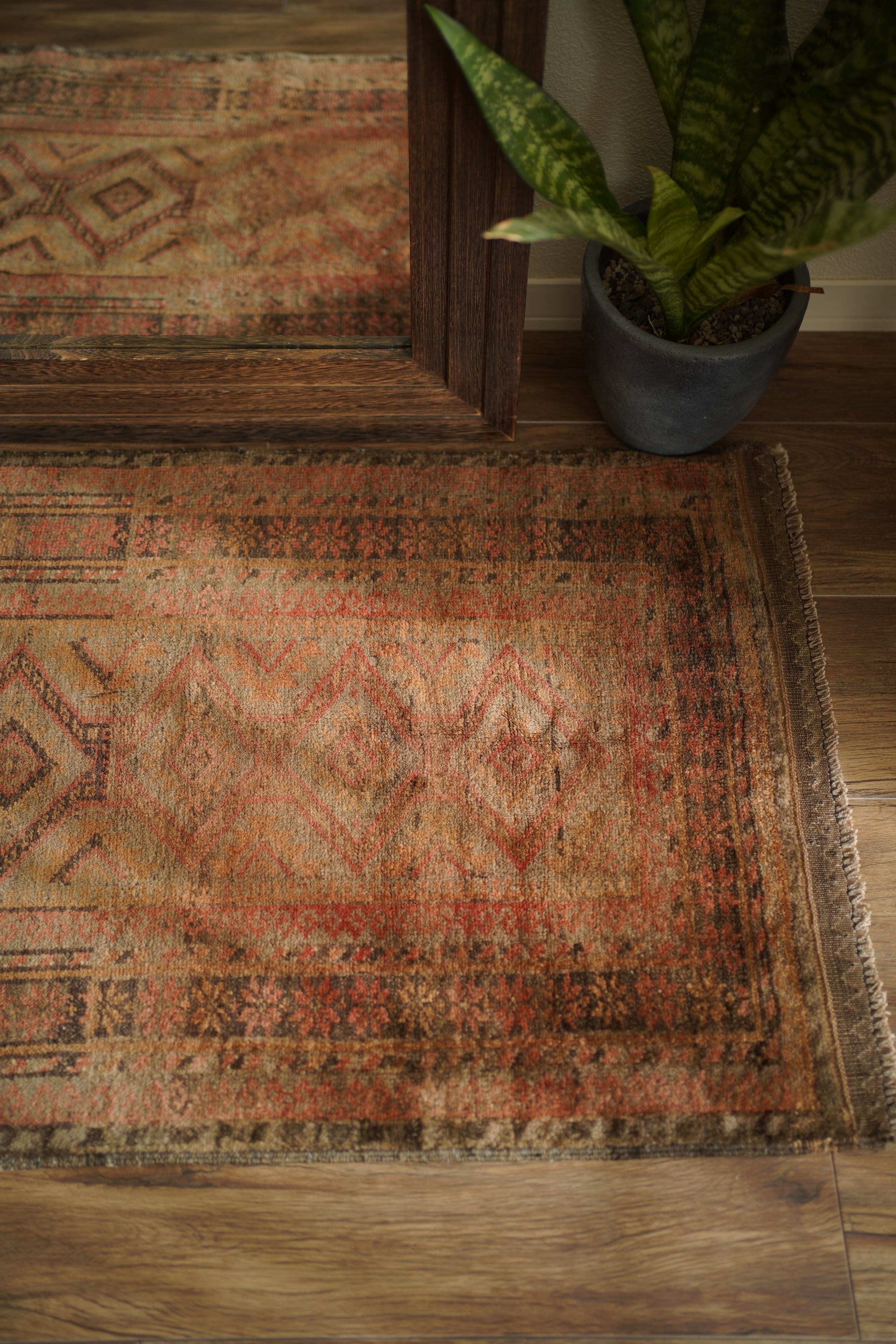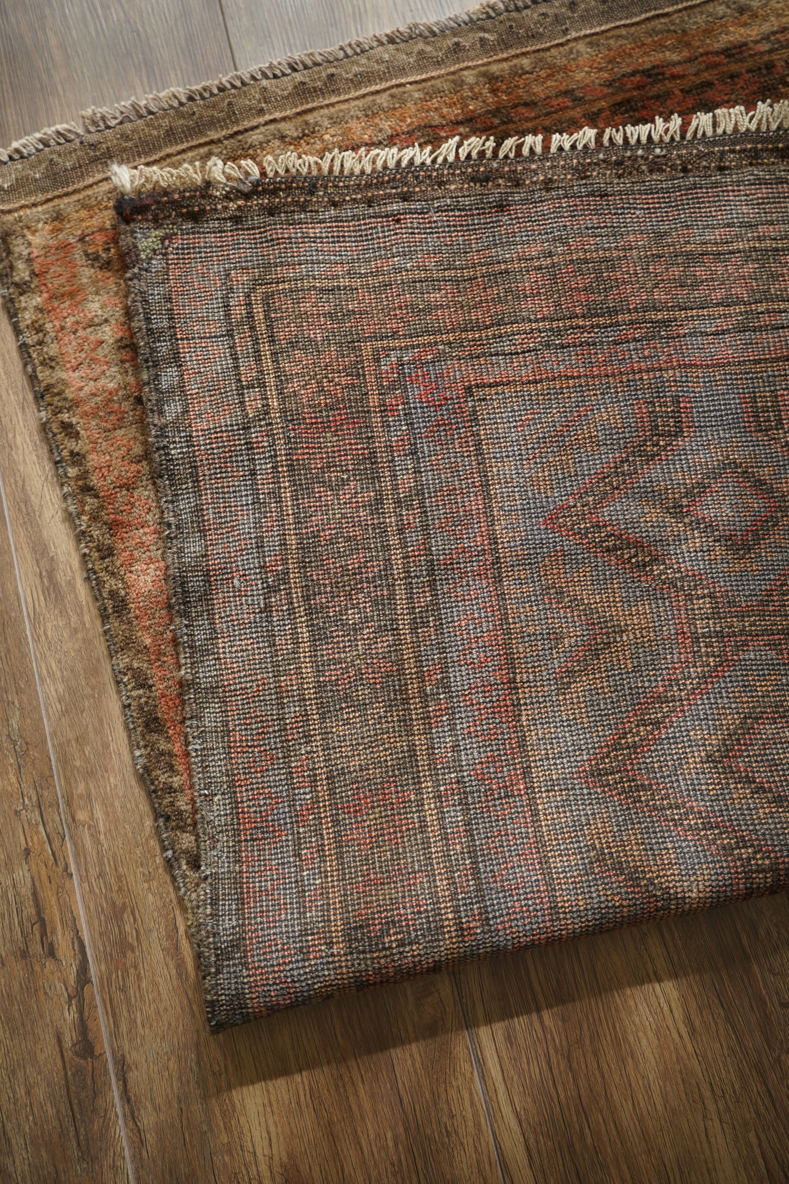 約50年前にアフガニスタン北西部に居住するタイマニ族によって織られた一枚。ヴィンテージ感満載の個性的な風合いが魅力で、木製家具とも自然によく馴染むラグです。くすんだブラウン、薄茶色などの統一感のある配色で、年月を経たラグならではの奥行きのある色合いが印象的です。表面はふわっとした優しい心地良い肌触りで、厚みは約6mmほど。目立ったダメージや補修跡も見られず、良好なコンディションです。コンパクトなサイズのため、玄関や鏡前など限られたスペースにも取り入れやすく、空間のアクセントとしてお楽しみいただけます。