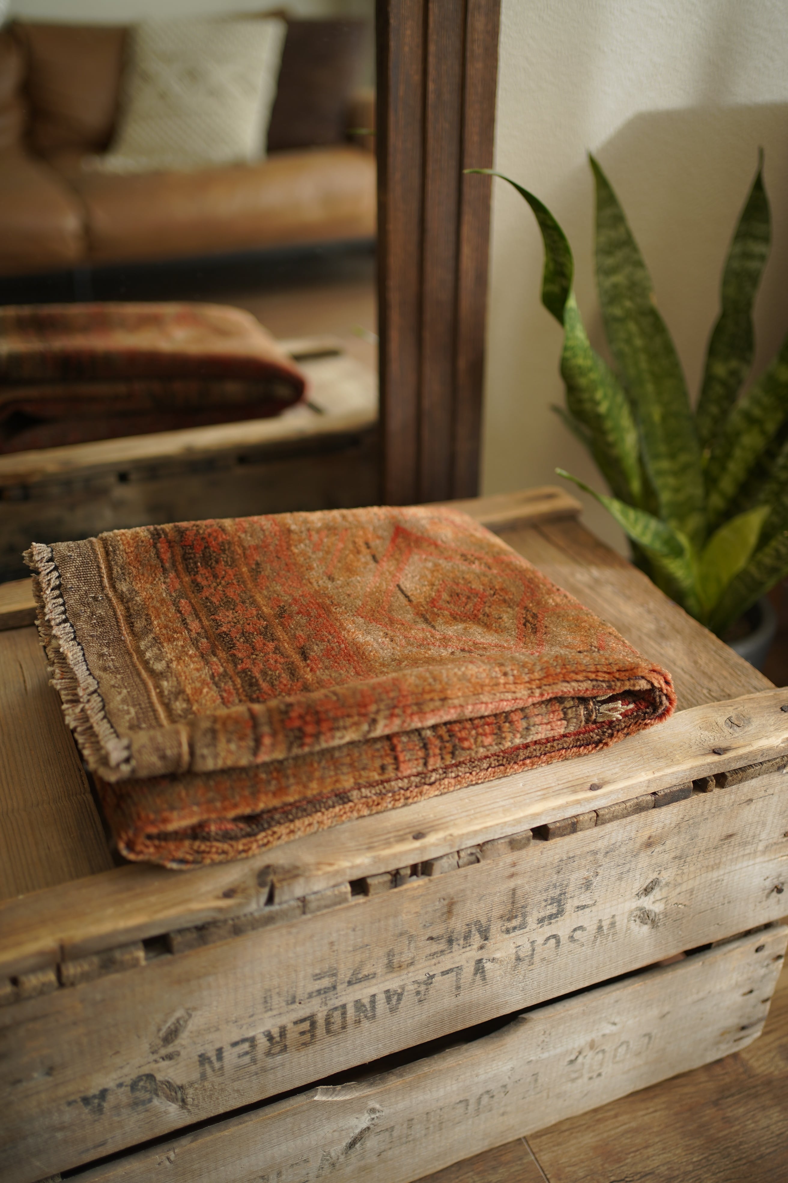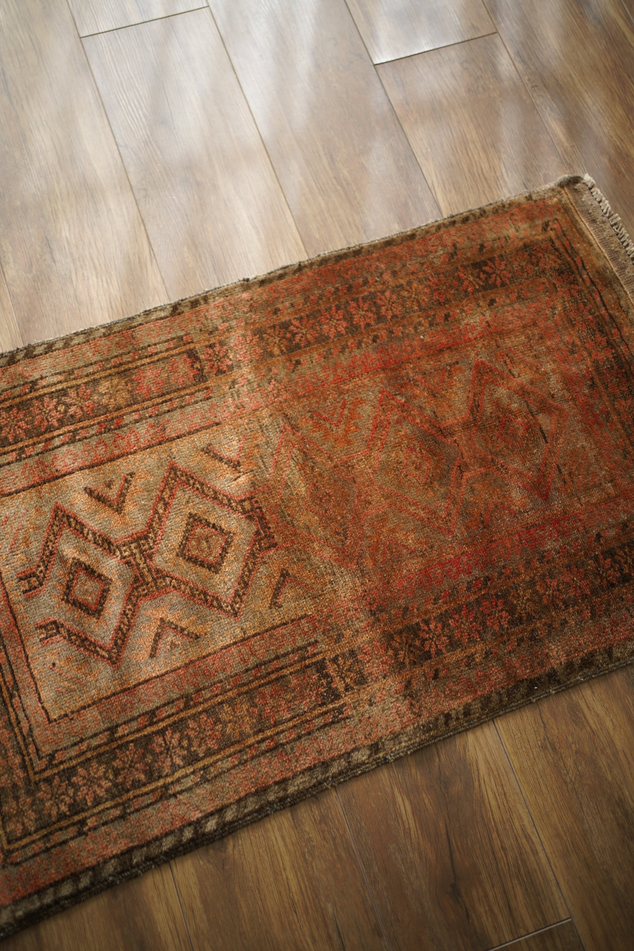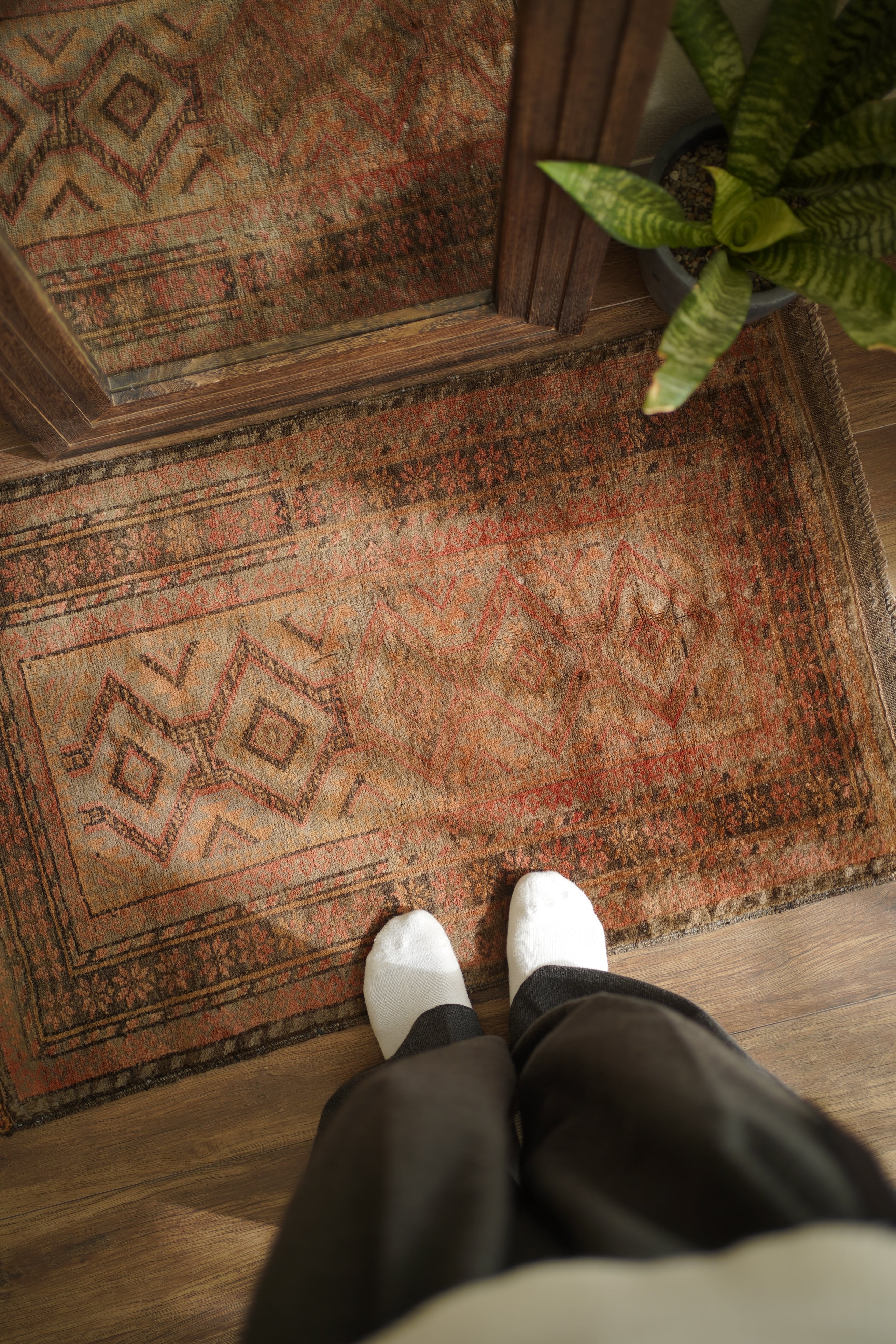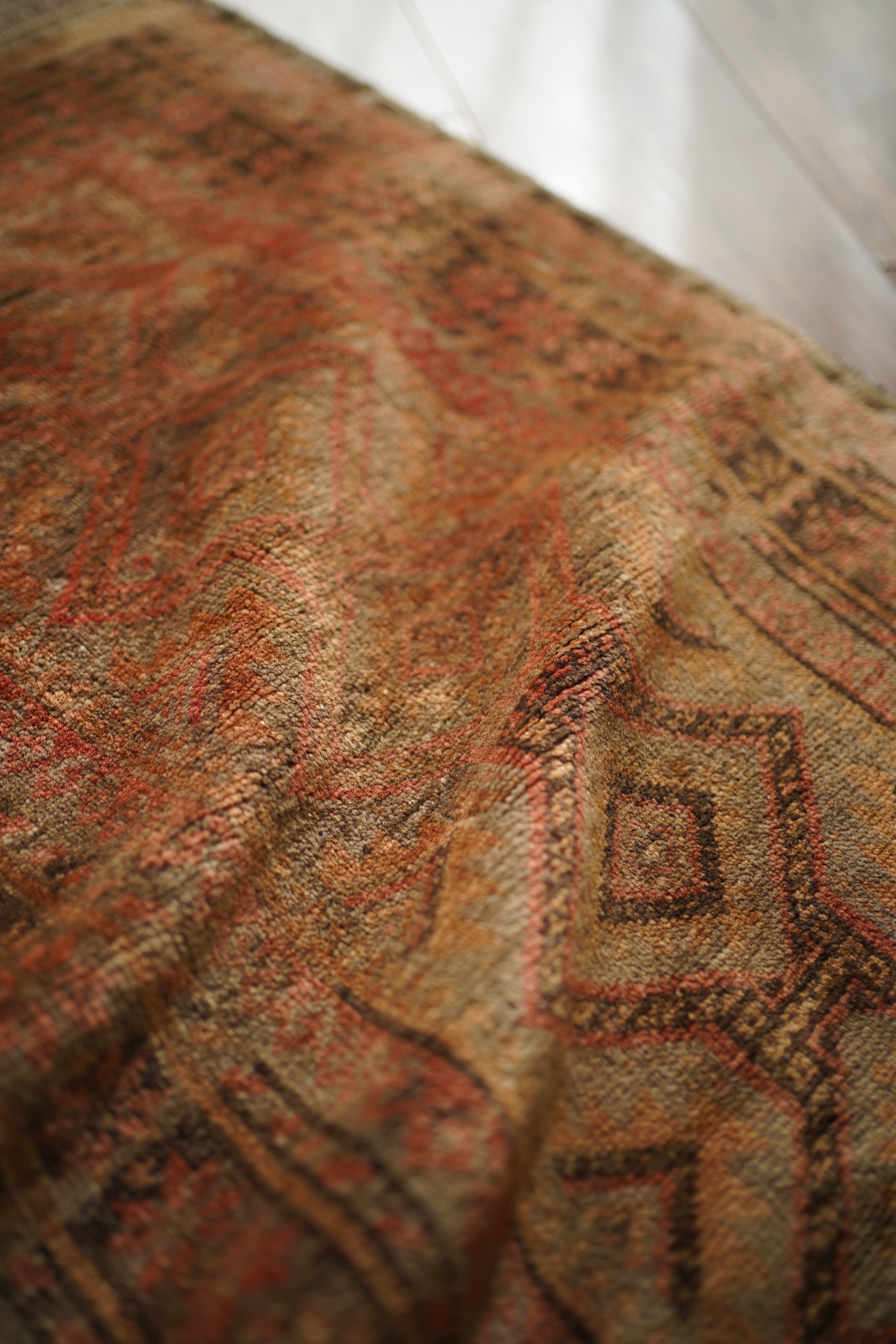 約50年前にアフガニスタン北西部に居住するタイマニ族によって織られた一枚。ヴィンテージ感満載の個性的な風合いが魅力で、木製家具とも自然によく馴染むラグです。くすんだブラウン、薄茶色などの統一感のある配色で、年月を経たラグならではの奥行きのある色合いが印象的です。表面はふわっとした優しい心地良い肌触りで、厚みは約6mmほど。目立ったダメージや補修跡も見られず、良好なコンディションです。コンパクトなサイズのため、玄関や鏡前など限られたスペースにも取り入れやすく、空間のアクセントとしてお楽しみいただけます。