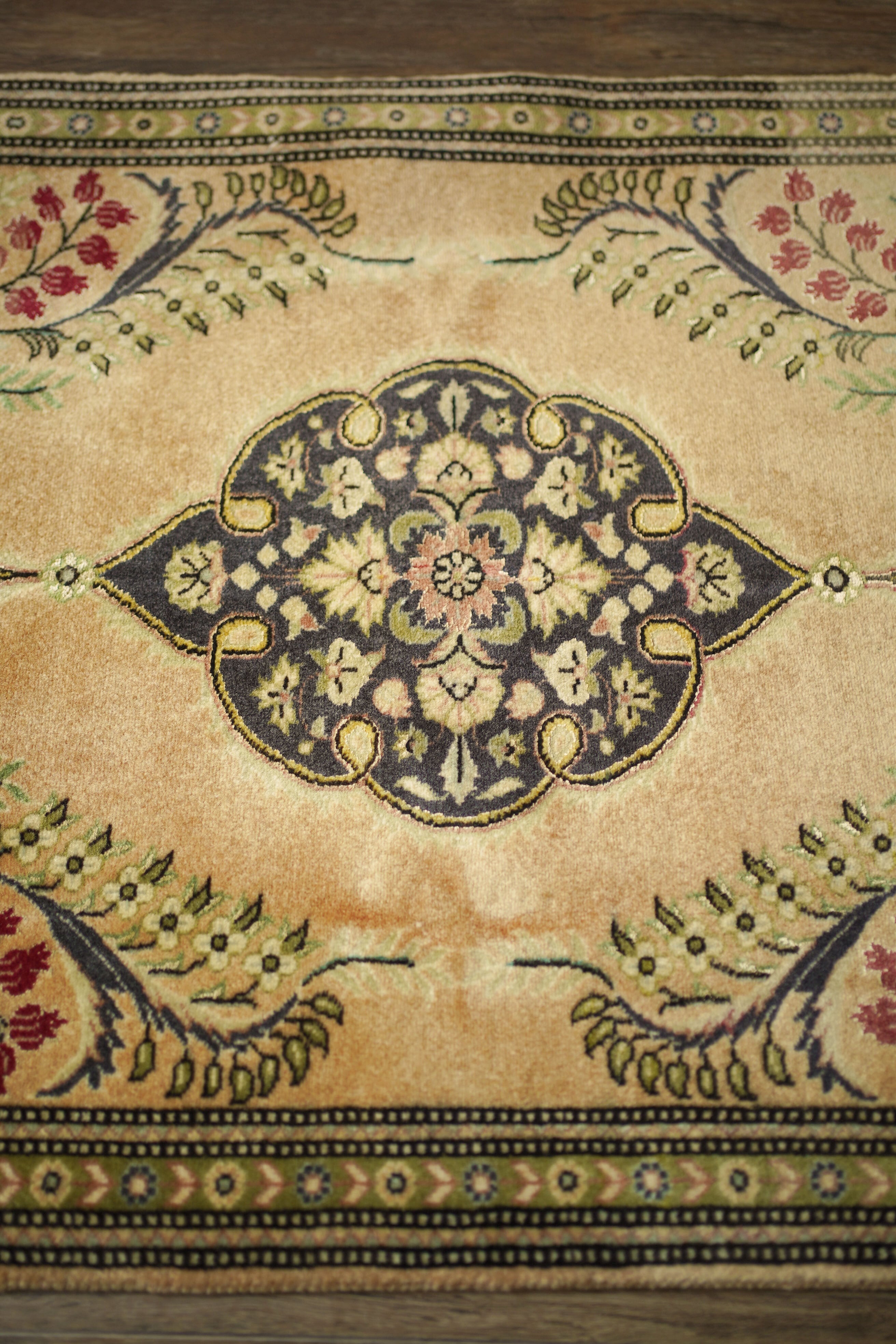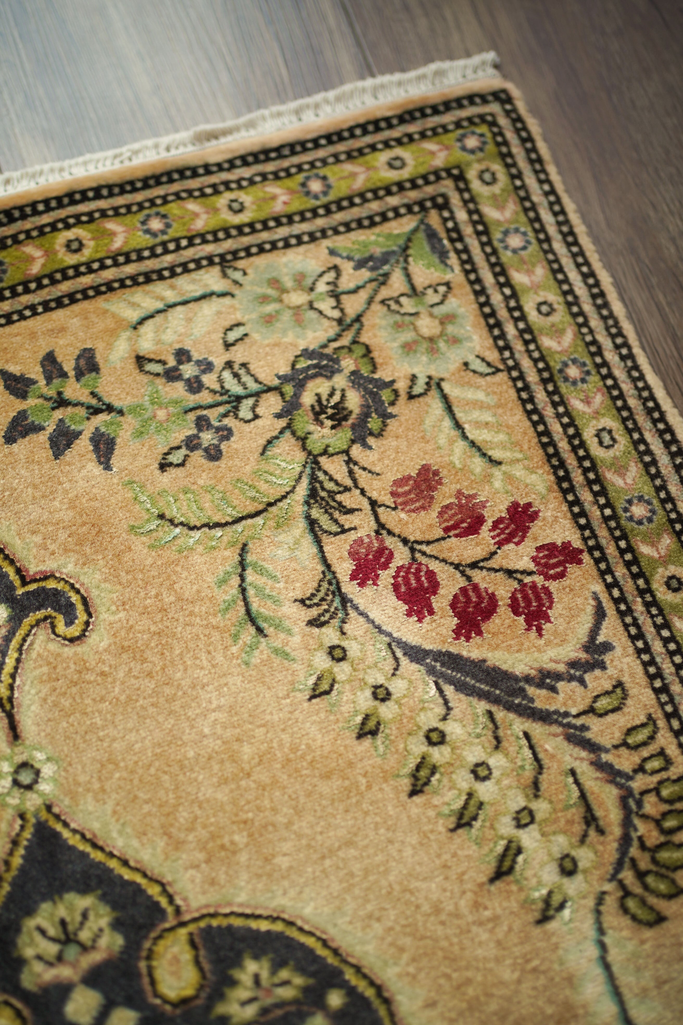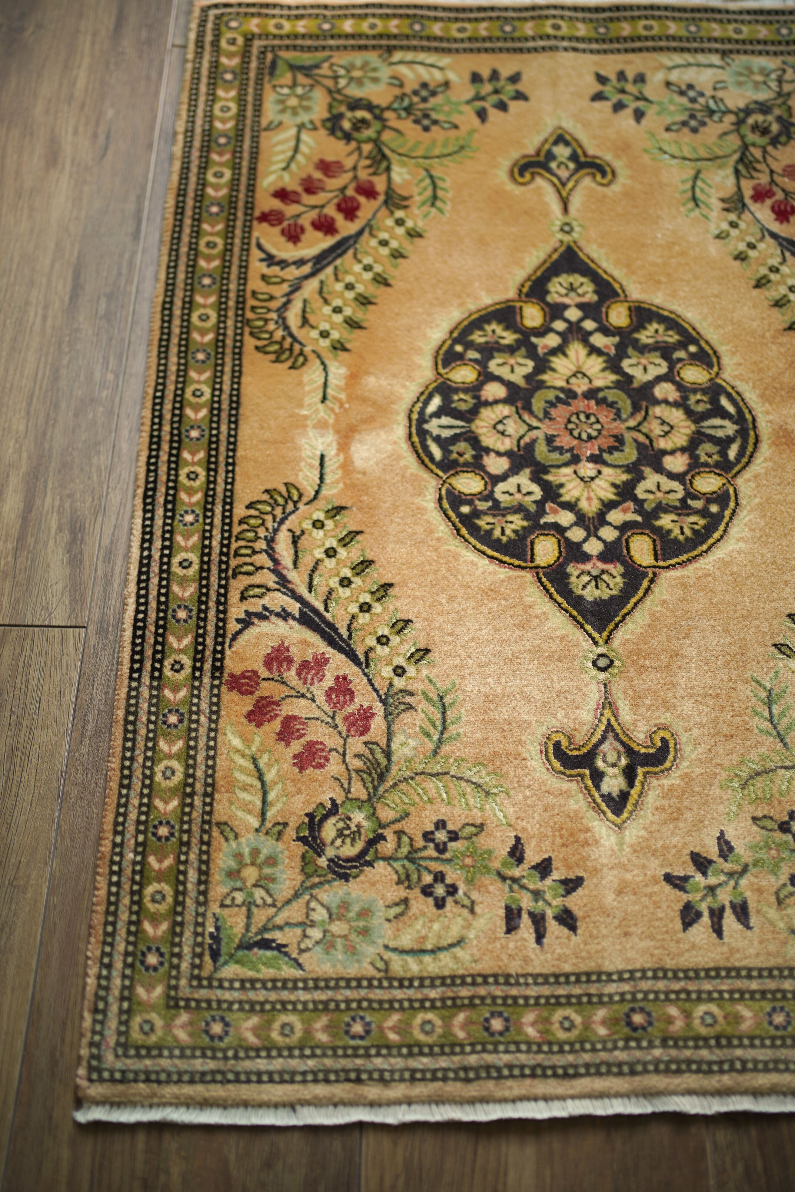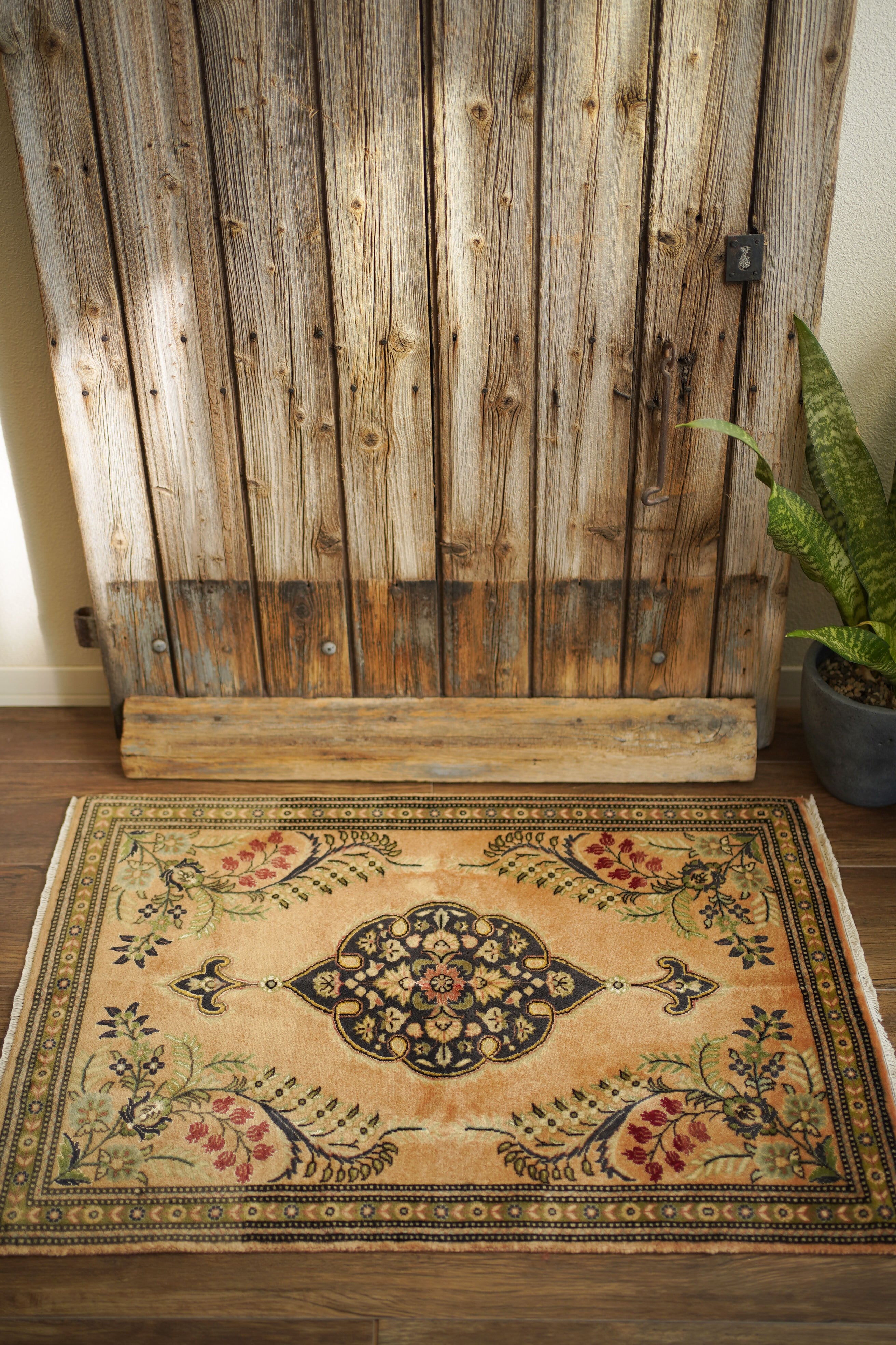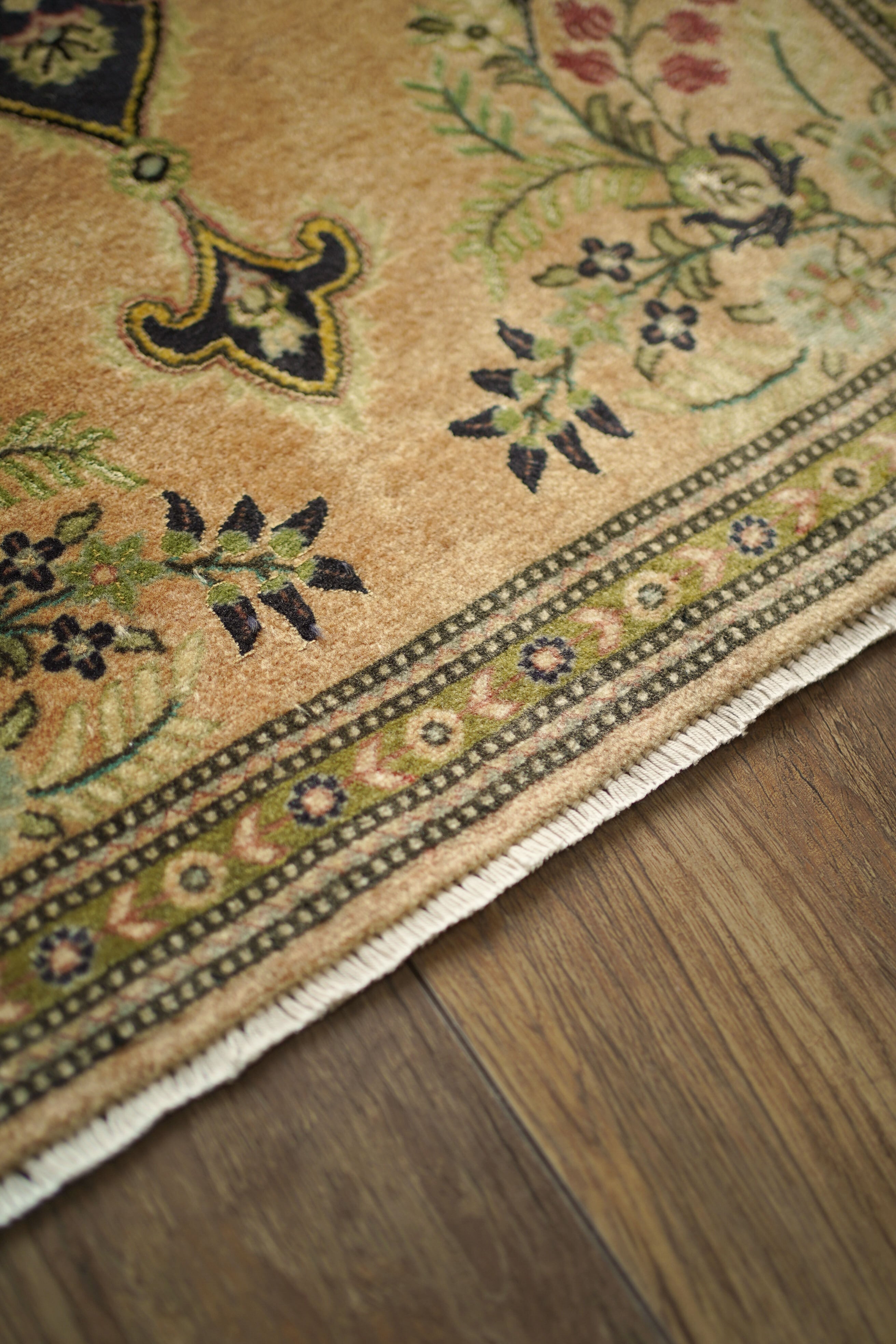 およそ30年前に、イラン北西部の都市・タブリーズで手織りされたペルシャ絨毯です。美しい花紋様をあしらった中央のメダリオンと、その周りには優美な曲線で織り込まれた草花が洗練された雰囲気を醸し出し、上品な佇まいが目を惹く一枚。配色はオレンジ感のあるベージュをベースに、チャコールグレー、オリーブ、赤を組み合わせた優しい風合いの褪色を感じる色合い。高品質なソフトウールが使用されており、フラットに美しく整ったパイルの長さからも、その上質さが感じられる仕上がりです。毛並みは短めながら、表面はふわっとやわらかな心地よい肌触りで、厚みは約7mmほど。ほとんど使用感のない大変良好なコンディションです。玄関や姿見の前はもちろん、タペストリーとして飾っていただくのもおすすめで、空間に上品な彩りを添えてくれる一枚です。