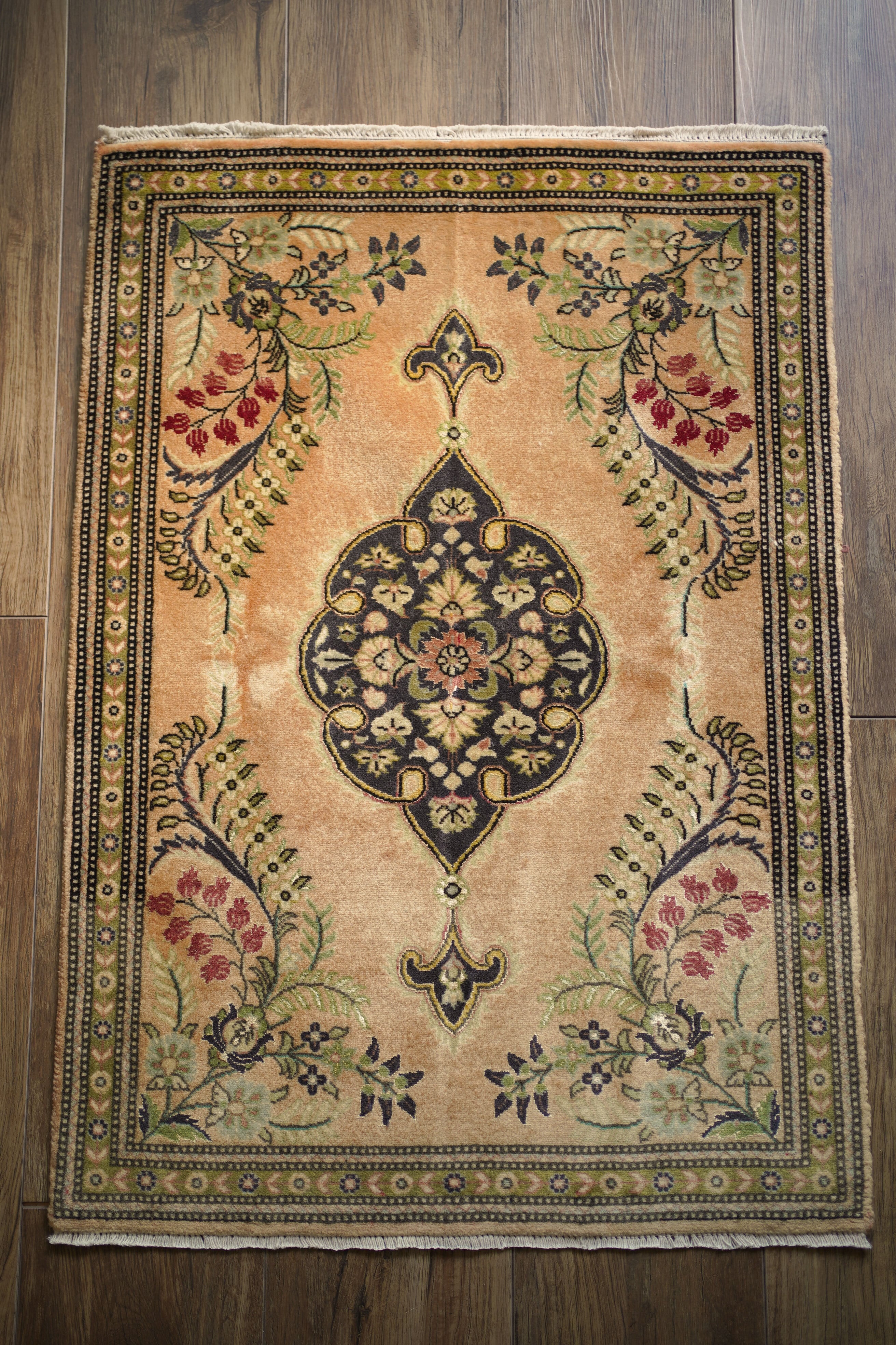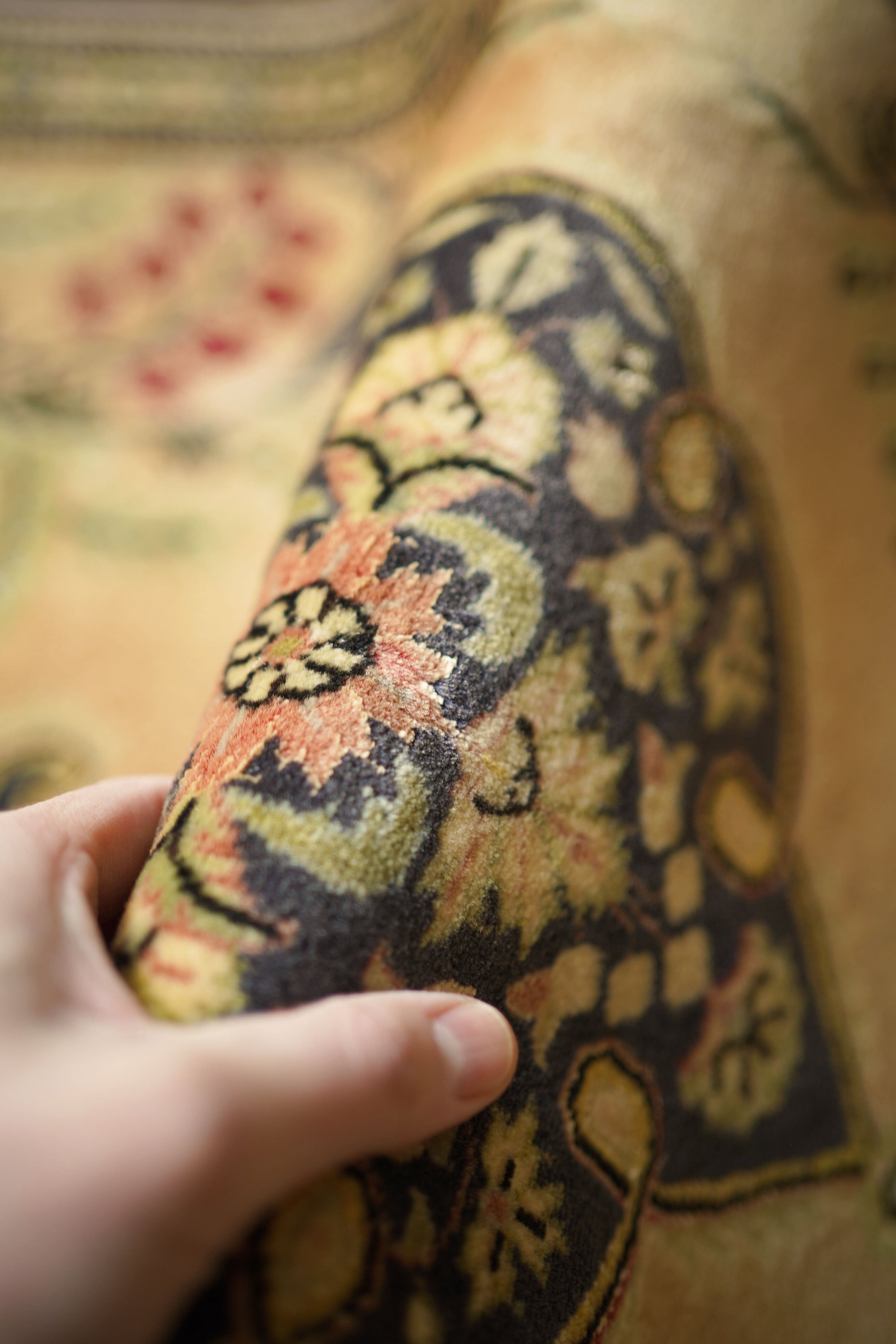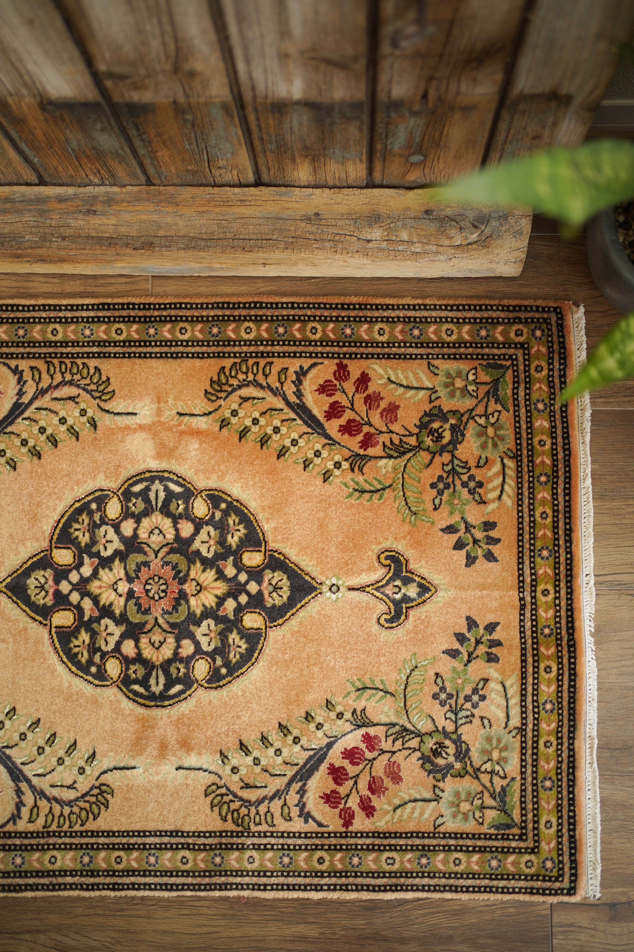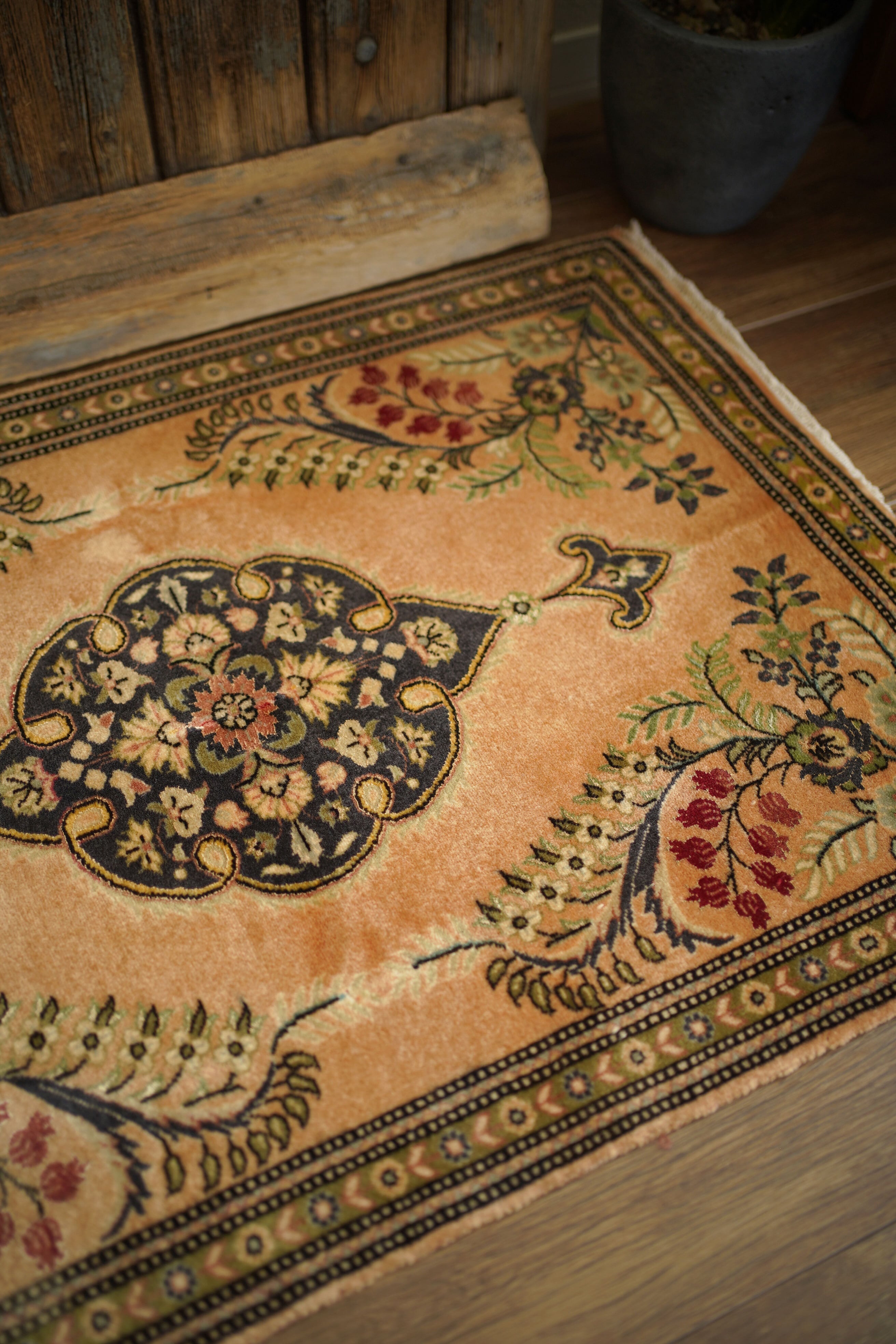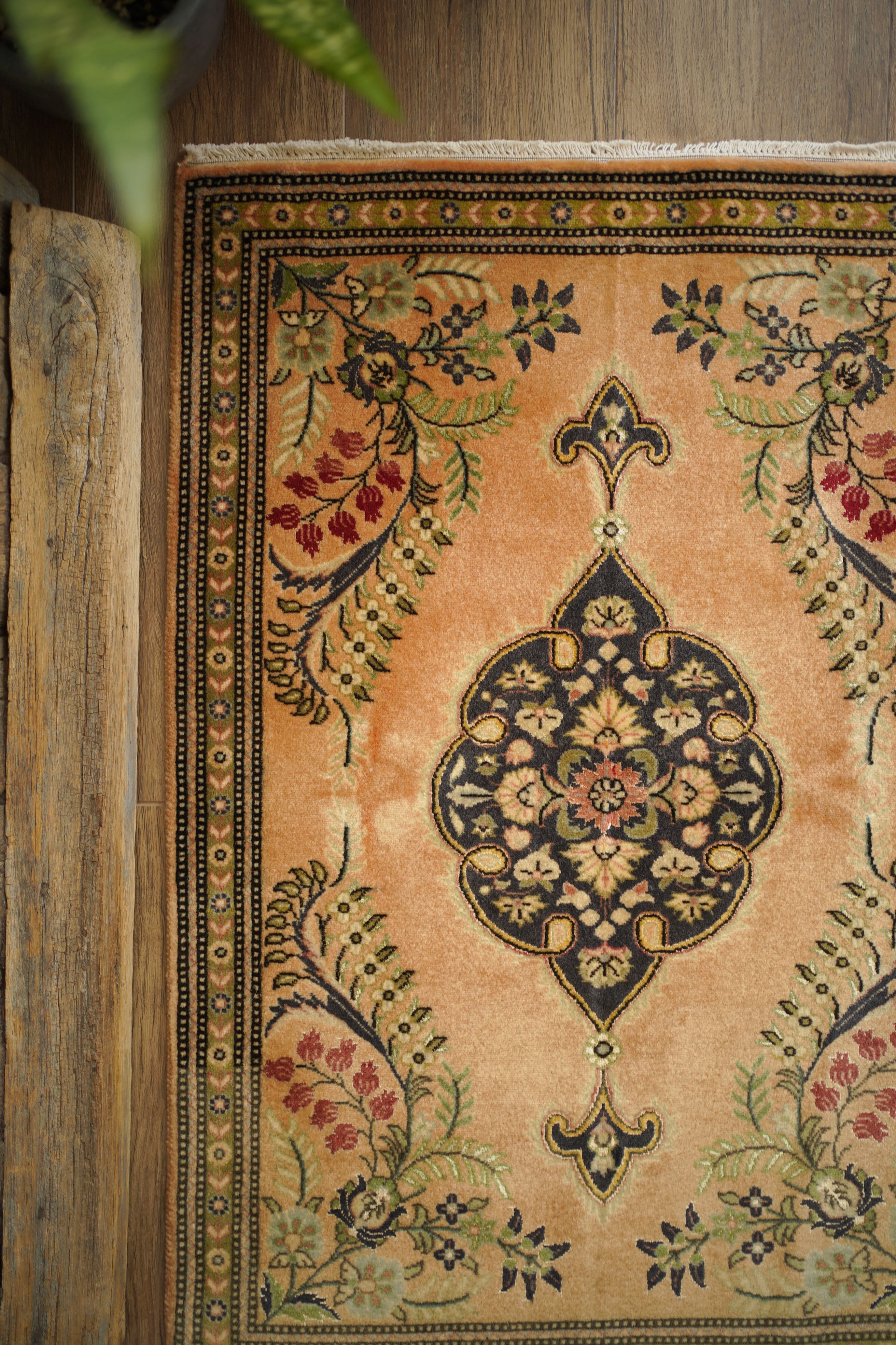 およそ30年前に、イラン北西部の都市・タブリーズで手織りされたペルシャ絨毯です。美しい花紋様をあしらった中央のメダリオンと、その周りには優美な曲線で織り込まれた草花が洗練された雰囲気を醸し出し、上品な佇まいが目を惹く一枚。配色はオレンジ感のあるベージュをベースに、チャコールグレー、オリーブ、赤を組み合わせた優しい風合いの褪色を感じる色合い。高品質なソフトウールが使用されており、フラットに美しく整ったパイルの長さからも、その上質さが感じられる仕上がりです。毛並みは短めながら、表面はふわっとやわらかな心地よい肌触りで、厚みは約7mmほど。ほとんど使用感のない大変良好なコンディションです。玄関や姿見の前はもちろん、タペストリーとして飾っていただくのもおすすめで、空間に上品な彩りを添えてくれる一枚です。