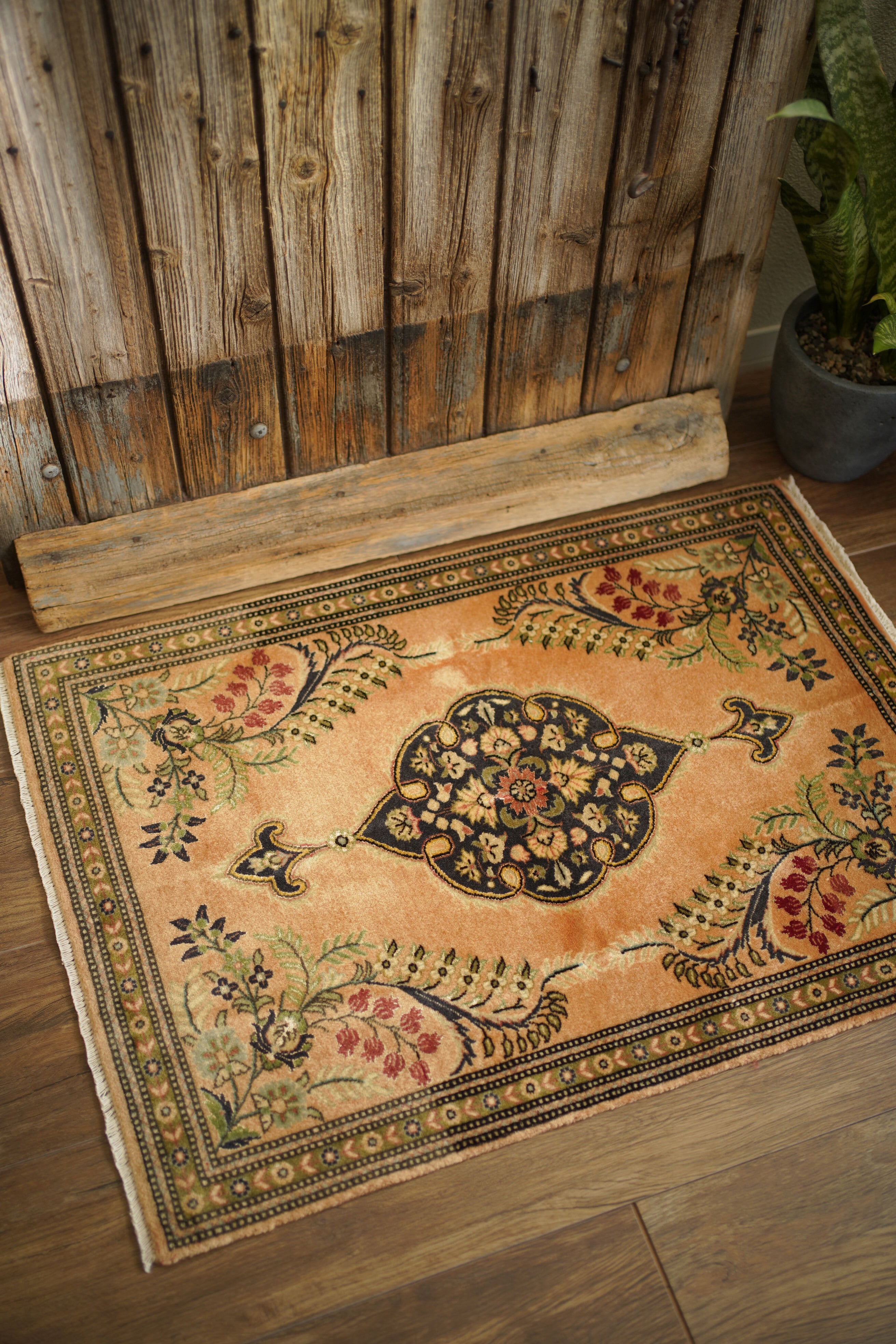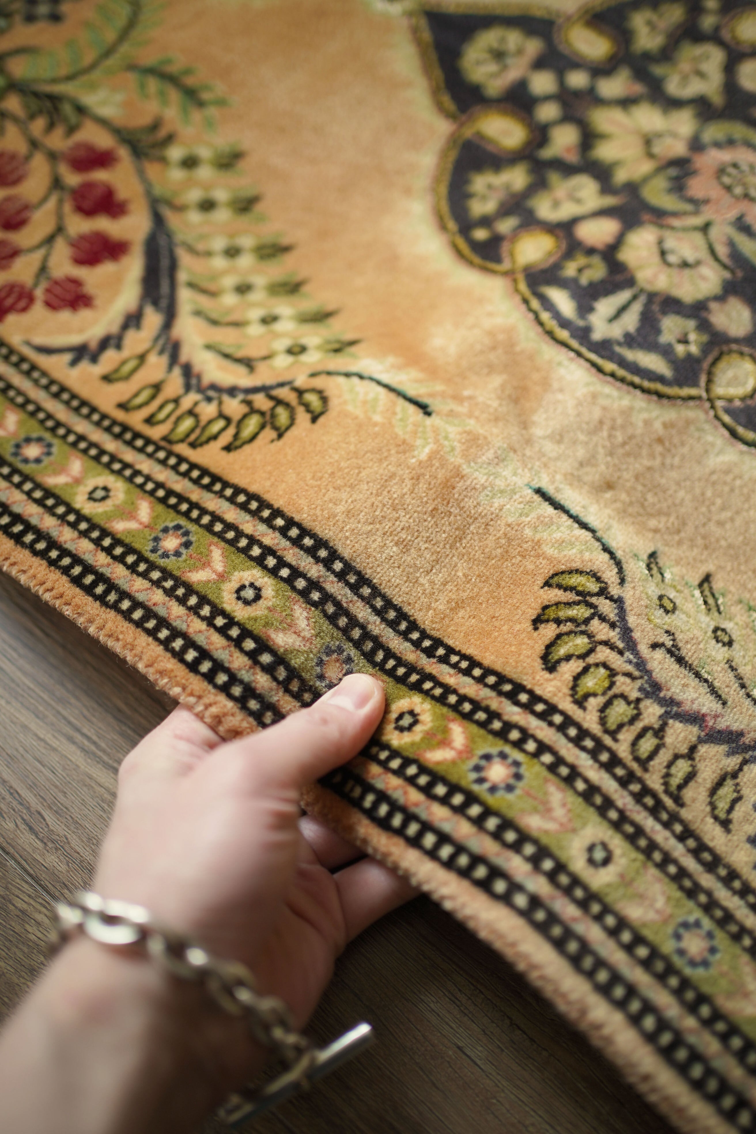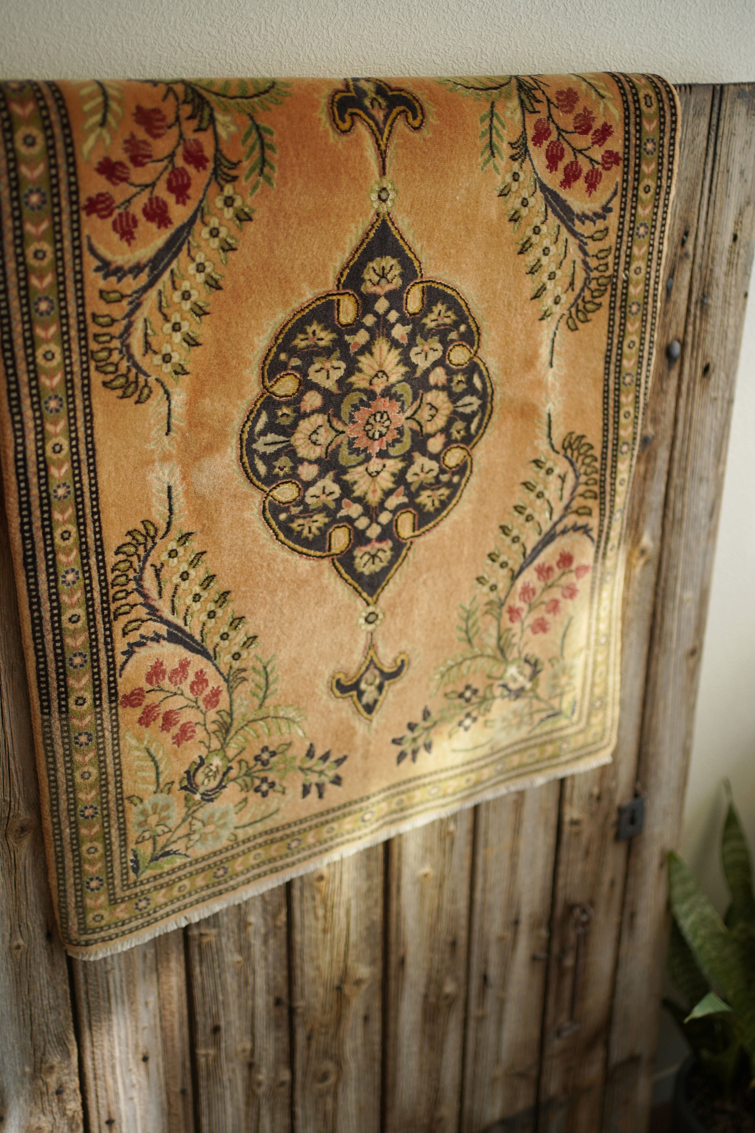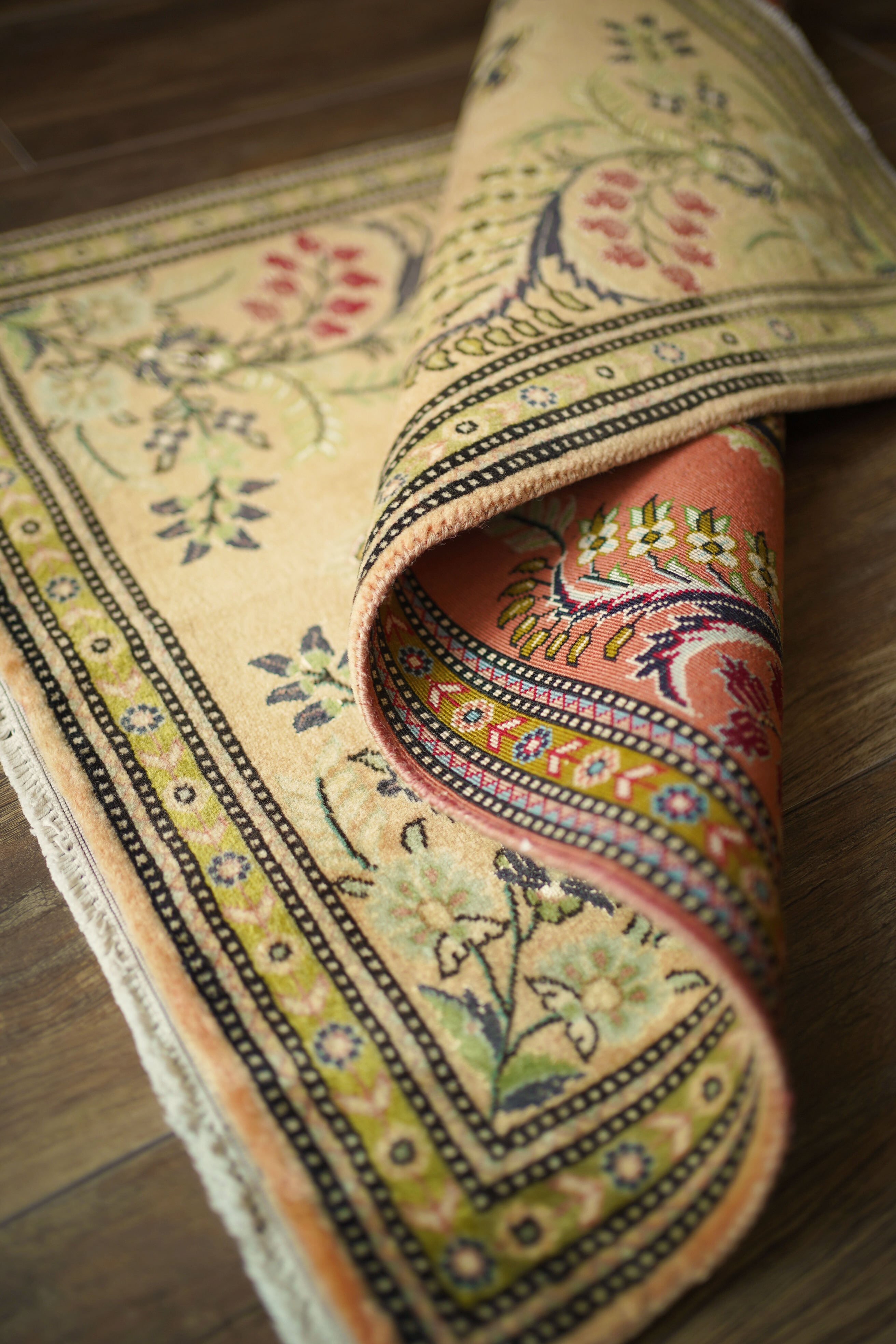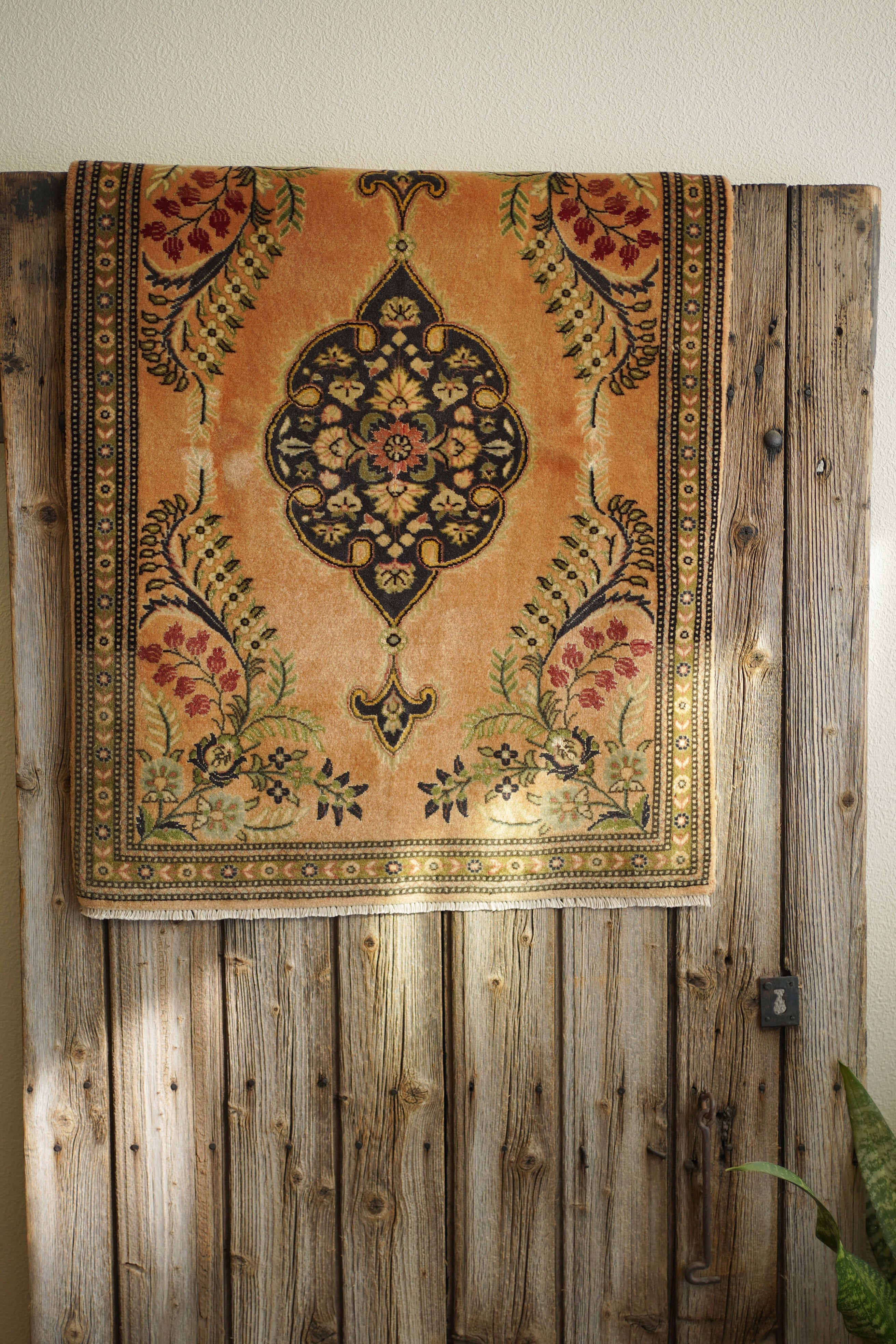 およそ30年前に、イラン北西部の都市・タブリーズで手織りされたペルシャ絨毯です。美しい花紋様をあしらった中央のメダリオンと、その周りには優美な曲線で織り込まれた草花が洗練された雰囲気を醸し出し、上品な佇まいが目を惹く一枚。配色はオレンジ感のあるベージュをベースに、チャコールグレー、オリーブ、赤を組み合わせた優しい風合いの褪色を感じる色合い。高品質なソフトウールが使用されており、フラットに美しく整ったパイルの長さからも、その上質さが感じられる仕上がりです。毛並みは短めながら、表面はふわっとやわらかな心地よい肌触りで、厚みは約7mmほど。ほとんど使用感のない大変良好なコンディションです。玄関や姿見の前はもちろん、タペストリーとして飾っていただくのもおすすめで、空間に上品な彩りを添えてくれる一枚です。