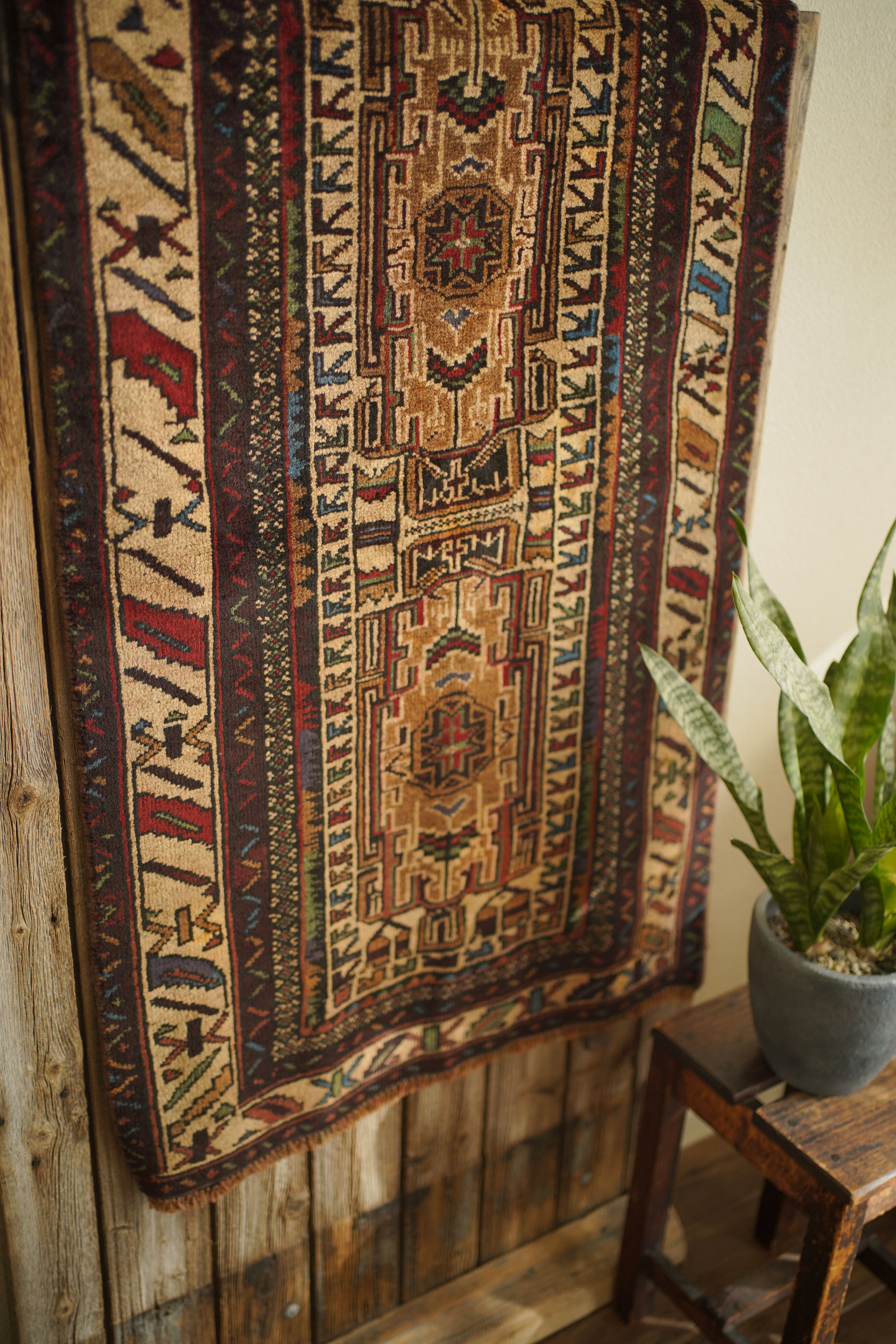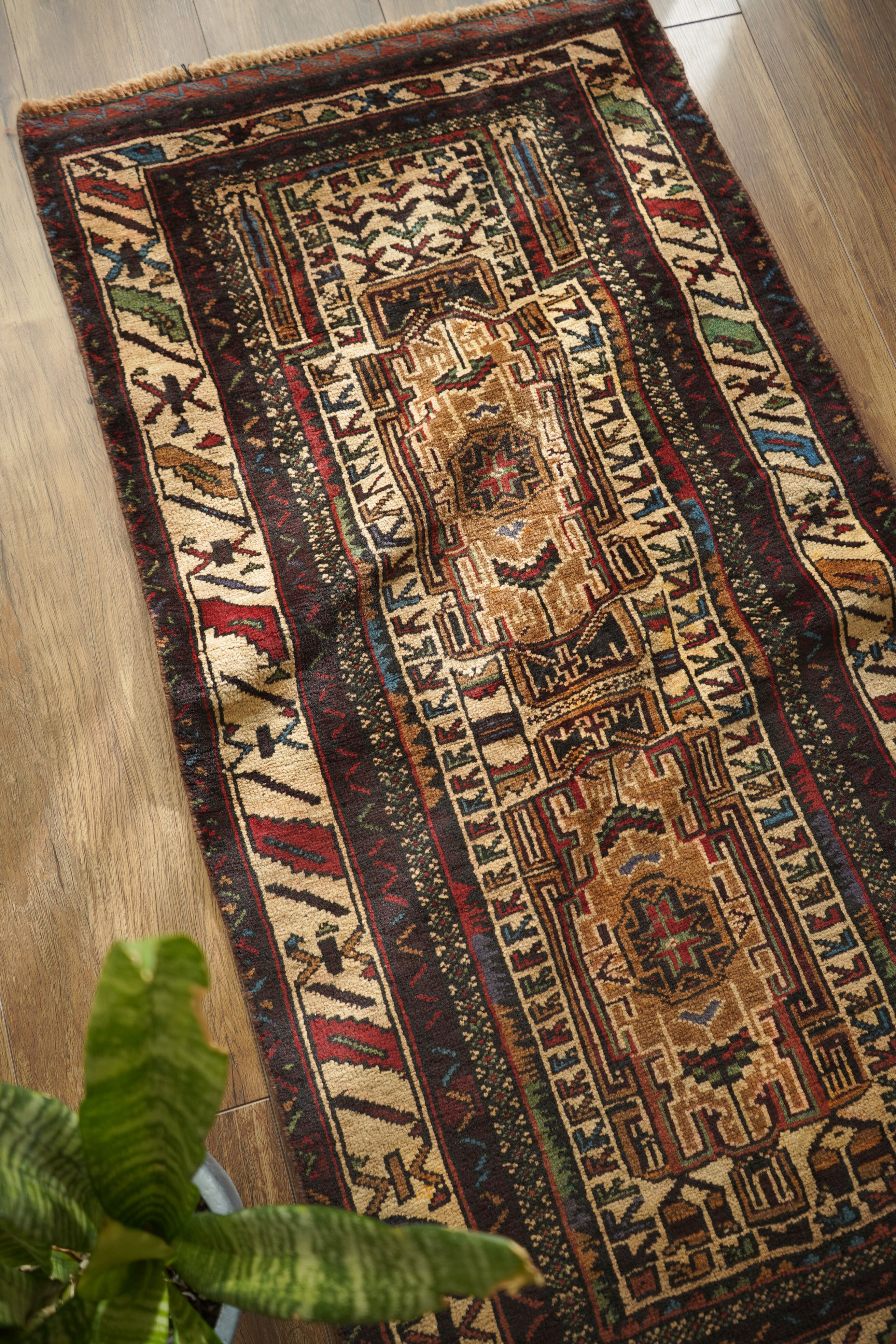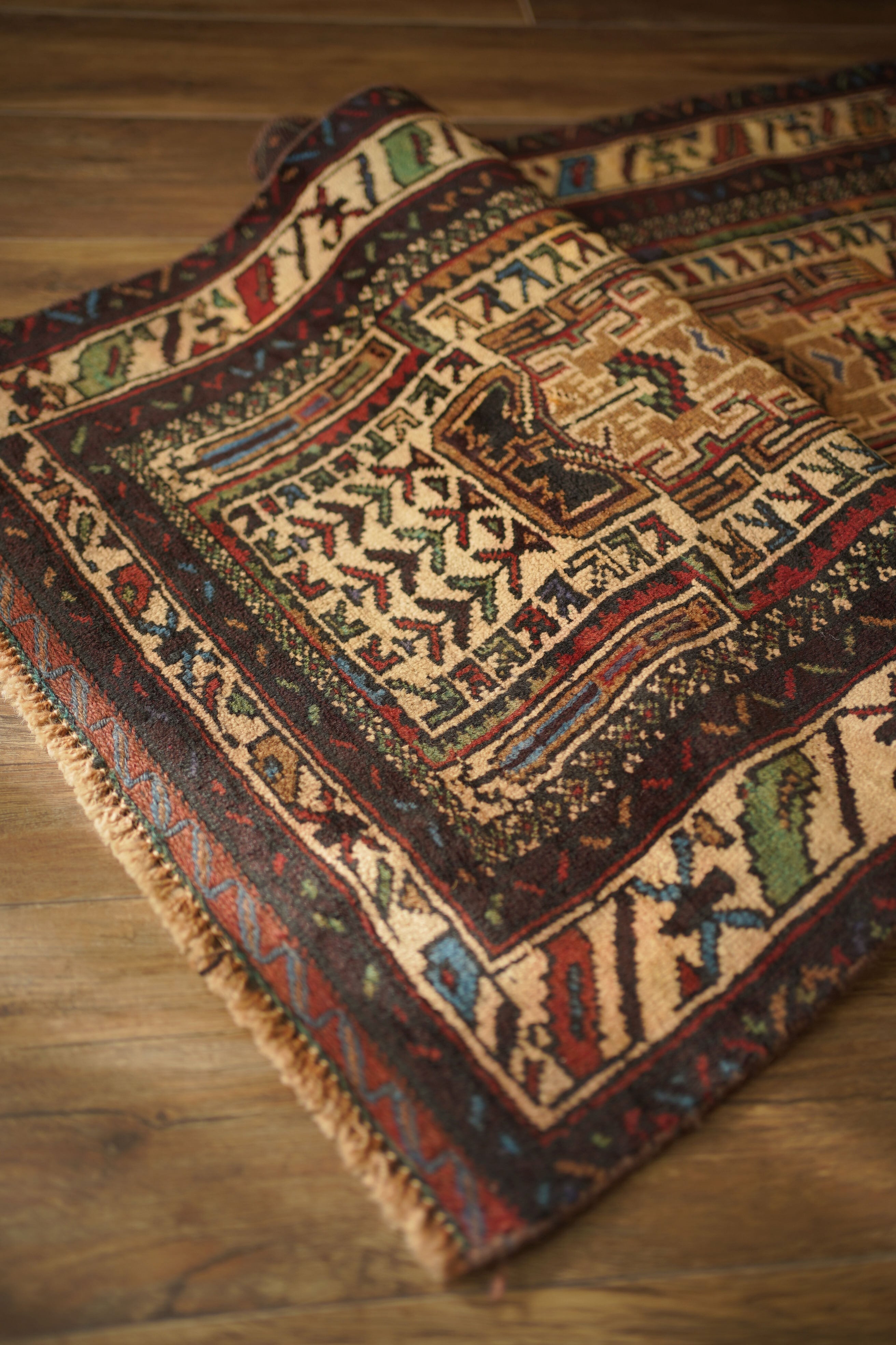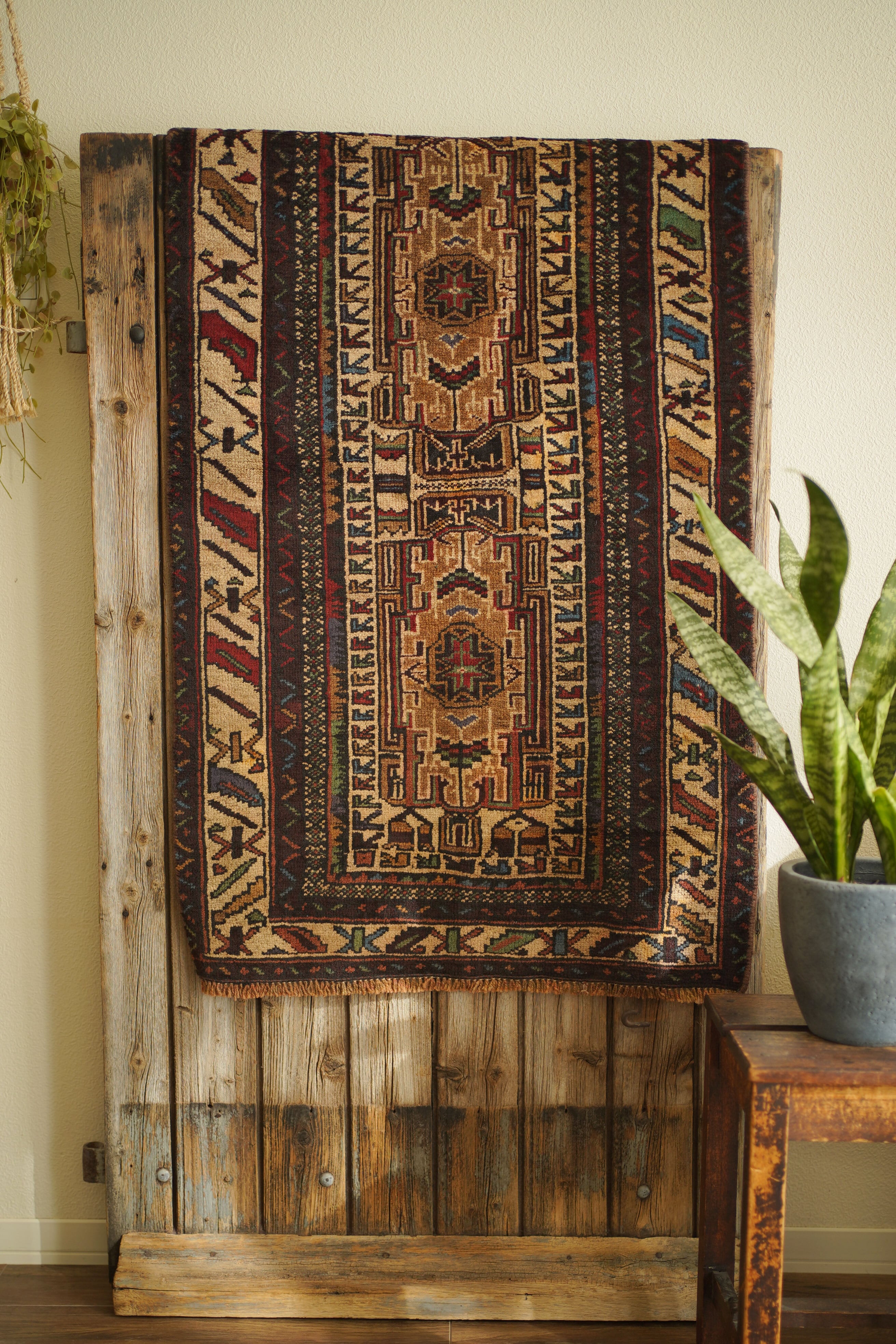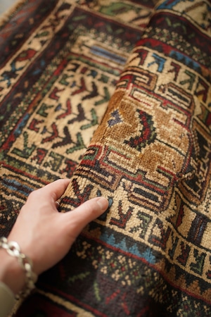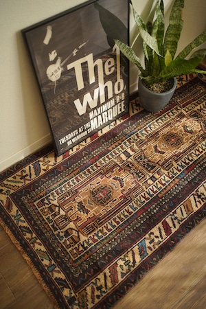 アフガニスタンに居住するバルーチ族によって、約60年前に手織りされた祈祷用のプレイヤーラグです。多色ながらも統一感のある落ち着いた色使いに惹かれて仕入れた一枚で、ベージュとえんじ色を基調に薄茶色、赤、水色、若草色などがバランスよく使われています。厚みは約7mmほどで、表面はさらりとしながらもやわらかく、心地よい肌触り。目立ったダメージもなく、コンディションも良好です。凸型デザインのプレイヤーラグとしては珍しい、やや細長いフォルムも魅力のひとつ。オープンラック前やサイドボード前などに取り入れやすいサイズ感です。