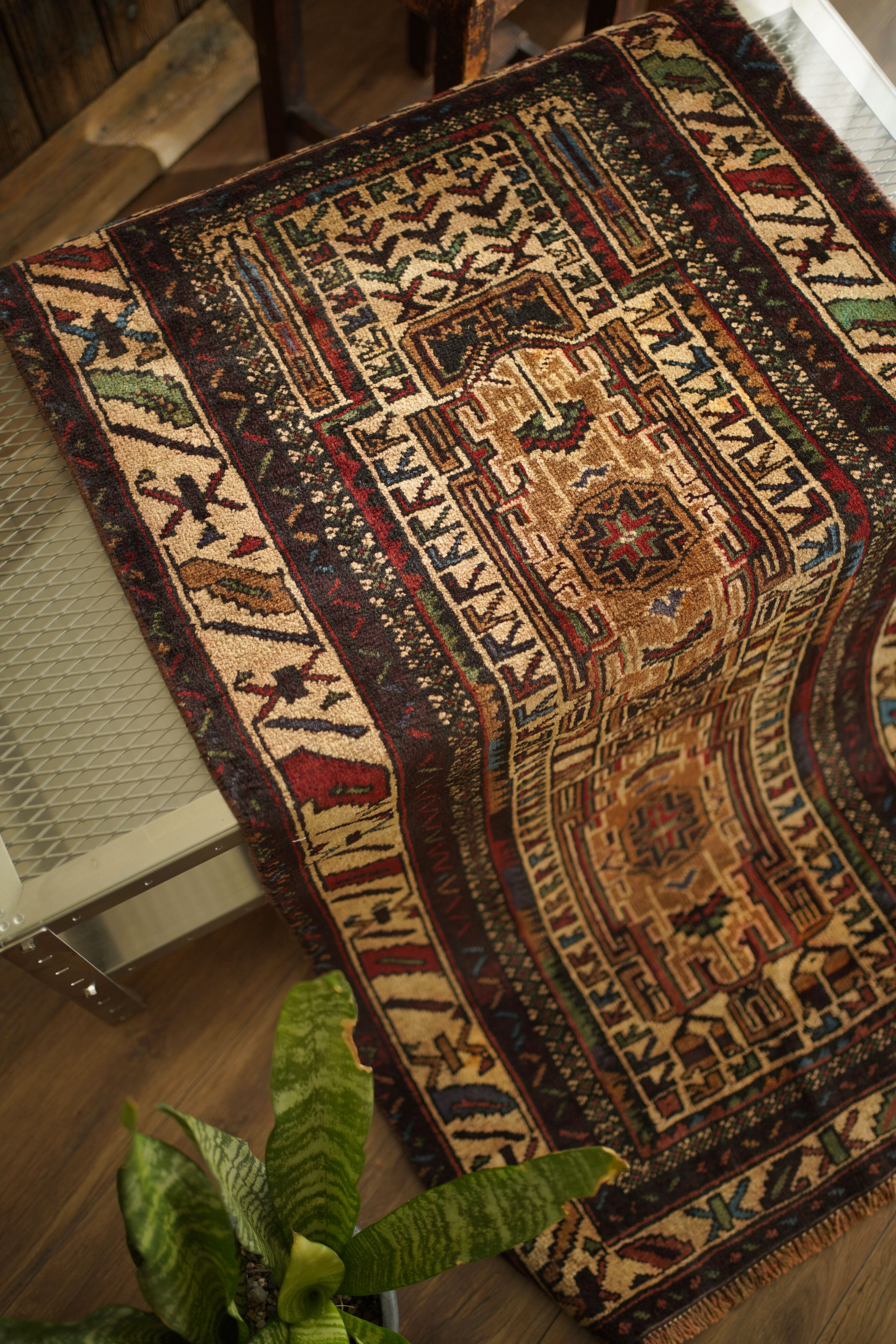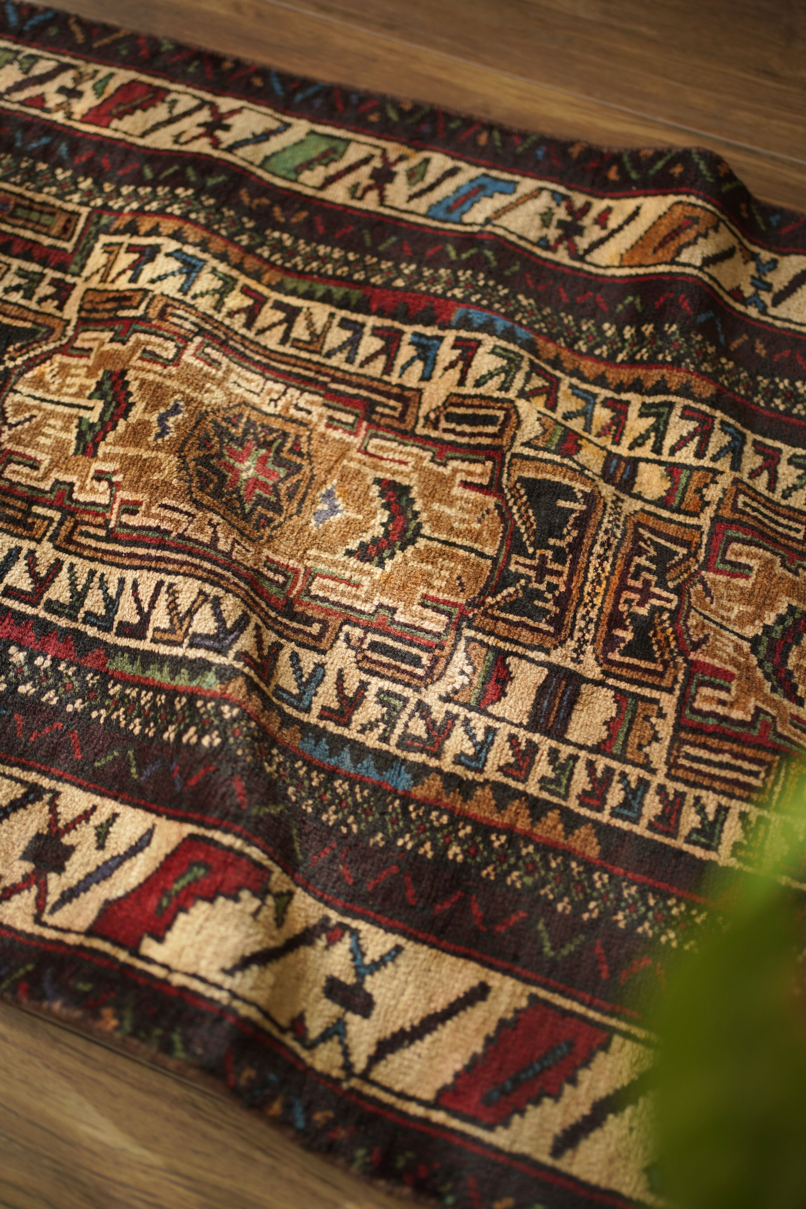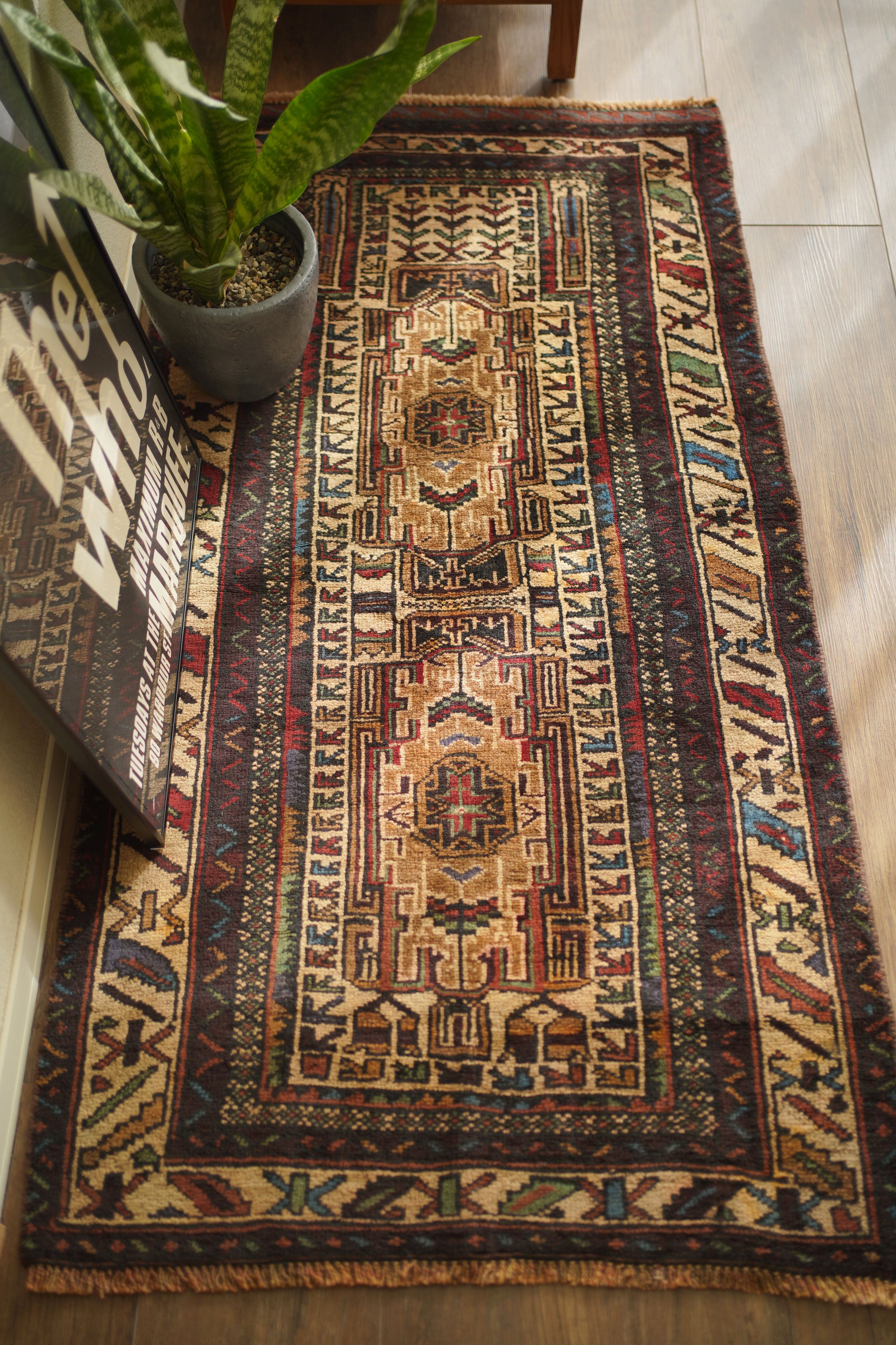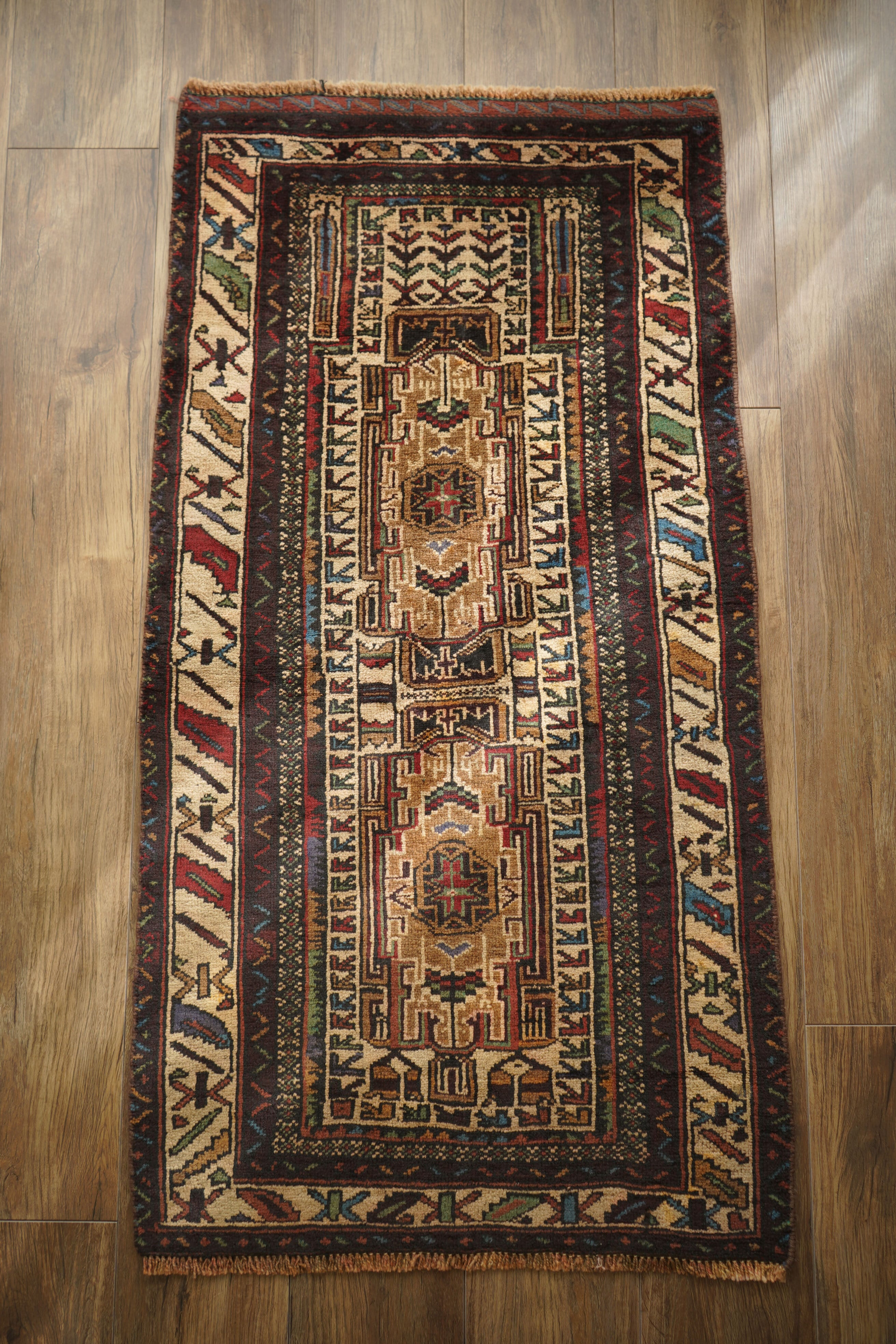 アフガニスタンに居住するバルーチ族によって、約60年前に手織りされた祈祷用のプレイヤーラグです。多色ながらも統一感のある落ち着いた色使いに惹かれて仕入れた一枚で、ベージュとえんじ色を基調に薄茶色、赤、水色、若草色などがバランスよく使われています。厚みは約7mmほどで、表面はさらりとしながらもやわらかく、心地よい肌触り。目立ったダメージもなく、コンディションも良好です。凸型デザインのプレイヤーラグとしては珍しい、やや細長いフォルムも魅力のひとつ。オープンラック前やサイドボード前などに取り入れやすいサイズ感です。