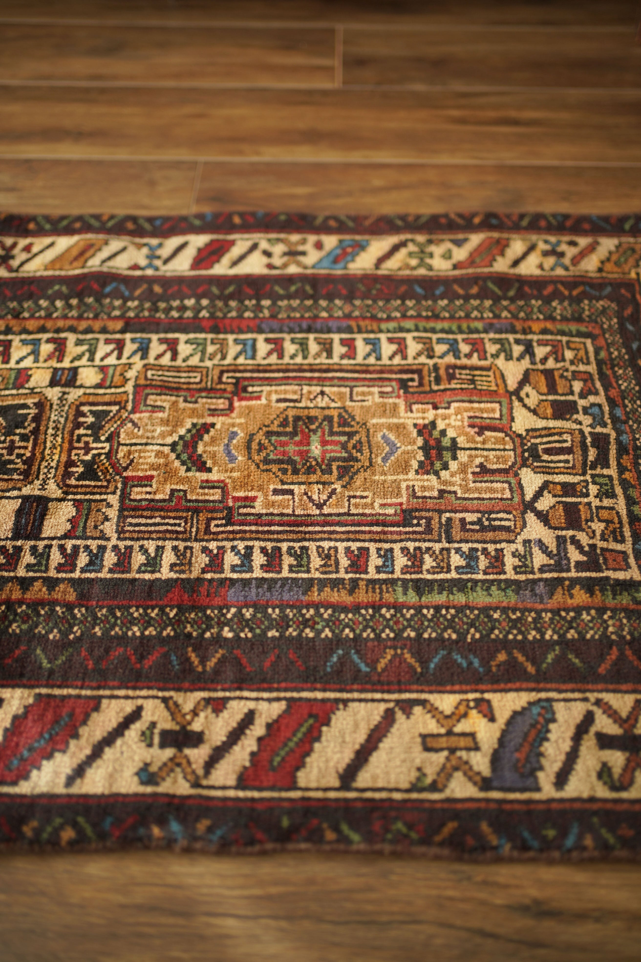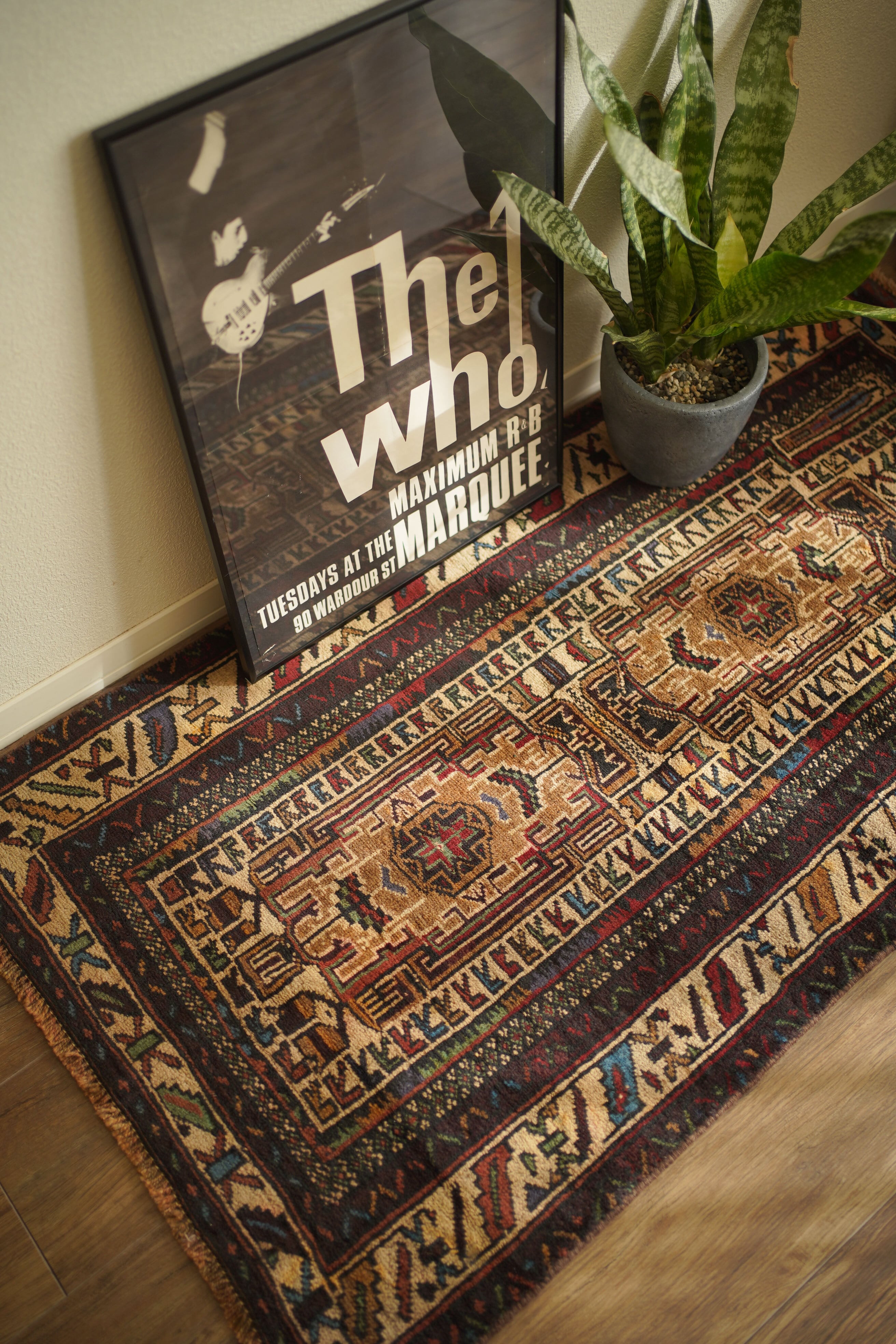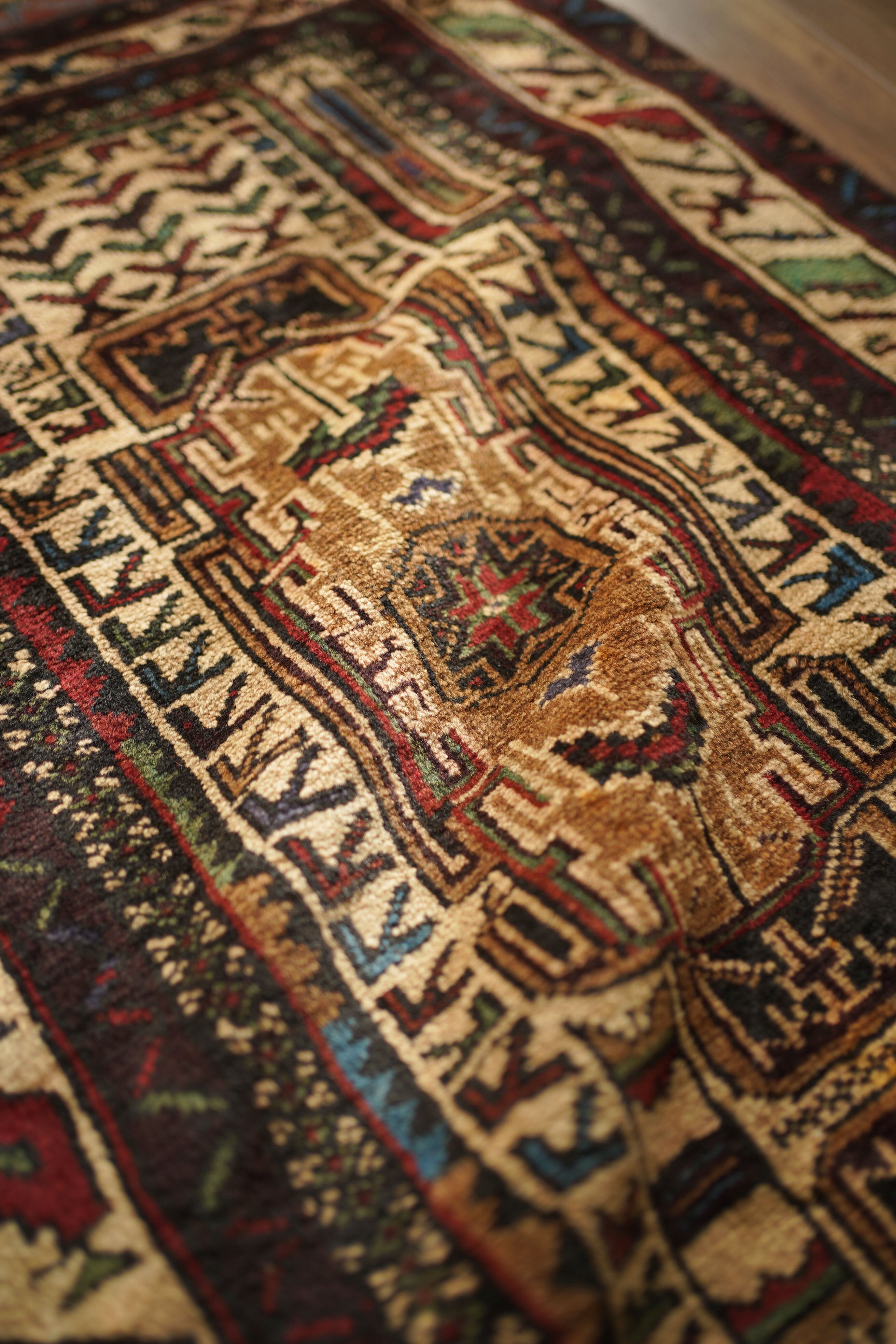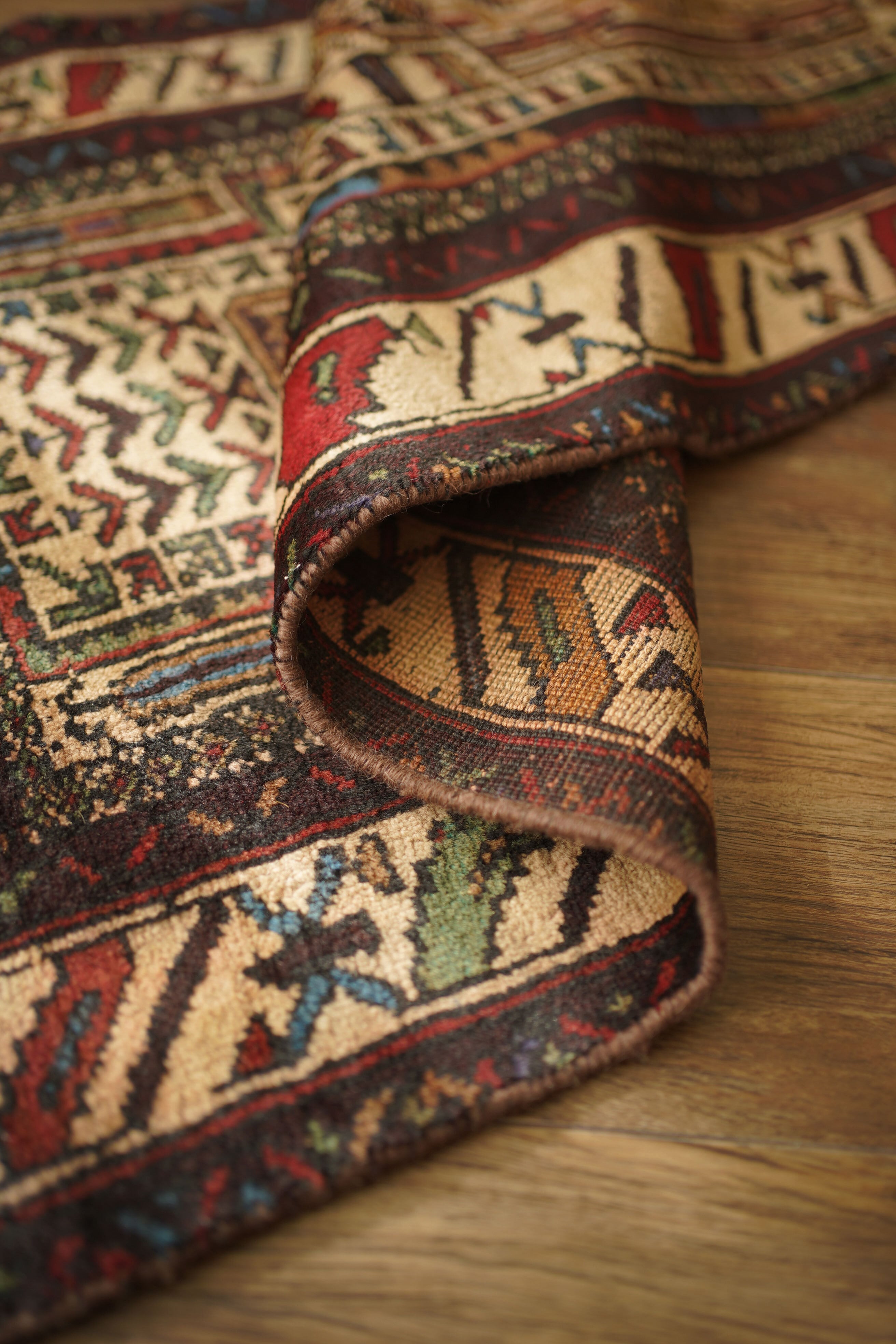 アフガニスタンに居住するバルーチ族によって、約60年前に手織りされた祈祷用のプレイヤーラグです。多色ながらも統一感のある落ち着いた色使いに惹かれて仕入れた一枚で、ベージュとえんじ色を基調に薄茶色、赤、水色、若草色などがバランスよく使われています。厚みは約7mmほどで、表面はさらりとしながらもやわらかく、心地よい肌触り。目立ったダメージもなく、コンディションも良好です。凸型デザインのプレイヤーラグとしては珍しい、やや細長いフォルムも魅力のひとつ。オープンラック前やサイドボード前などに取り入れやすいサイズ感です。