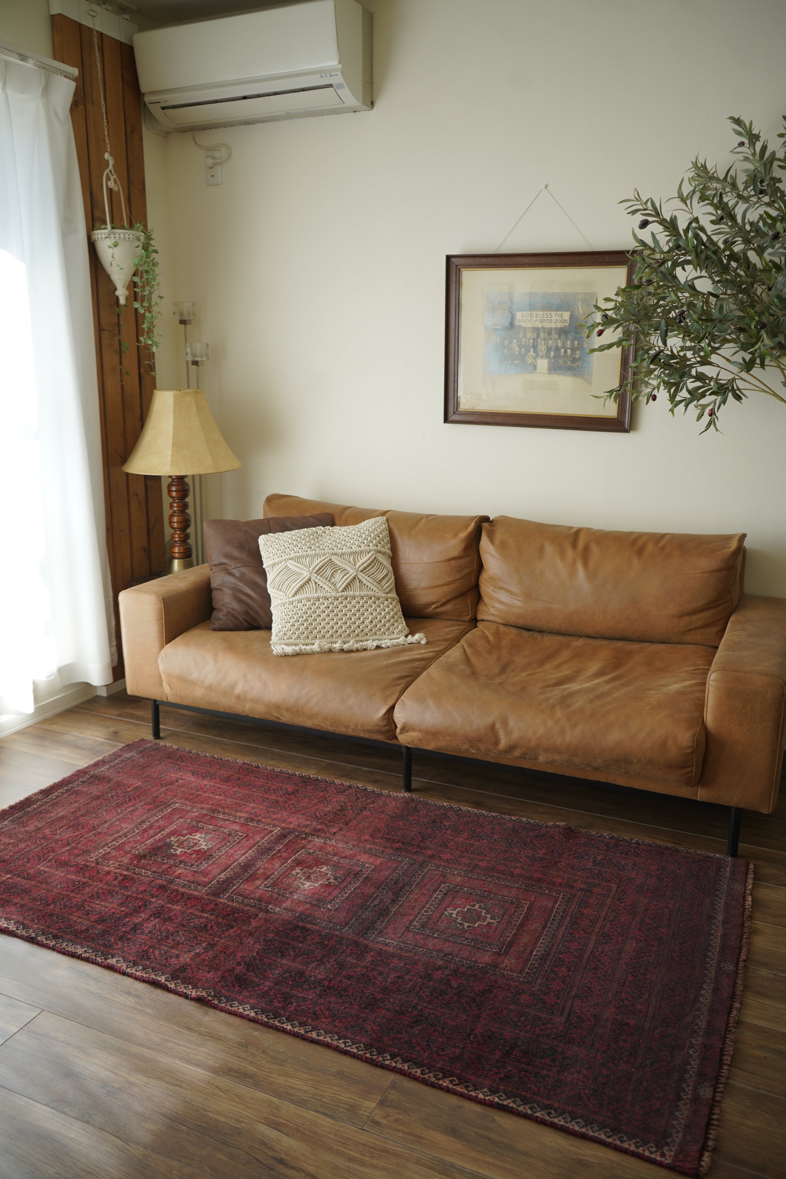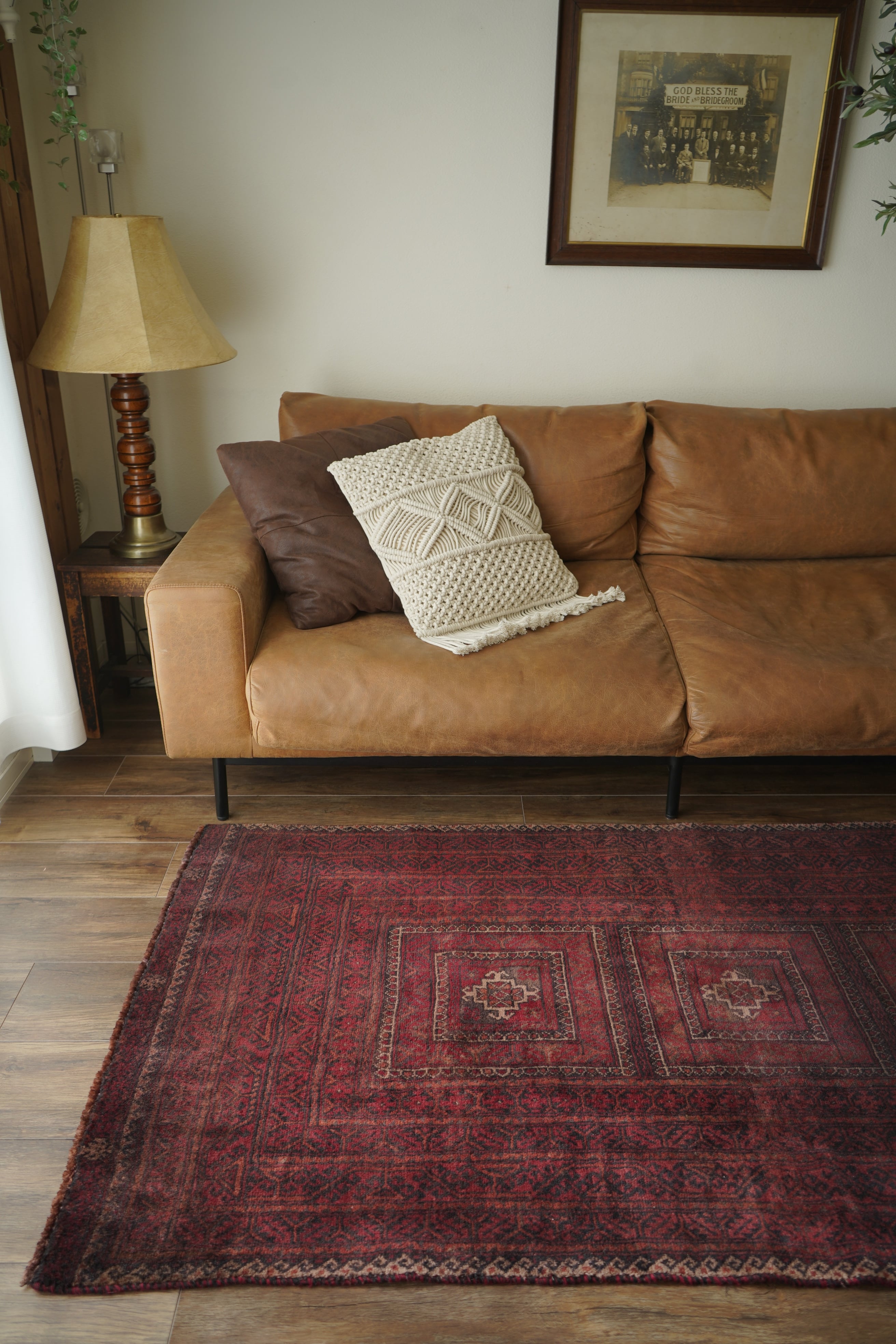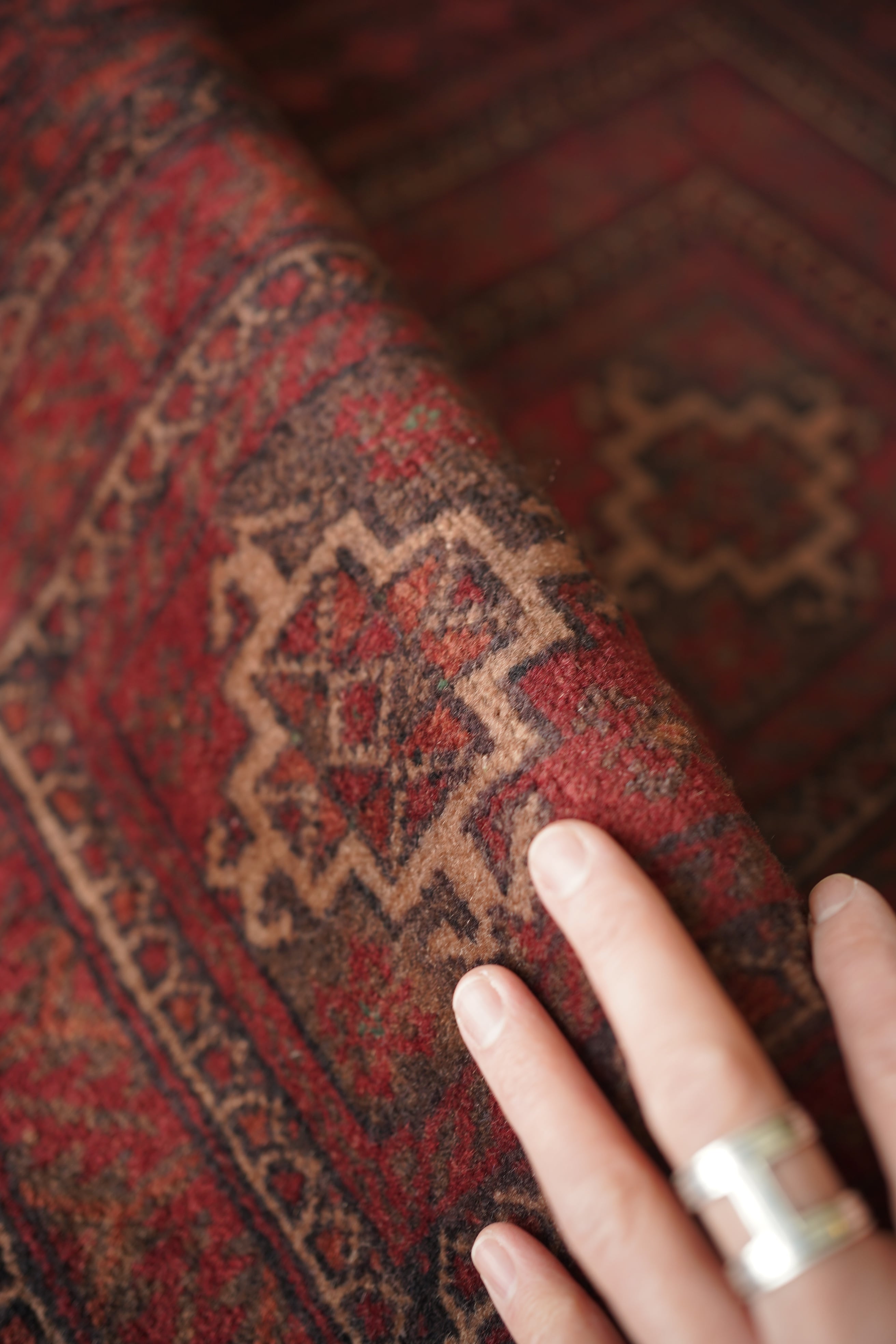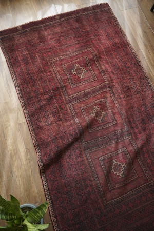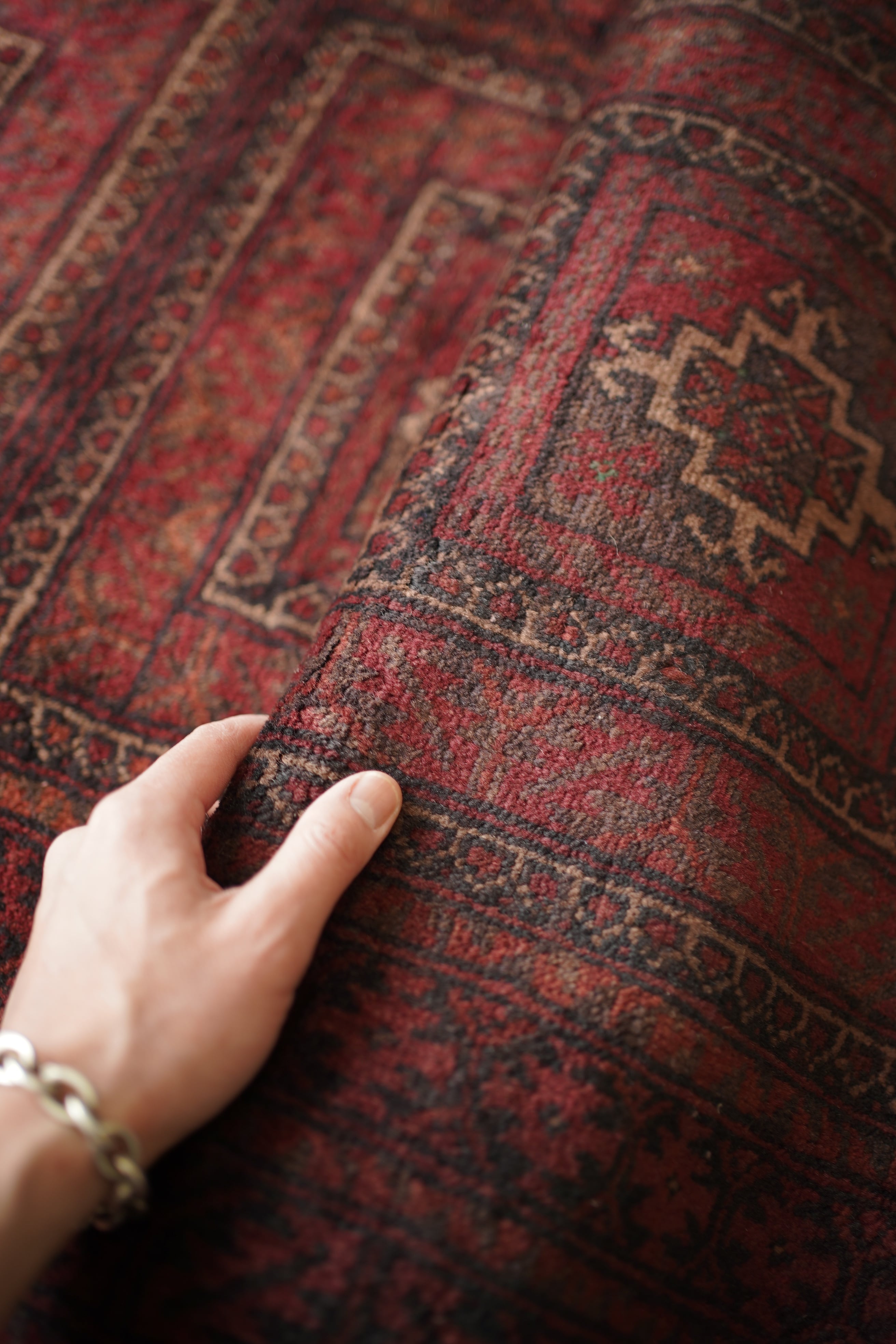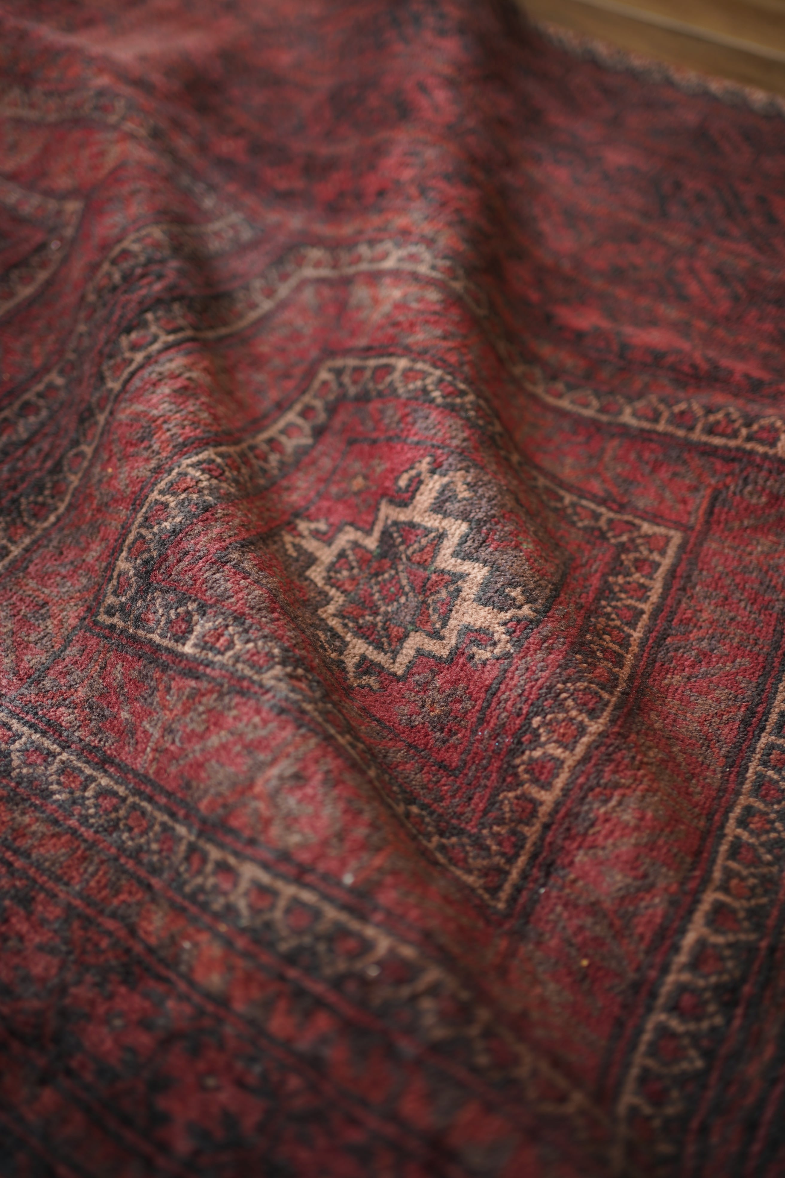 およそ50年前にアフガニスタンのバルーチ族によって手織りされたヴィンテージラグです。深みのあるえんじ色を基調に、黒や薄茶色がさりげなくあしらわれた落ち着きと奥行きを感じさせる一枚。中央には正方形のモチーフが3つ並び、全体として主張が強すぎず、空間に自然と溶け込みやすいバランスの良いデザインです。経年による色のかすれやパイルの表情が、ヴィンテージならではの味わいを引き立てており、光の当たり方や毛並みの向きによって表情がさりげなく変化するのも魅力のひとつです。厚みは約7mm程度。表面はふわりと柔らかい心地よい肌触り。通年で快適にご利用いただける質感です。目立ったダメージや補修跡も見受けられず、良好なコンディションを保っています。赤系でありながら派手さを抑えた渋みのある色合いは、木製家具や落ち着いたトーンのインテリアとも相性が良いかと思います。主張しすぎない赤系ラグをお探しの方におすすめの一枚です。