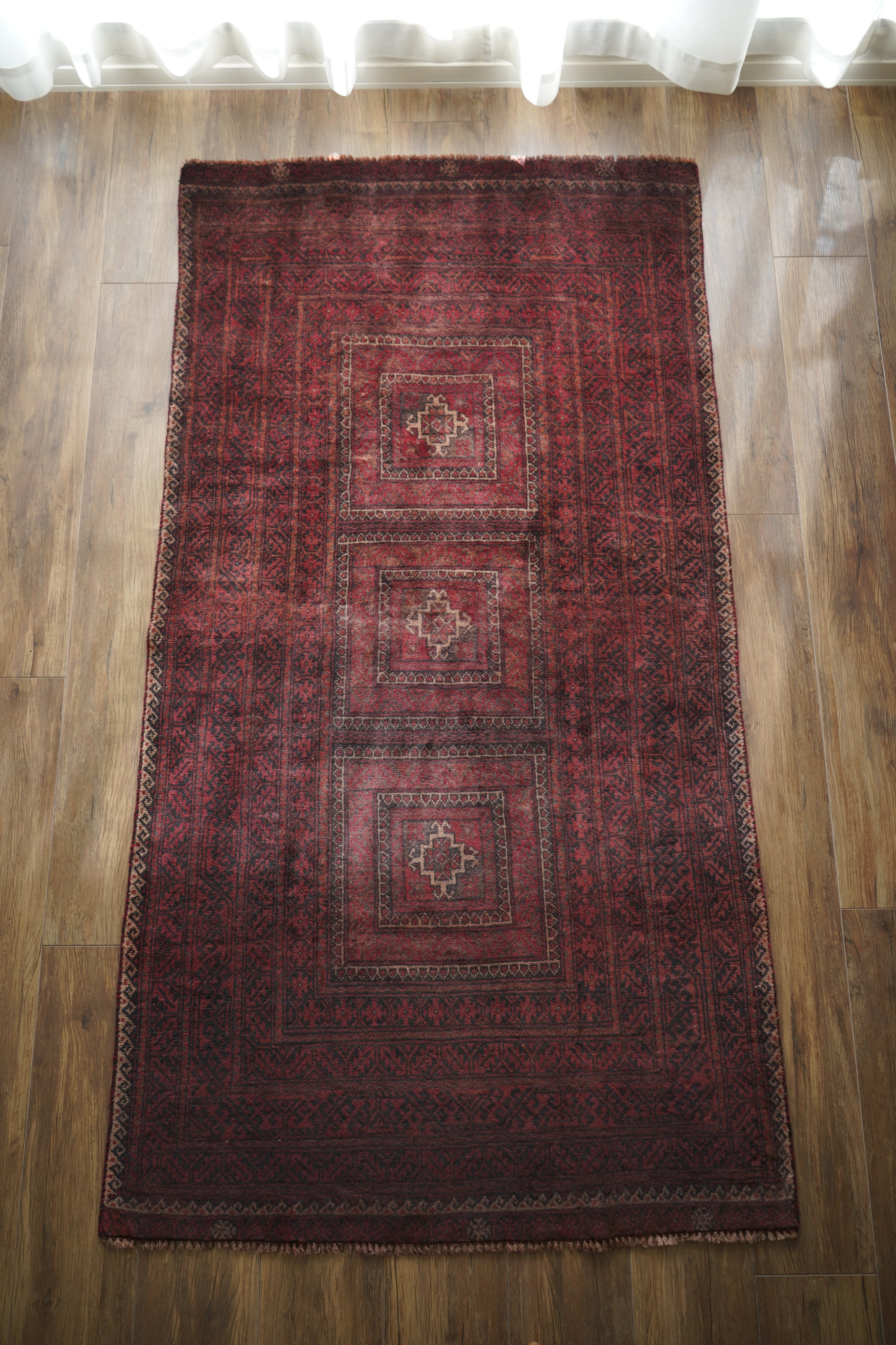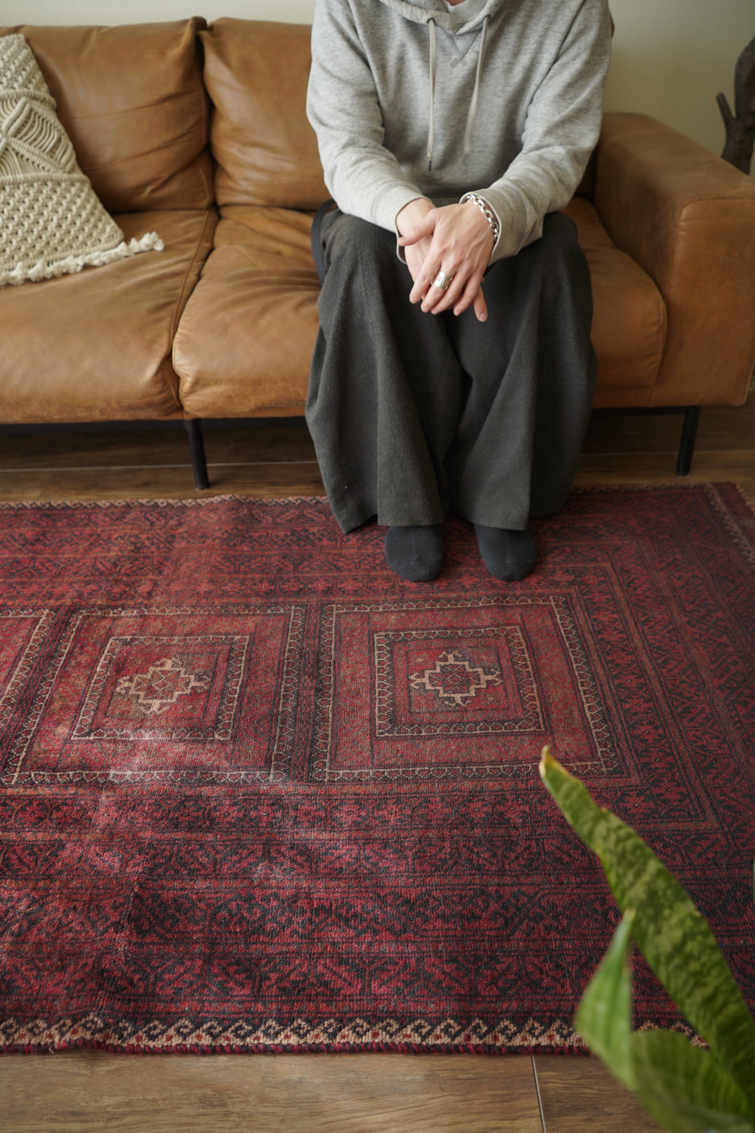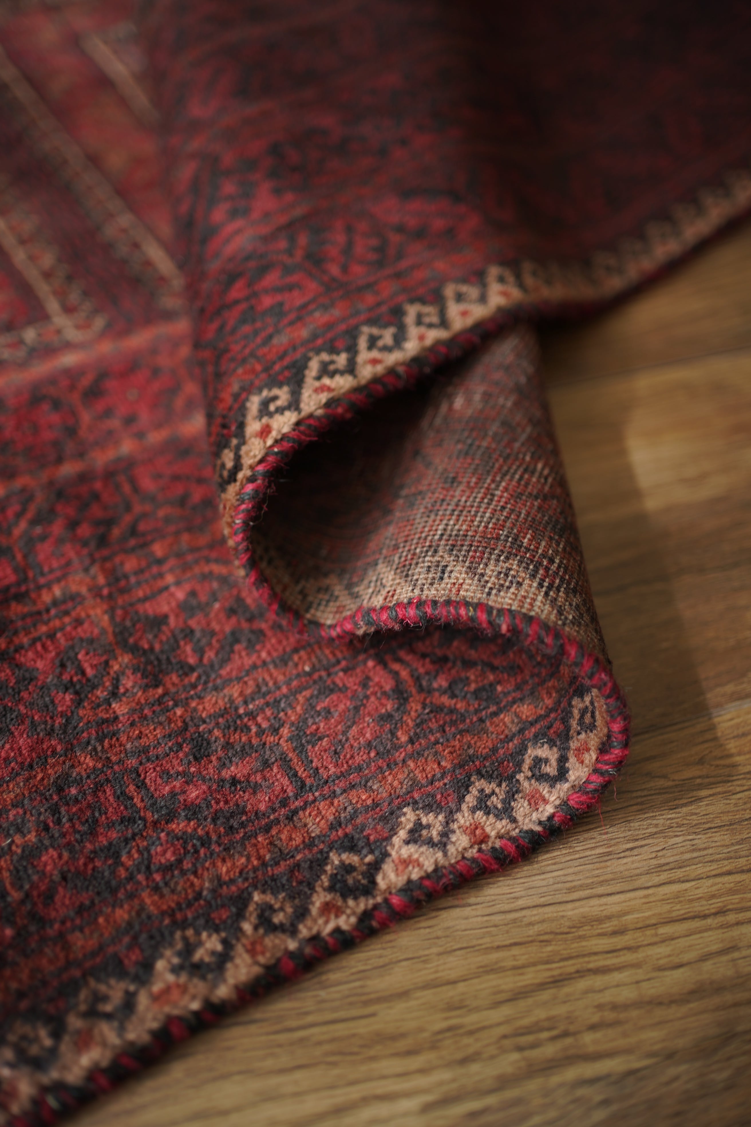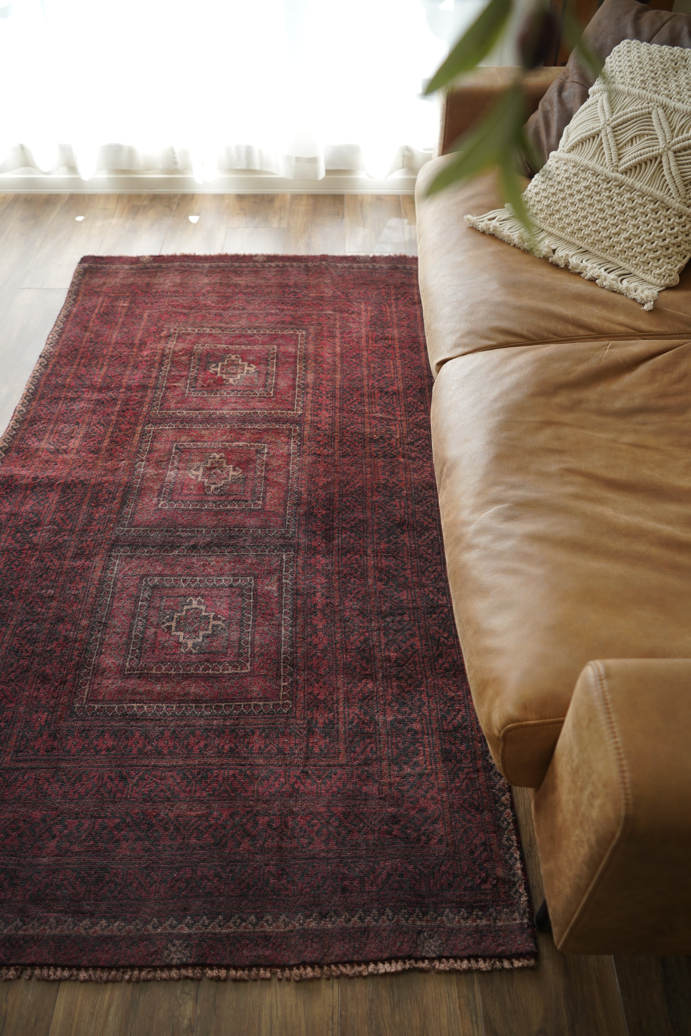 およそ50年前にアフガニスタンのバルーチ族によって手織りされたヴィンテージラグです。深みのあるえんじ色を基調に、黒や薄茶色がさりげなくあしらわれた落ち着きと奥行きを感じさせる一枚。中央には正方形のモチーフが3つ並び、全体として主張が強すぎず、空間に自然と溶け込みやすいバランスの良いデザインです。経年による色のかすれやパイルの表情が、ヴィンテージならではの味わいを引き立てており、光の当たり方や毛並みの向きによって表情がさりげなく変化するのも魅力のひとつです。厚みは約7mm程度。表面はふわりと柔らかい心地よい肌触り。通年で快適にご利用いただける質感です。目立ったダメージや補修跡も見受けられず、良好なコンディションを保っています。赤系でありながら派手さを抑えた渋みのある色合いは、木製家具や落ち着いたトーンのインテリアとも相性が良いかと思います。主張しすぎない赤系ラグをお探しの方におすすめの一枚です。